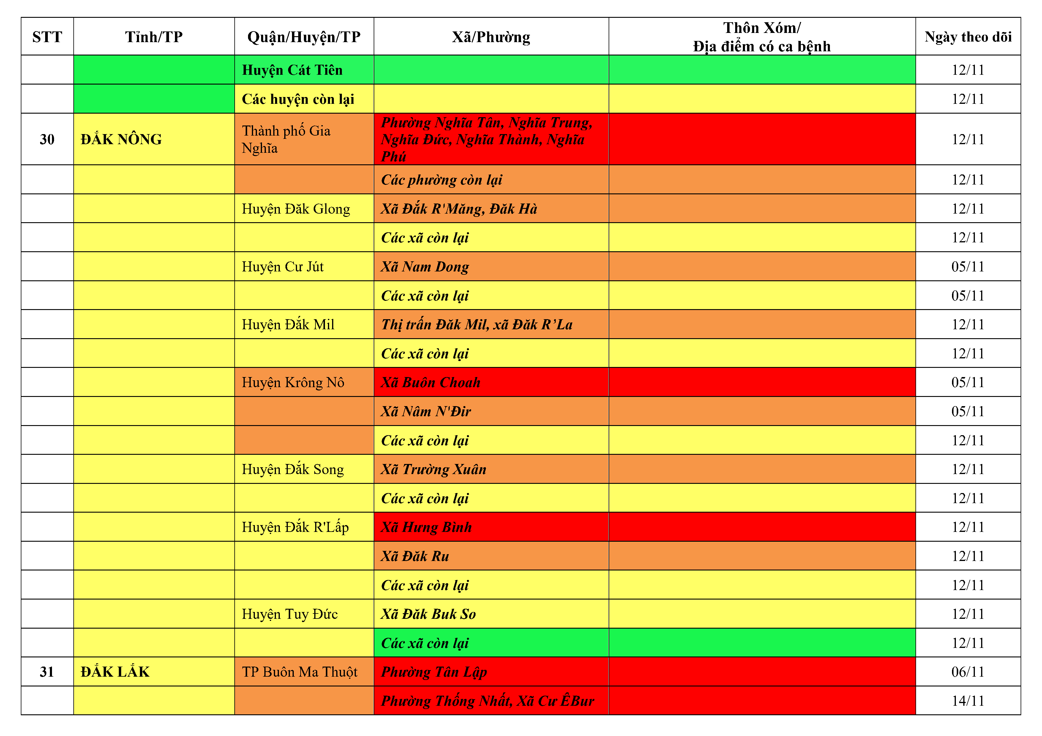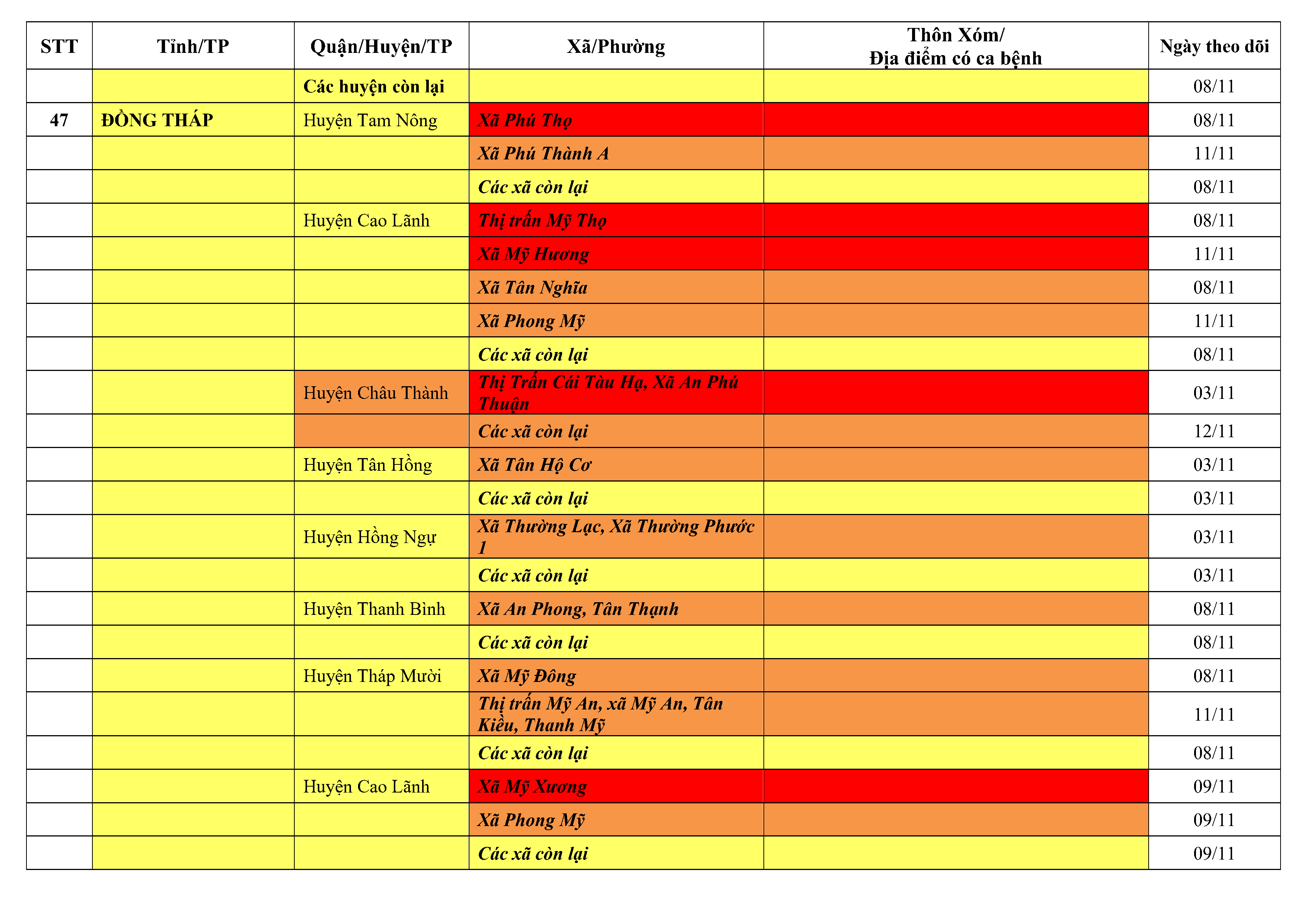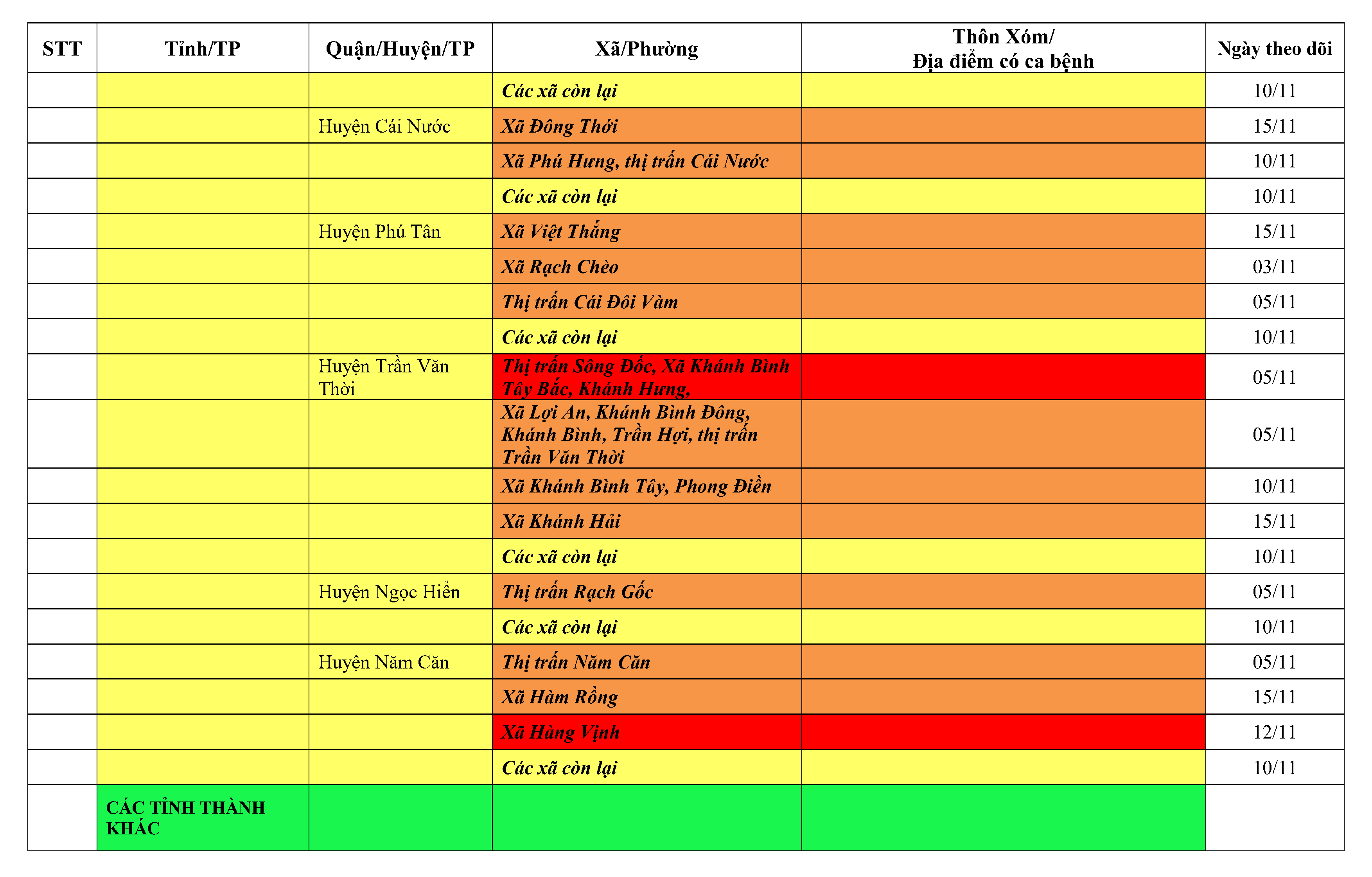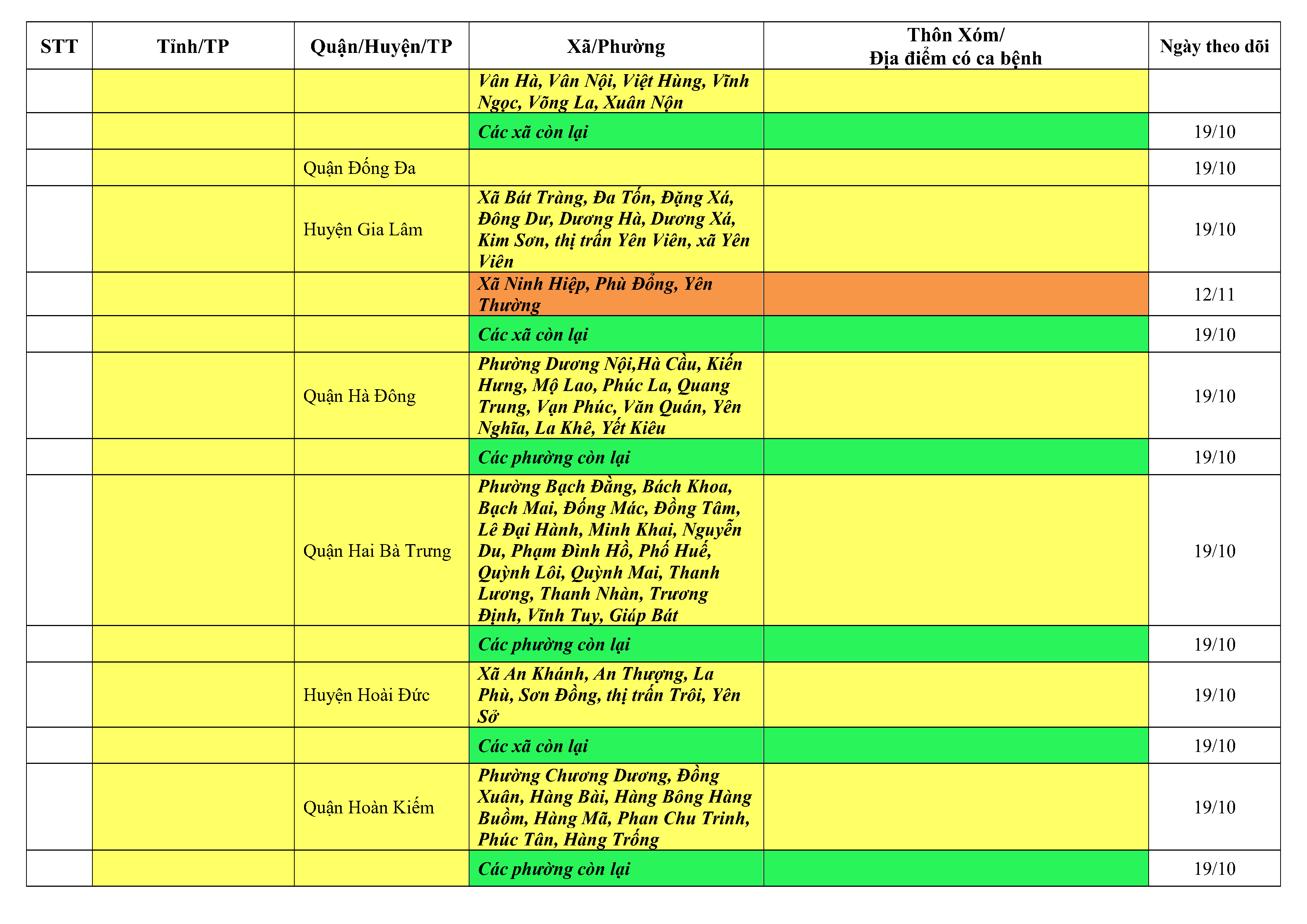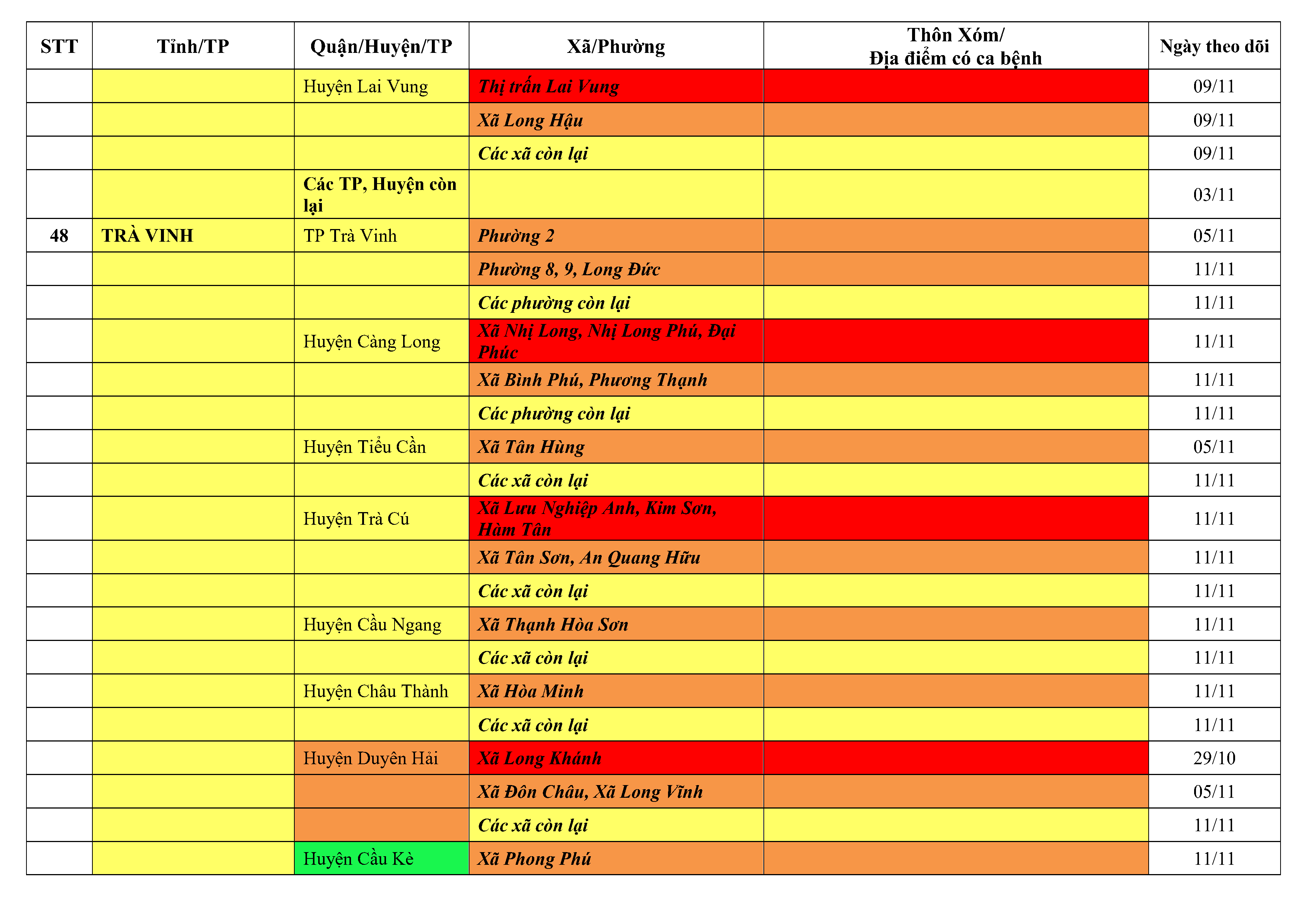 Lưu ý: Các tỉnh, thành phố không có tên trong bảng màu, đi lại bình thường, tuân thủ các biện pháp phòng chống dịch theo chỉ đạo của Bộ Y tế; khai báo y tế, thực hiện nghiêm 5K.