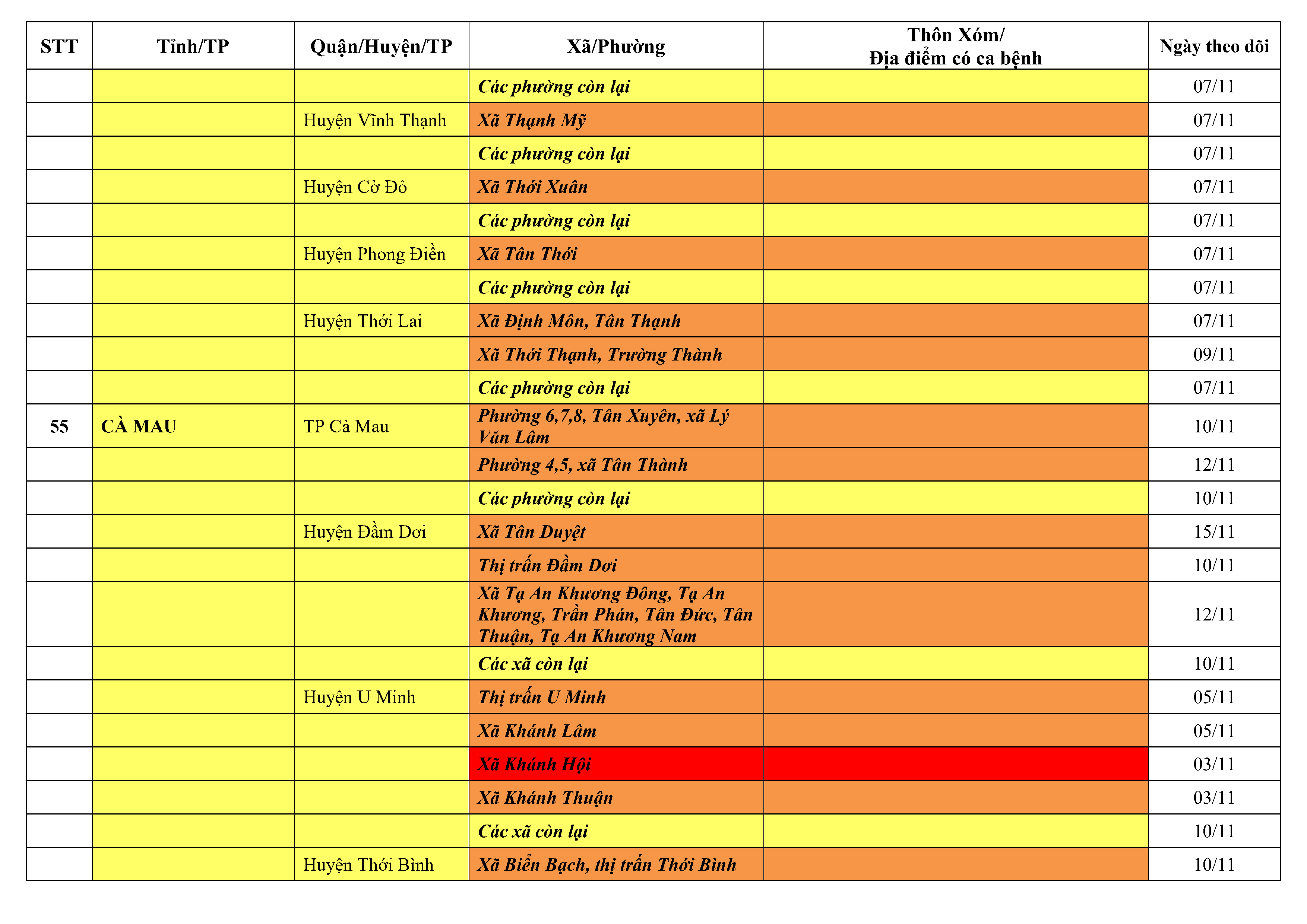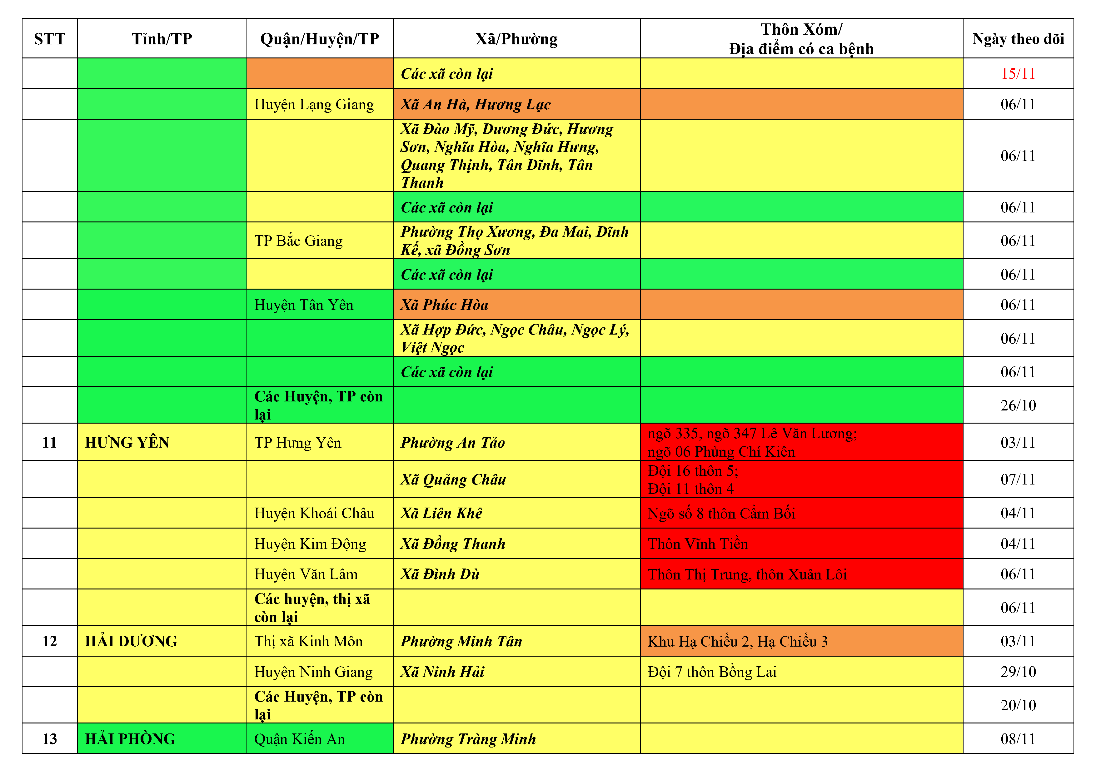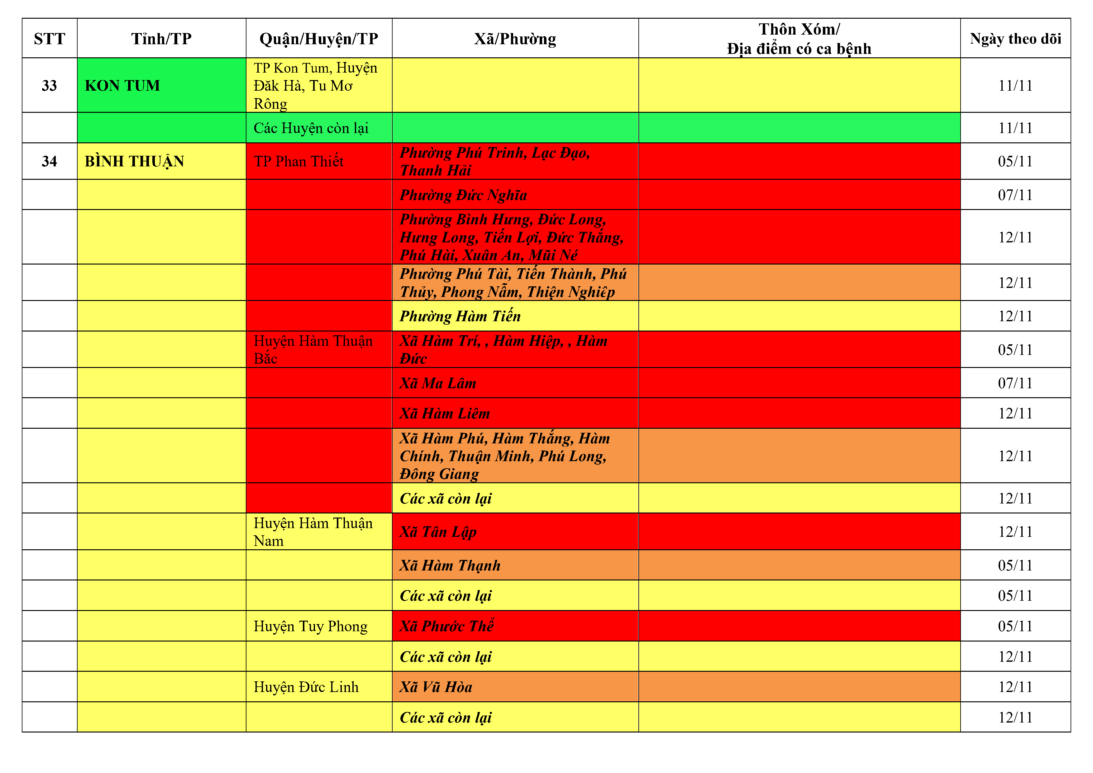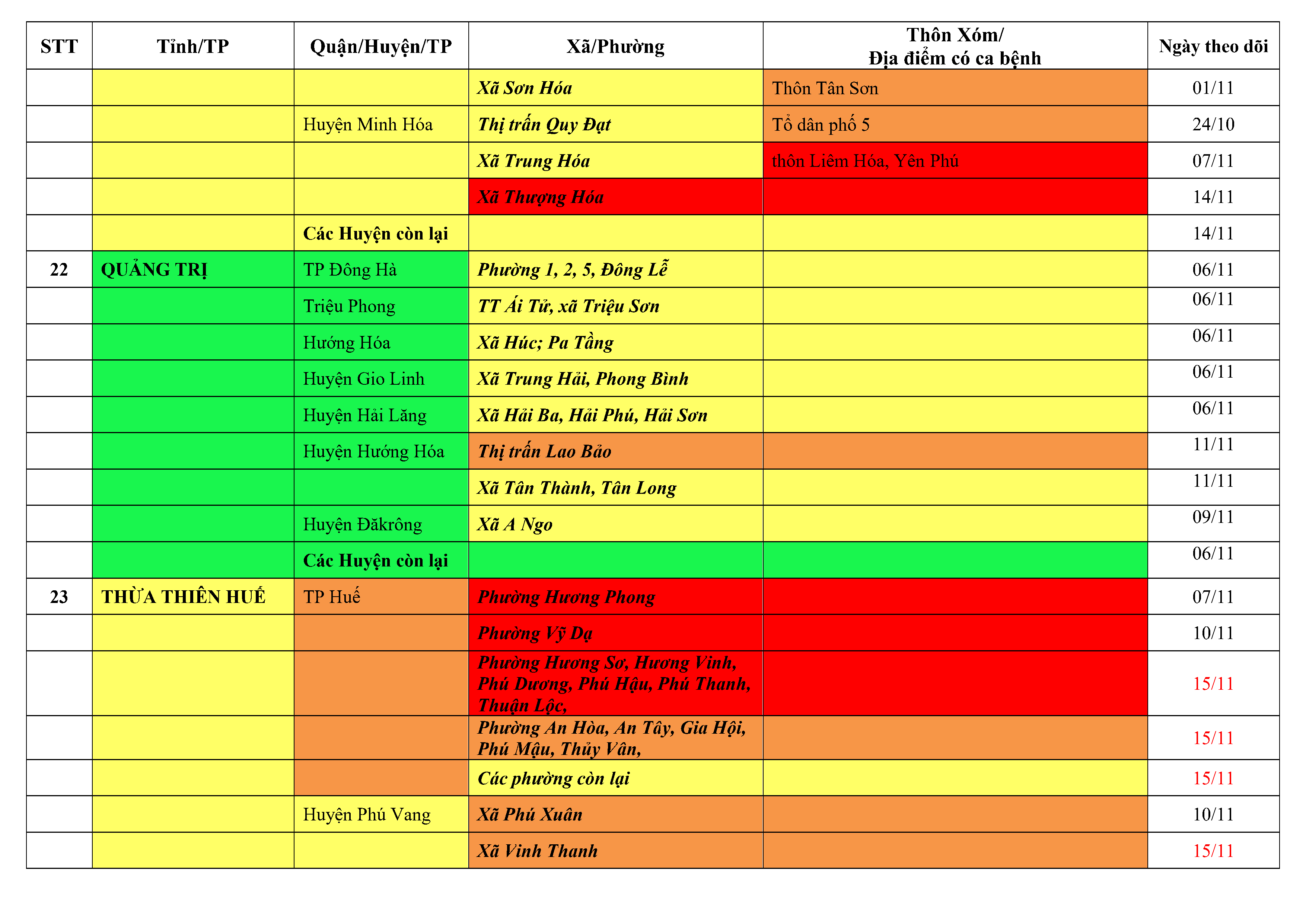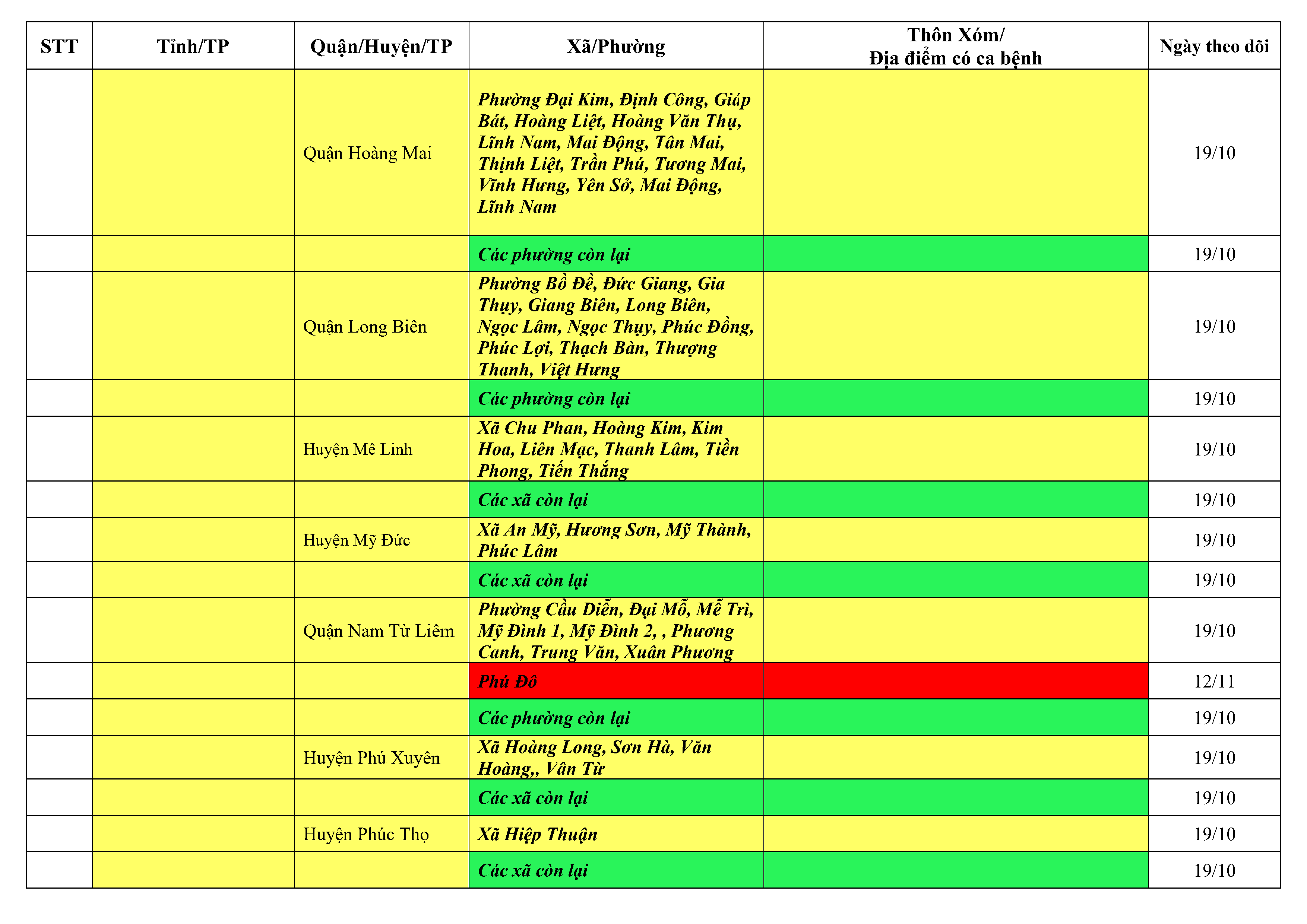 Lưu ý: Các tỉnh, thành phố không có tên trong bảng màu, đi lại bình thường, tuân thủ các biện pháp phòng chống dịch theo chỉ đạo của Bộ Y tế; khai báo y tế, thực hiện nghiêm 5K.