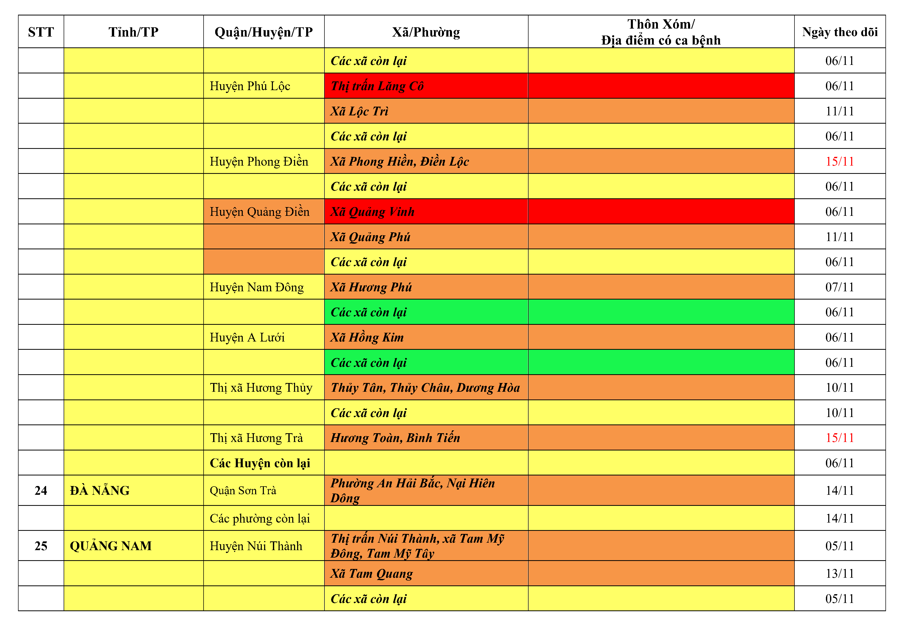 Áp dụng biện pháp tương ứng màu sắc ô cột theo thôn xóm; xã phường; quận huyện; tỉnh thành phố. Cách ly y tế dựa vào việc tiếp xúc, đi đến địa điểm và nơi cư trú có ca bệnh, theo Thông báo của Bộ Y tế, các tỉnh thành phố.