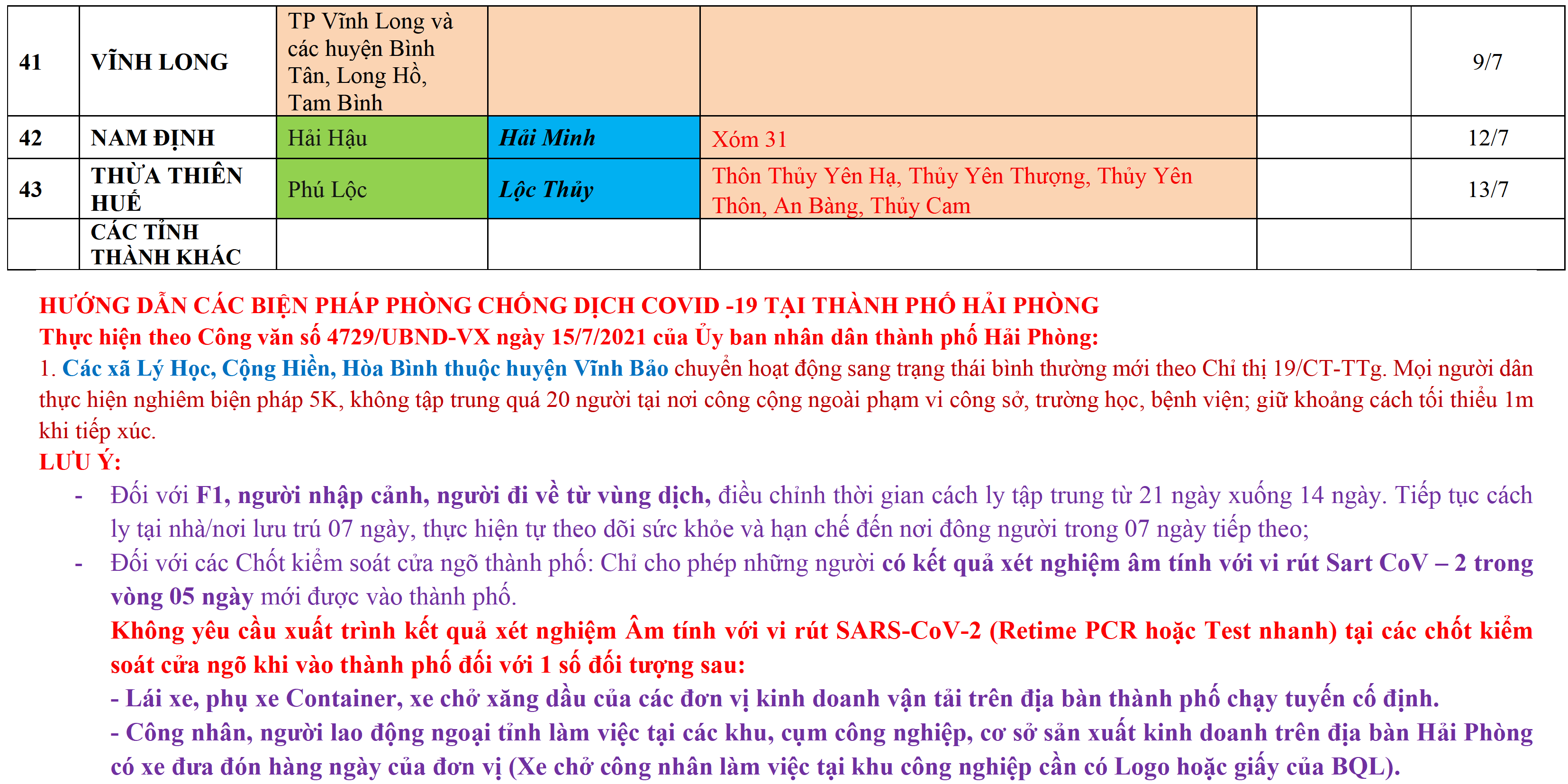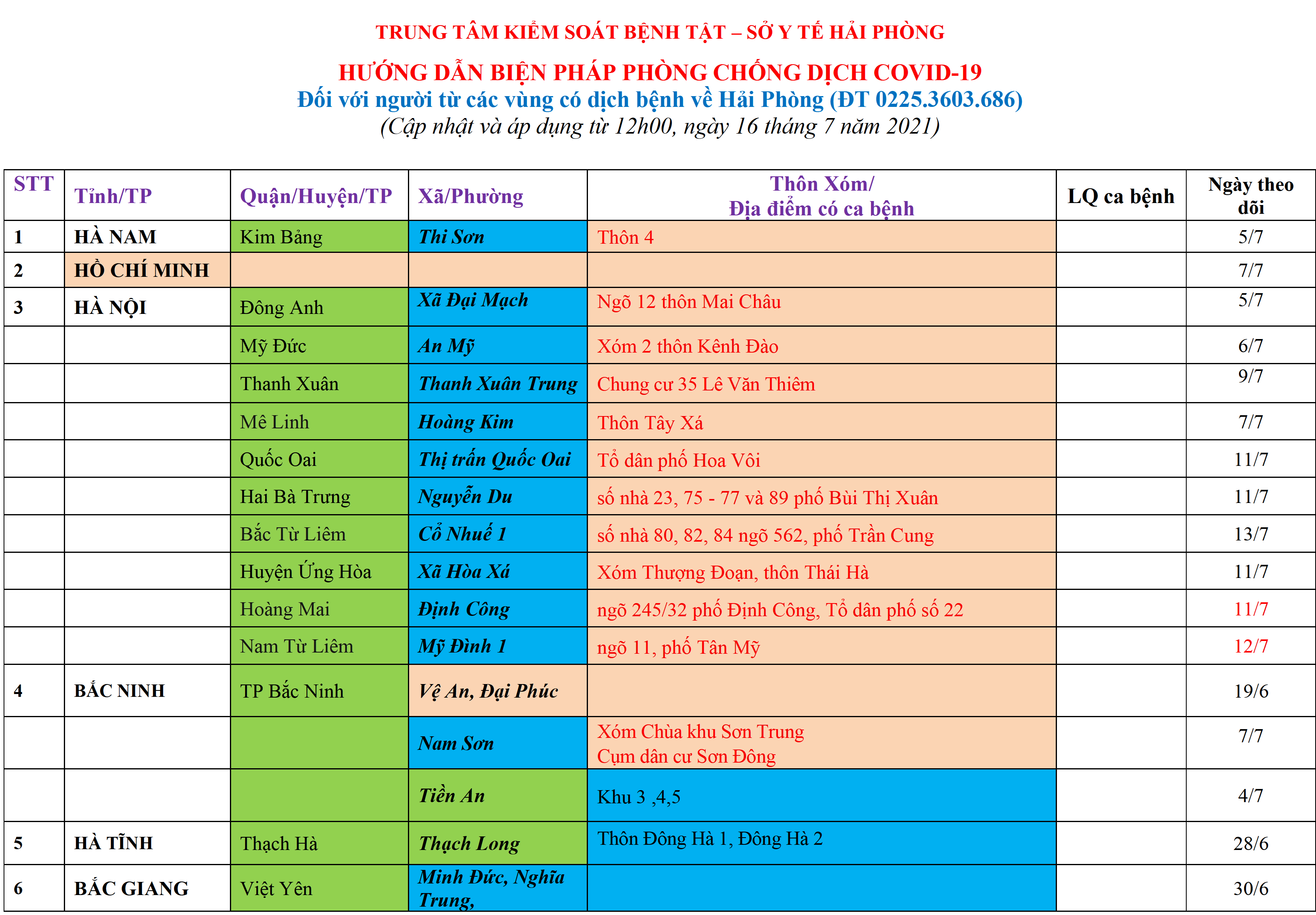 CDC Hải Phòng ban hành hướng dẫn tạm thời biện pháp phòng chống dịch COVID-19 đối với người từ các tỉnh, thành khác về thành phố như sau (thông tin cập nhật vào 12h00’ ngày 16/7/2021):