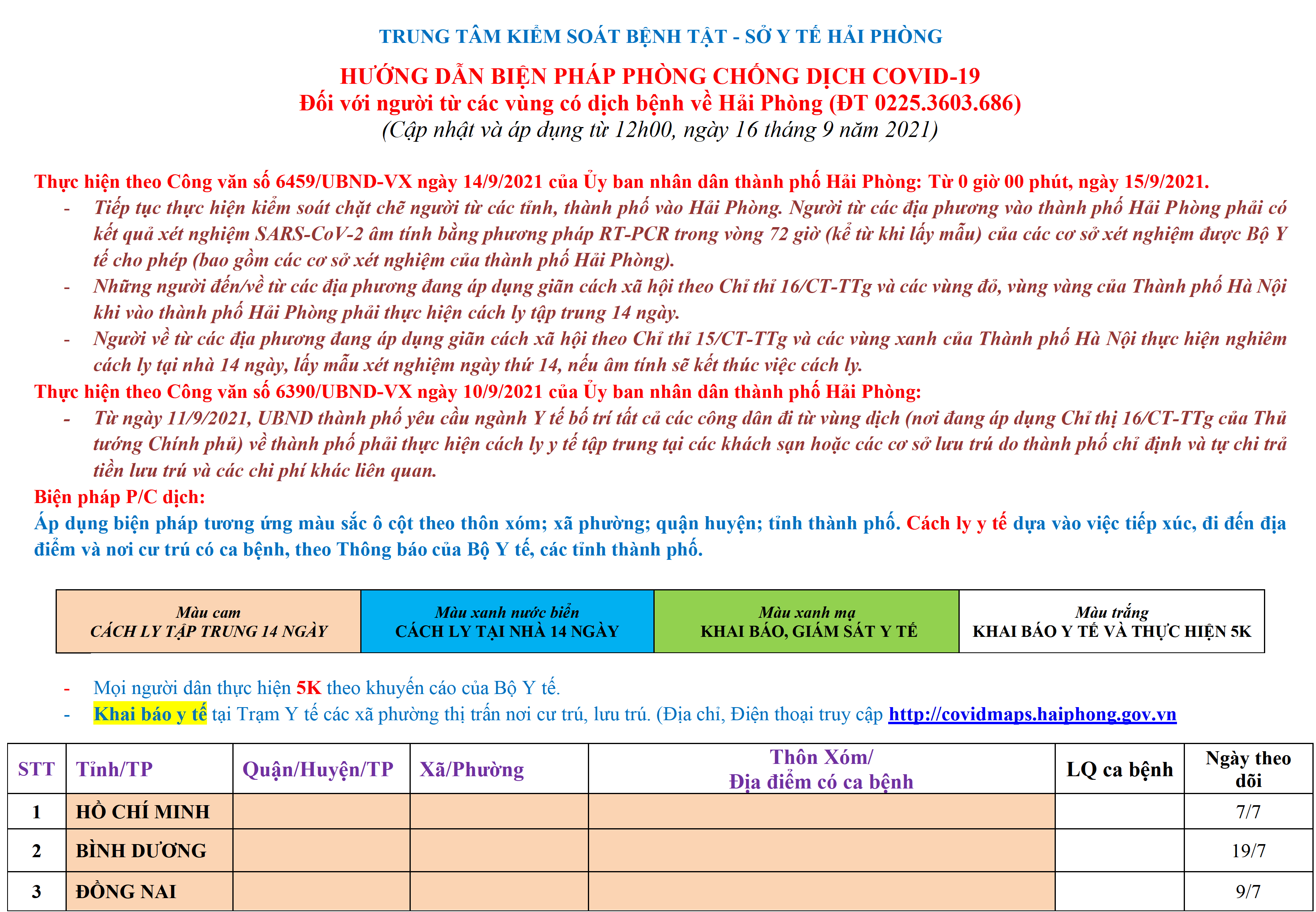 CDC Hải Phòng ban hành hướng dẫn tạm thời biện pháp phòng chống dịch COVID-19 đối với người từ các tỉnh, thành khác về thành phố như sau (thông tin cập nhật vào 12h00’ ngày 16/9/2021):