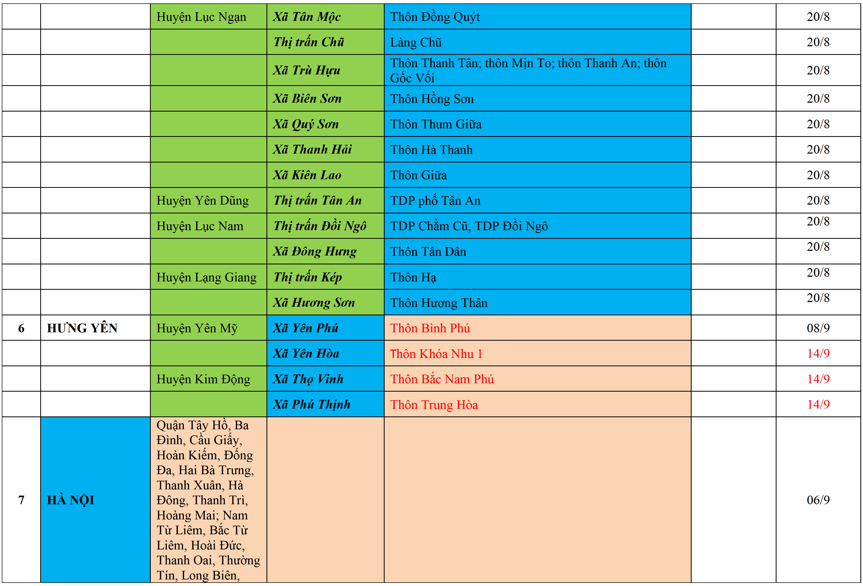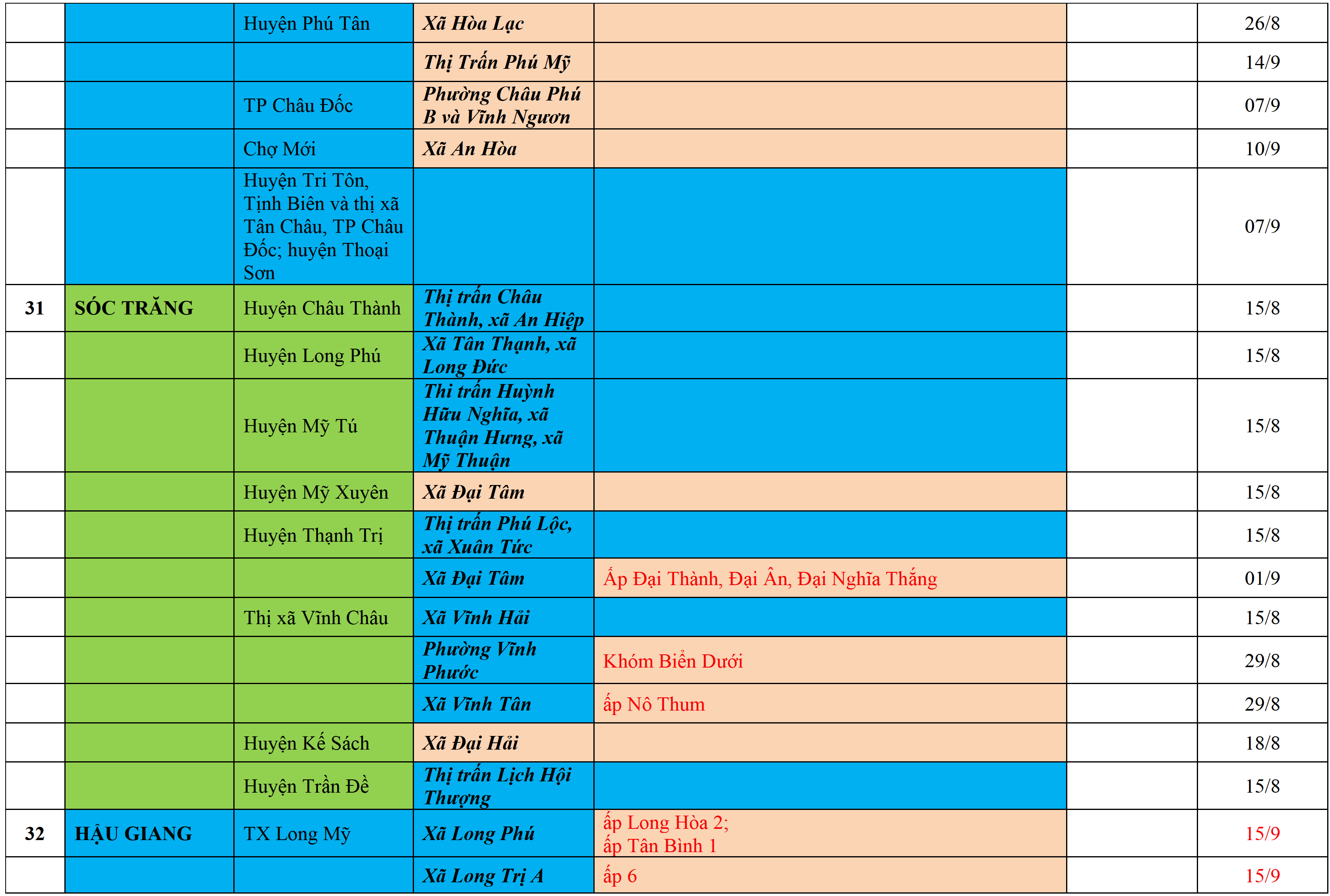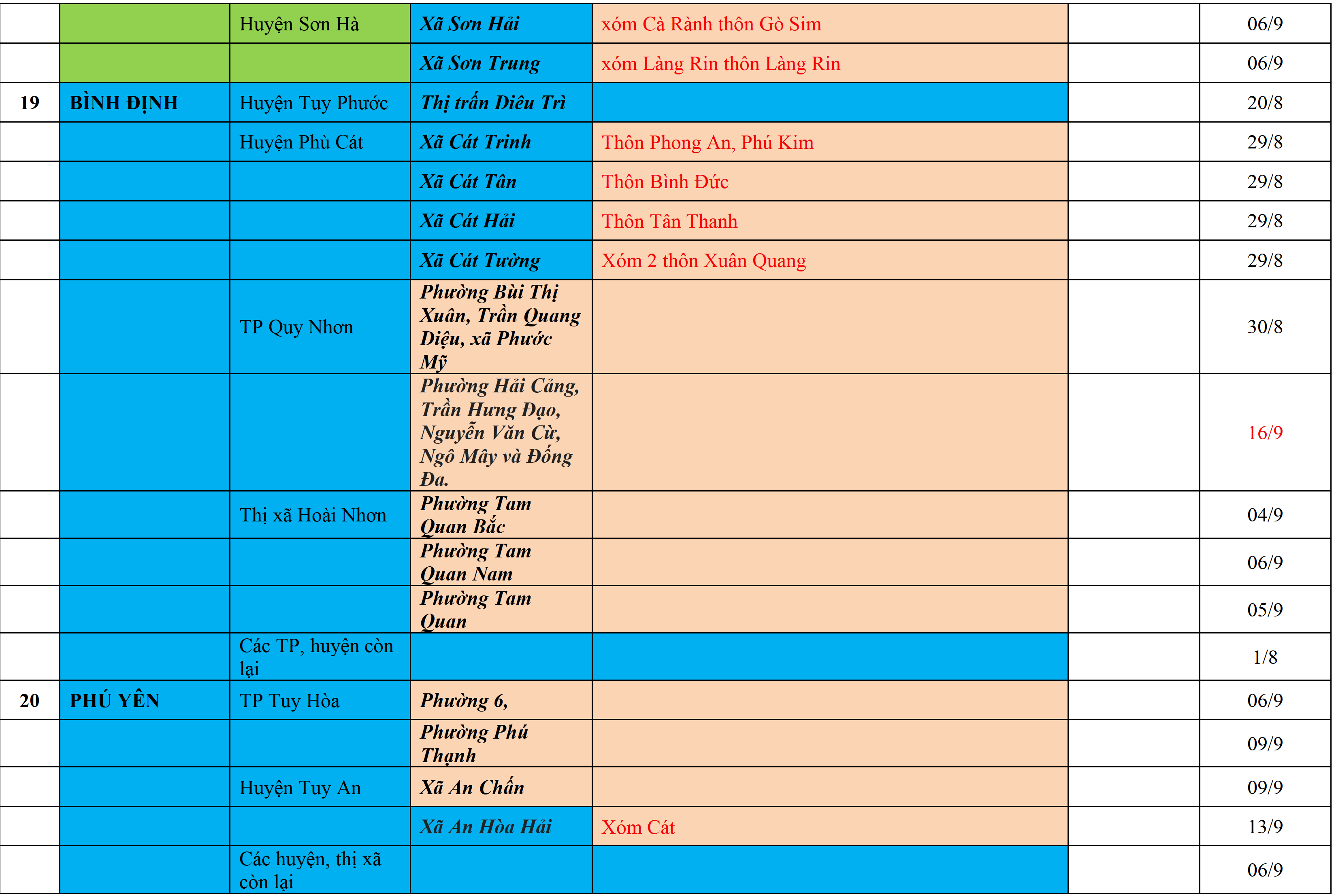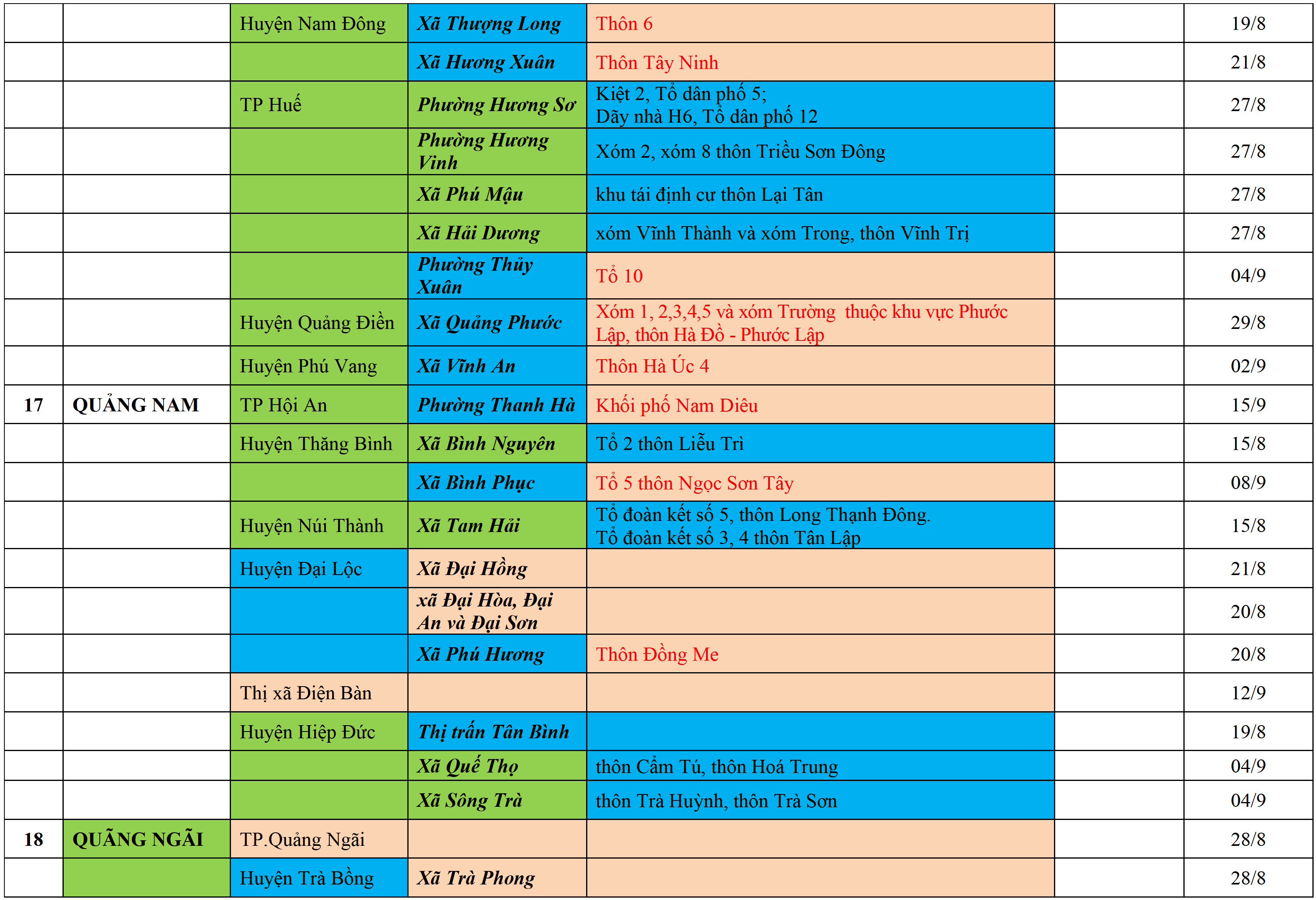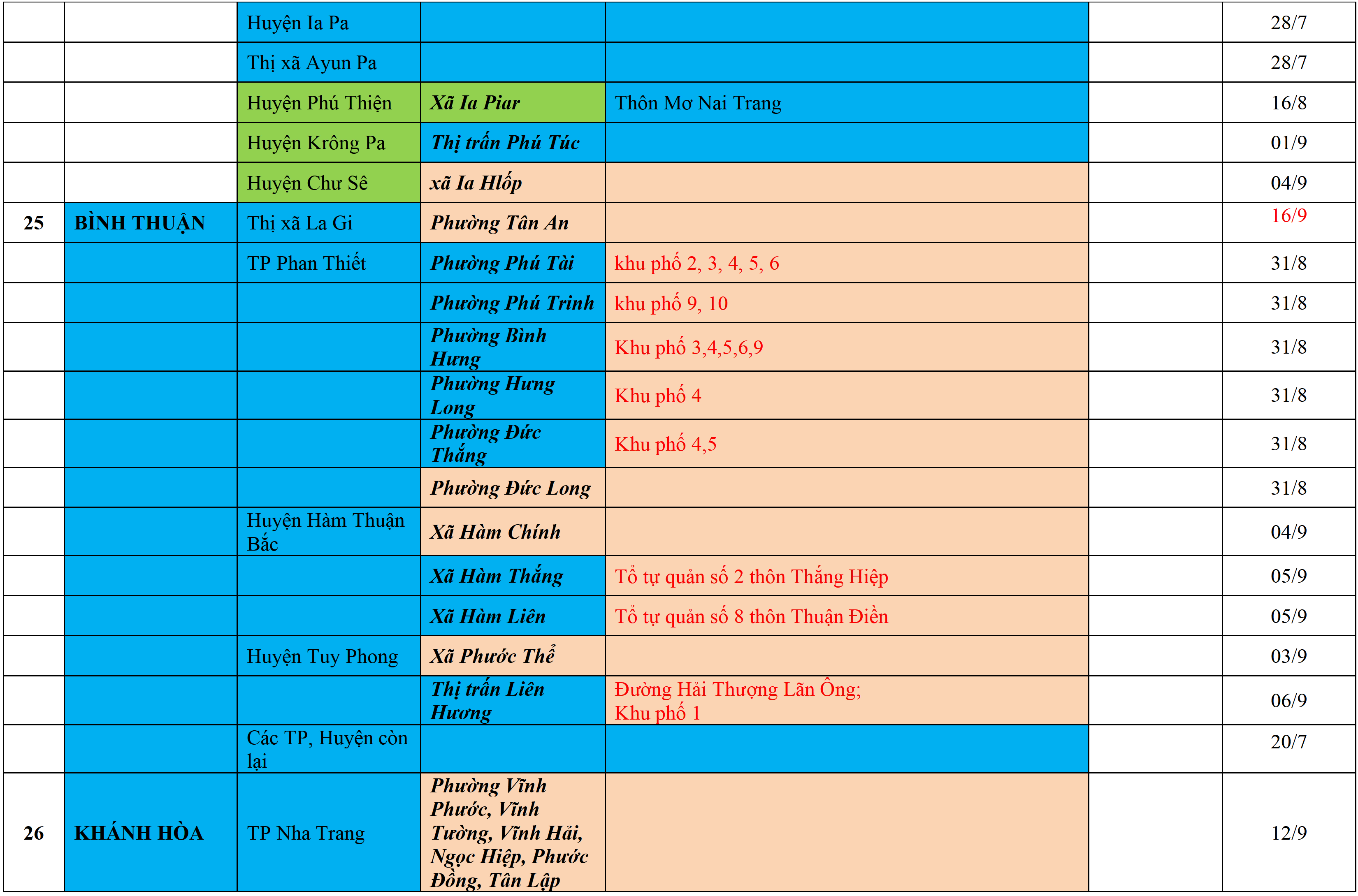 Màu nâu: TẠM DỪNG TIẾP NHẬN; Màu cam: CÁCH LY TẬP TRUNG 14 NGÀY; Màu xanh nước biển: CÁCH LY TẠI NHÀ 14 NGÀY; Màu xanh mạ: KHAI BÁO, GIÁM SÁT Y TẾ; Màu trắng: KHAI BÁO Y TẾ VÀ THỰC HIỆN 5K.