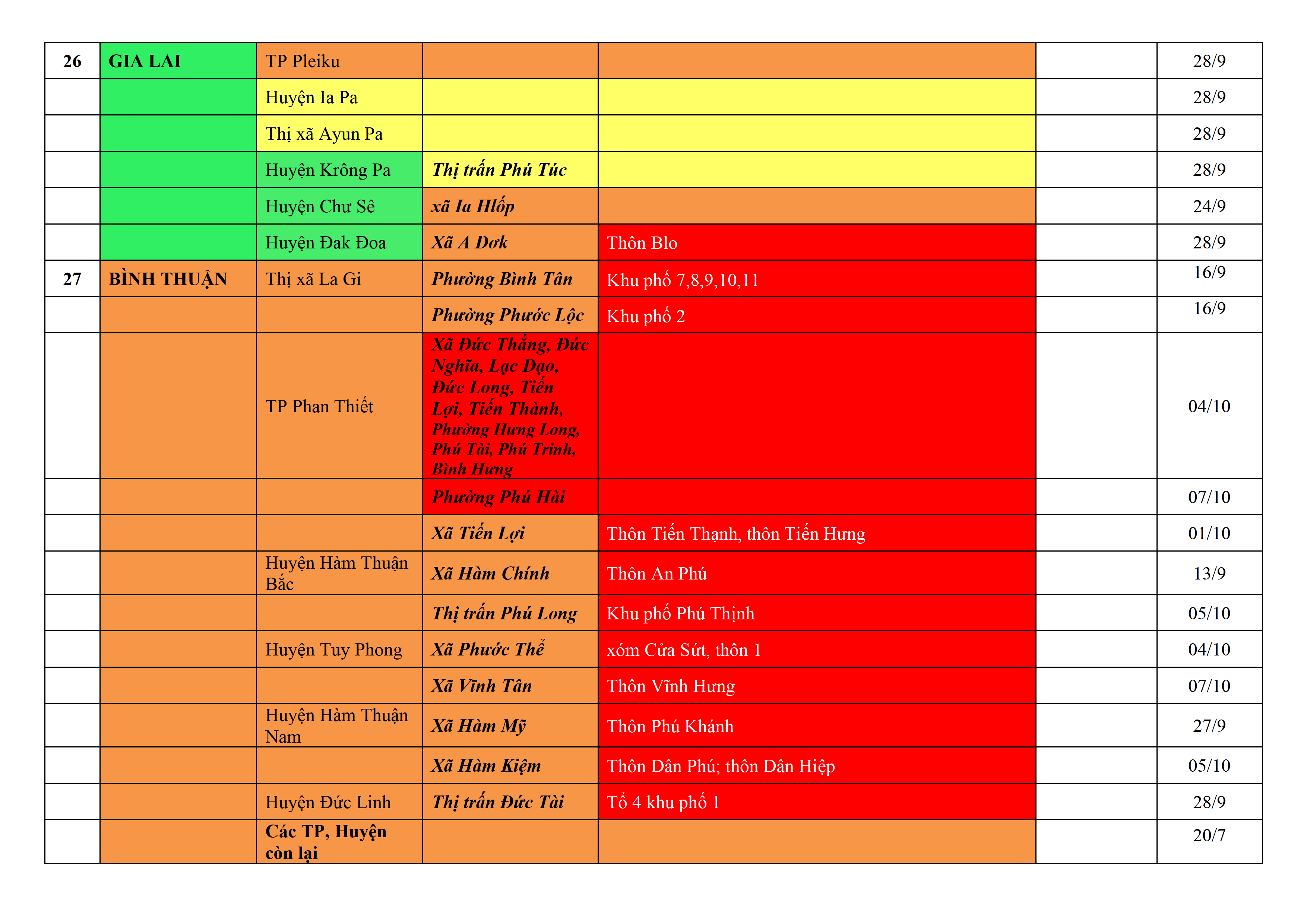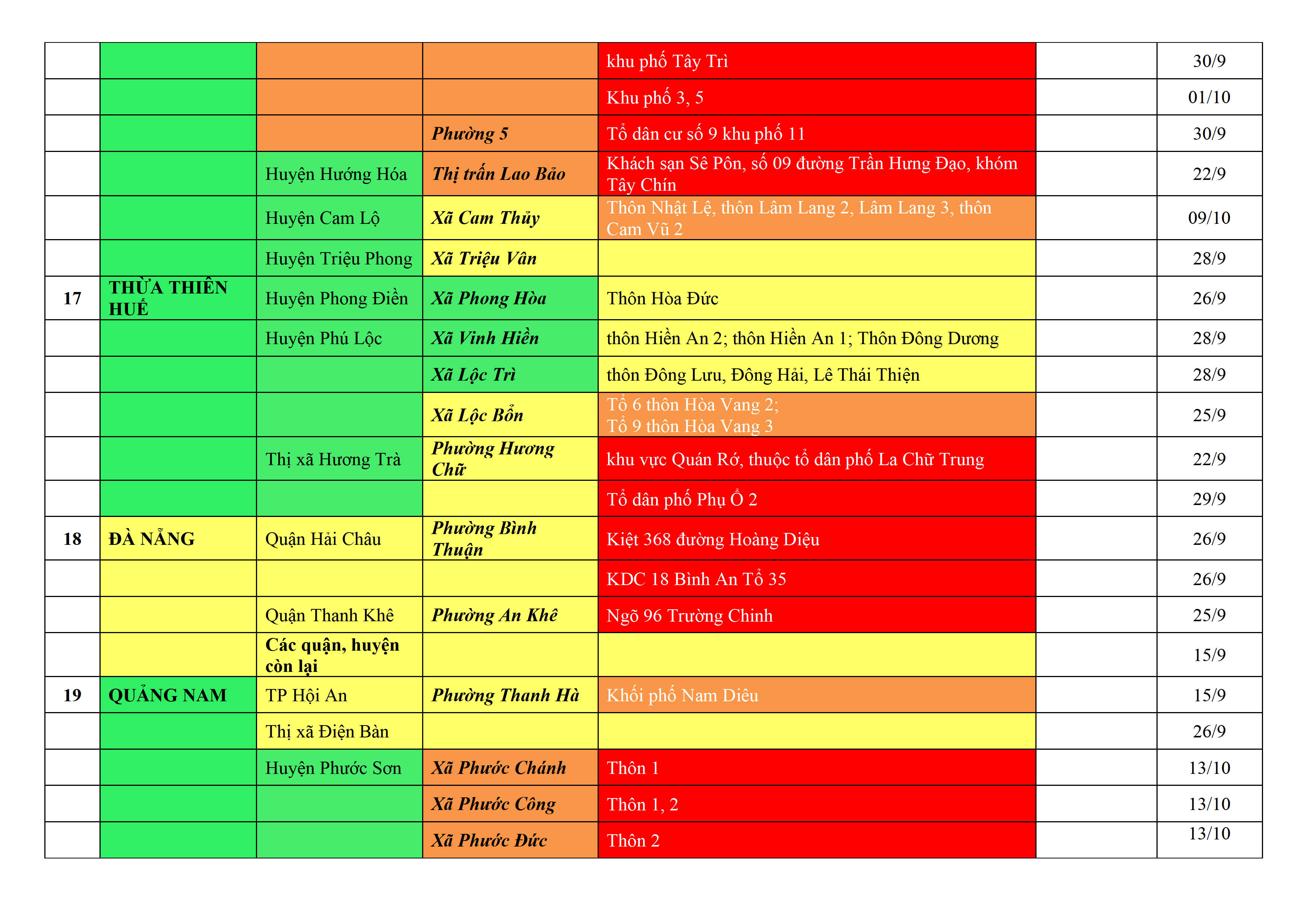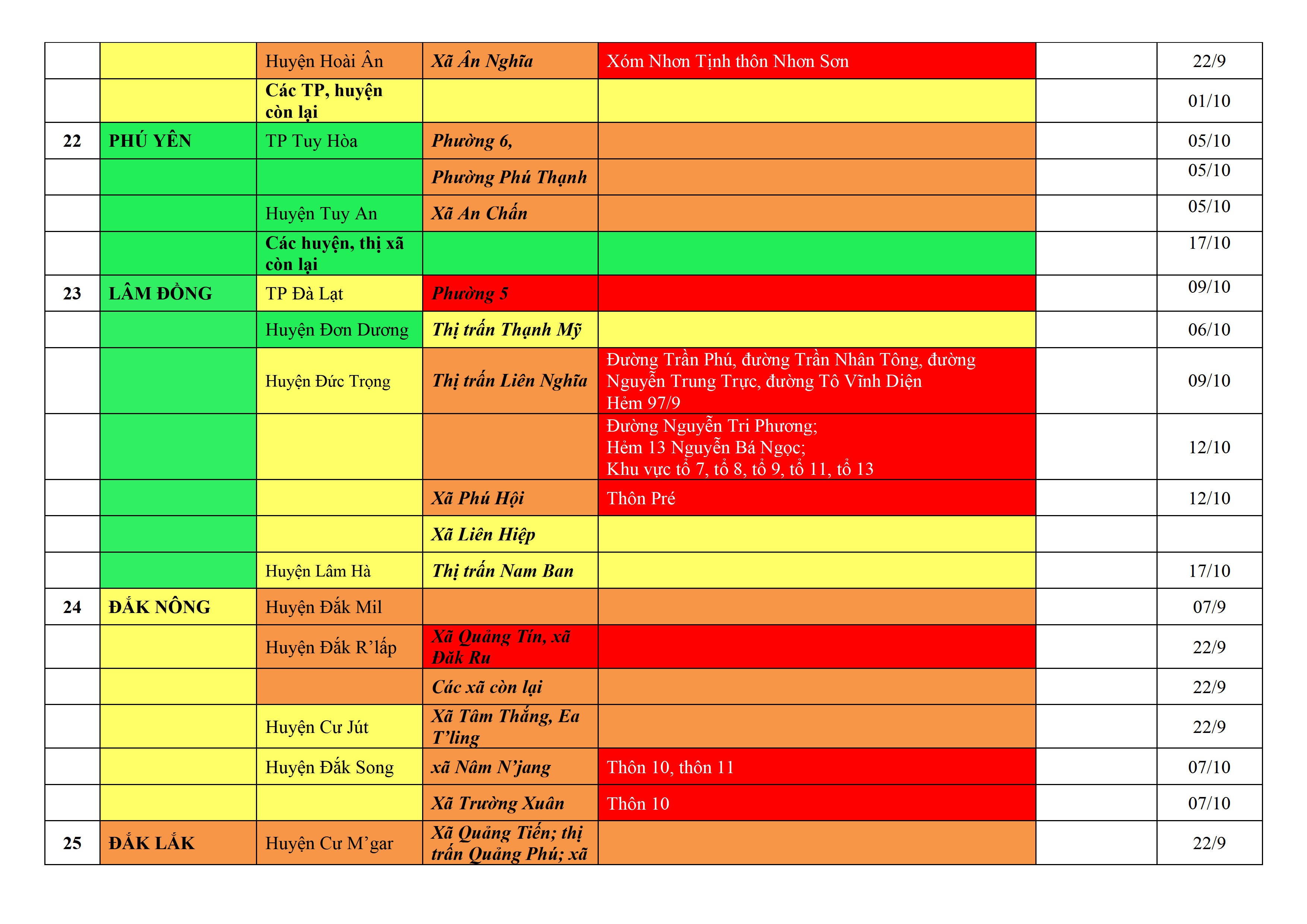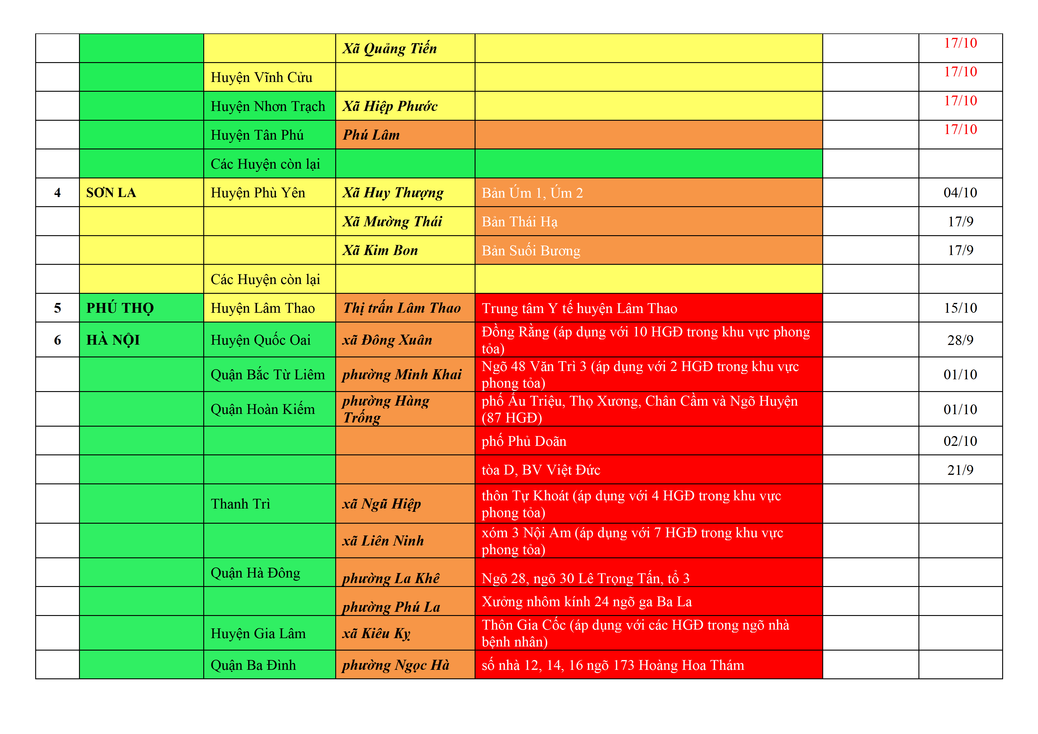 Lưu ý: các tỉnh, thành phố không có tên trong bảng màu, đi lại bình thường, tuân thủ các biện pháp phòng chống dịch theo chỉ đạo của Bộ Y tế; khai bào y tế, thực hiện nghiêm 5K.