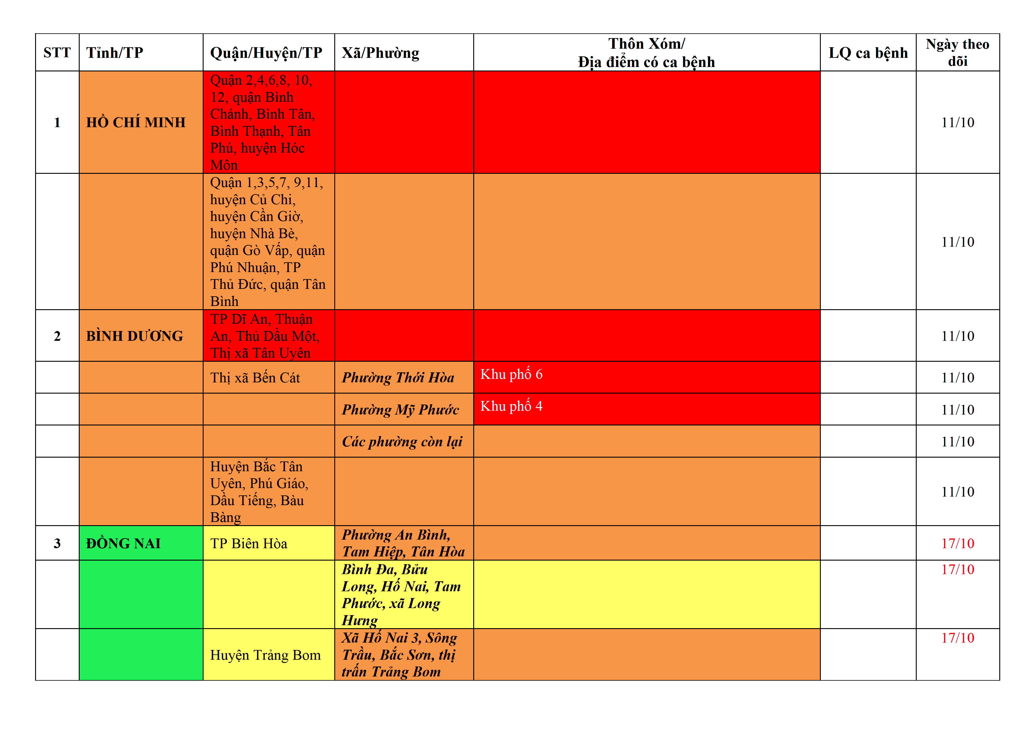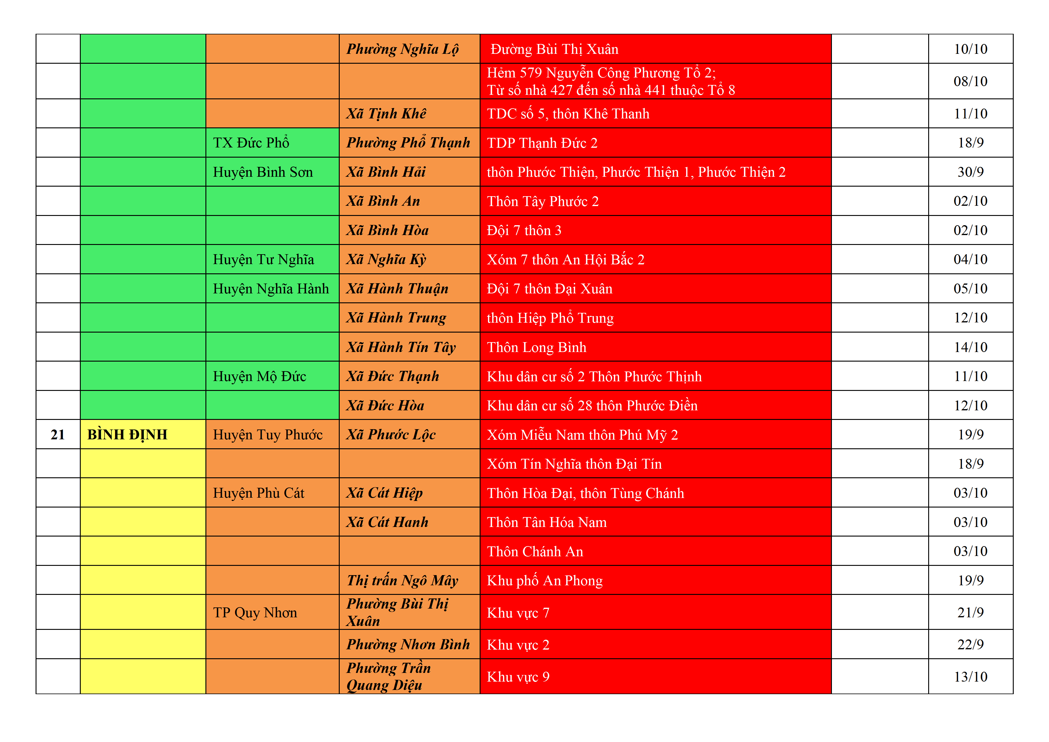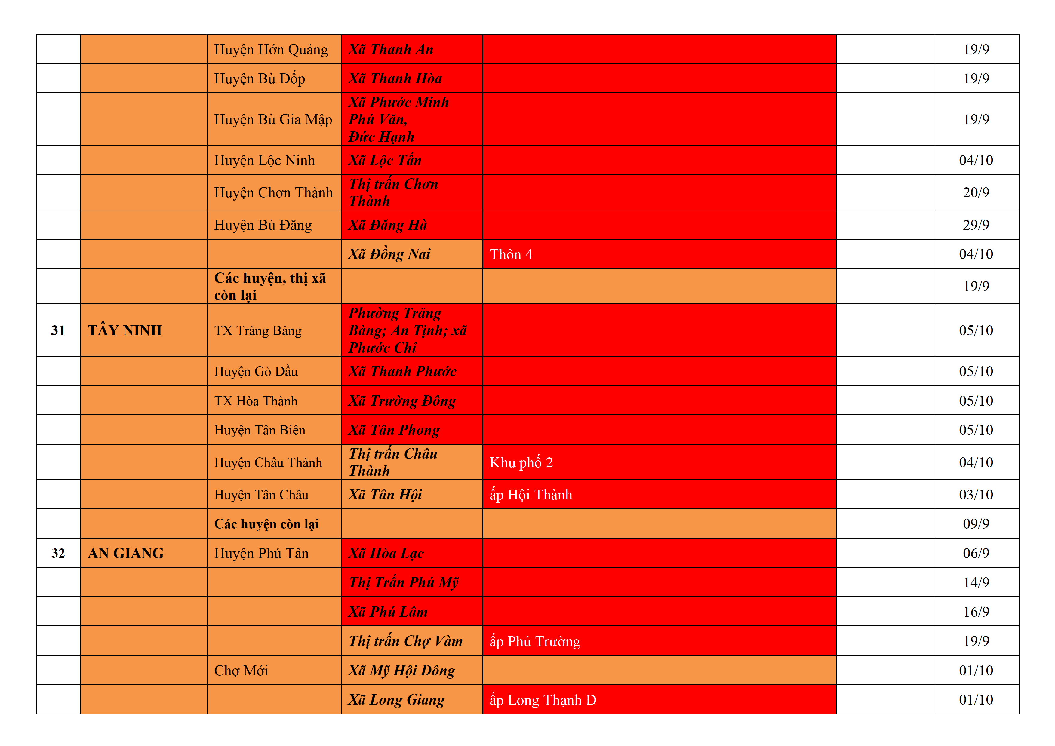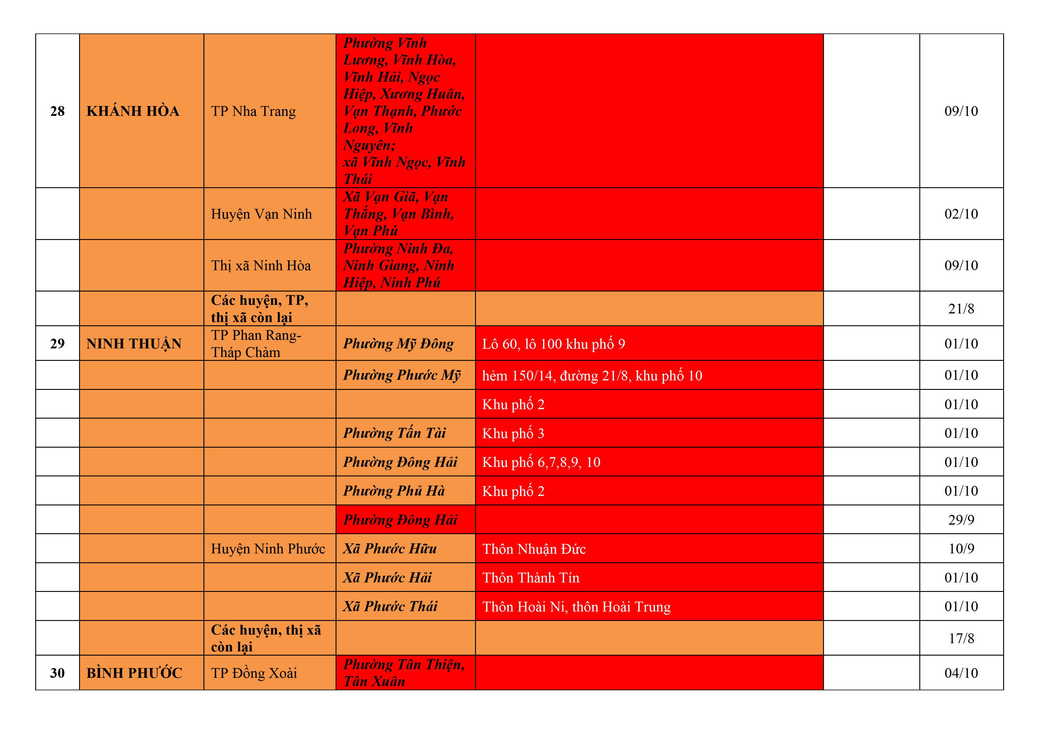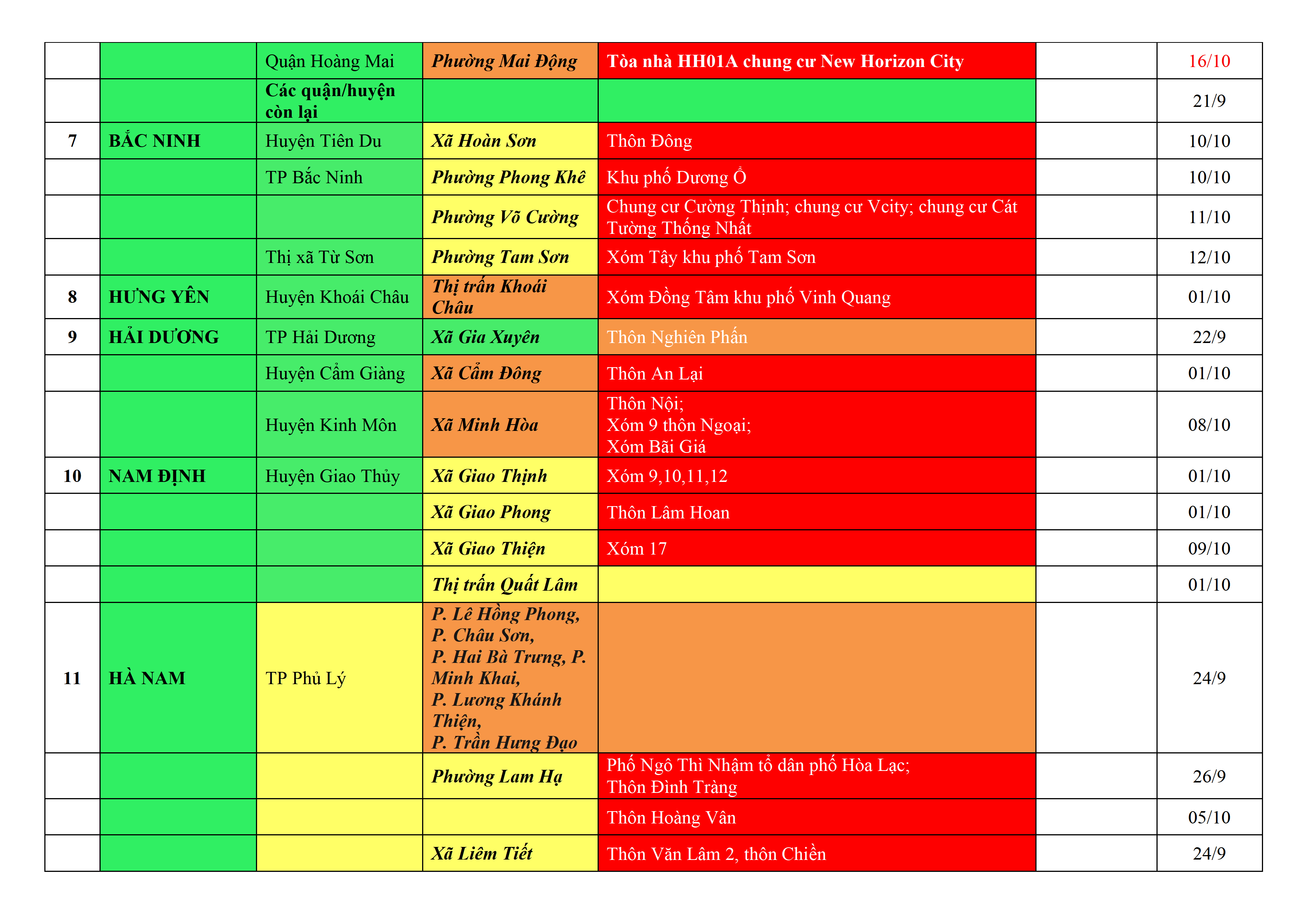 Lưu ý: các tỉnh, thành phố không có tên trong bảng màu, đi lại bình thường, tuân thủ các biện pháp phòng chống dịch theo chỉ đạo của Bộ Y tế; khai bào y tế, thực hiện nghiêm 5K.