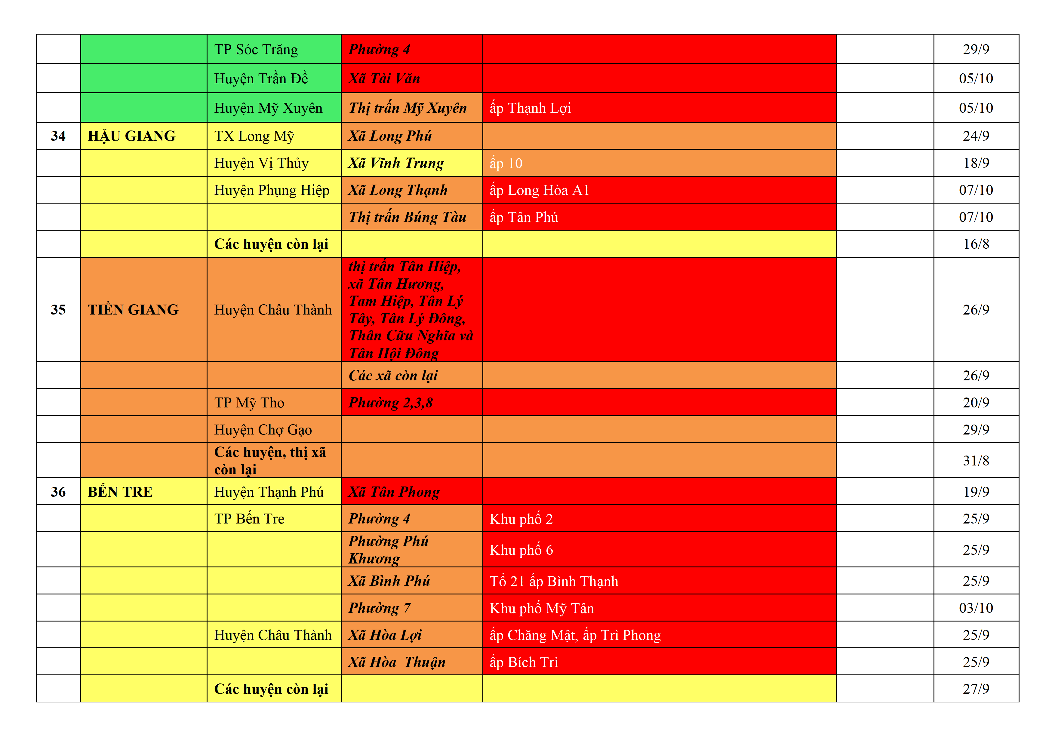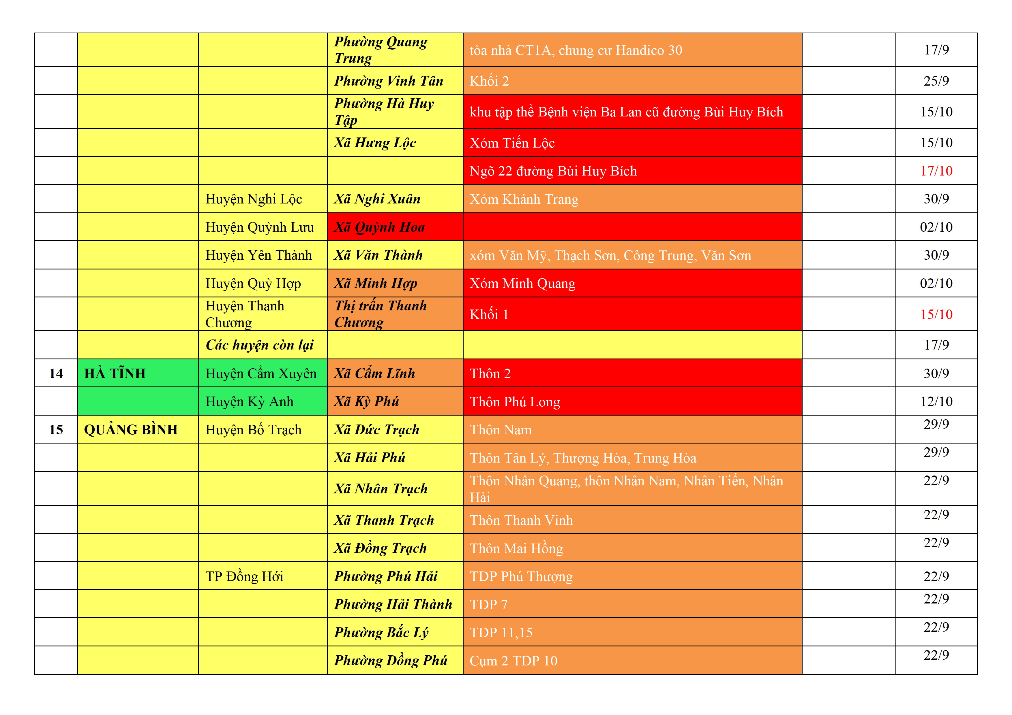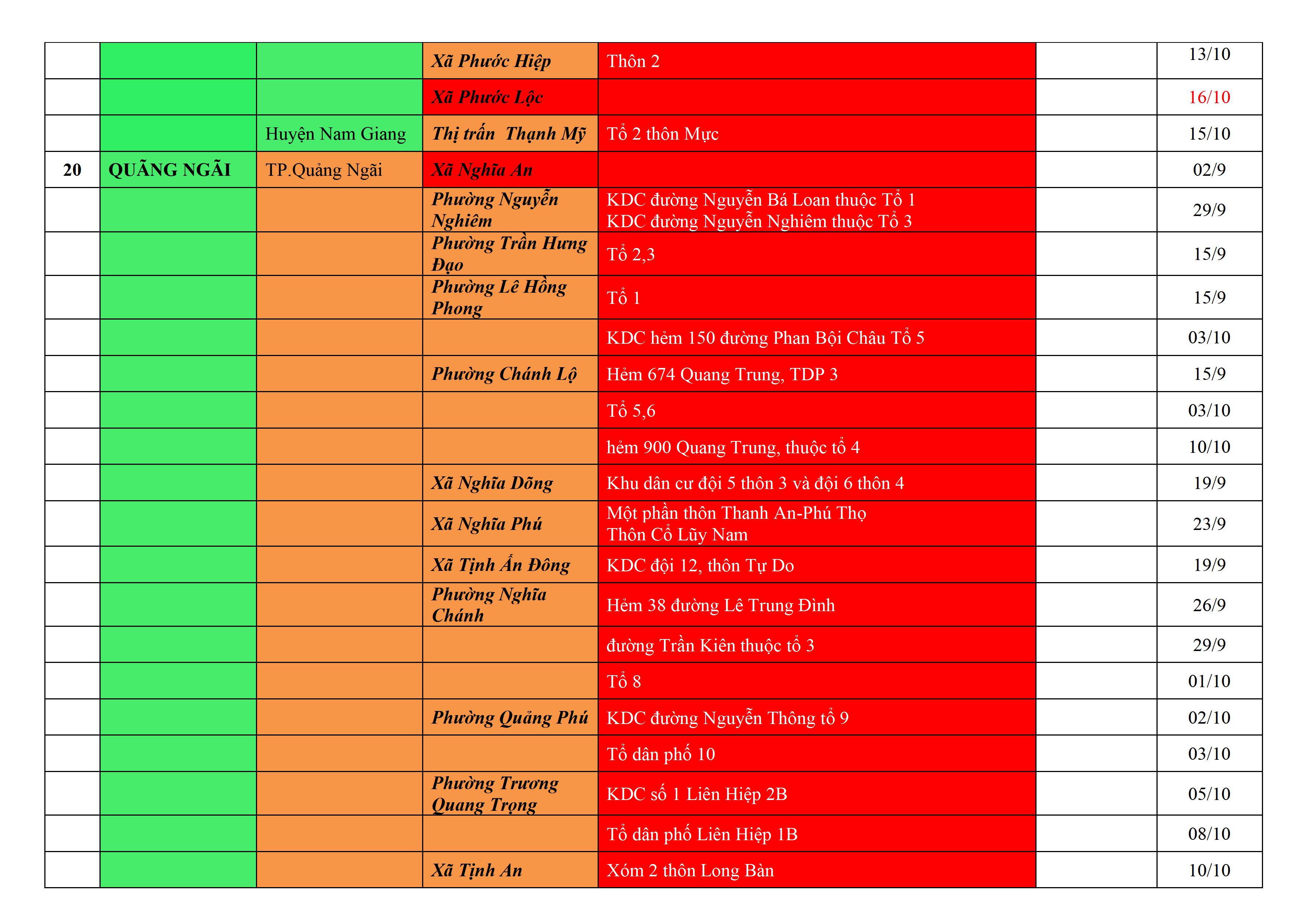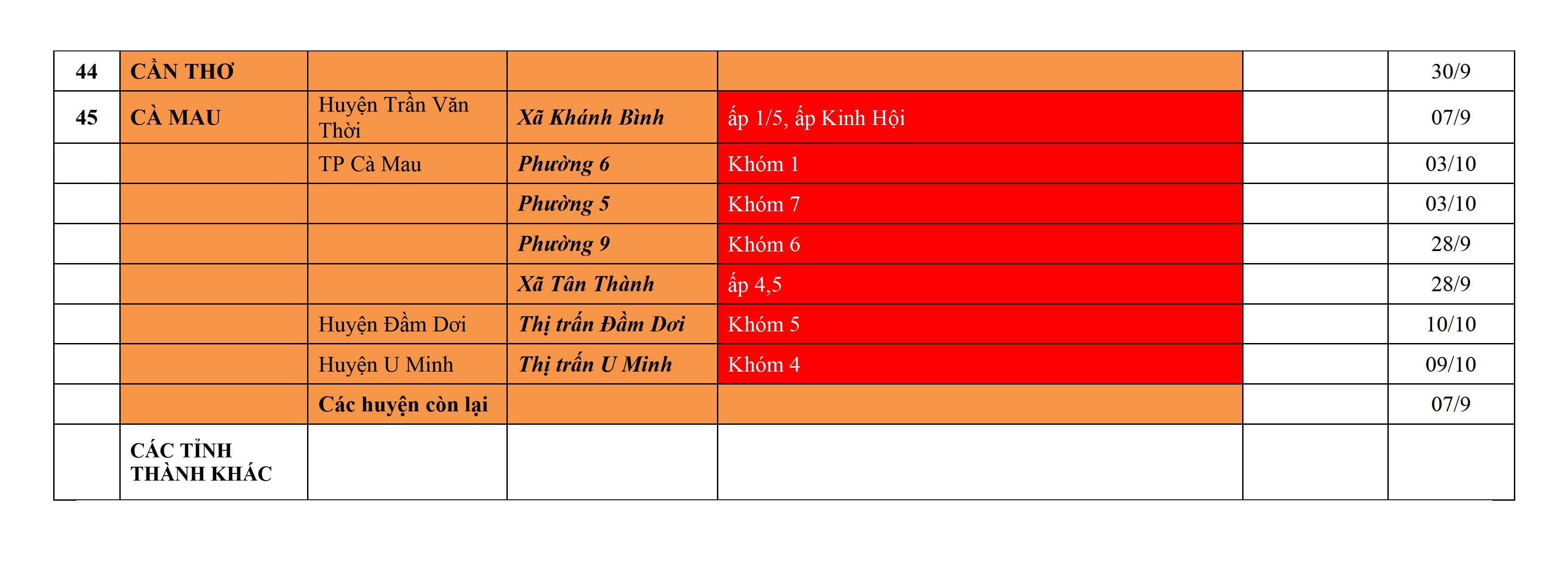 Lưu ý: các tỉnh, thành phố không có tên trong bảng màu, đi lại bình thường, tuân thủ các biện pháp phòng chống dịch theo chỉ đạo của Bộ Y tế; khai bào y tế, thực hiện nghiêm 5K.