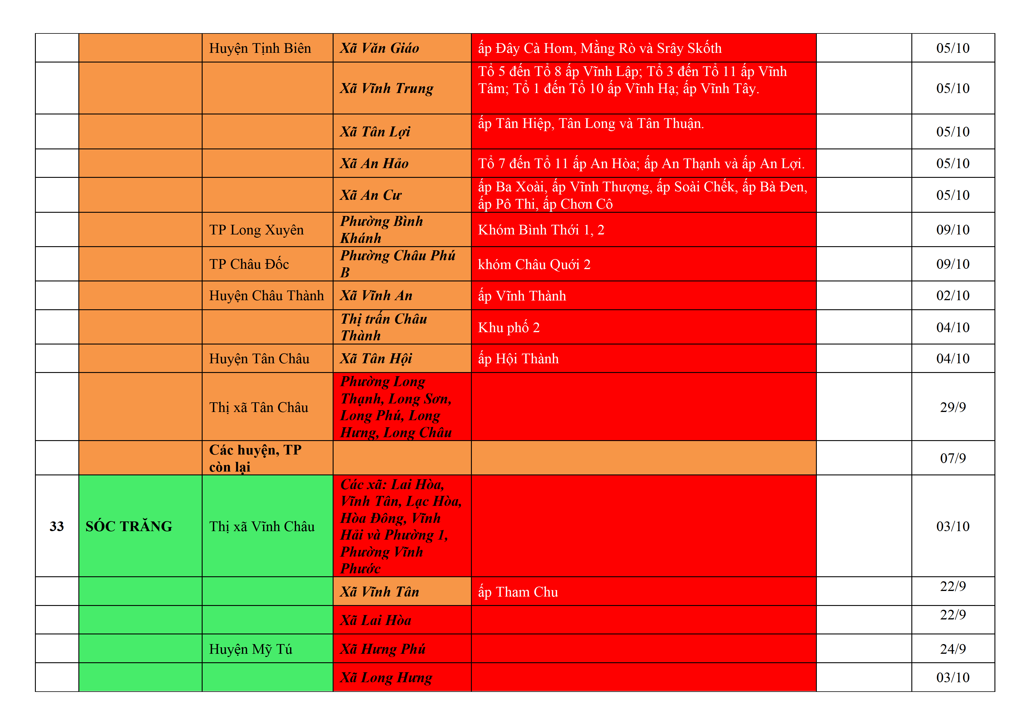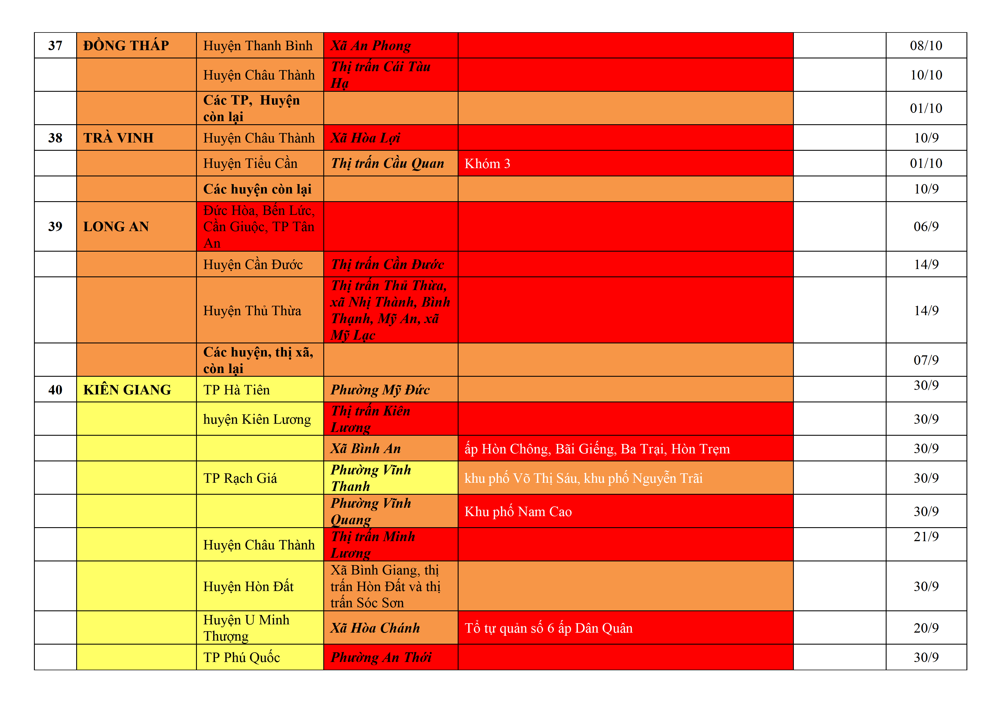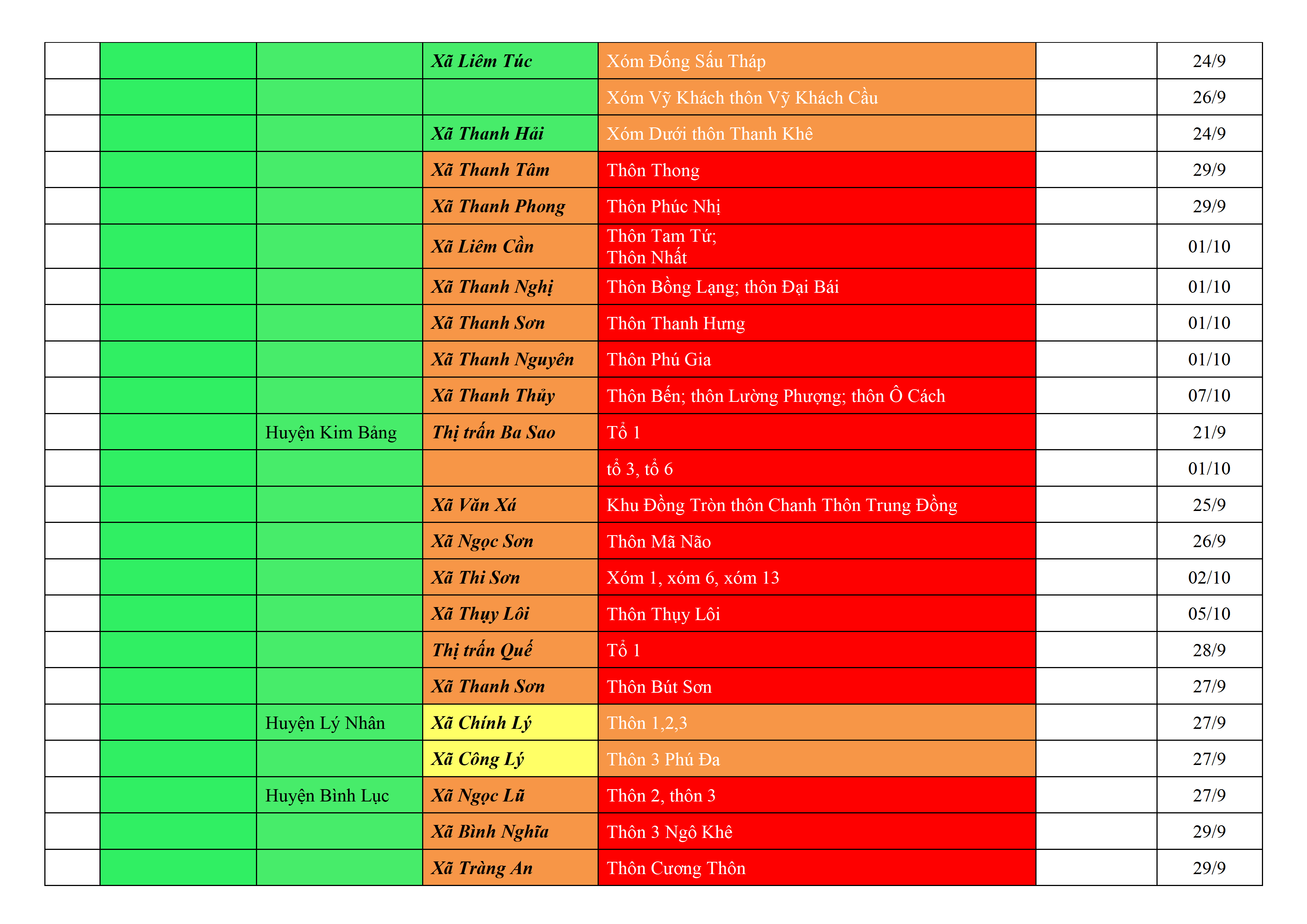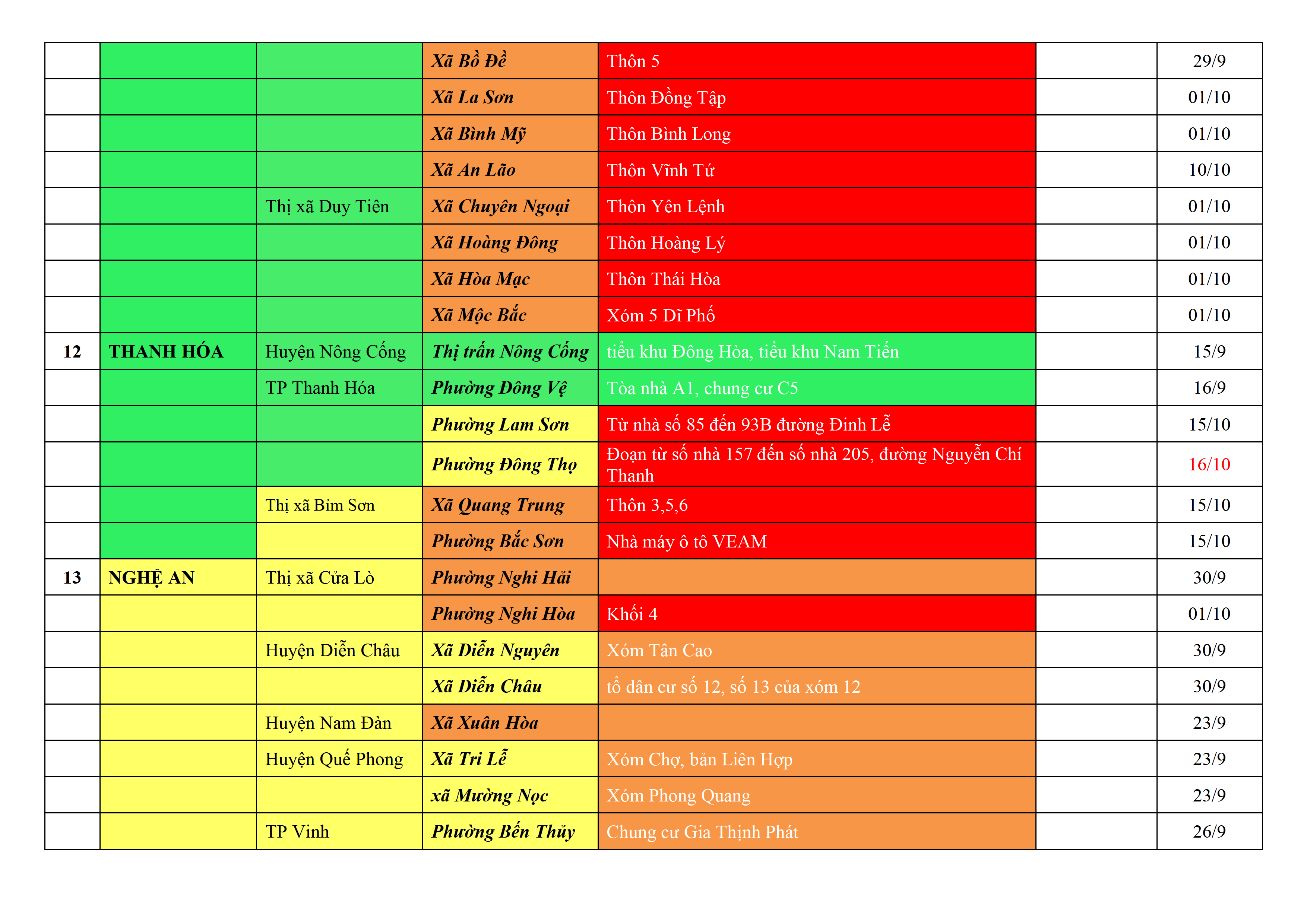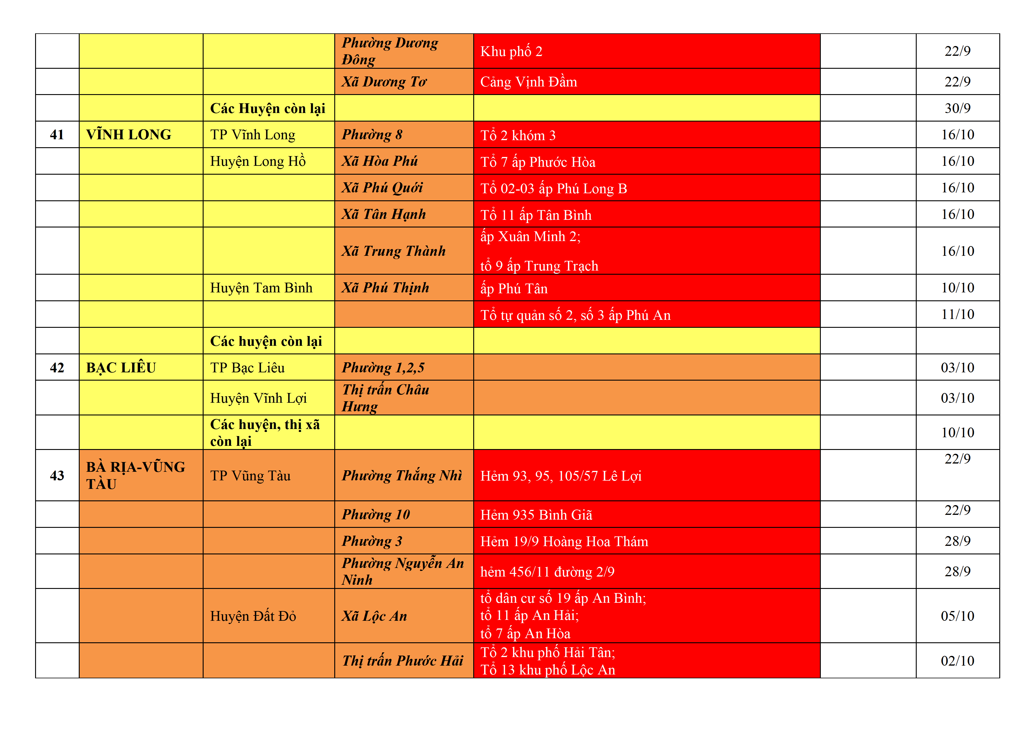 Lưu ý: các tỉnh, thành phố không có tên trong bảng màu, đi lại bình thường, tuân thủ các biện pháp phòng chống dịch theo chỉ đạo của Bộ Y tế; khai bào y tế, thực hiện nghiêm 5K.