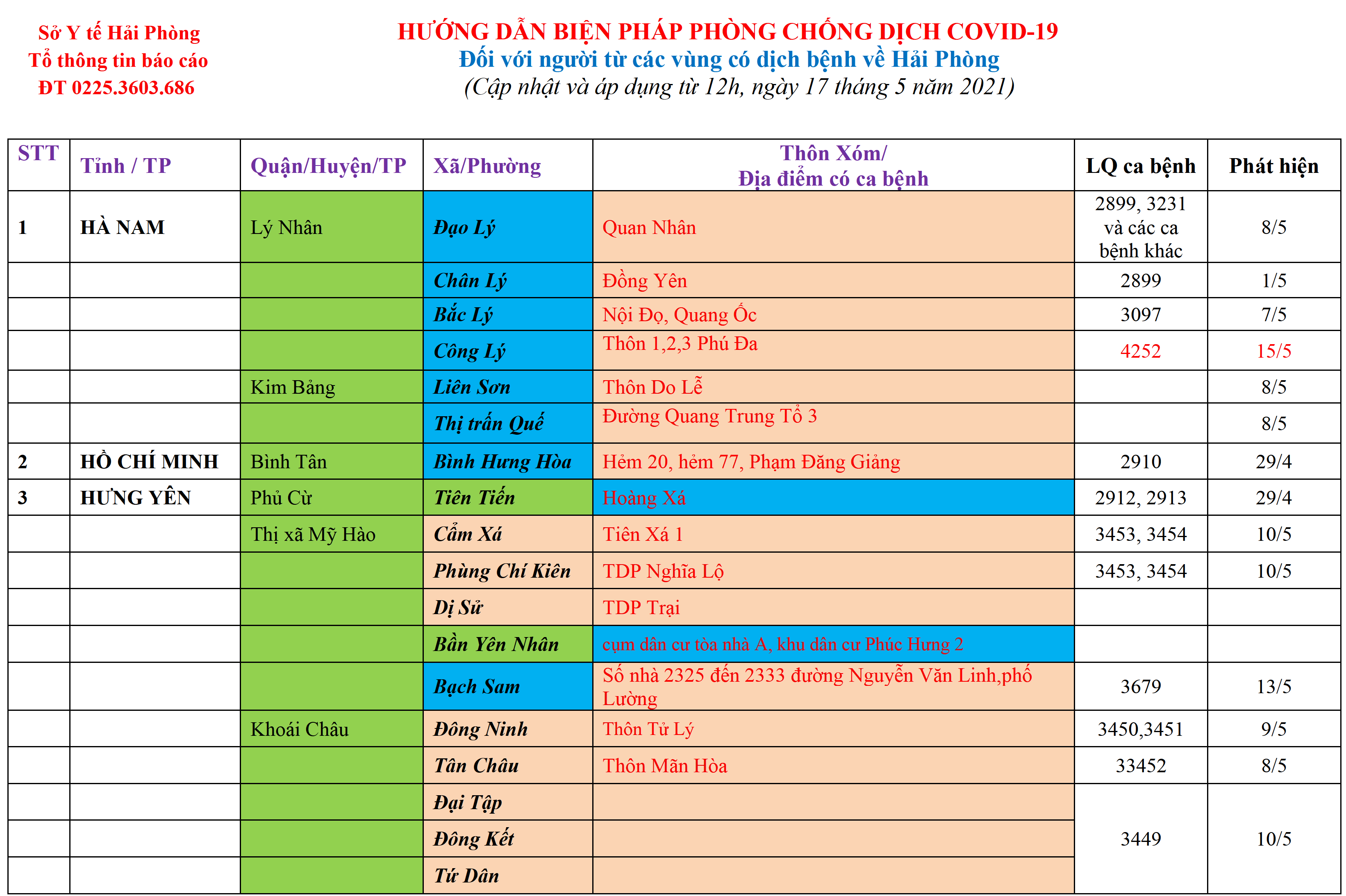 . Mọi người dân thực hiện 5K theo khuyến cáo của Bộ Y tế. Thực hiện công văn số 2803/UBND-VX ngày 30/4/2021; Thông báo số 164/TB-UBND ngày 5/5/2021, Công văn số 2928/UBND-VX ngày 8/5/2021, Thông báo số 2976/UBND-GT ngày 11/5/2021 về việc thực hiện các biện pháp phòng chống dịch COVID-19 trong hoạt động vận tải, của UBND TP Hải Phòng.