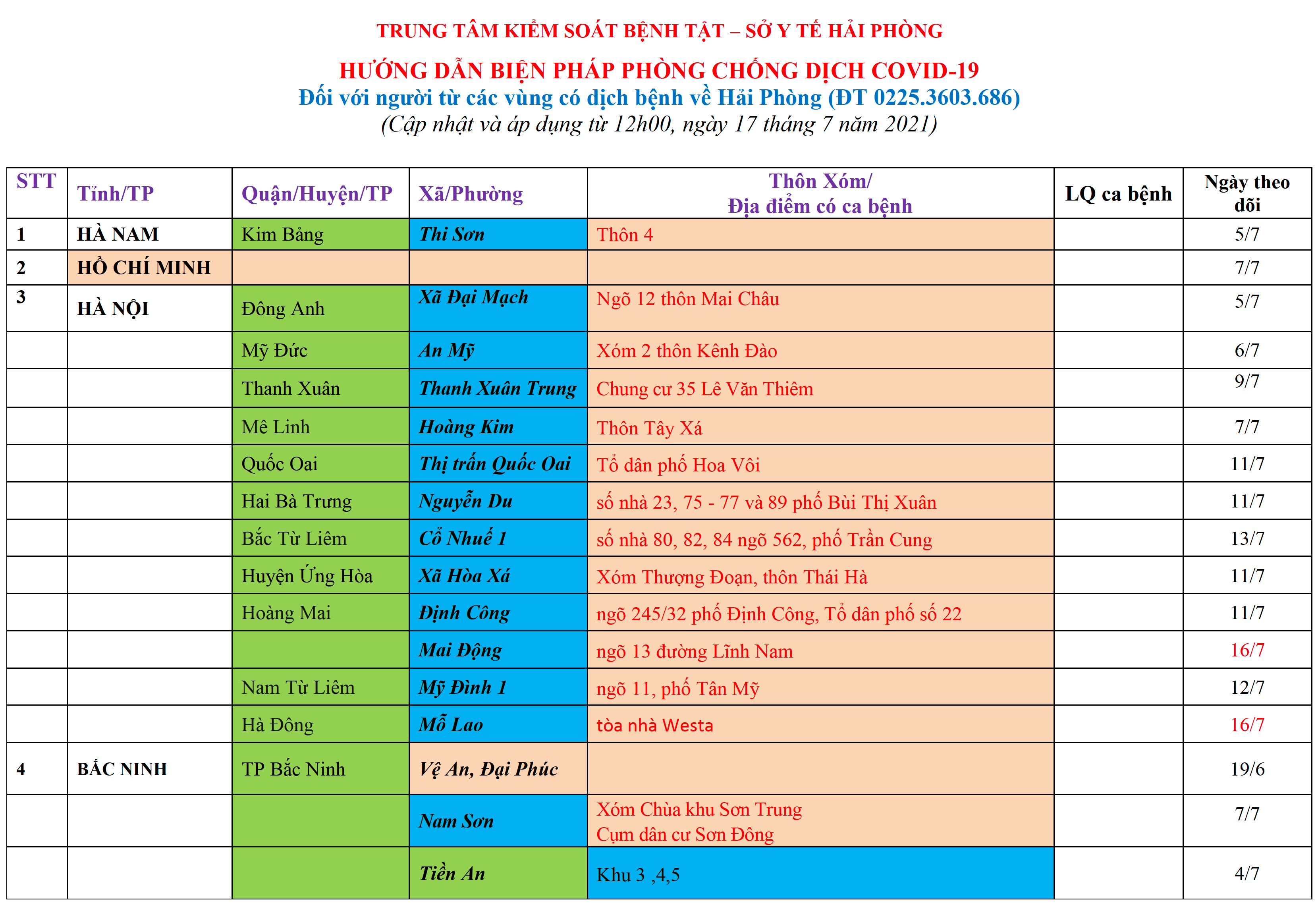 CDC Hải Phòng ban hành hướng dẫn tạm thời biện pháp phòng chống dịch COVID-19 đối với người từ các tỉnh, thành khác về thành phố như sau (thông tin cập nhật vào 12h00’ ngày 17/7/2021):