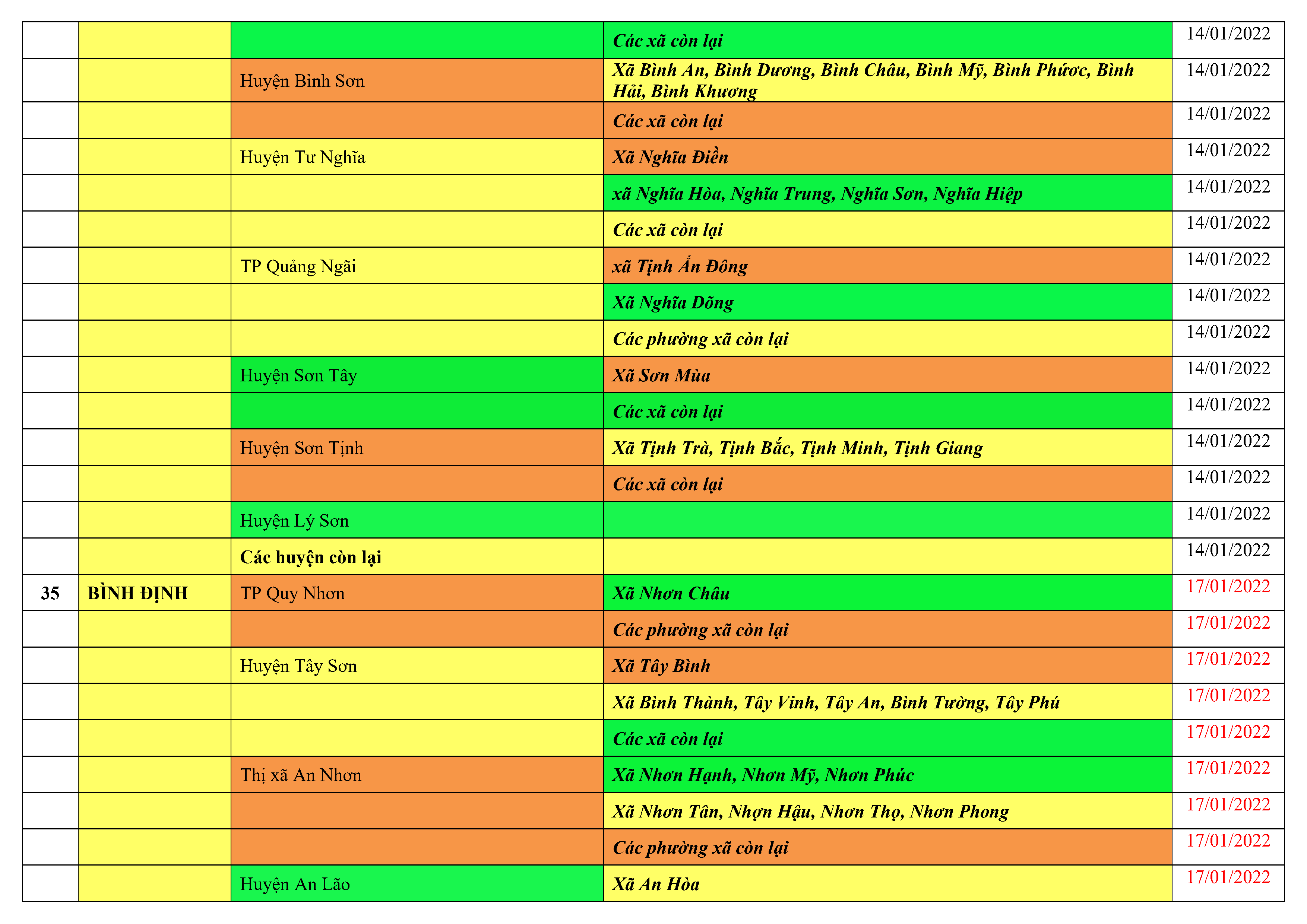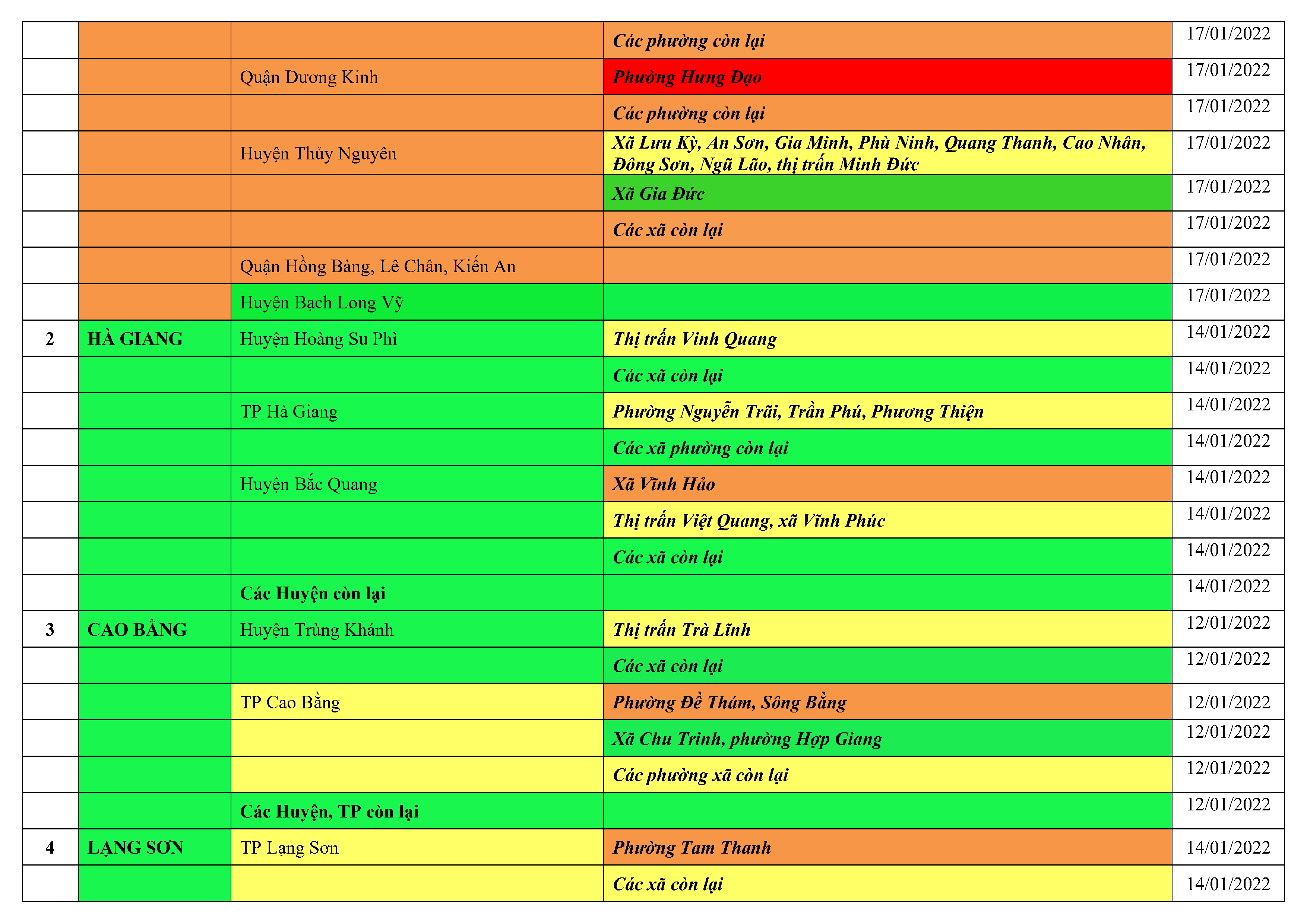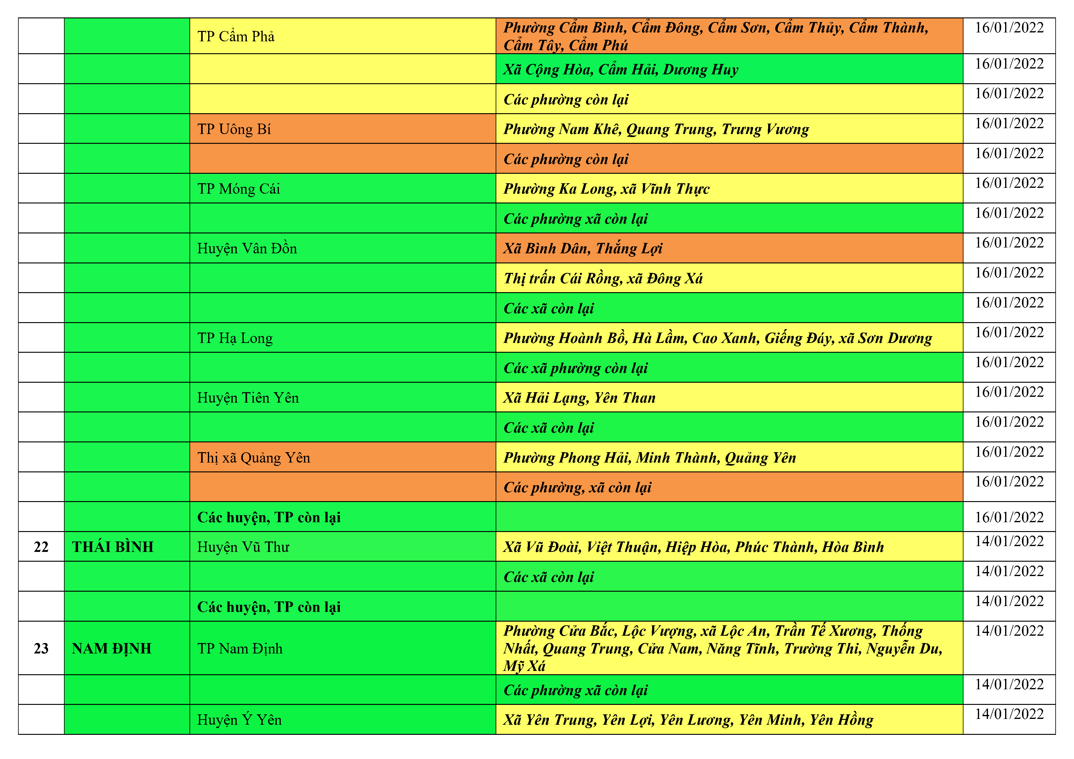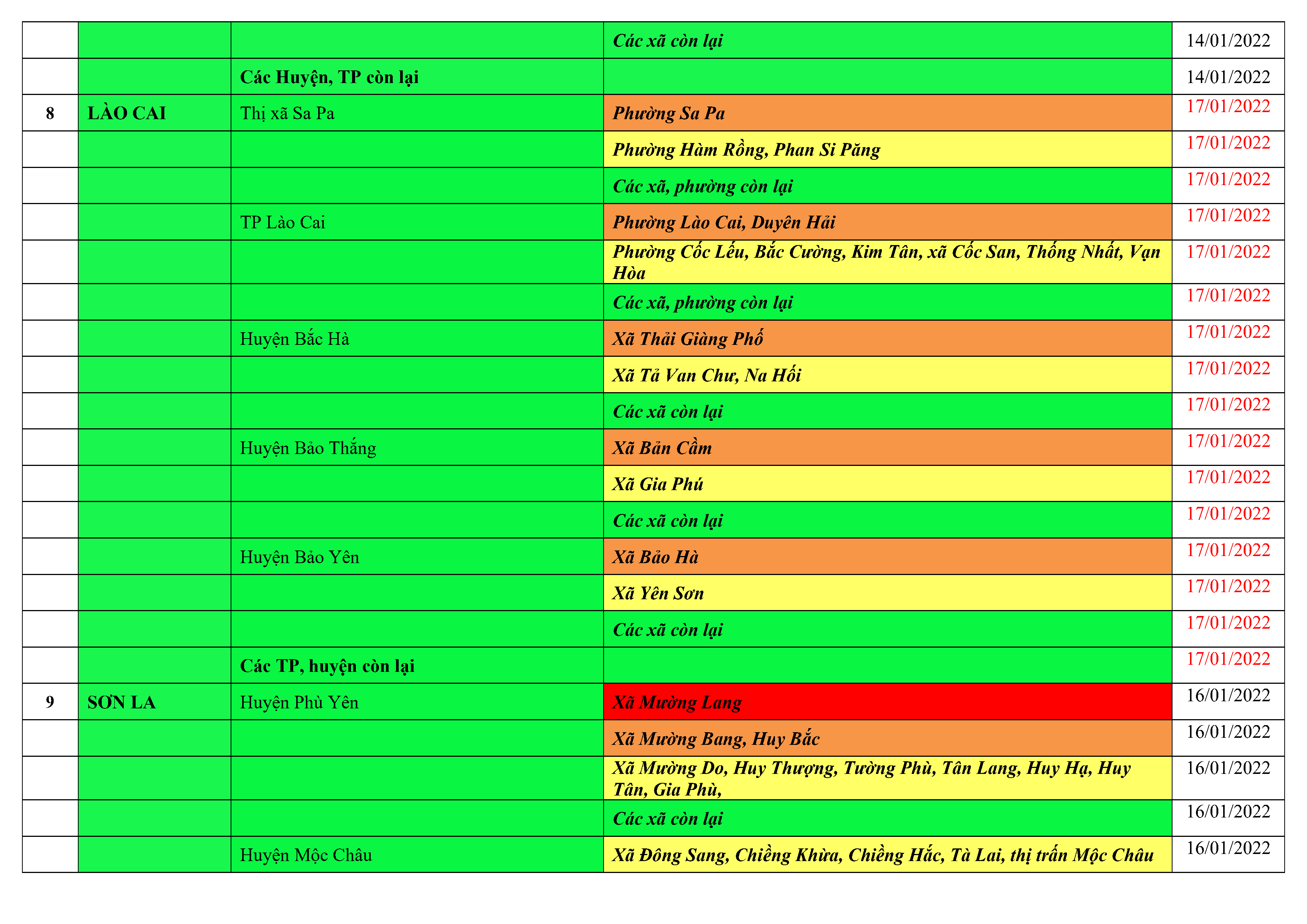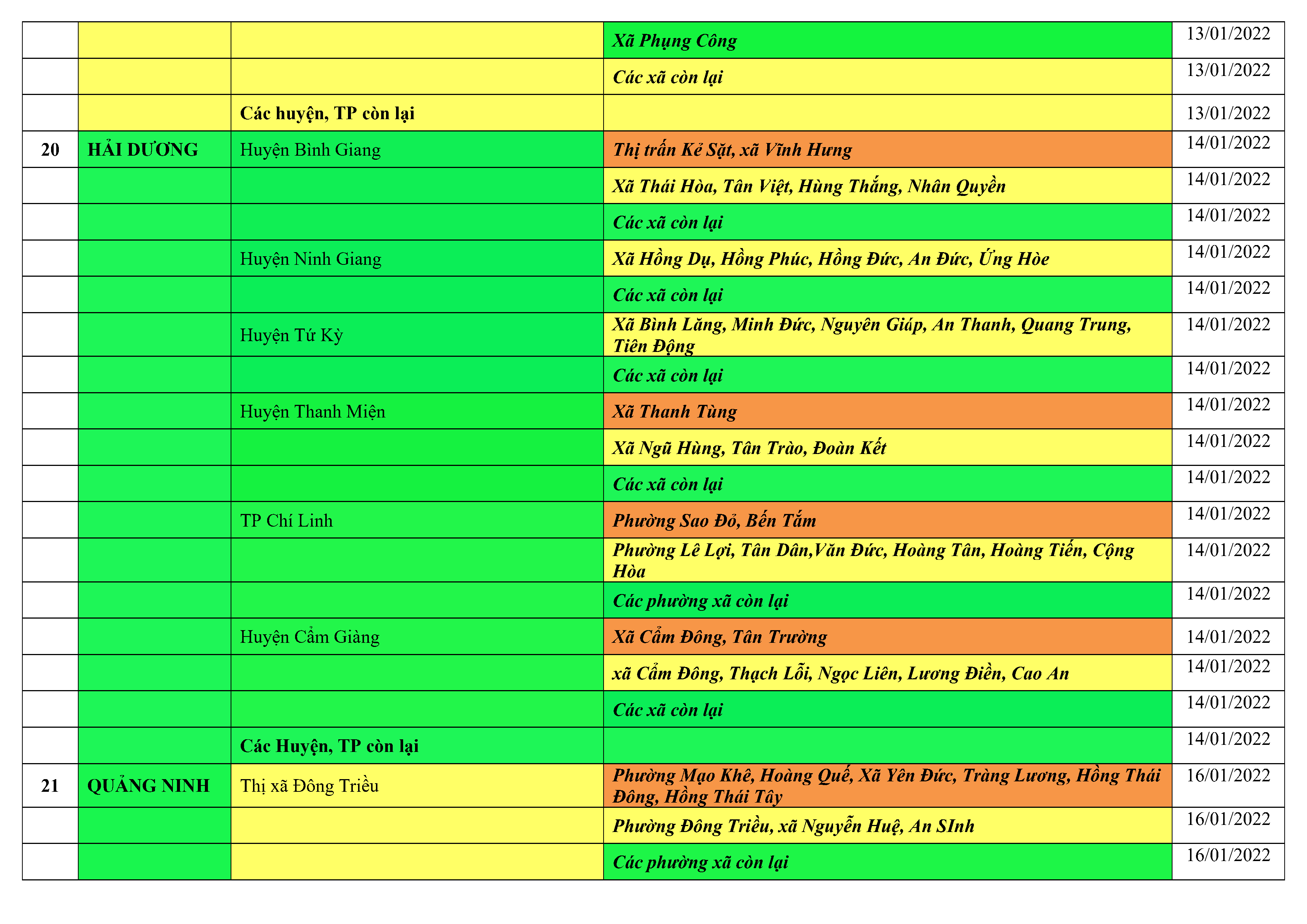 Áp dụng biện pháp tương ứng màu sắc ô cột theo thôn xóm; xã phường; quận huyện; tỉnh thành phố. Cách ly y tế dựa vào việc tiếp xúc, đi đến địa điểm và nơi cư trú có ca bệnh, theo Thông báo của Bộ Y tế, các tỉnh thành phố.
