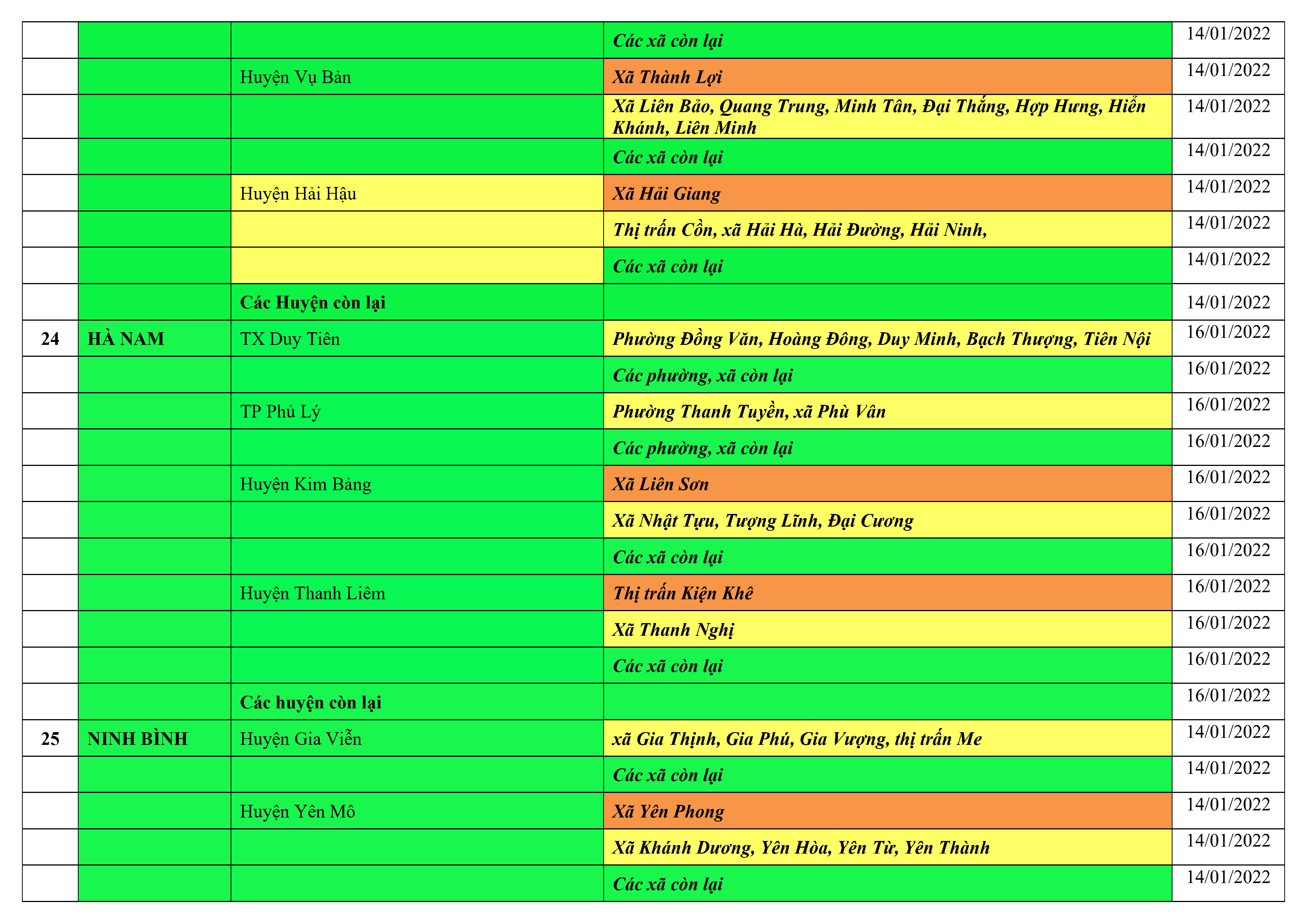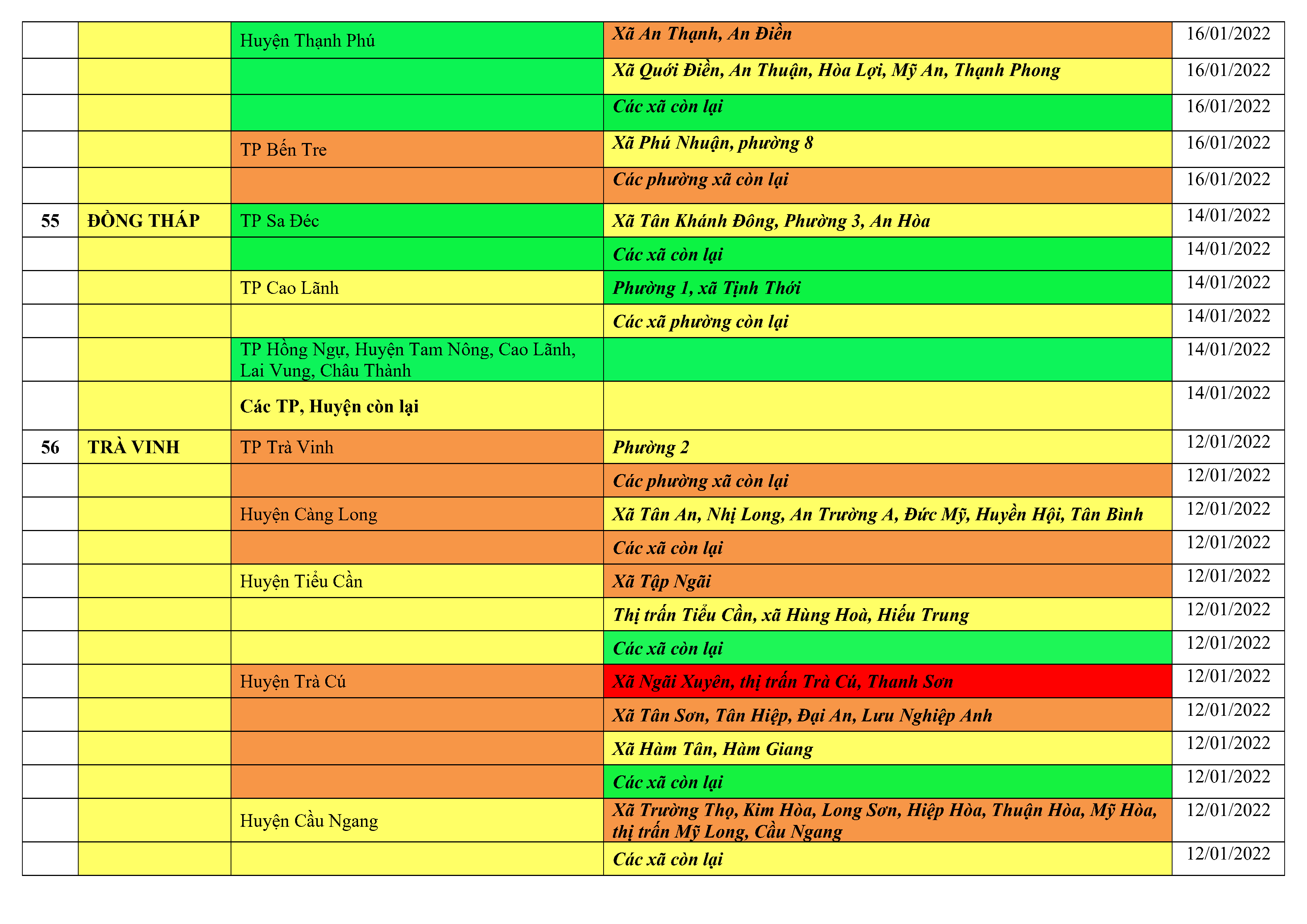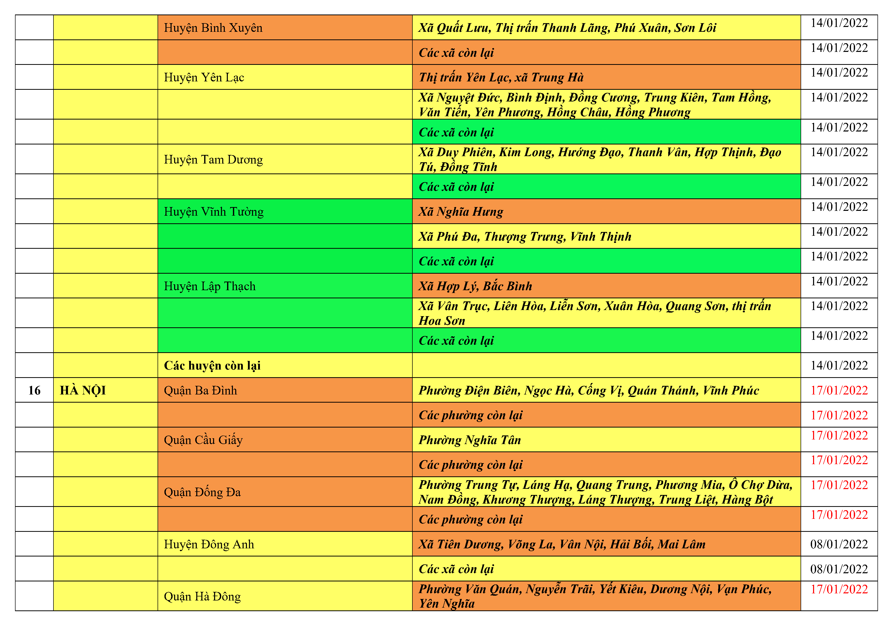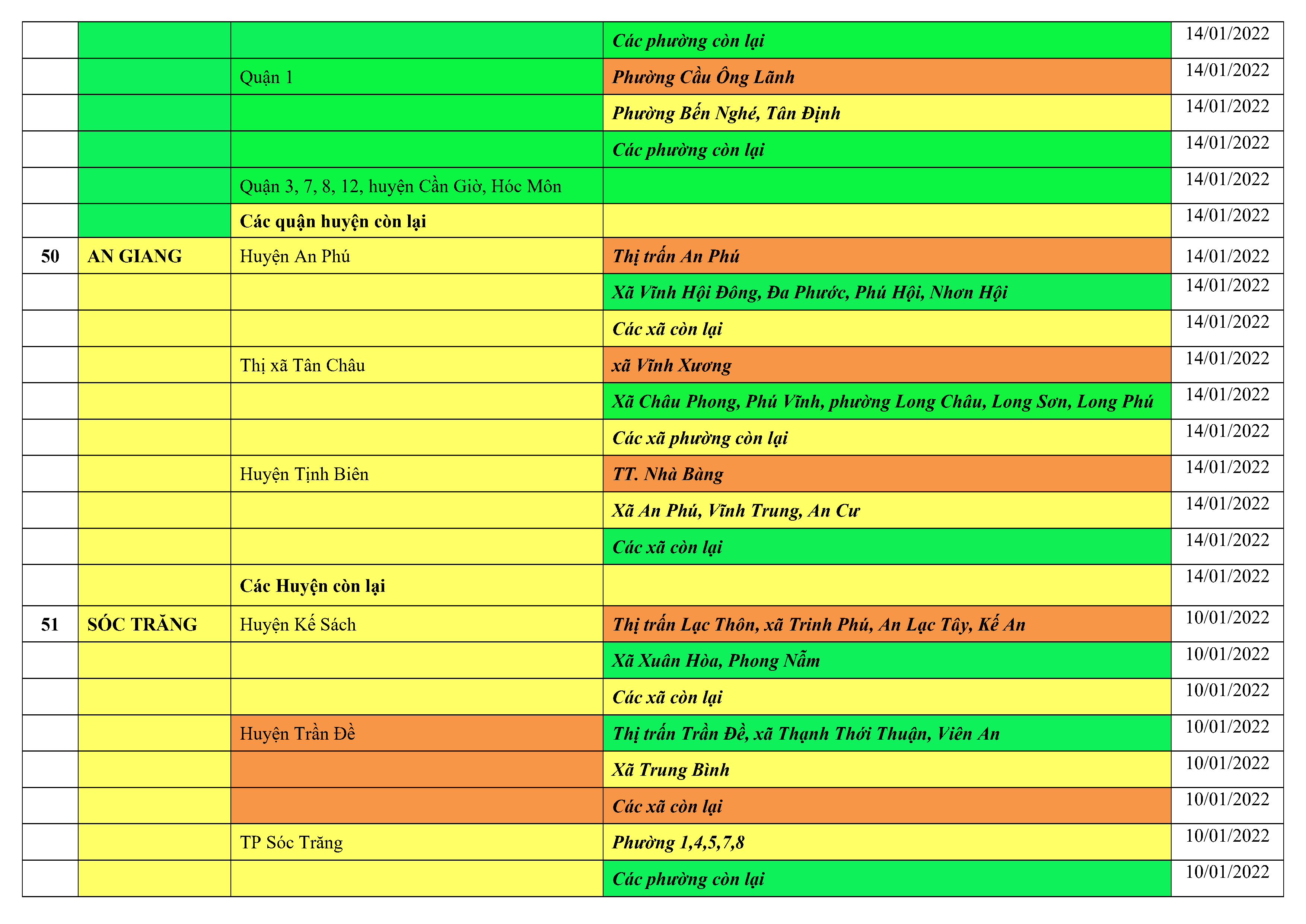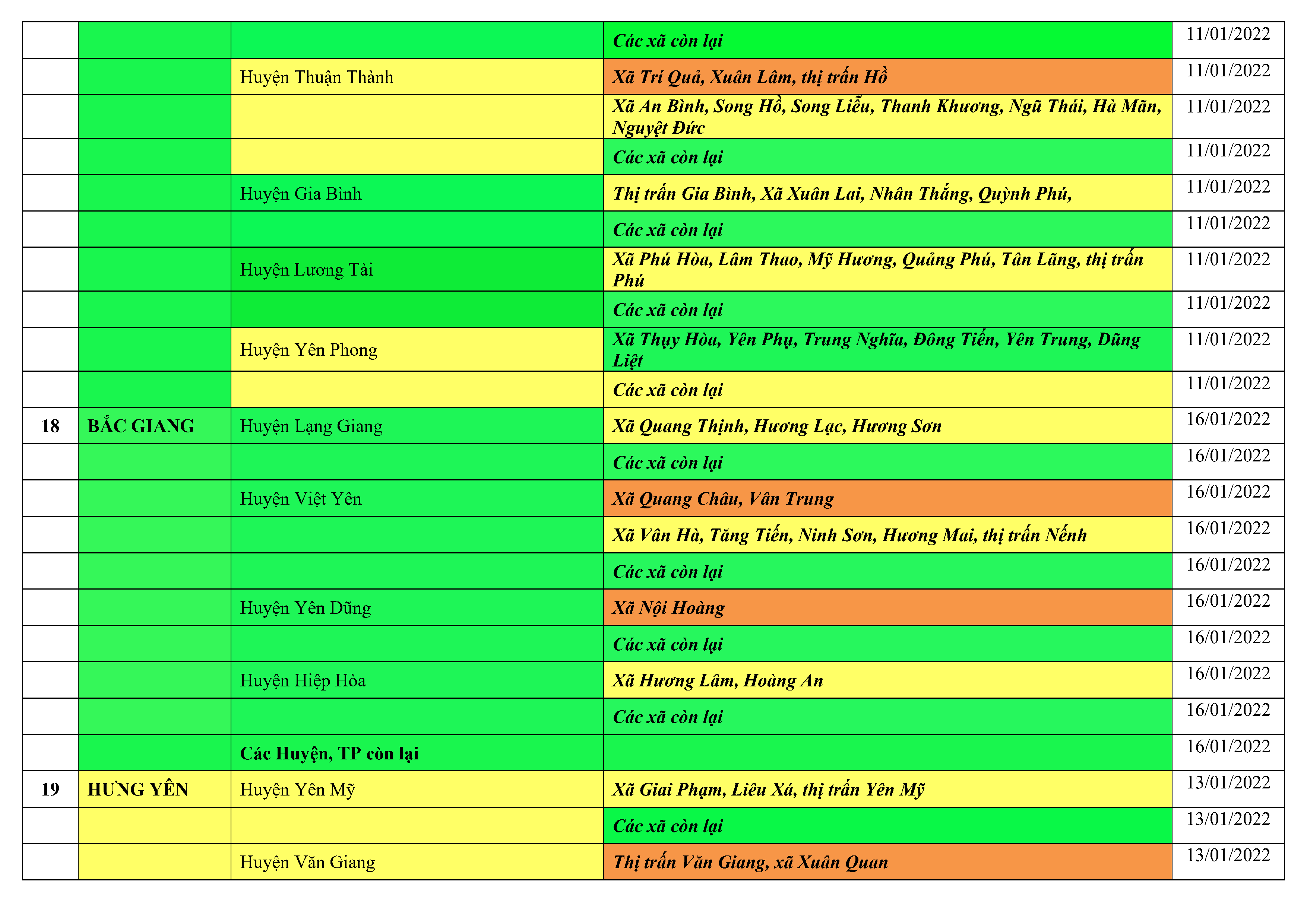 Áp dụng biện pháp tương ứng màu sắc ô cột theo thôn xóm; xã phường; quận huyện; tỉnh thành phố. Cách ly y tế dựa vào việc tiếp xúc, đi đến địa điểm và nơi cư trú có ca bệnh, theo Thông báo của Bộ Y tế, các tỉnh thành phố.