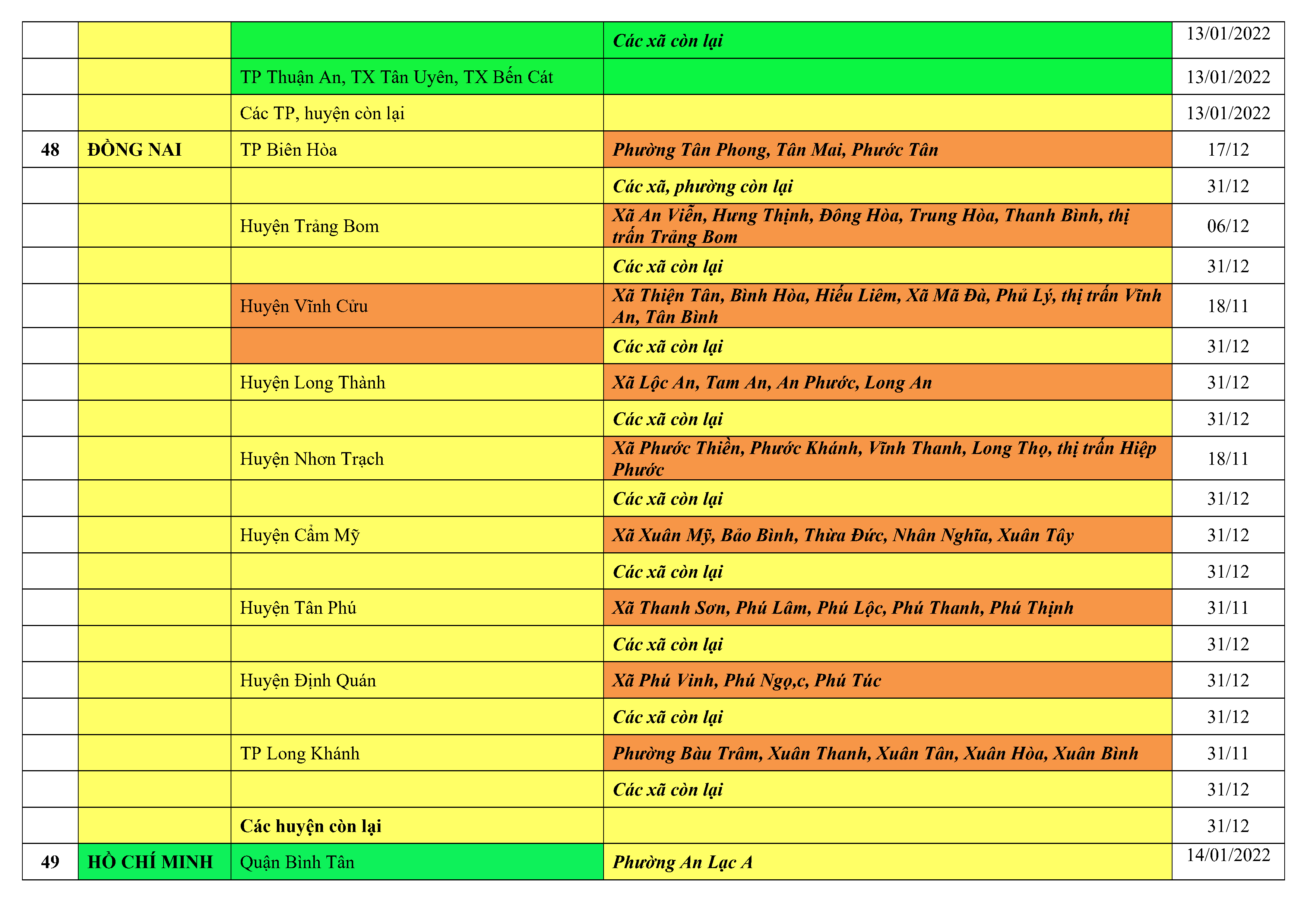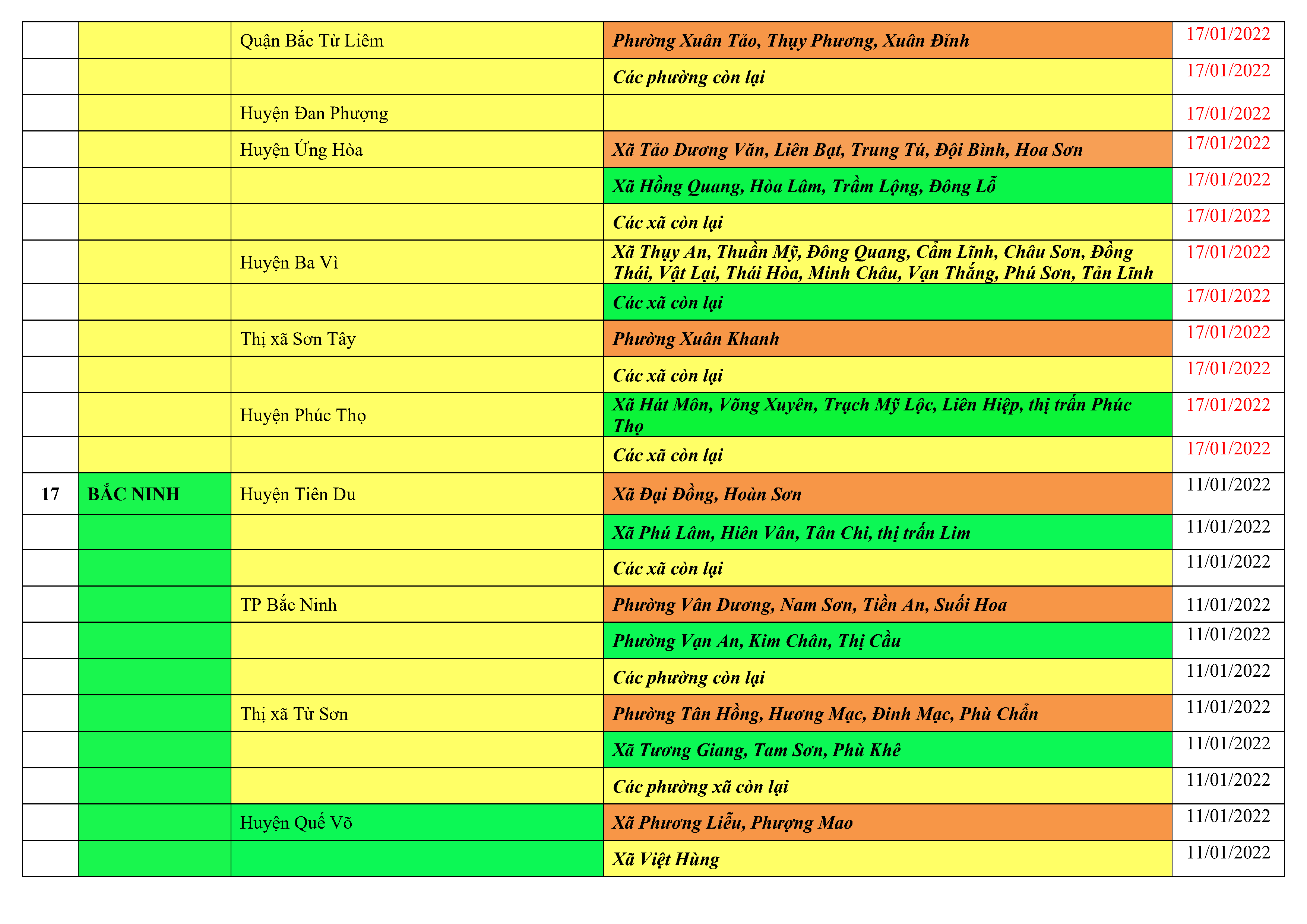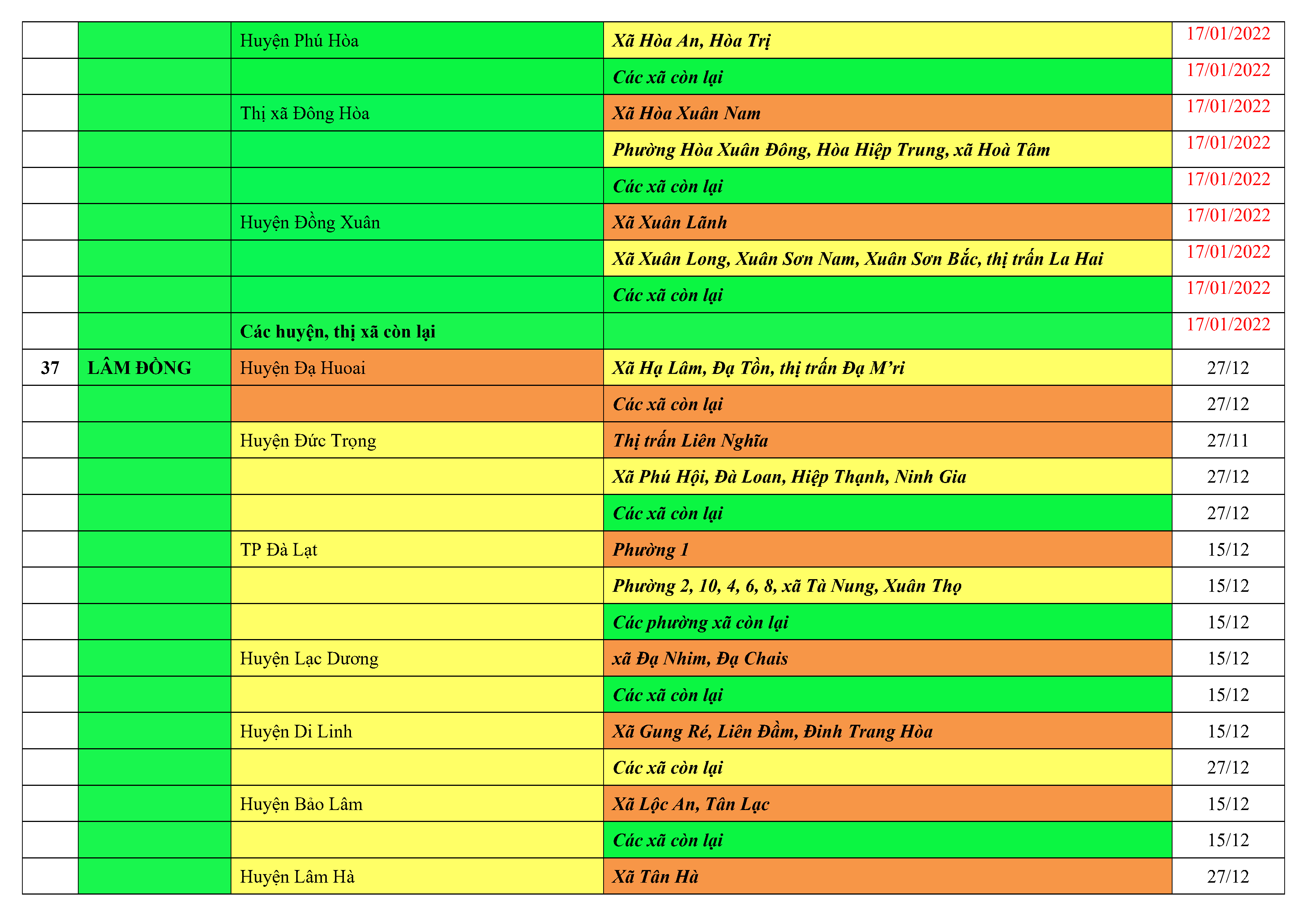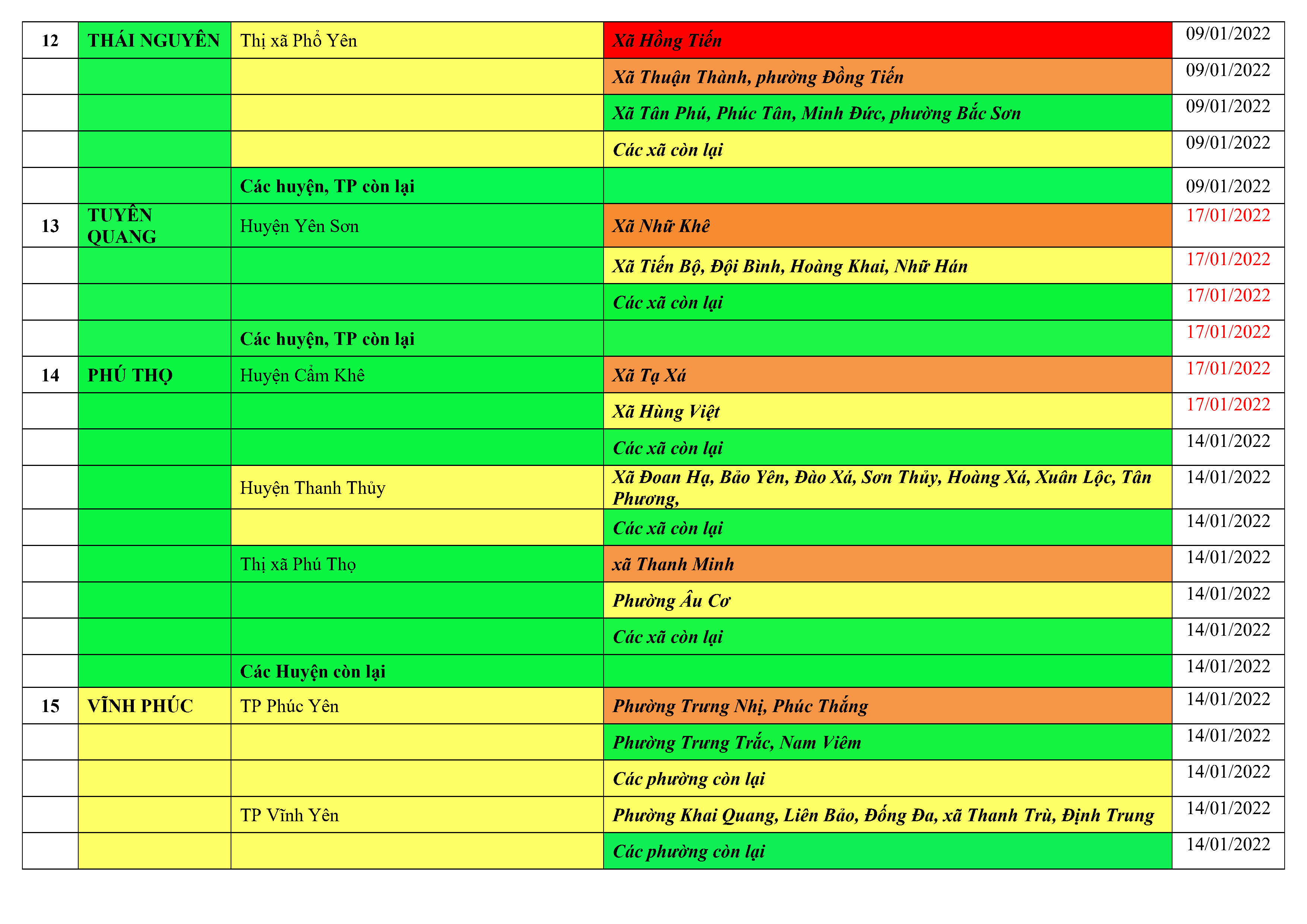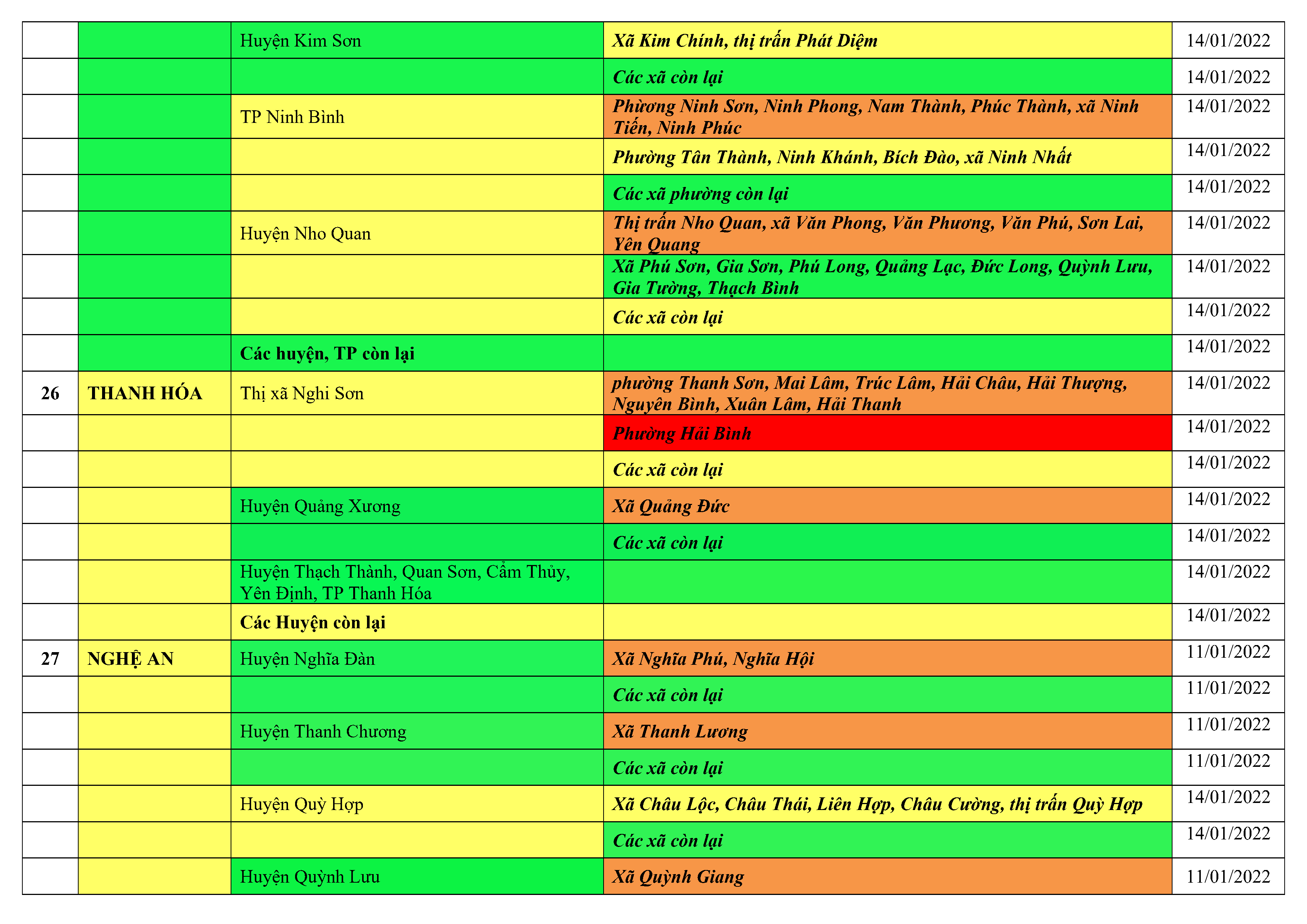 Áp dụng biện pháp tương ứng màu sắc ô cột theo thôn xóm; xã phường; quận huyện; tỉnh thành phố. Cách ly y tế dựa vào việc tiếp xúc, đi đến địa điểm và nơi cư trú có ca bệnh, theo Thông báo của Bộ Y tế, các tỉnh thành phố.
