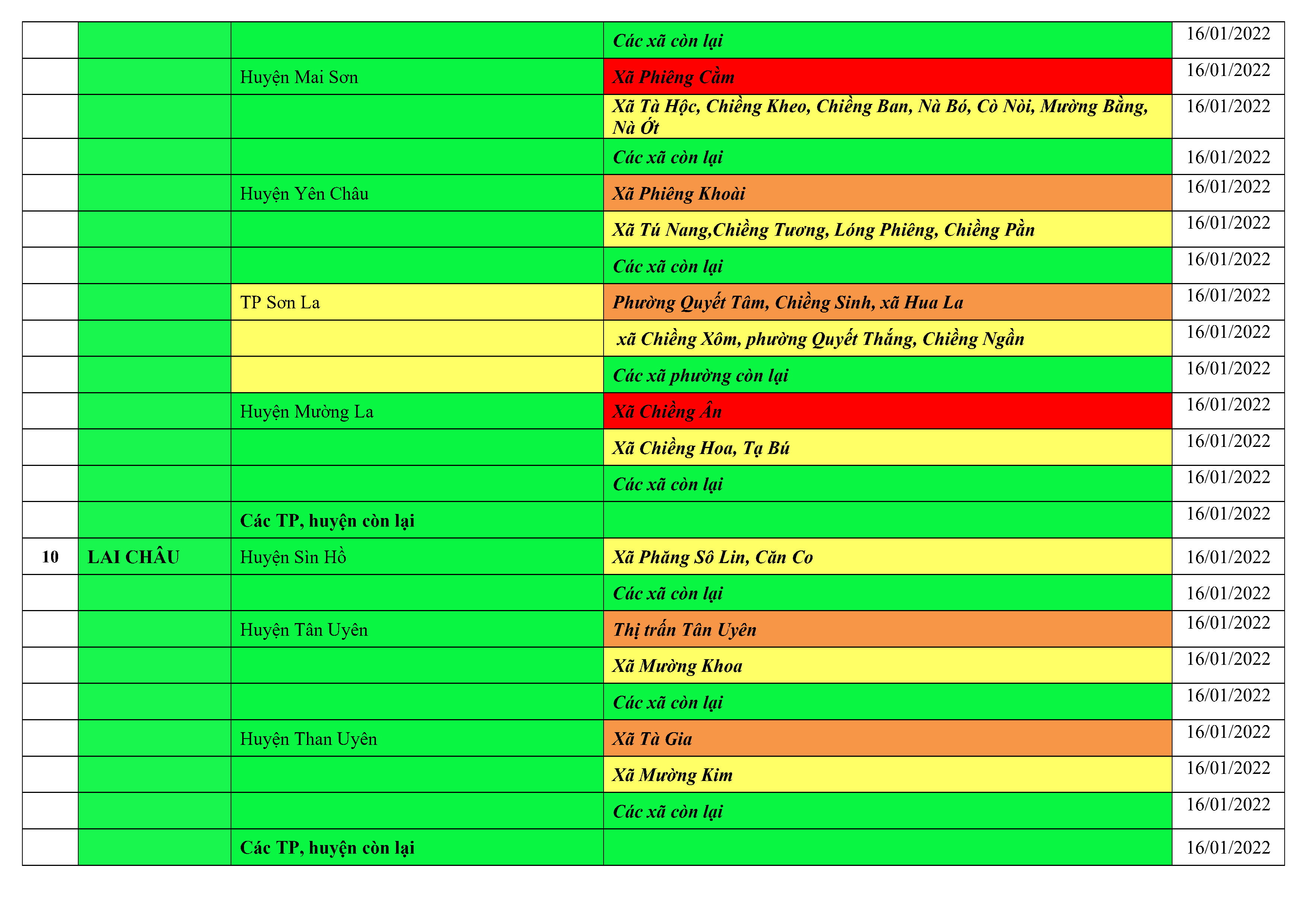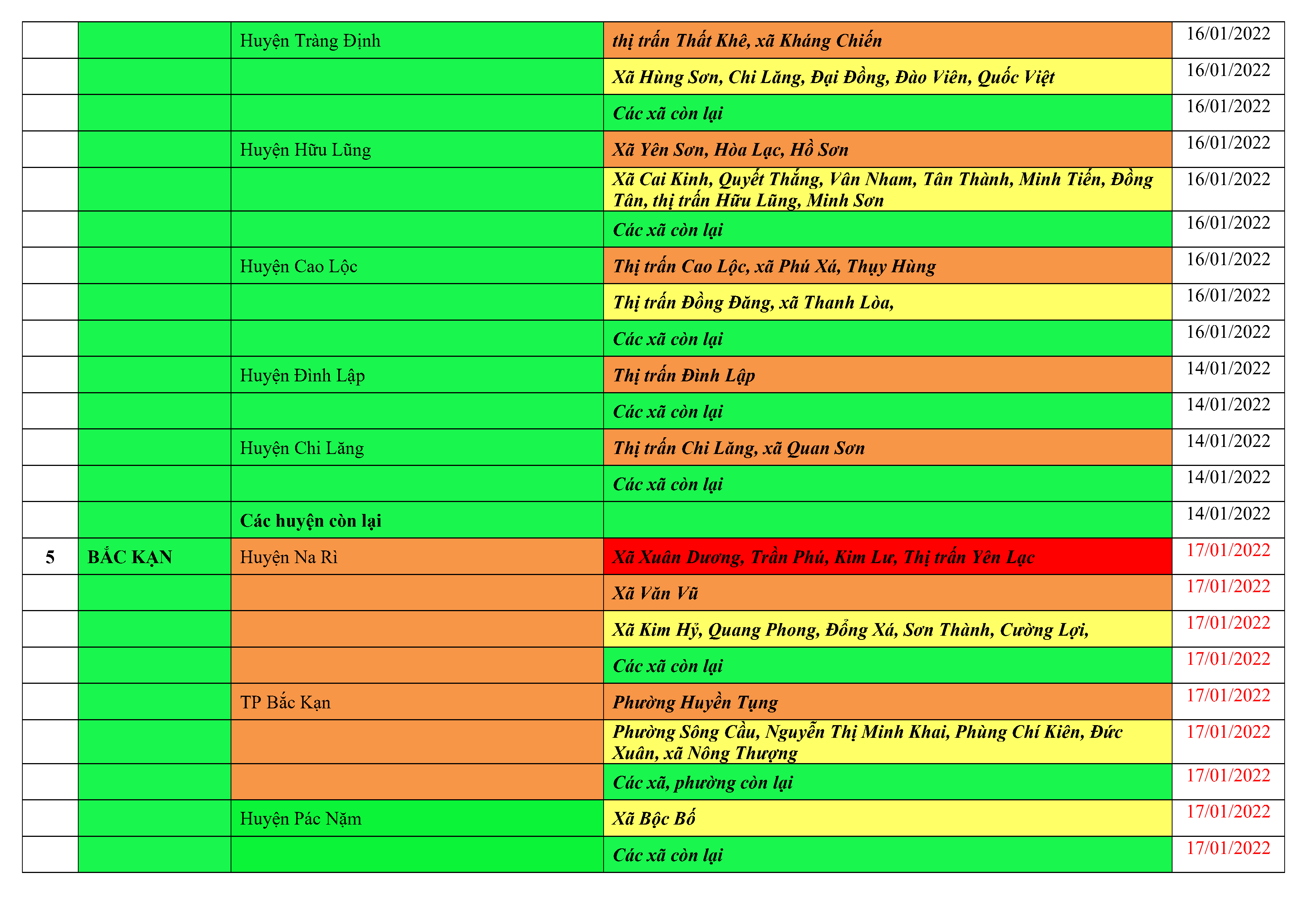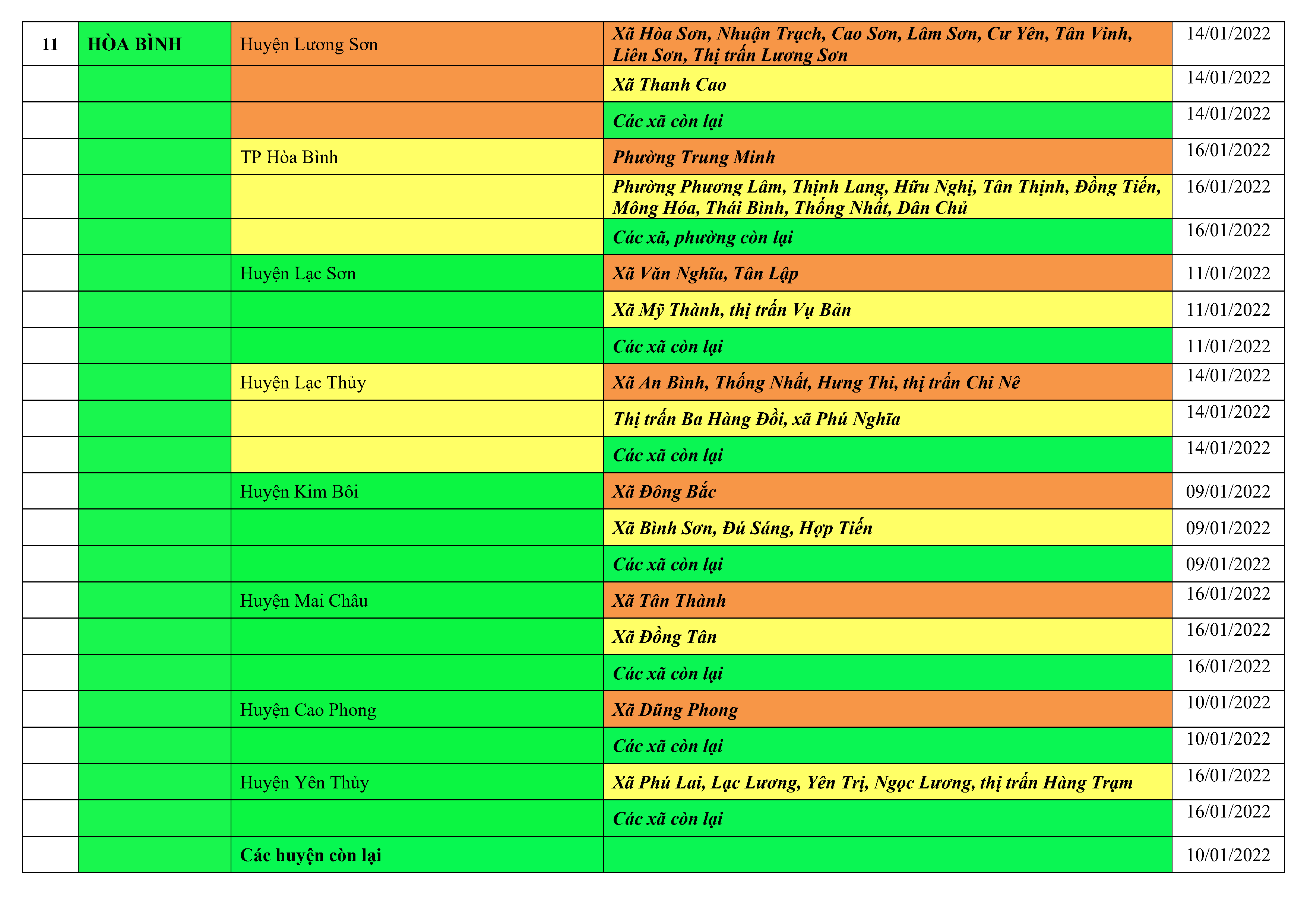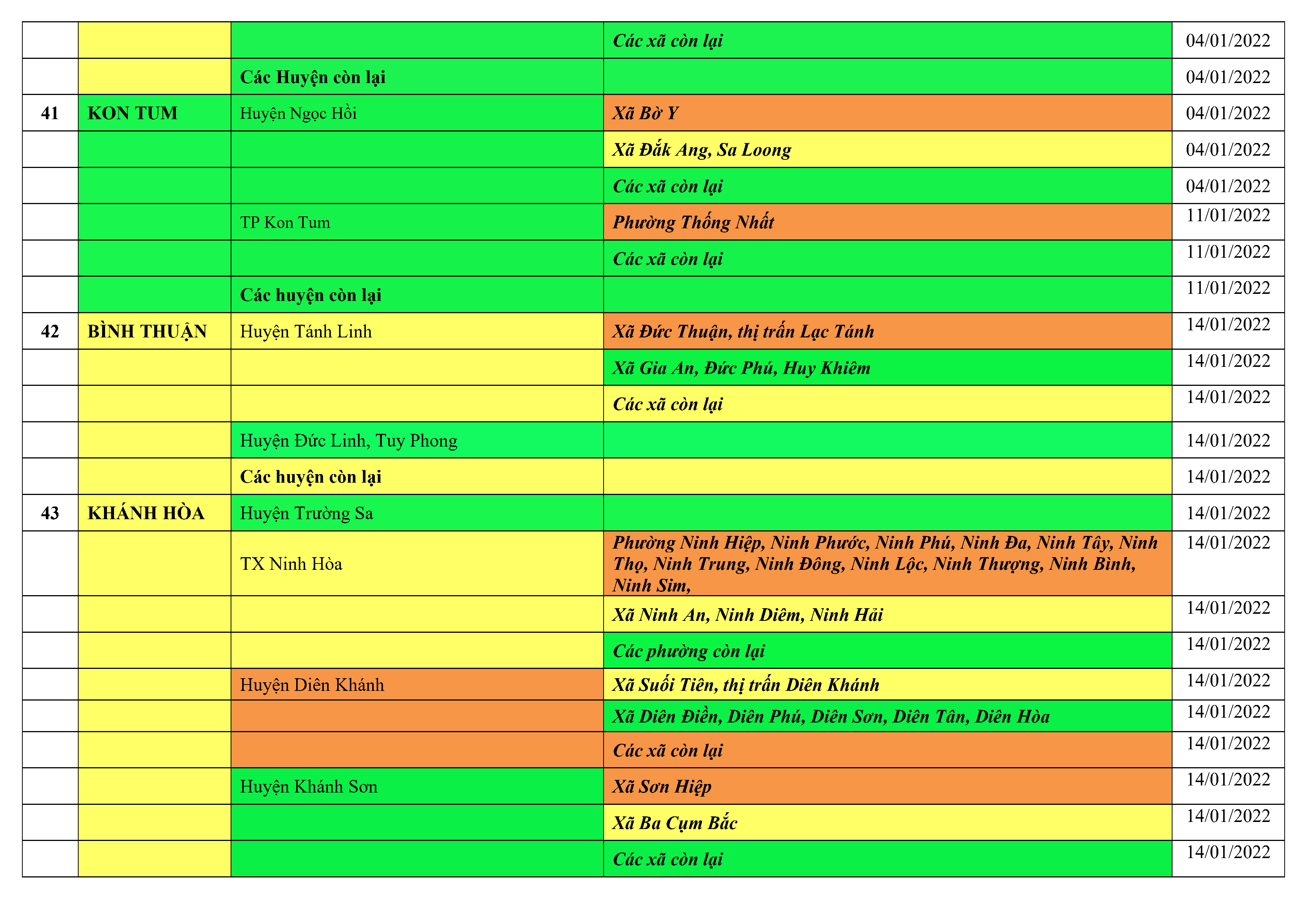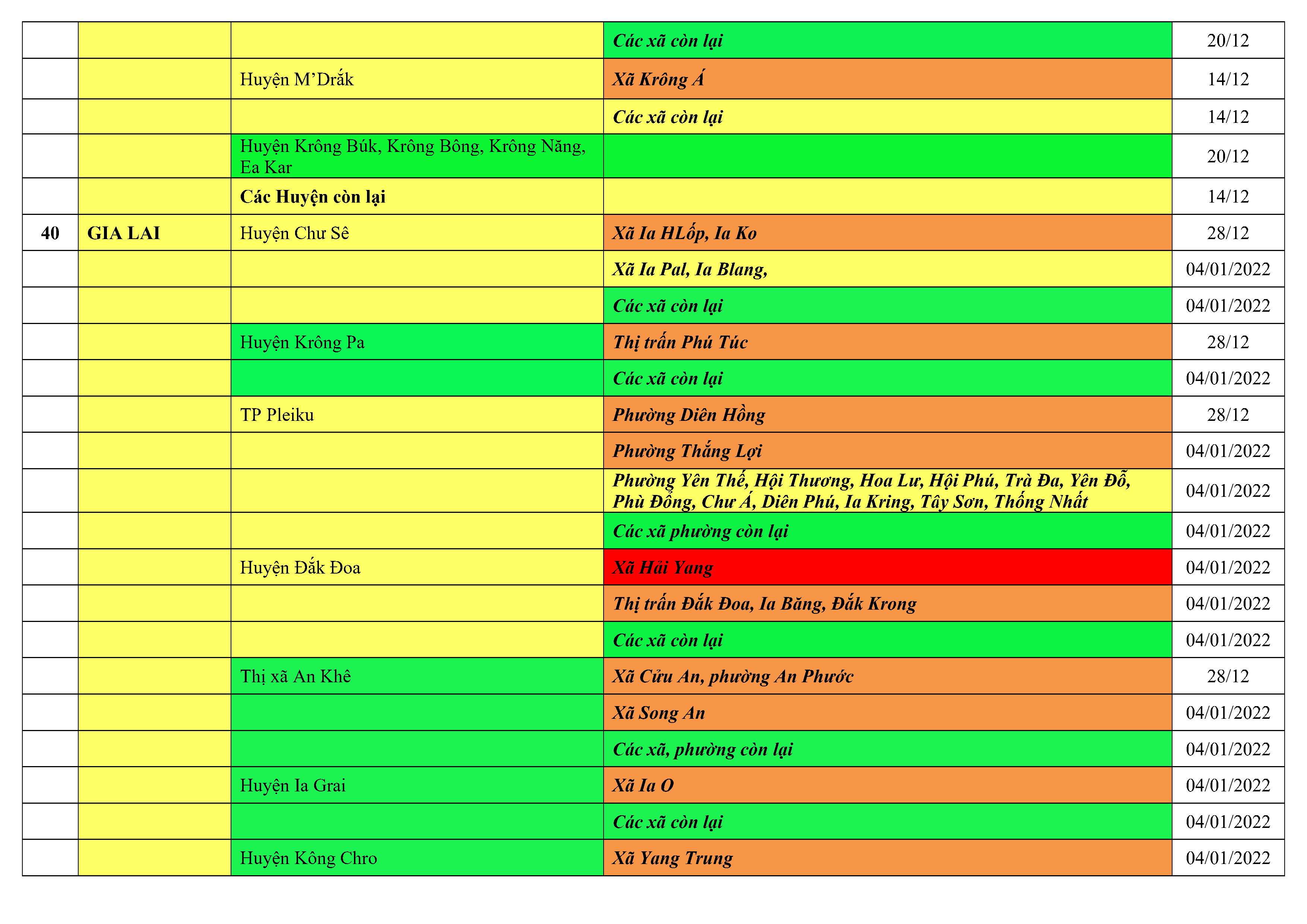 Áp dụng biện pháp tương ứng màu sắc ô cột theo thôn xóm; xã phường; quận huyện; tỉnh thành phố. Cách ly y tế dựa vào việc tiếp xúc, đi đến địa điểm và nơi cư trú có ca bệnh, theo Thông báo của Bộ Y tế, các tỉnh thành phố.
