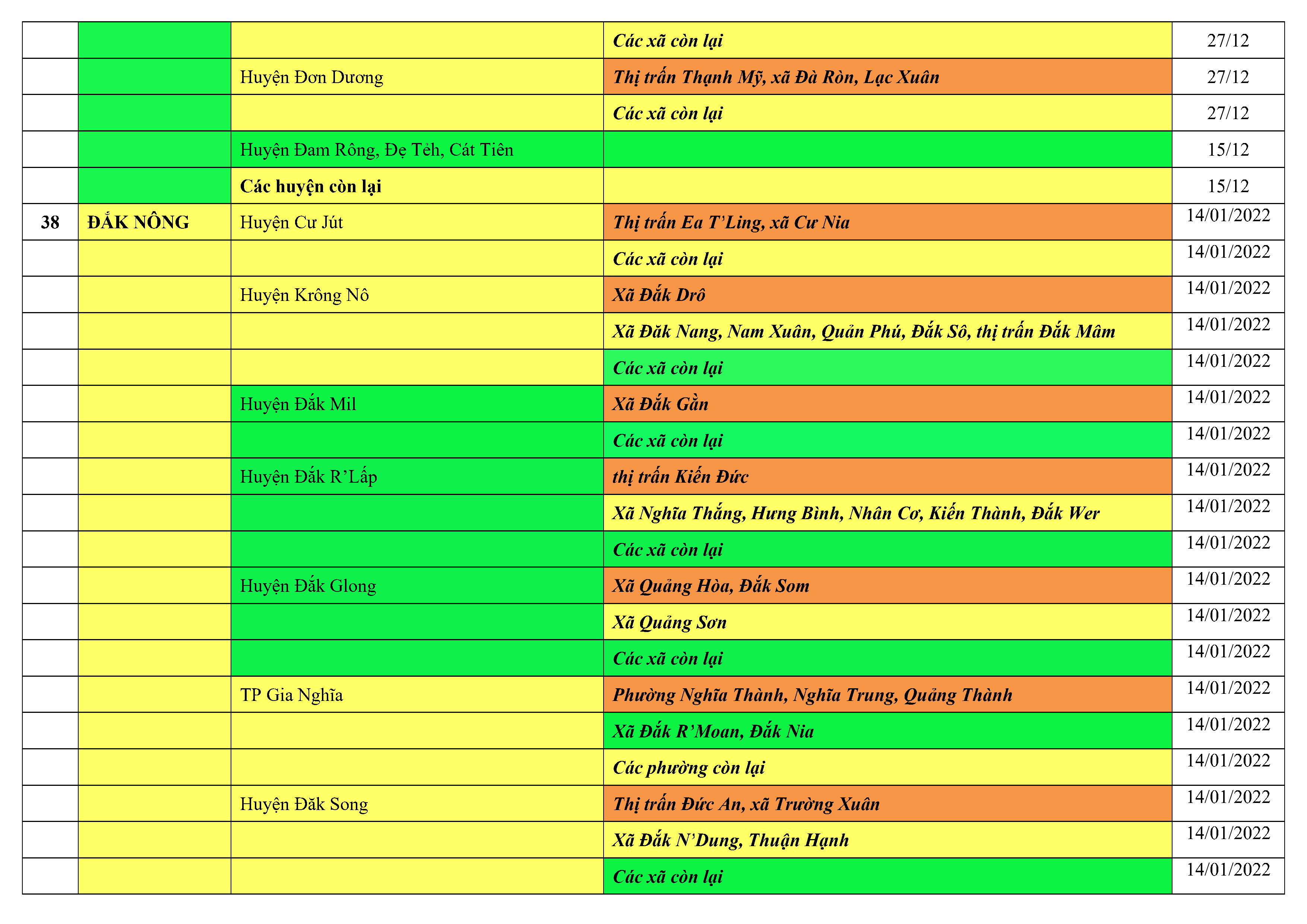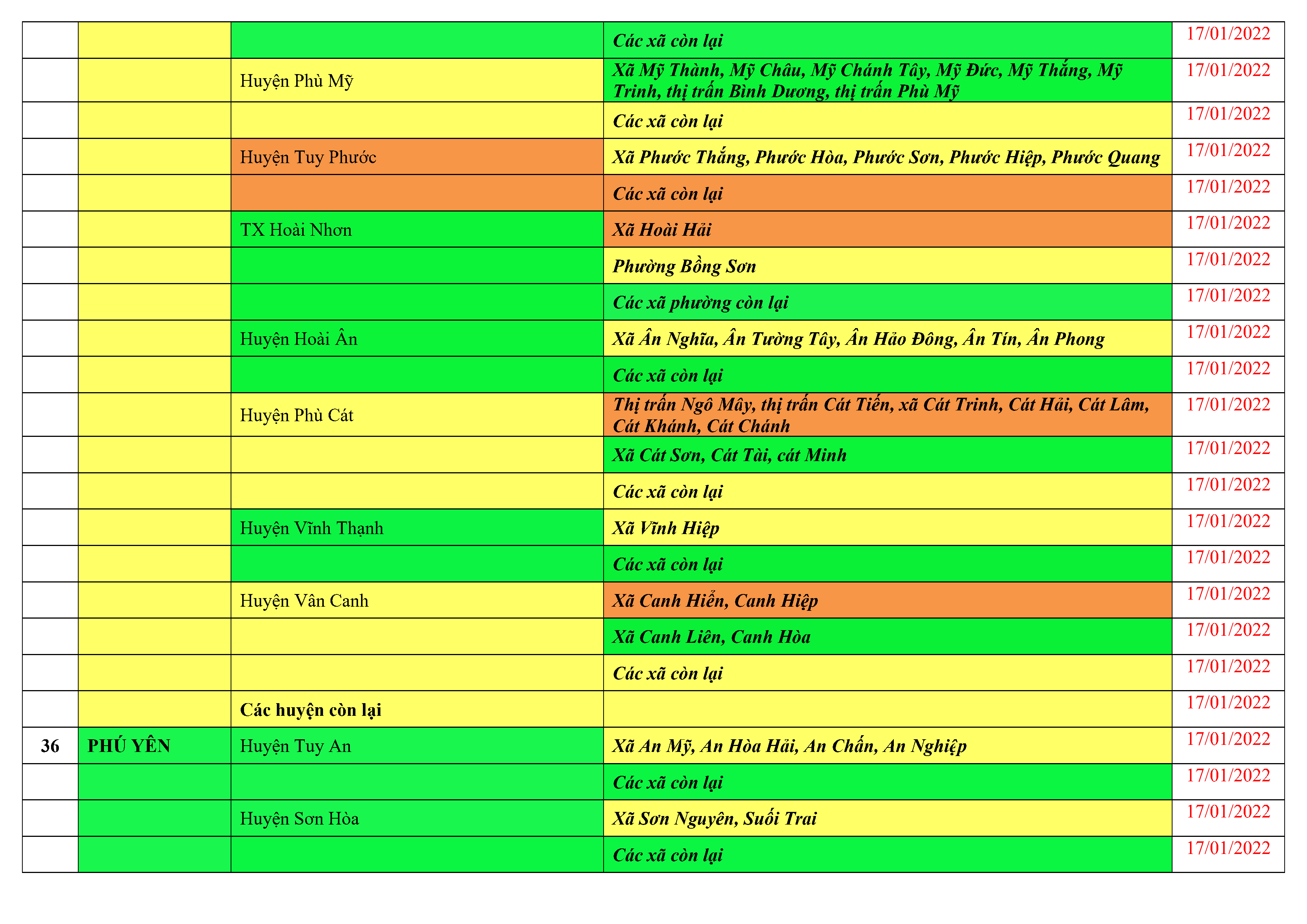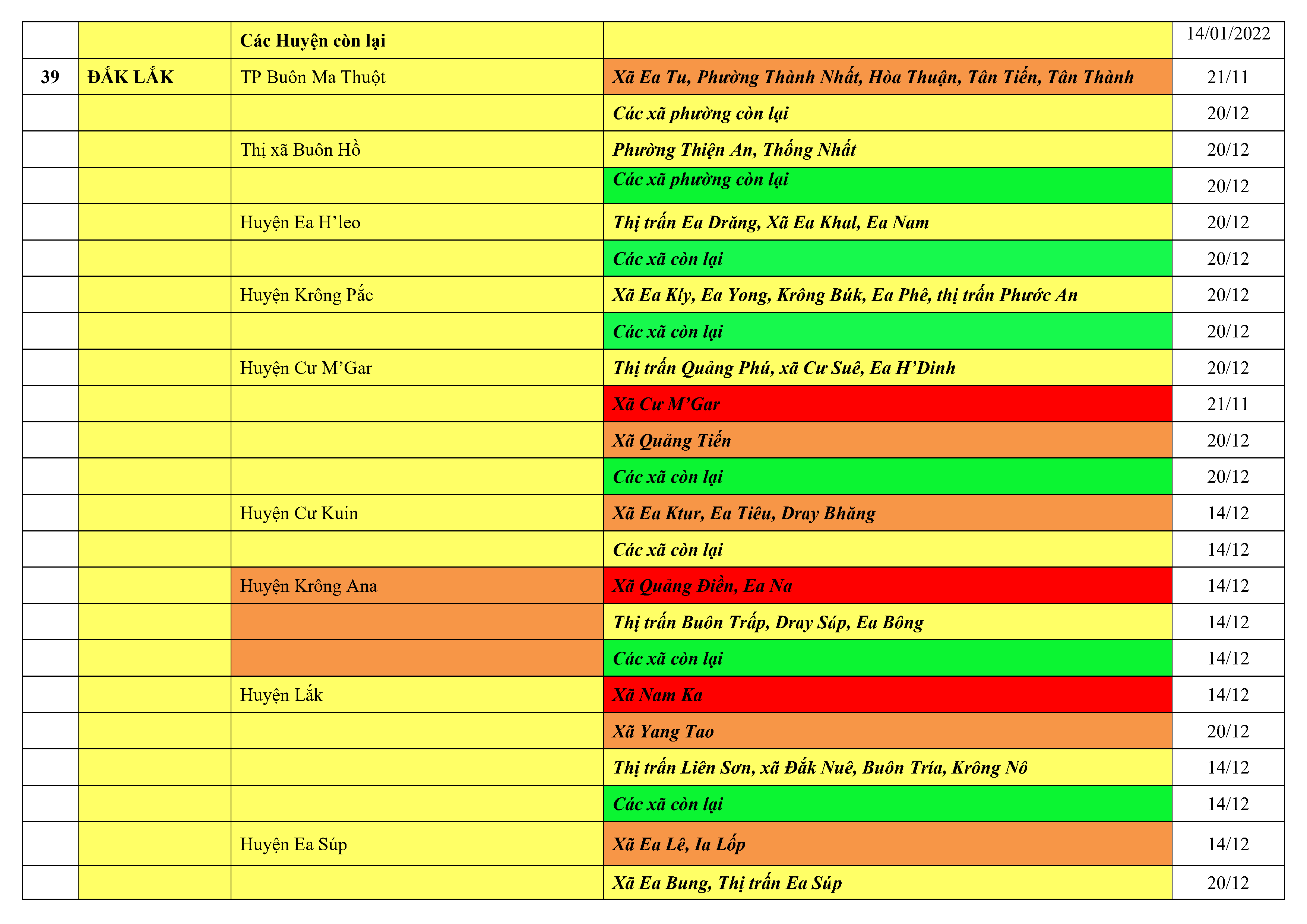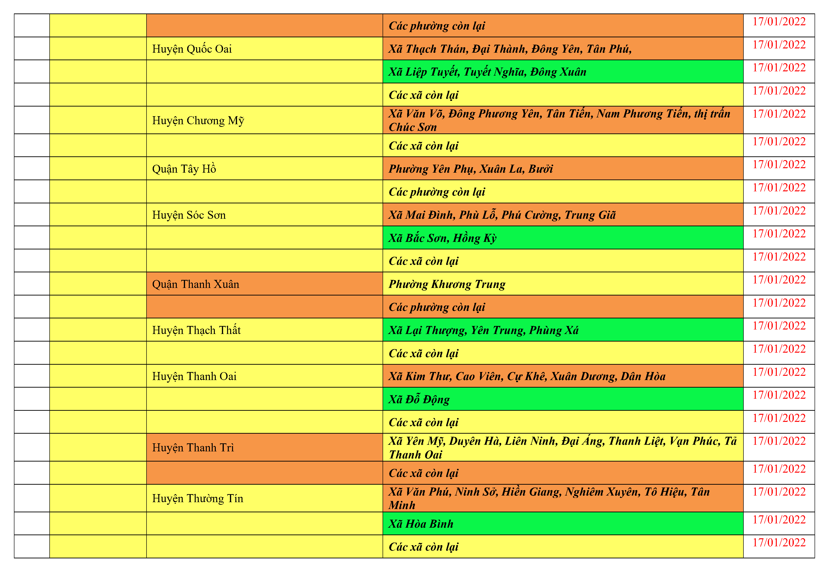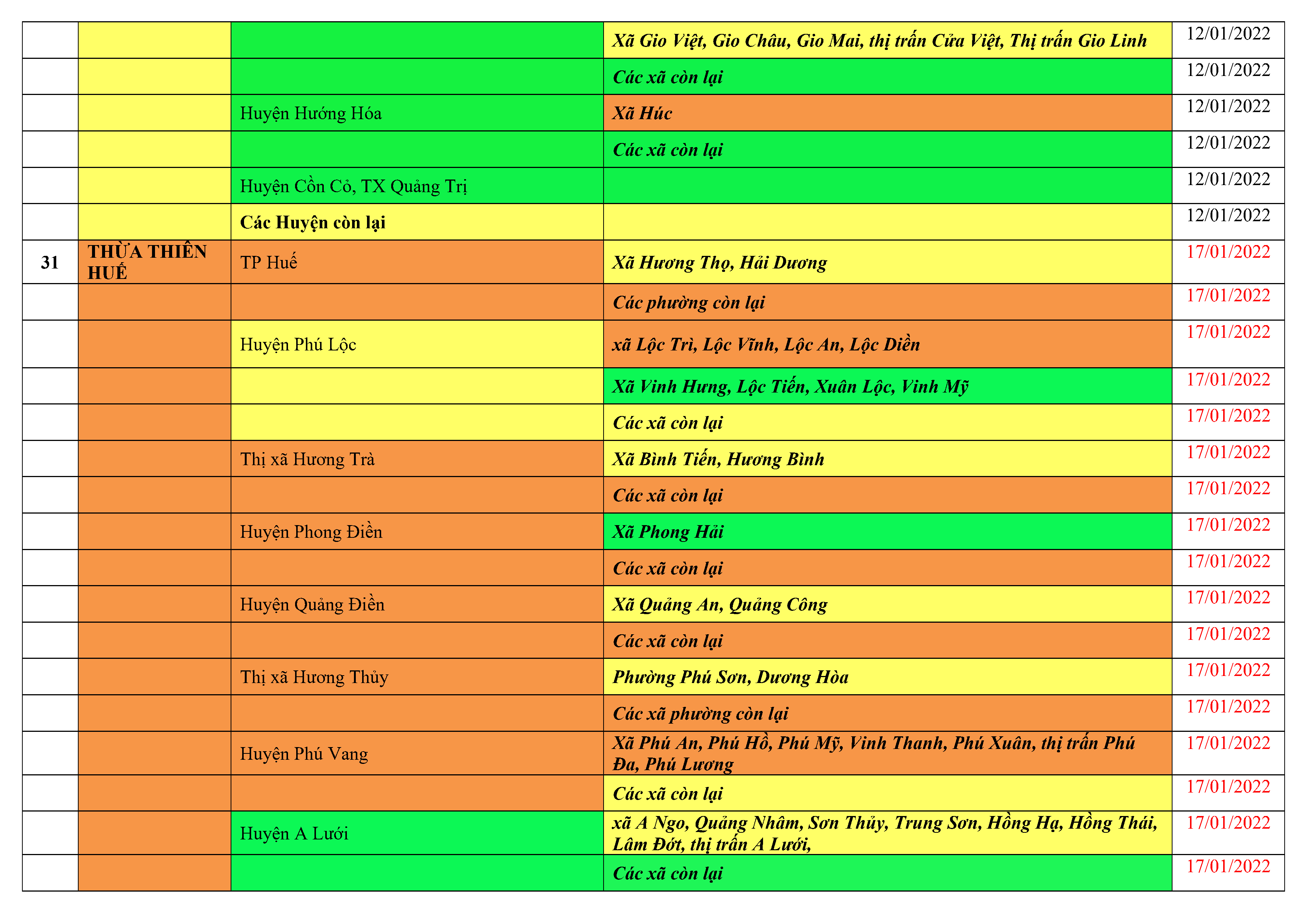 Áp dụng biện pháp tương ứng màu sắc ô cột theo thôn xóm; xã phường; quận huyện; tỉnh thành phố. Cách ly y tế dựa vào việc tiếp xúc, đi đến địa điểm và nơi cư trú có ca bệnh, theo Thông báo của Bộ Y tế, các tỉnh thành phố.