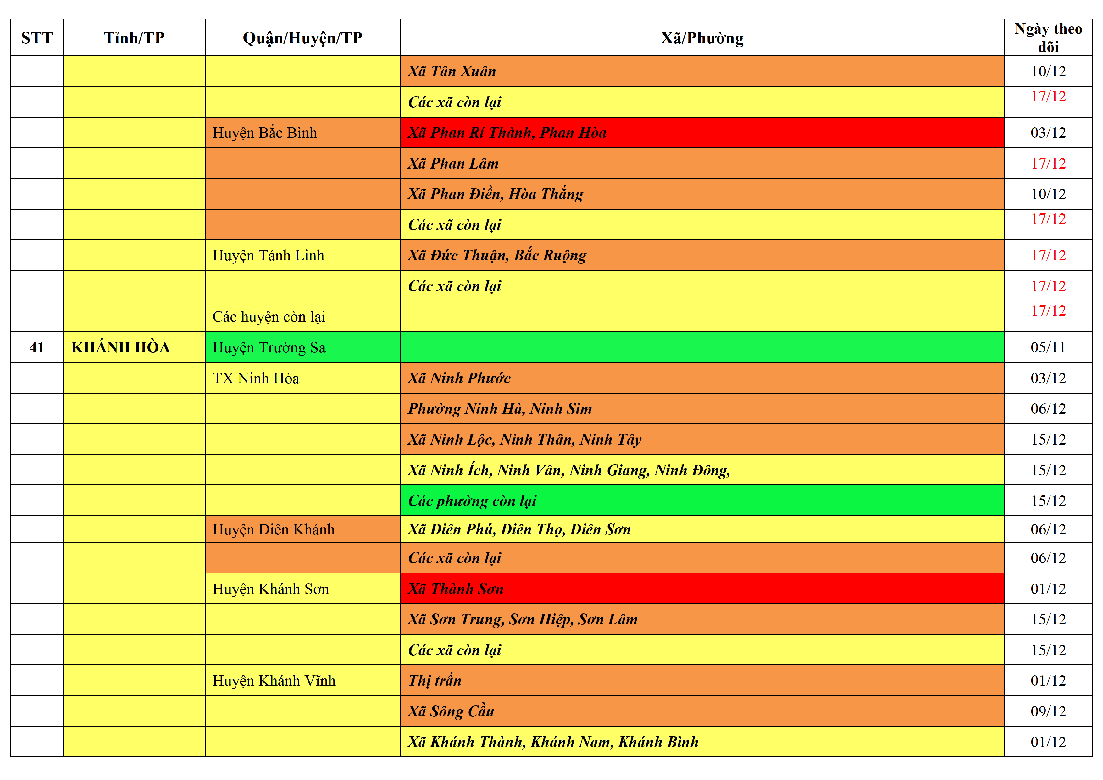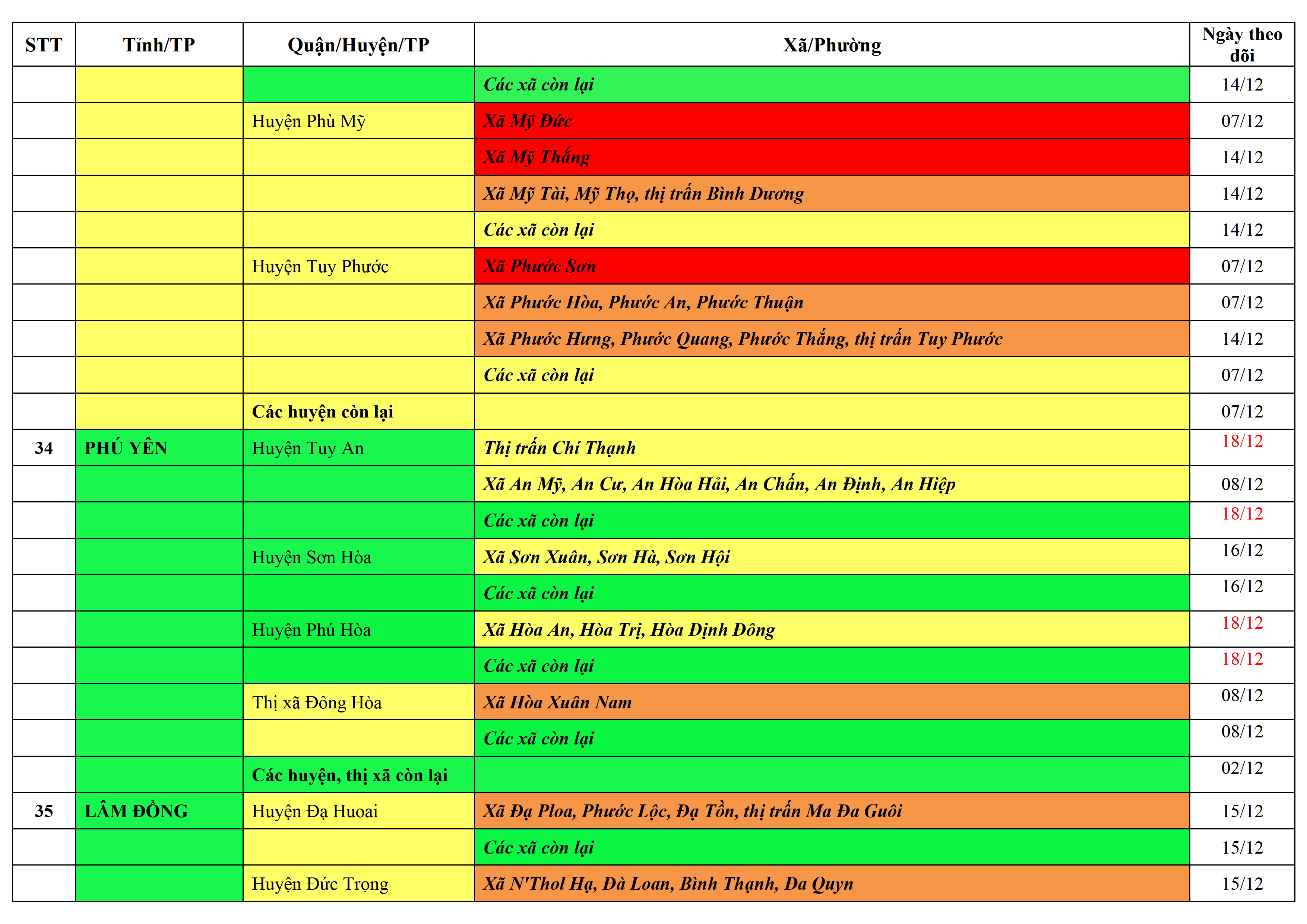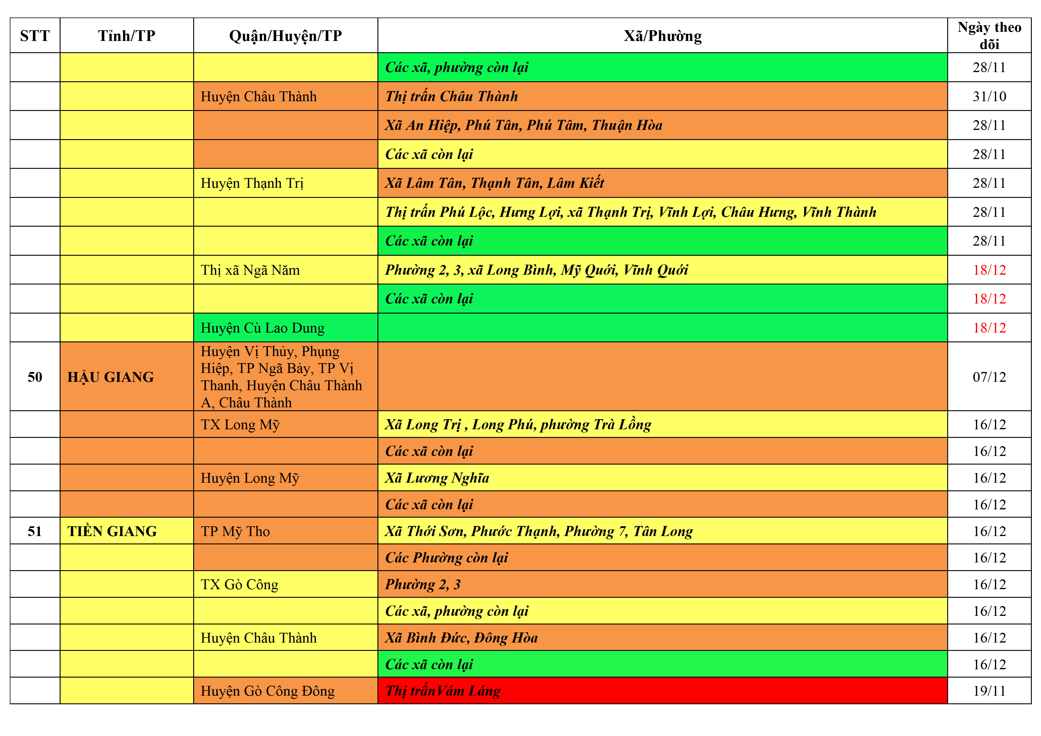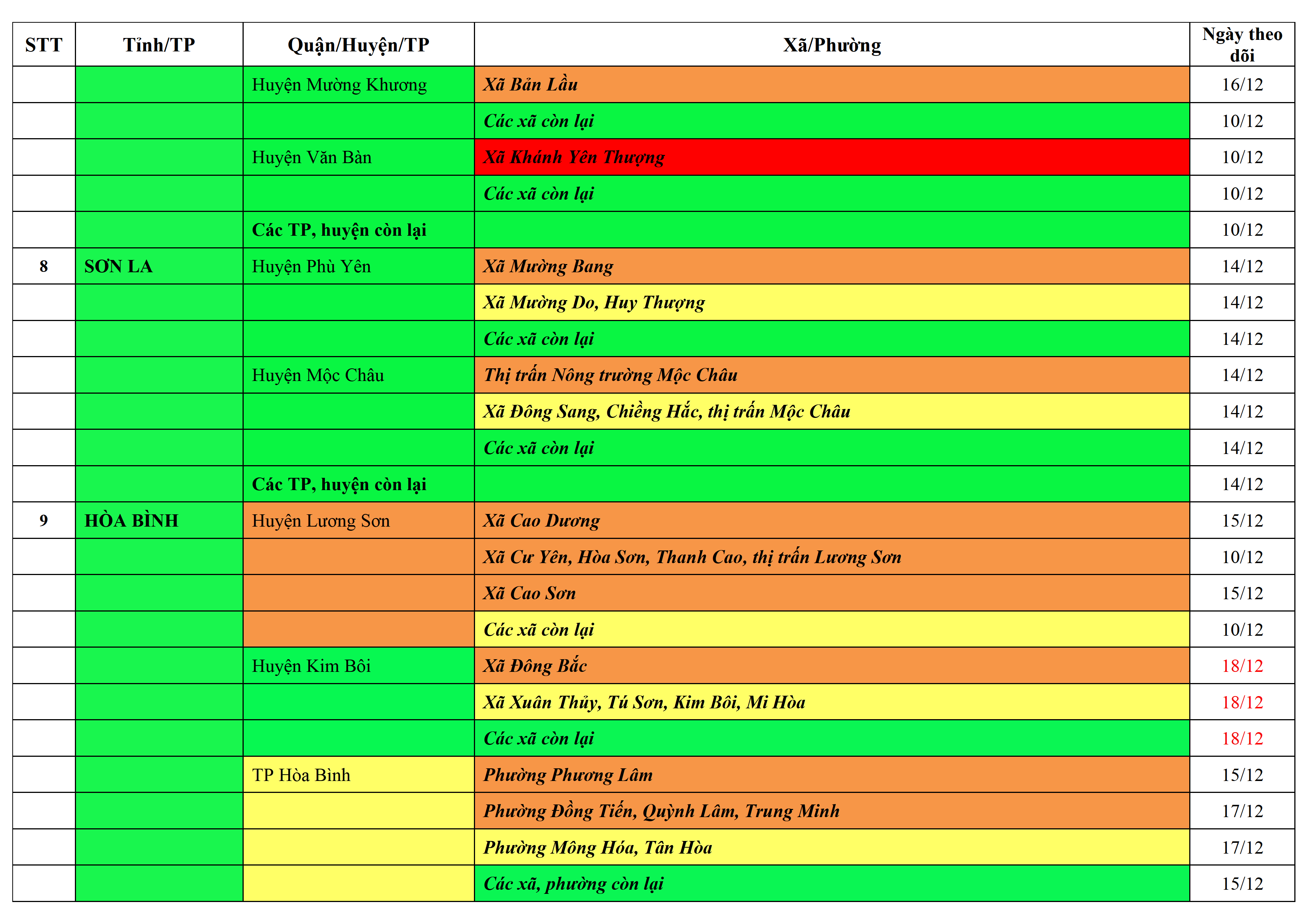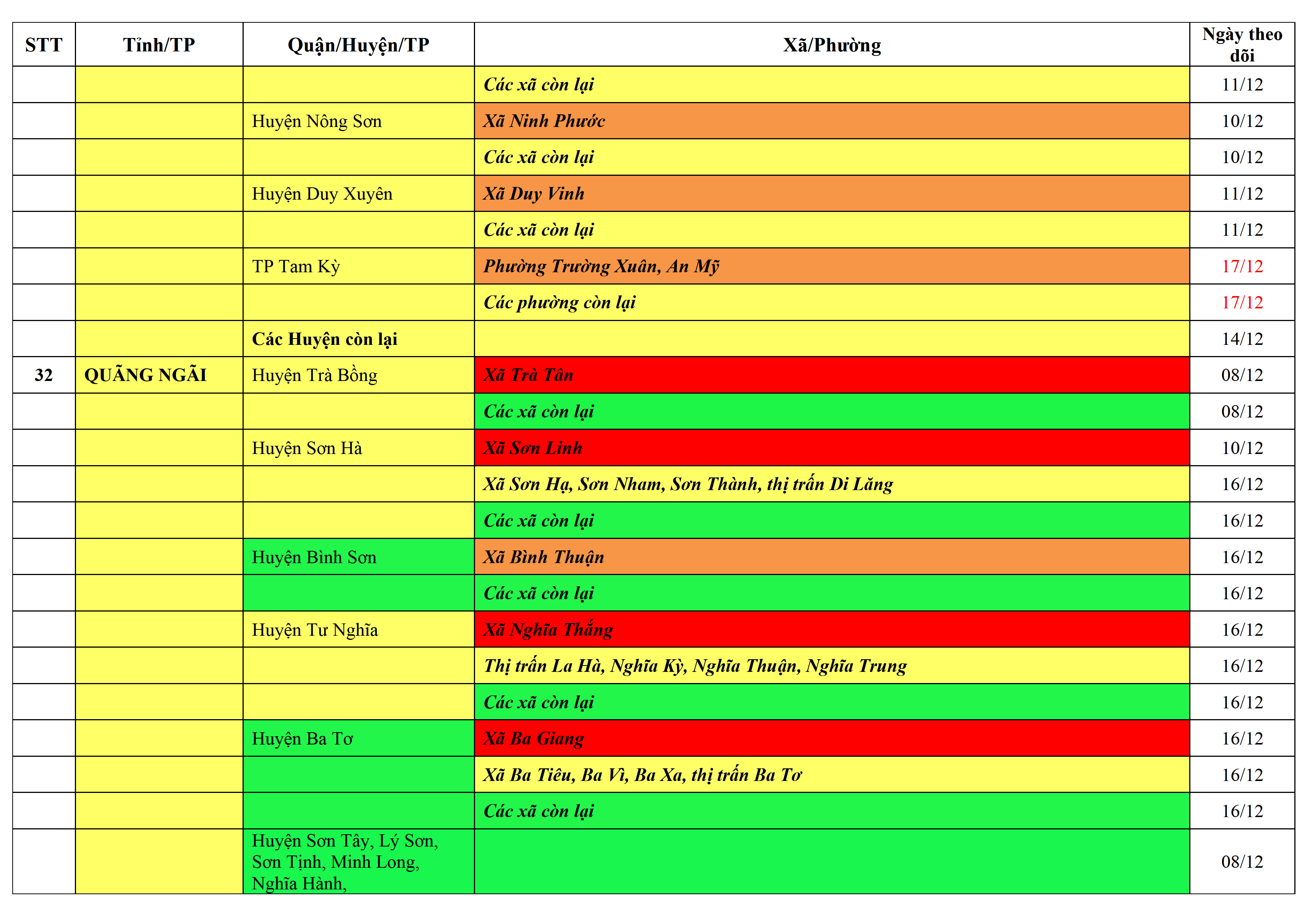 Lưu ý: Các tỉnh, thành phố không có tên trong bảng màu, đi lại bình thường, tuân thủ các biện pháp phòng chống dịch theo chỉ đạo của Bộ Y tế; khai báo y tế, thực hiện nghiêm 5K.