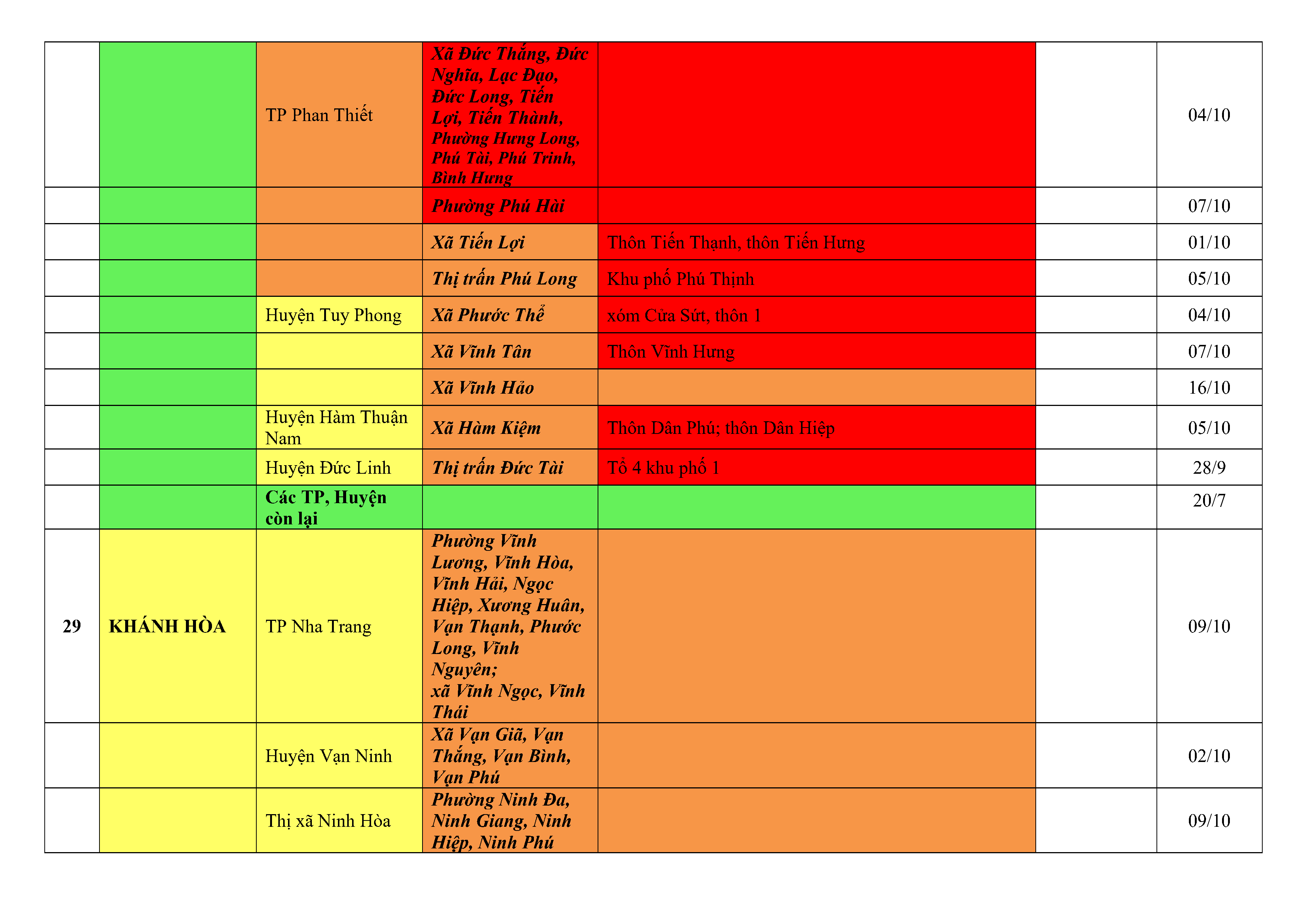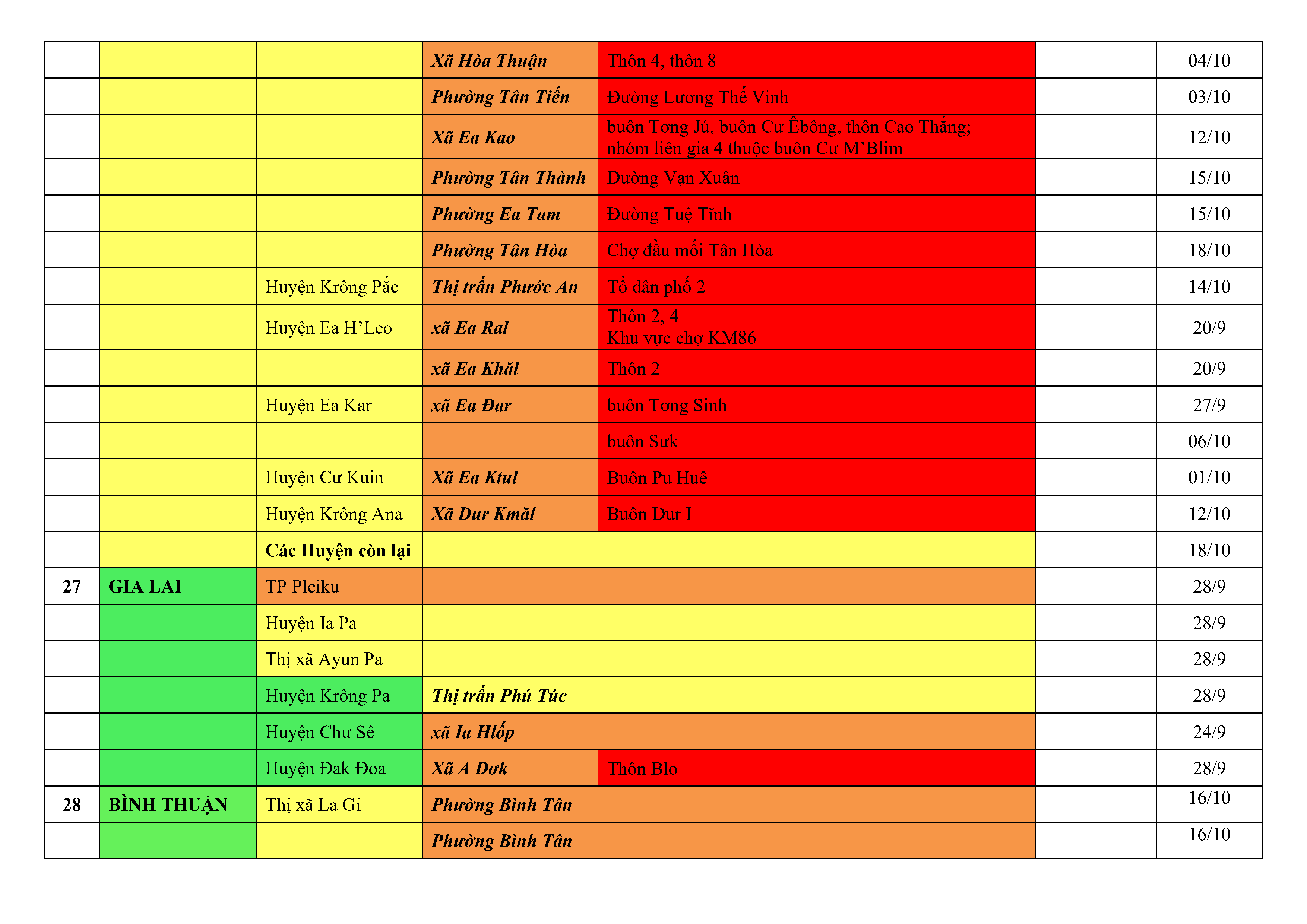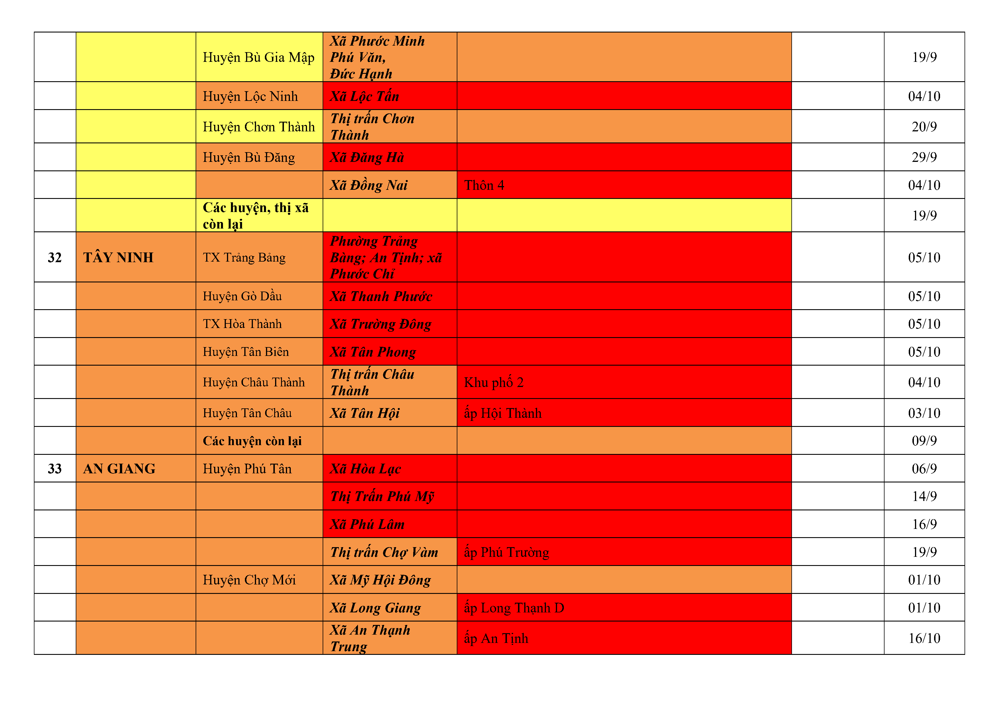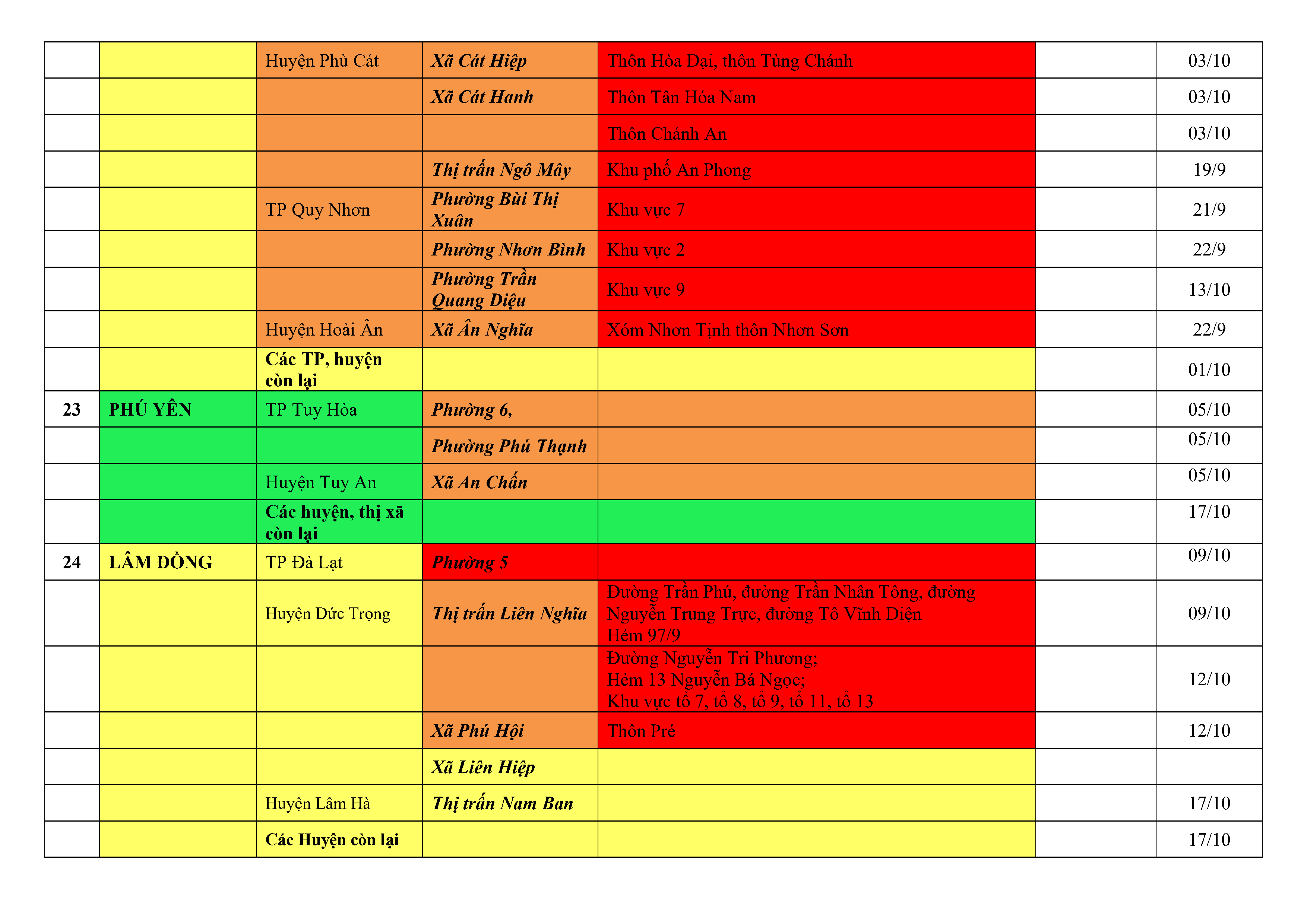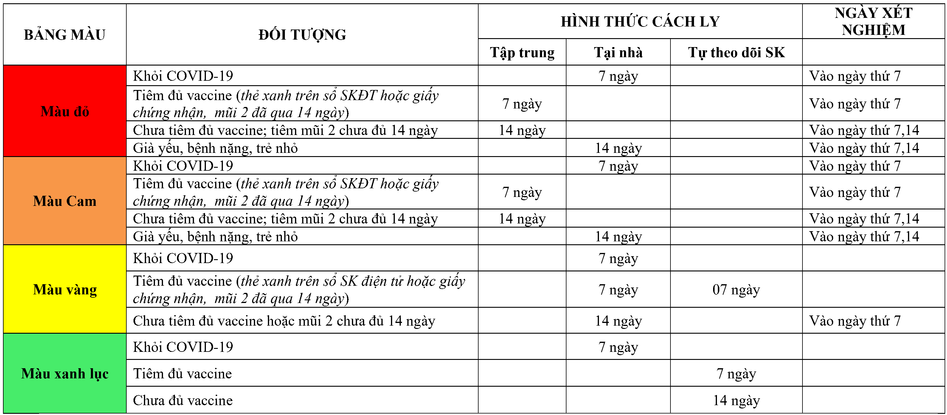 Lưu ý: Các tỉnh, thành phố không có tên trong bảng màu, đi lại bình thường, tuân thủ các biện pháp phòng chống dịch theo chỉ đạo của Bộ Y tế; khai bào y tế, thực hiện nghiêm 5K.