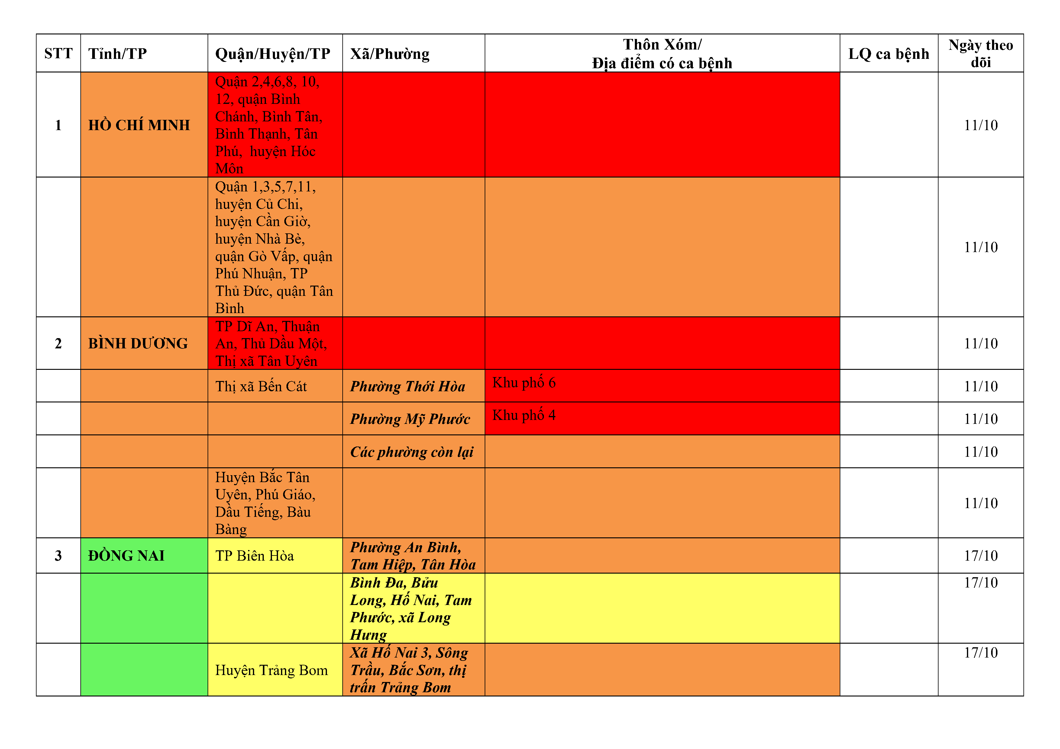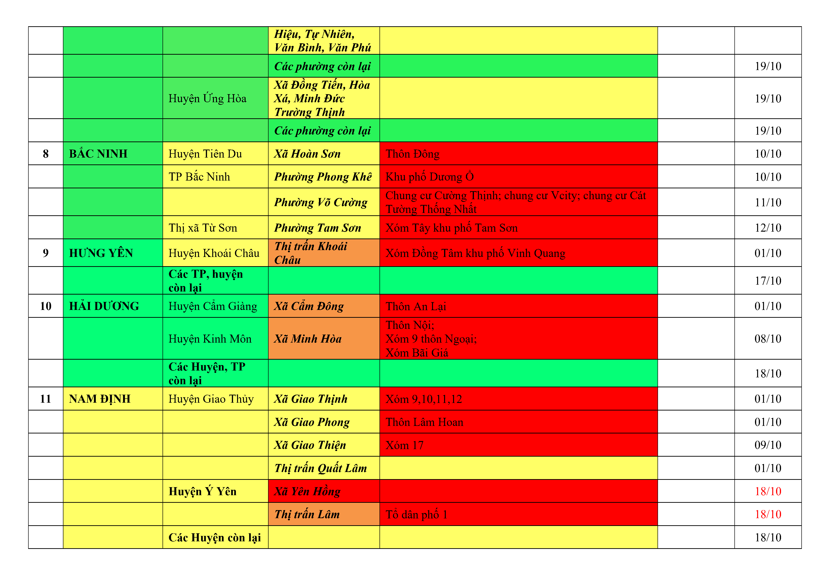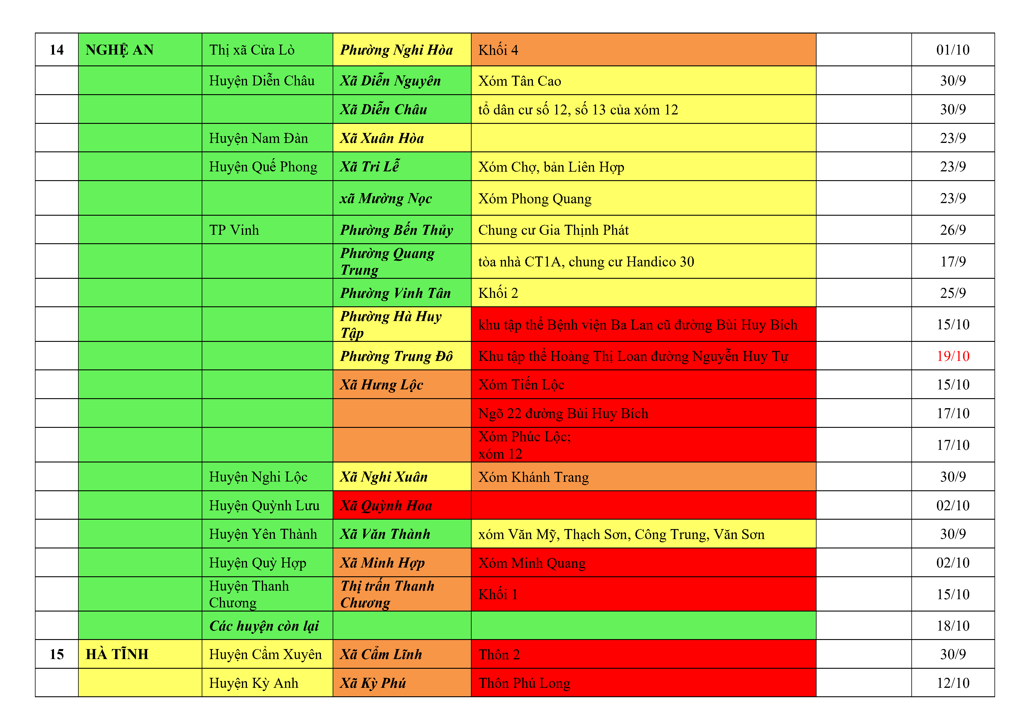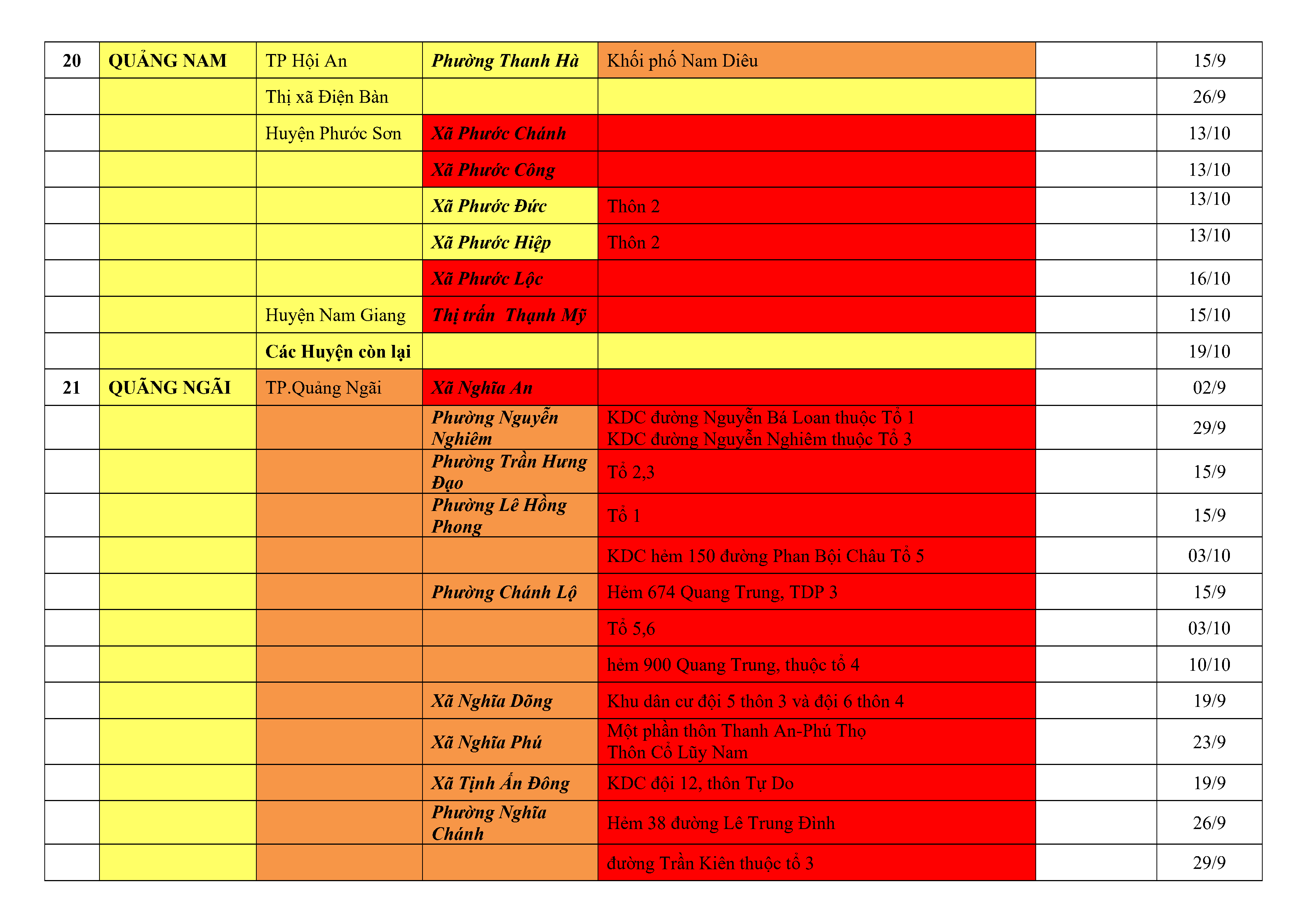 Lưu ý: Các tỉnh, thành phố không có tên trong bảng màu, đi lại bình thường, tuân thủ các biện pháp phòng chống dịch theo chỉ đạo của Bộ Y tế; khai bào y tế, thực hiện nghiêm 5K.