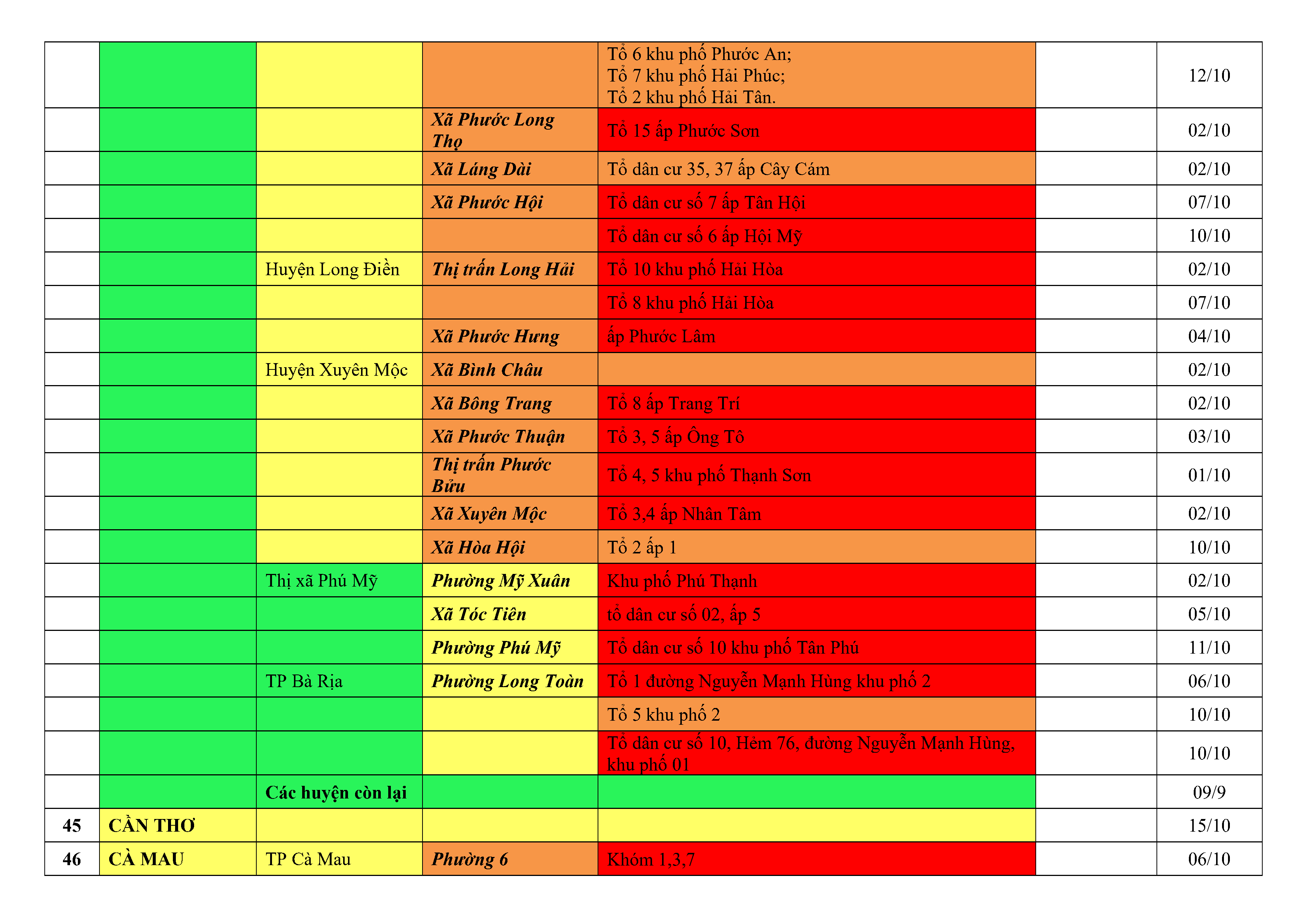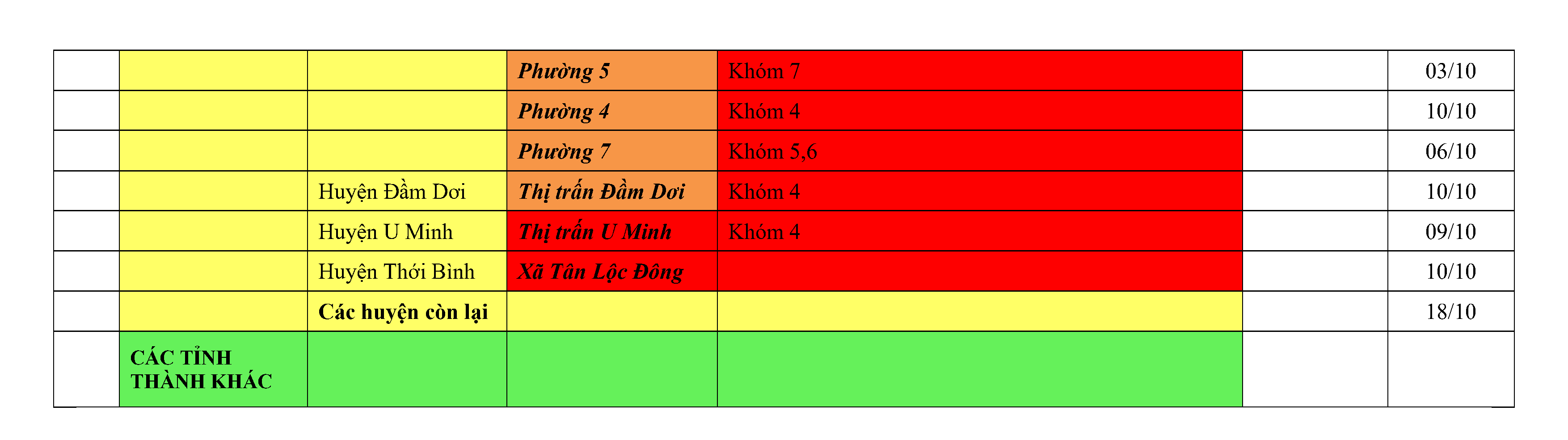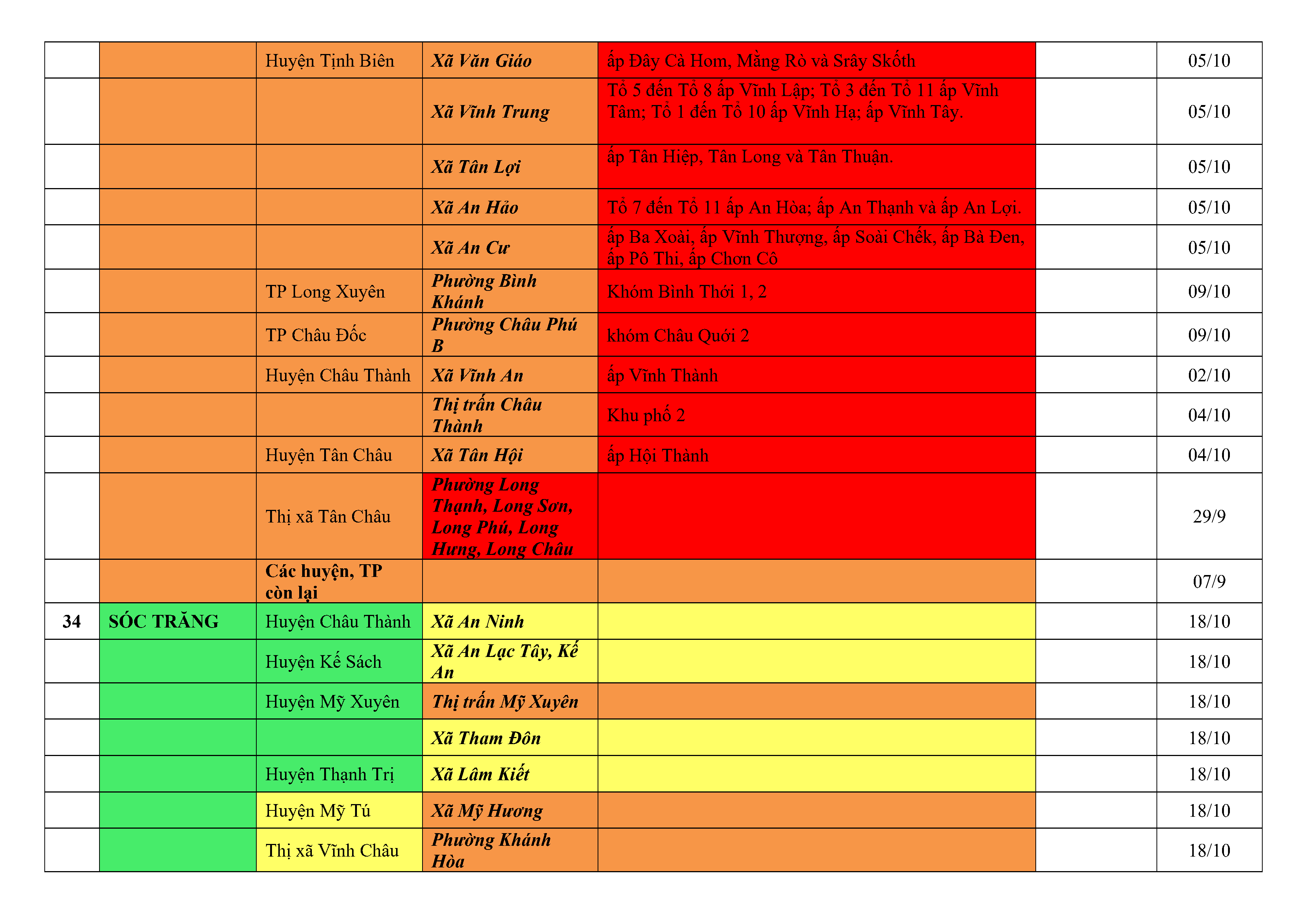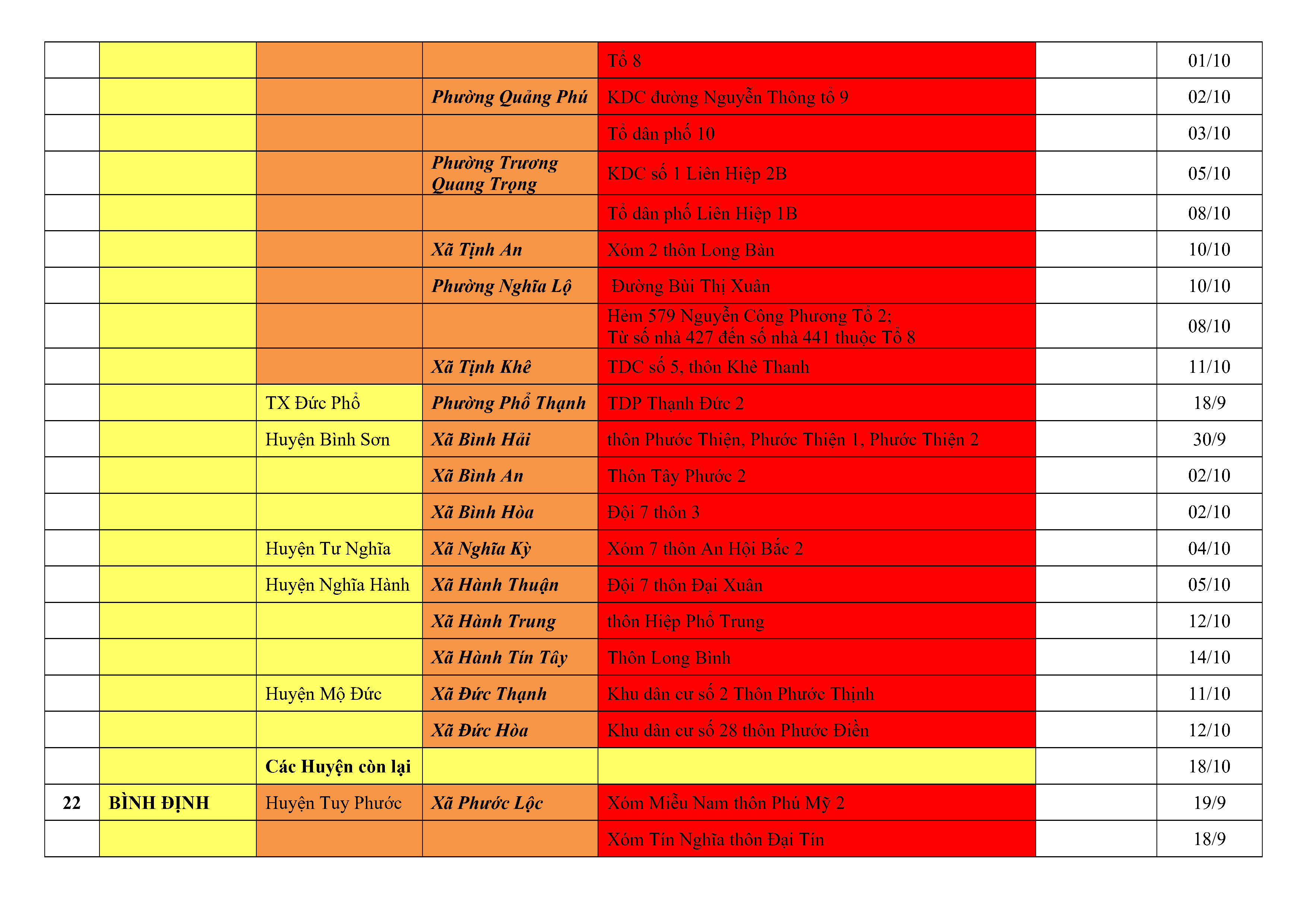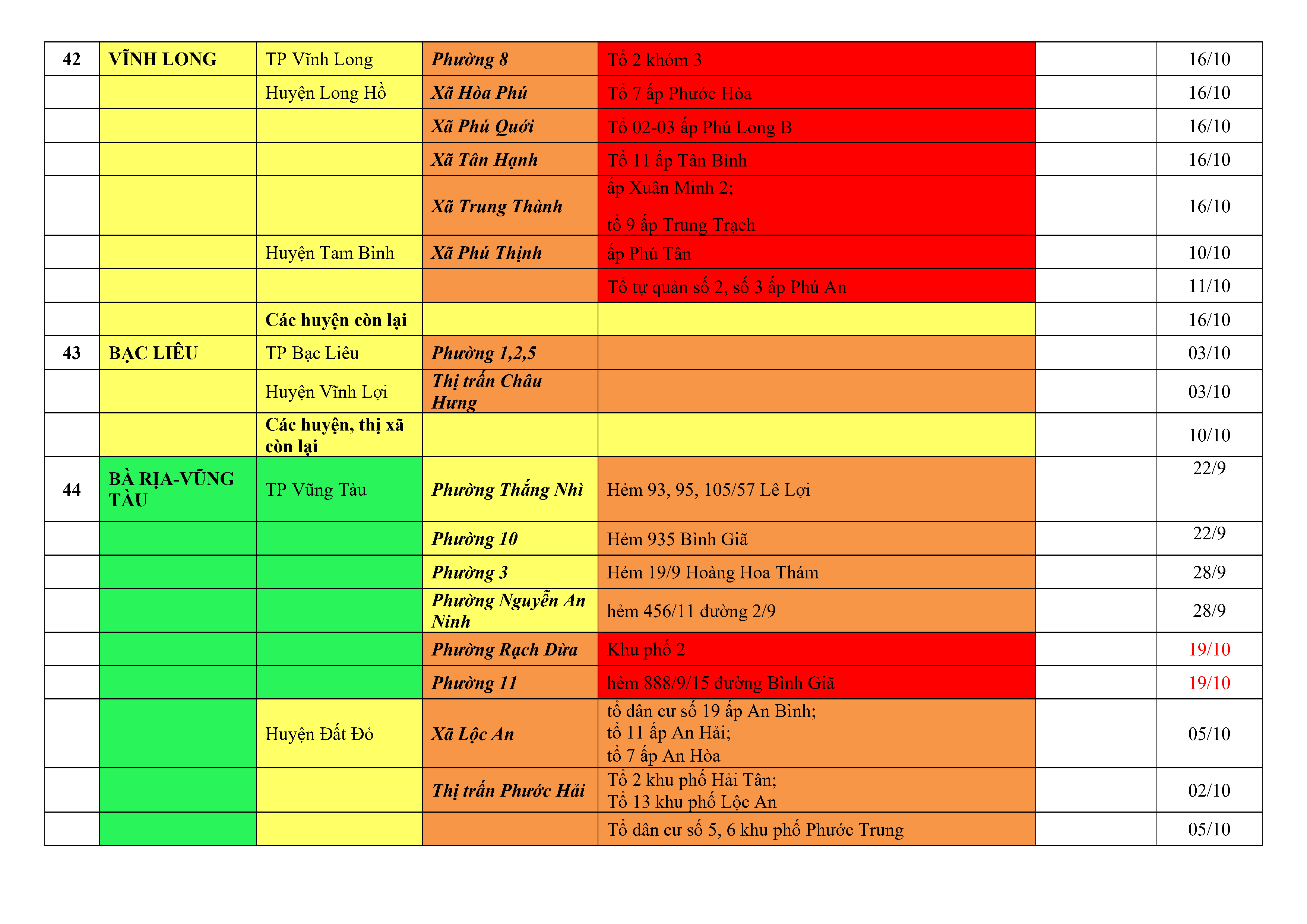 Lưu ý: Các tỉnh, thành phố không có tên trong bảng màu, đi lại bình thường, tuân thủ các biện pháp phòng chống dịch theo chỉ đạo của Bộ Y tế; khai bào y tế, thực hiện nghiêm 5K.