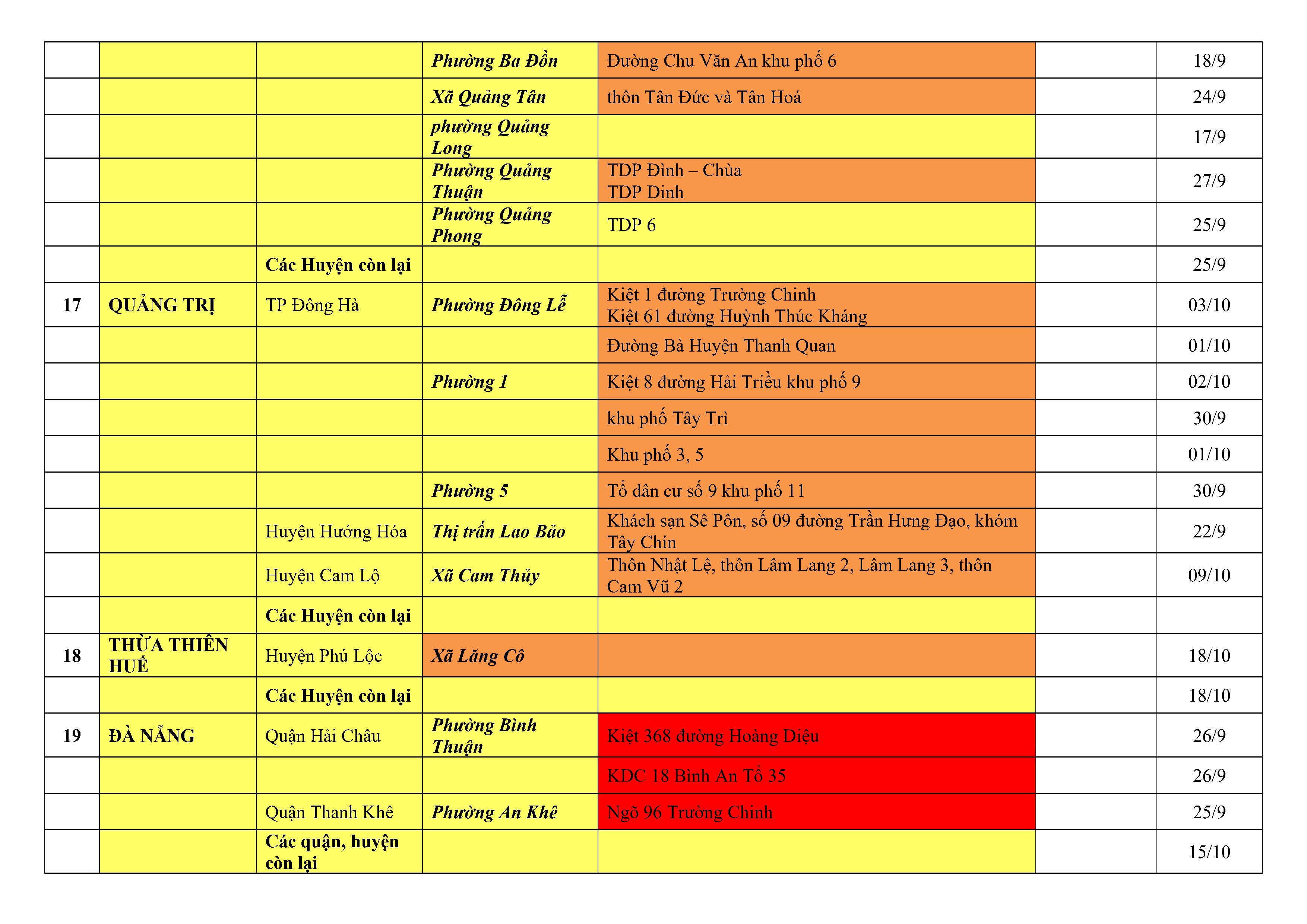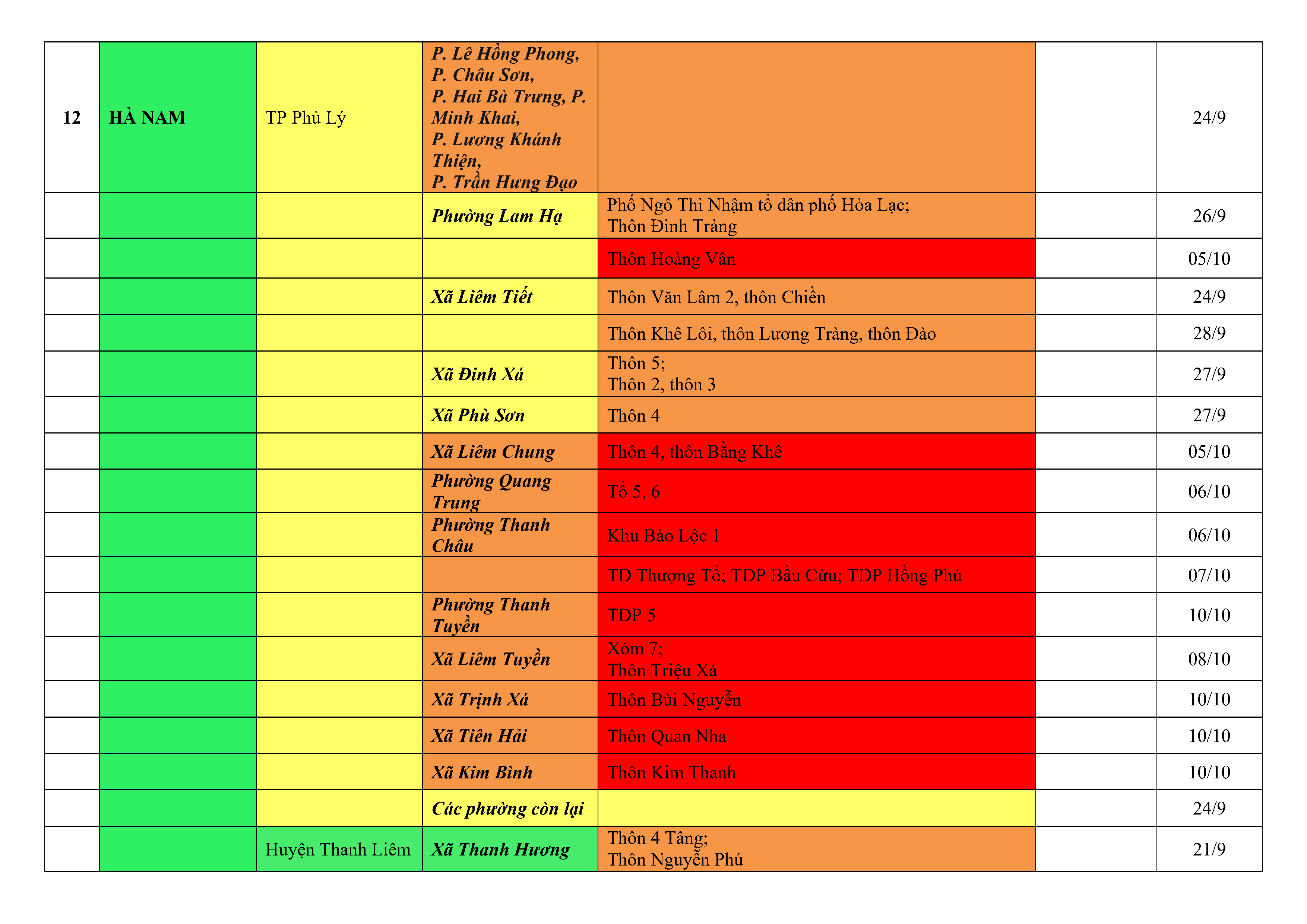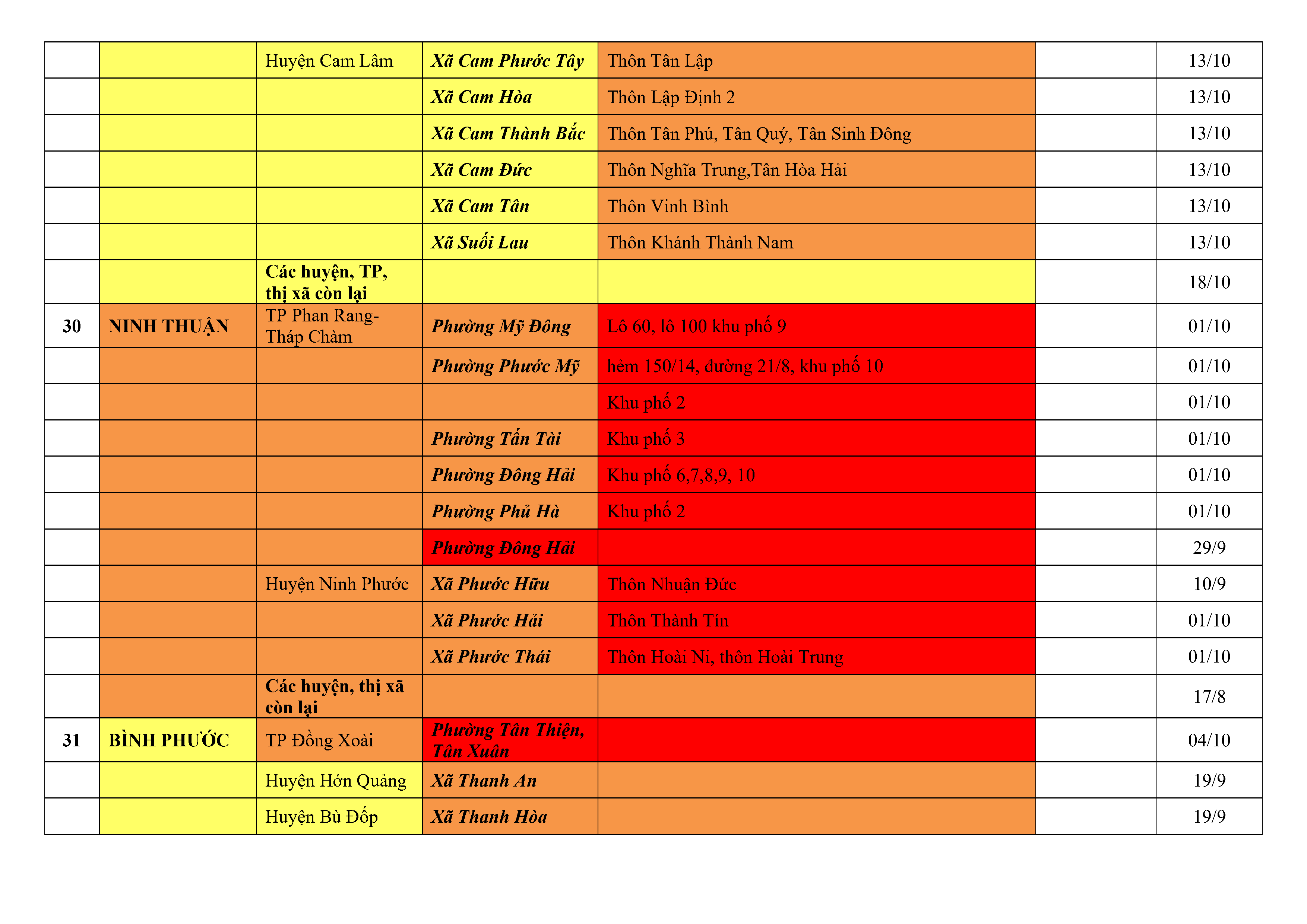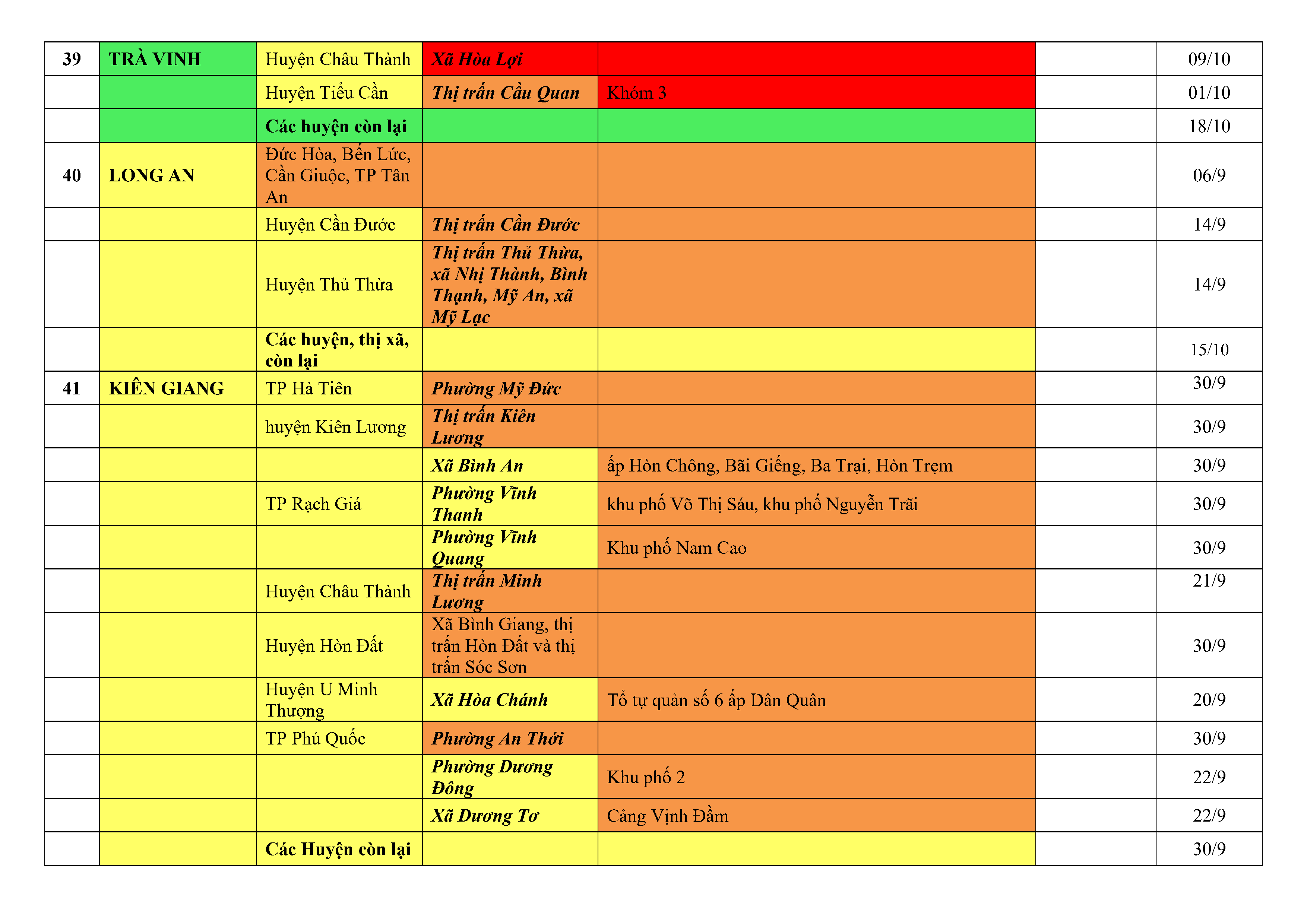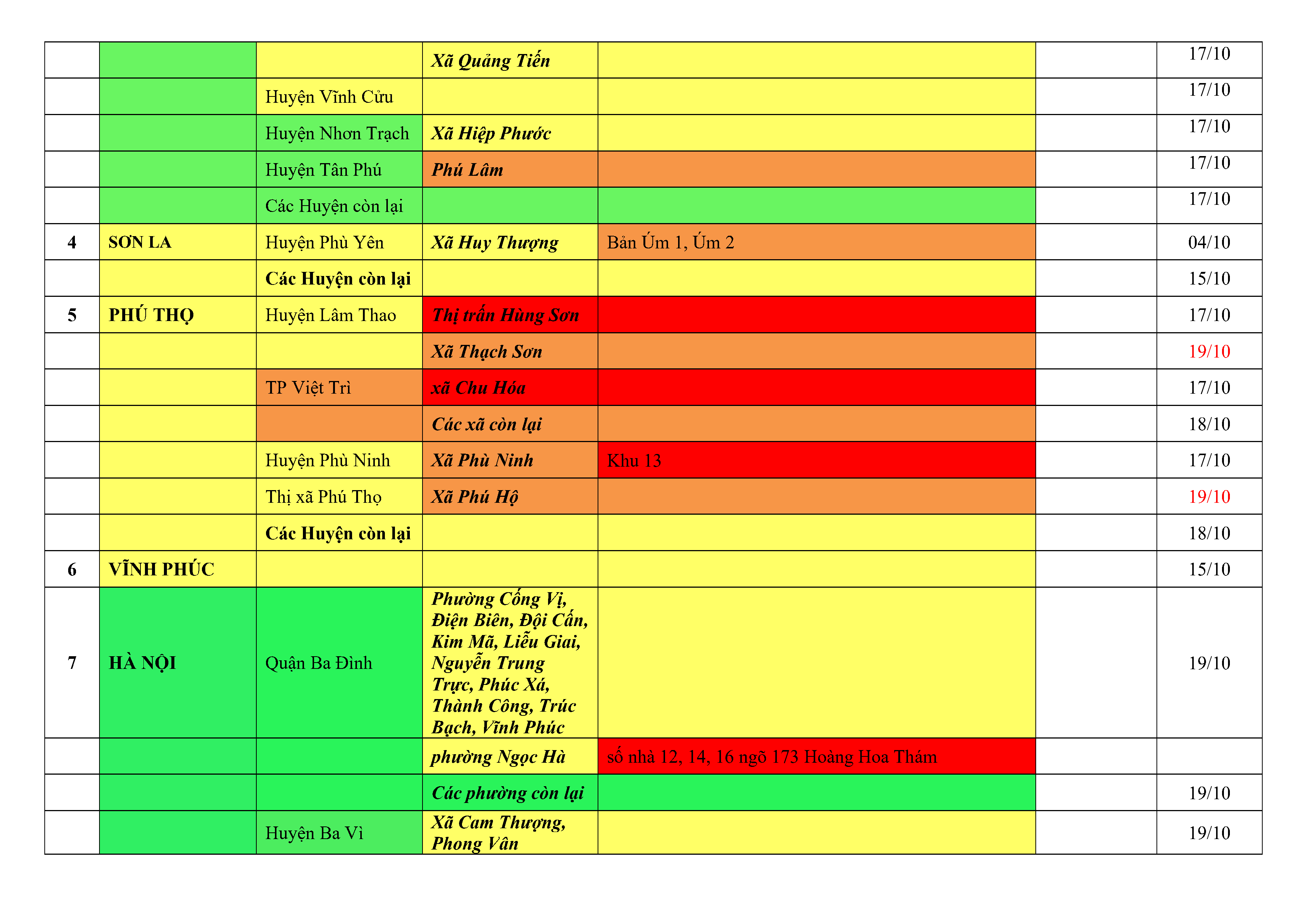 Lưu ý: Các tỉnh, thành phố không có tên trong bảng màu, đi lại bình thường, tuân thủ các biện pháp phòng chống dịch theo chỉ đạo của Bộ Y tế; khai bào y tế, thực hiện nghiêm 5K.