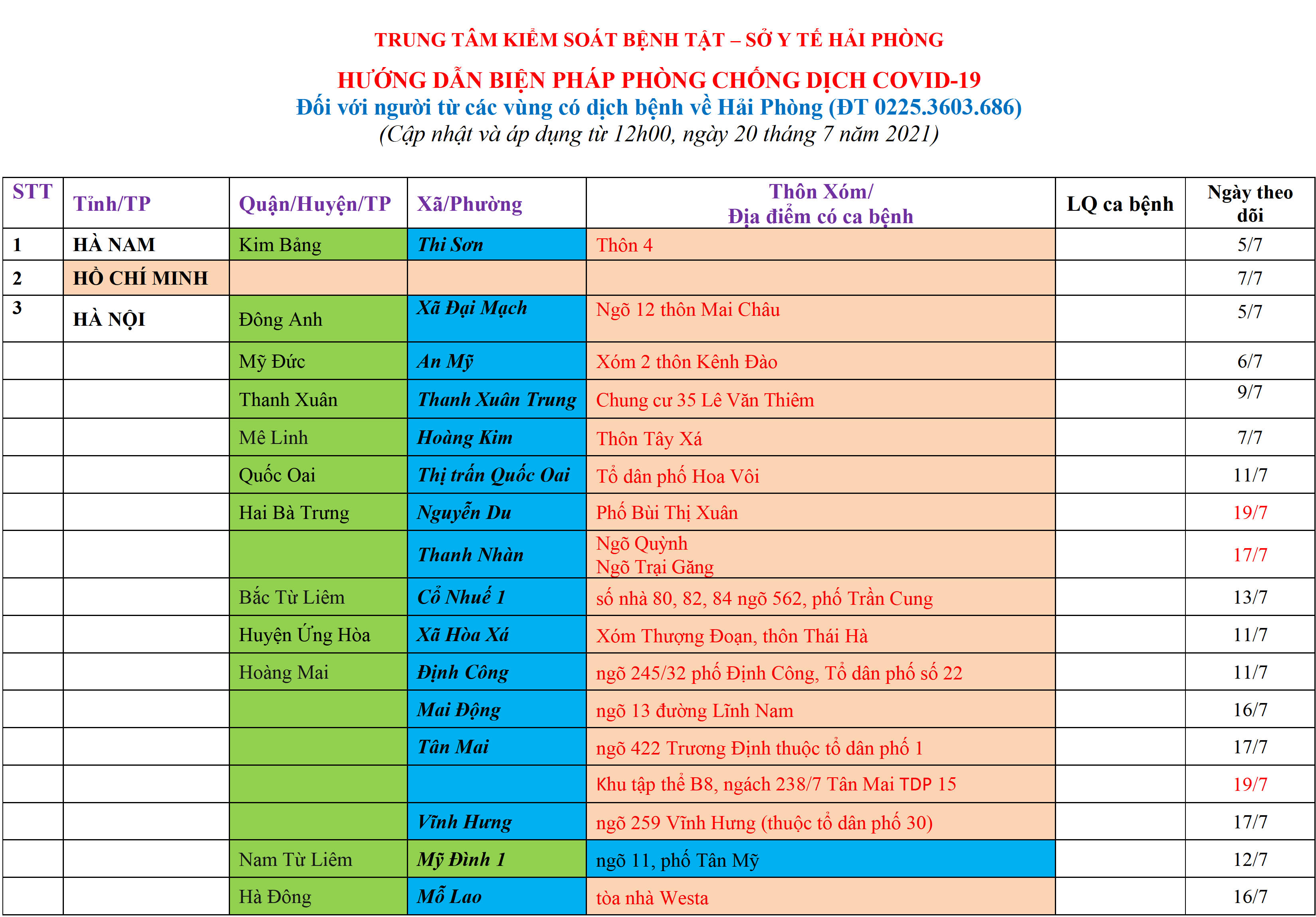 . Áp dụng các biện pháp Cách ly y tế đối với những người đến và trở về Hải Phòng, từ các vùng có ca bệnh tại cộng đồng theo Bảng trên.
