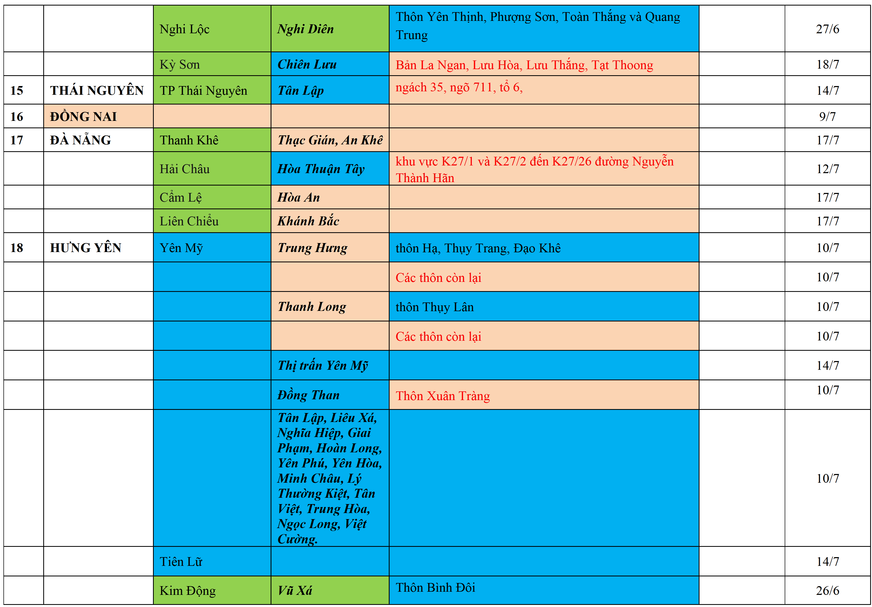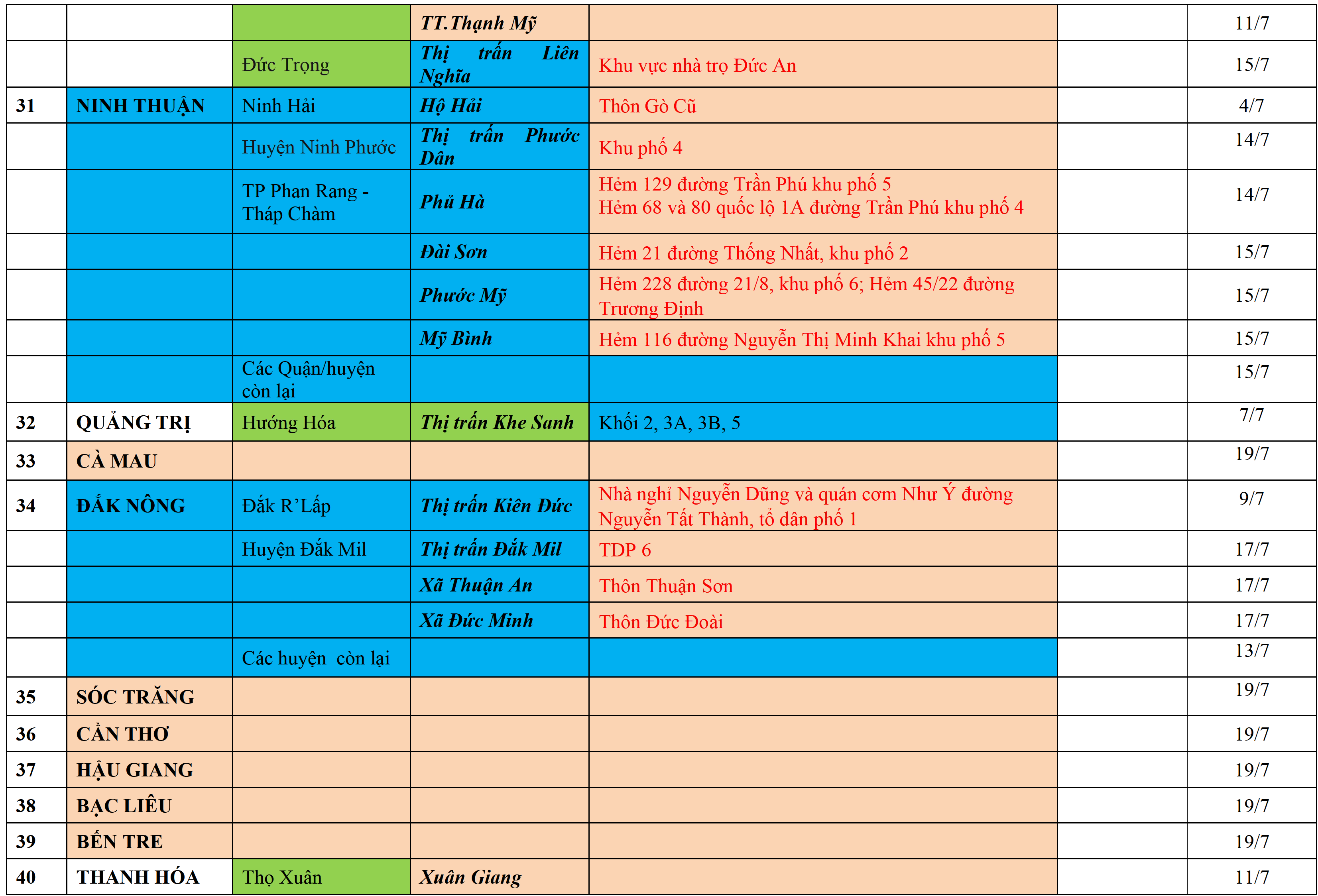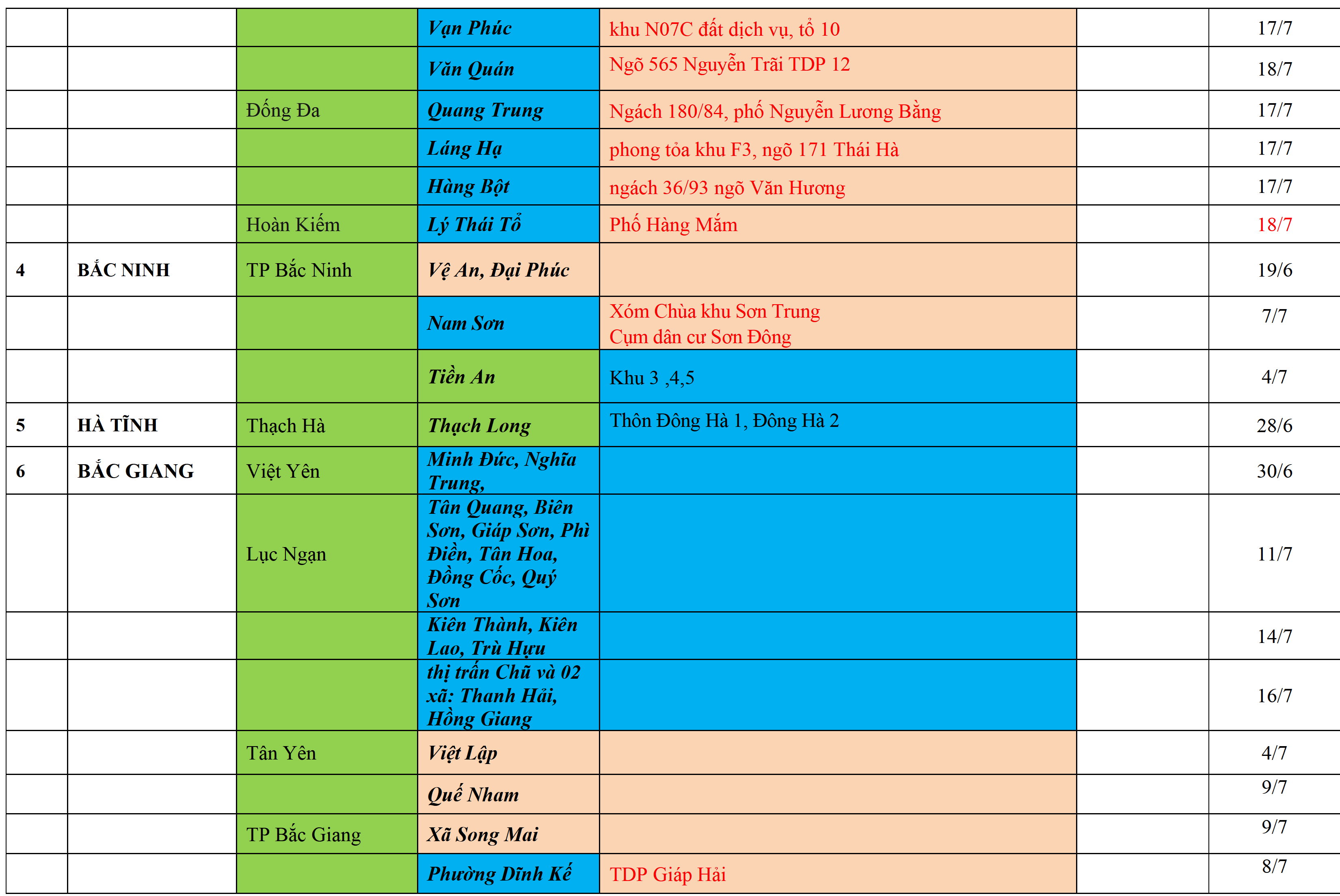 . Áp dụng biện pháp tương ứng màu sắc ô cột theo thôn xóm; xã phường; quận huyện; tỉnh thành phố. Cách ly y tế dựa vào việc tiếp xúc, đi đến địa điểm và nơi cư trú có ca bệnh, theo Thông báo của Bộ Y tế, các tỉnh thành phố.