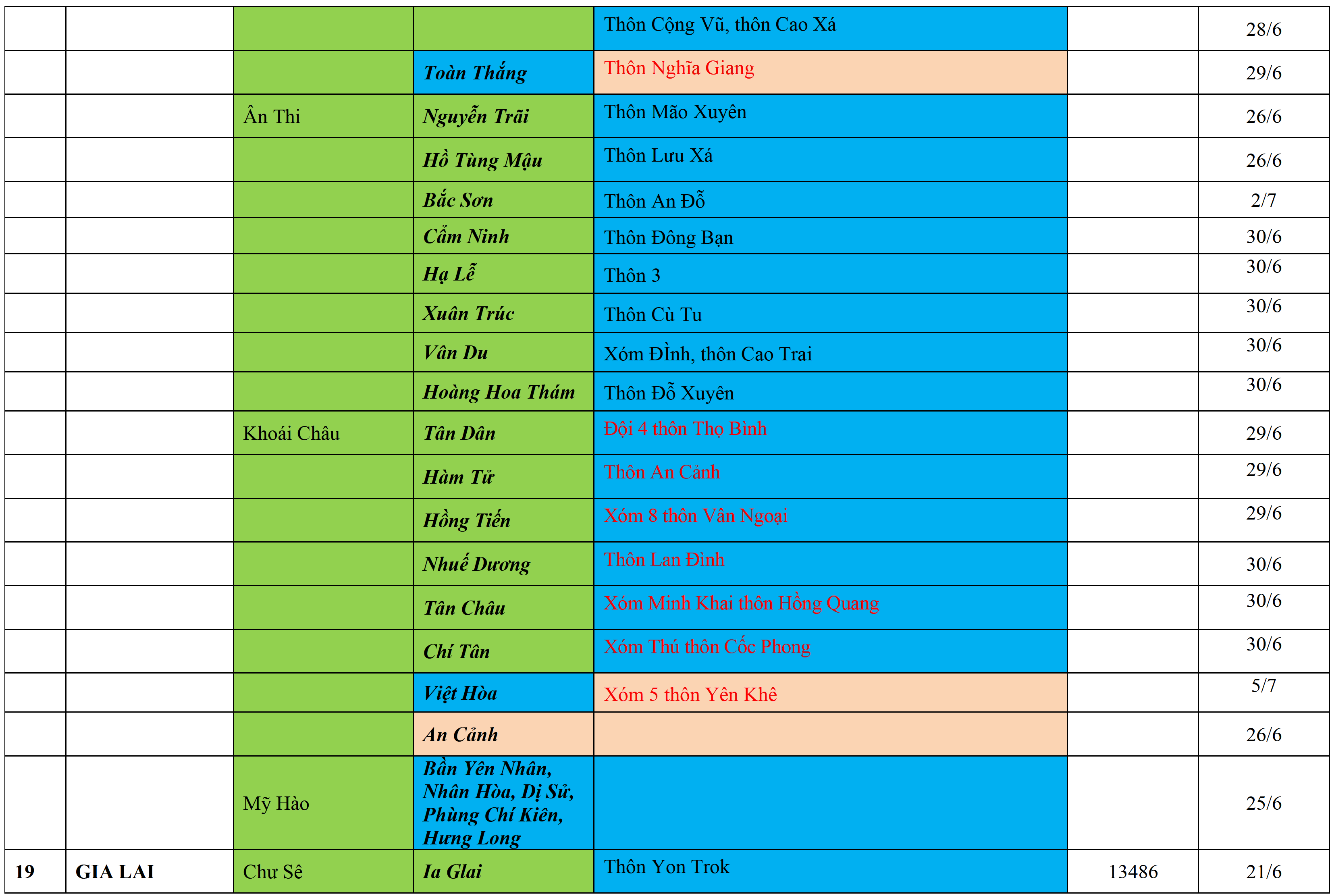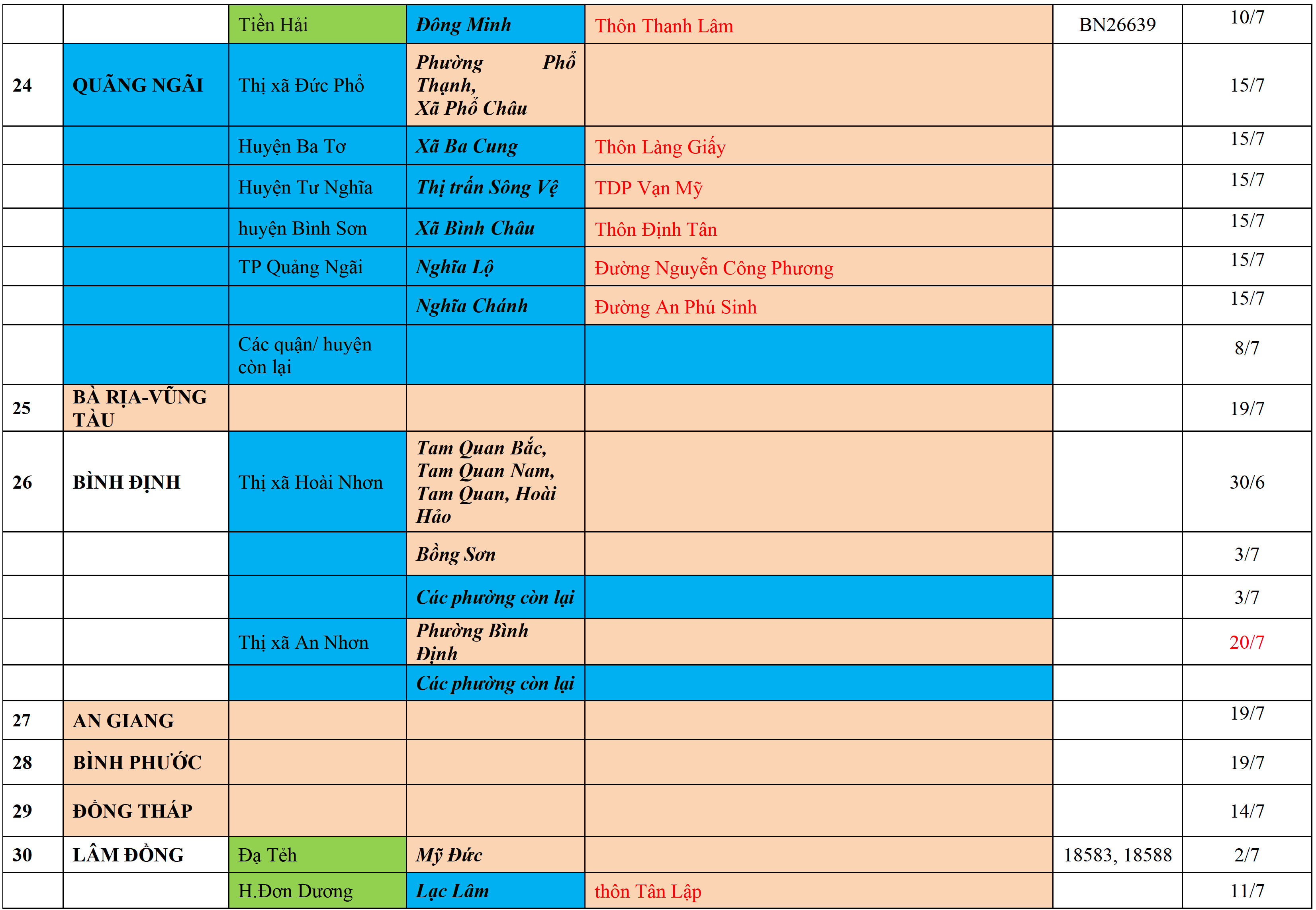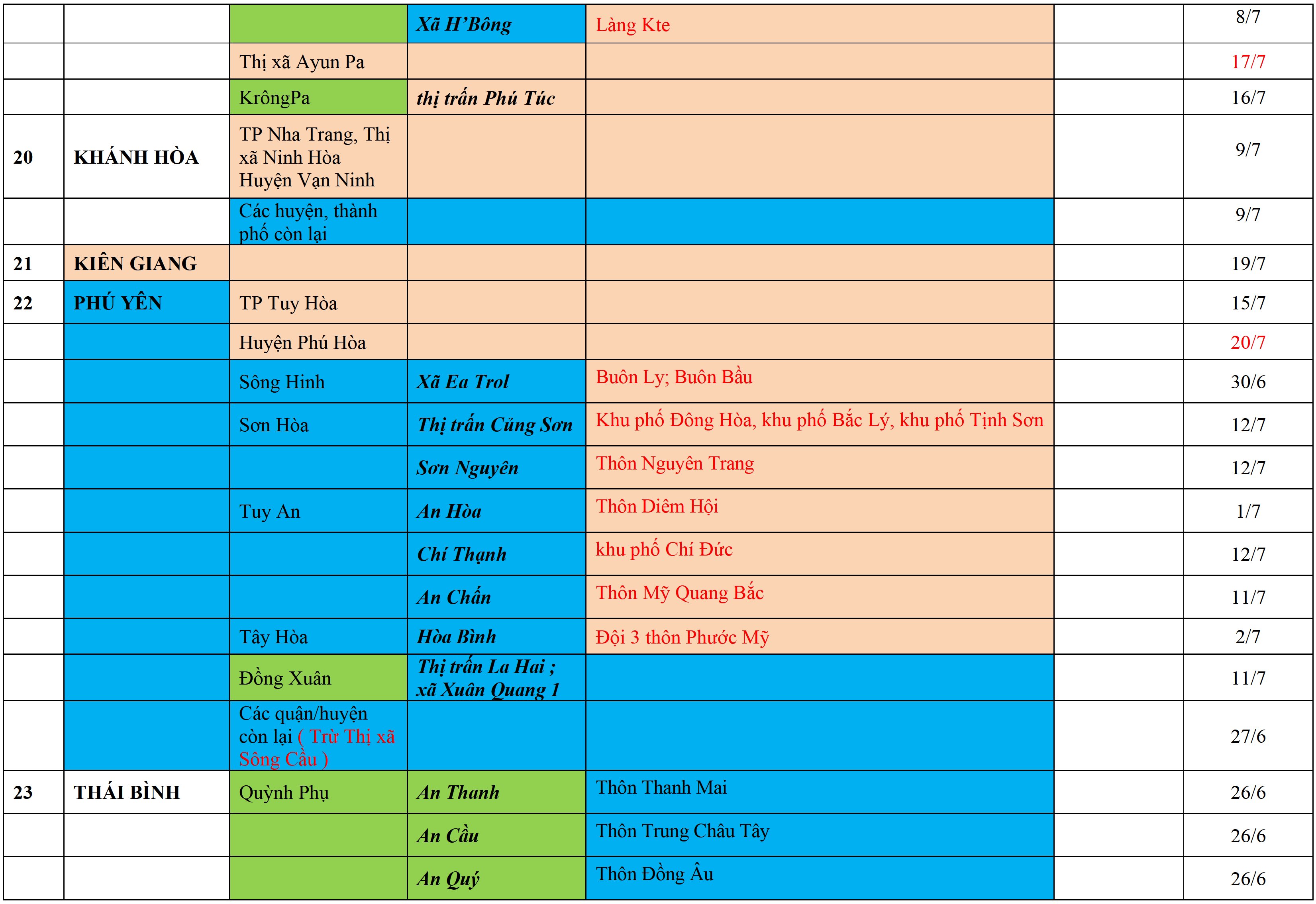 . Áp dụng biện pháp tương ứng màu sắc ô cột theo thôn xóm; xã phường; quận huyện; tỉnh thành phố. Cách ly y tế dựa vào việc tiếp xúc, đi đến địa điểm và nơi cư trú có ca bệnh, theo Thông báo của Bộ Y tế, các tỉnh thành phố.