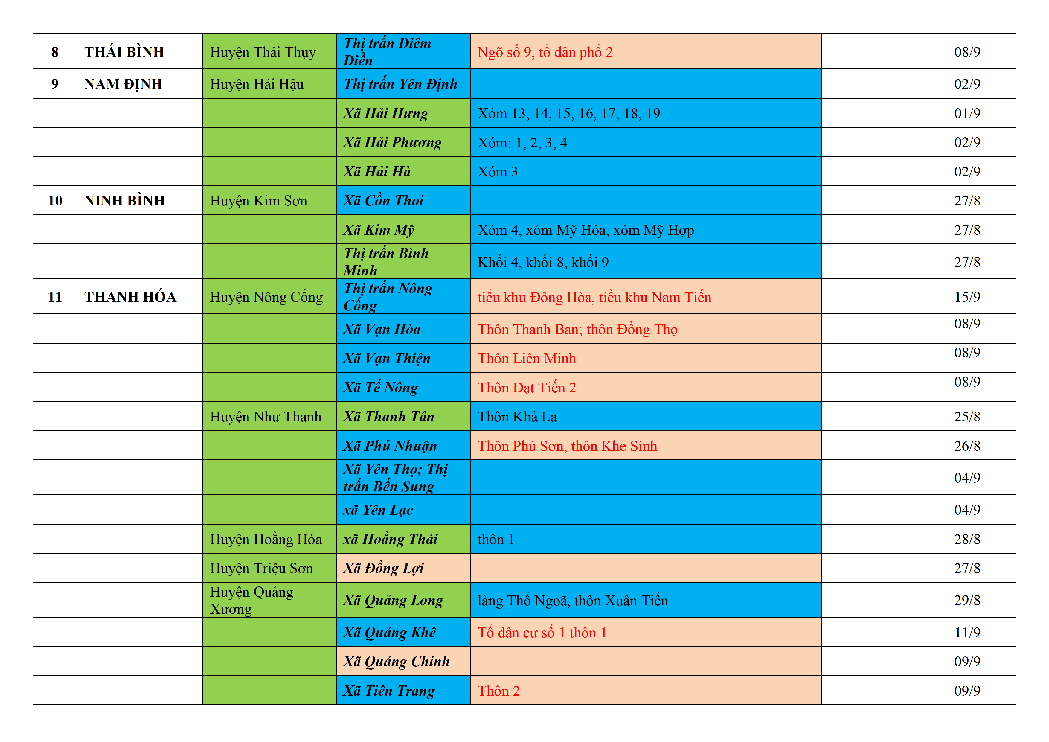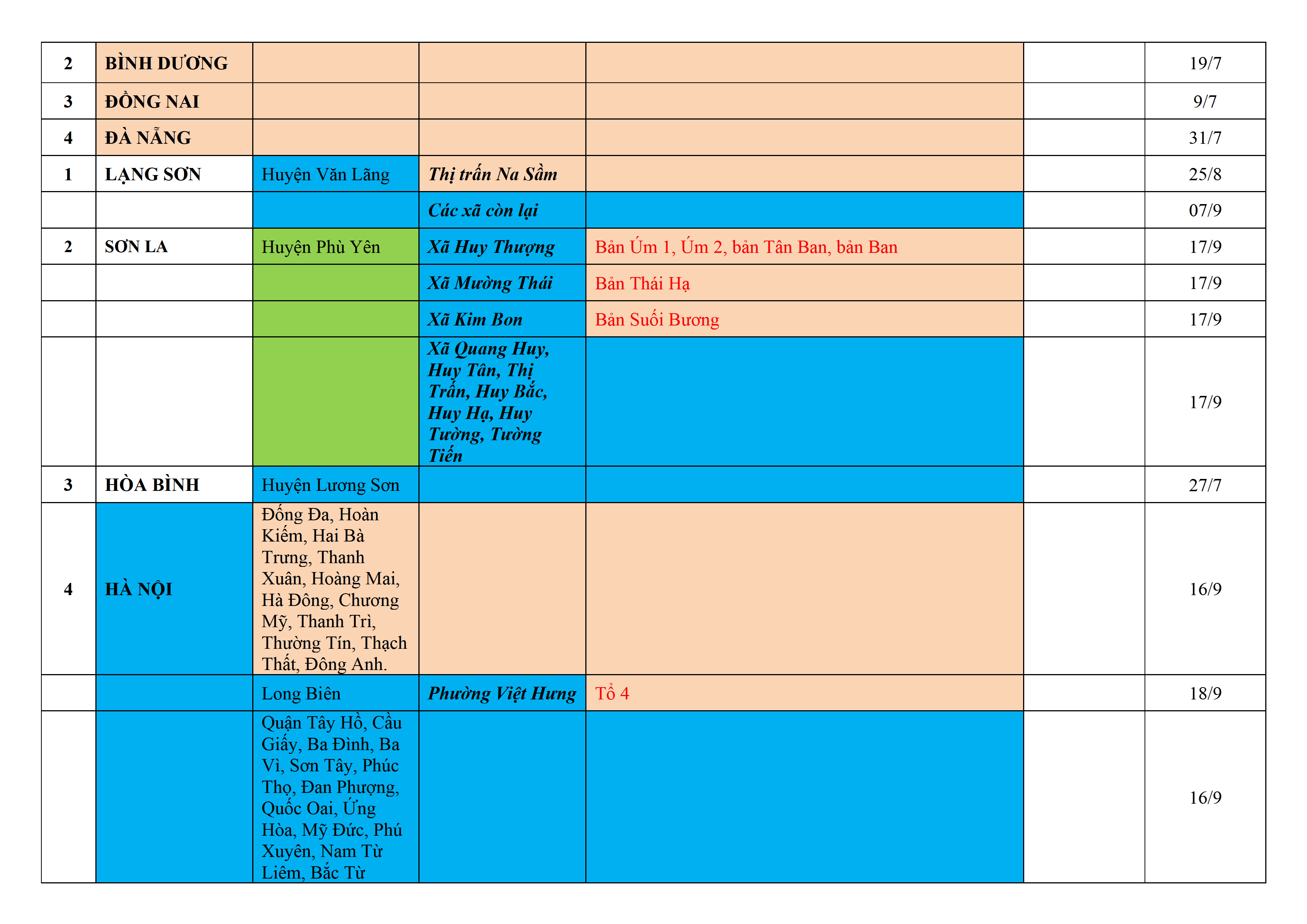 Biện pháp phòng chống dịch: Áp dụng biện pháp tương ứng màu sắc ô cột theo thôn xóm; xã phường; quận huyện; tỉnh thành phố. Cách ly y tế dựa vào việc tiếp xúc, đi đến địa điểm và nơi cư trú có ca bệnh, theo Thông báo của Bộ Y tế, các tỉnh thành phố.