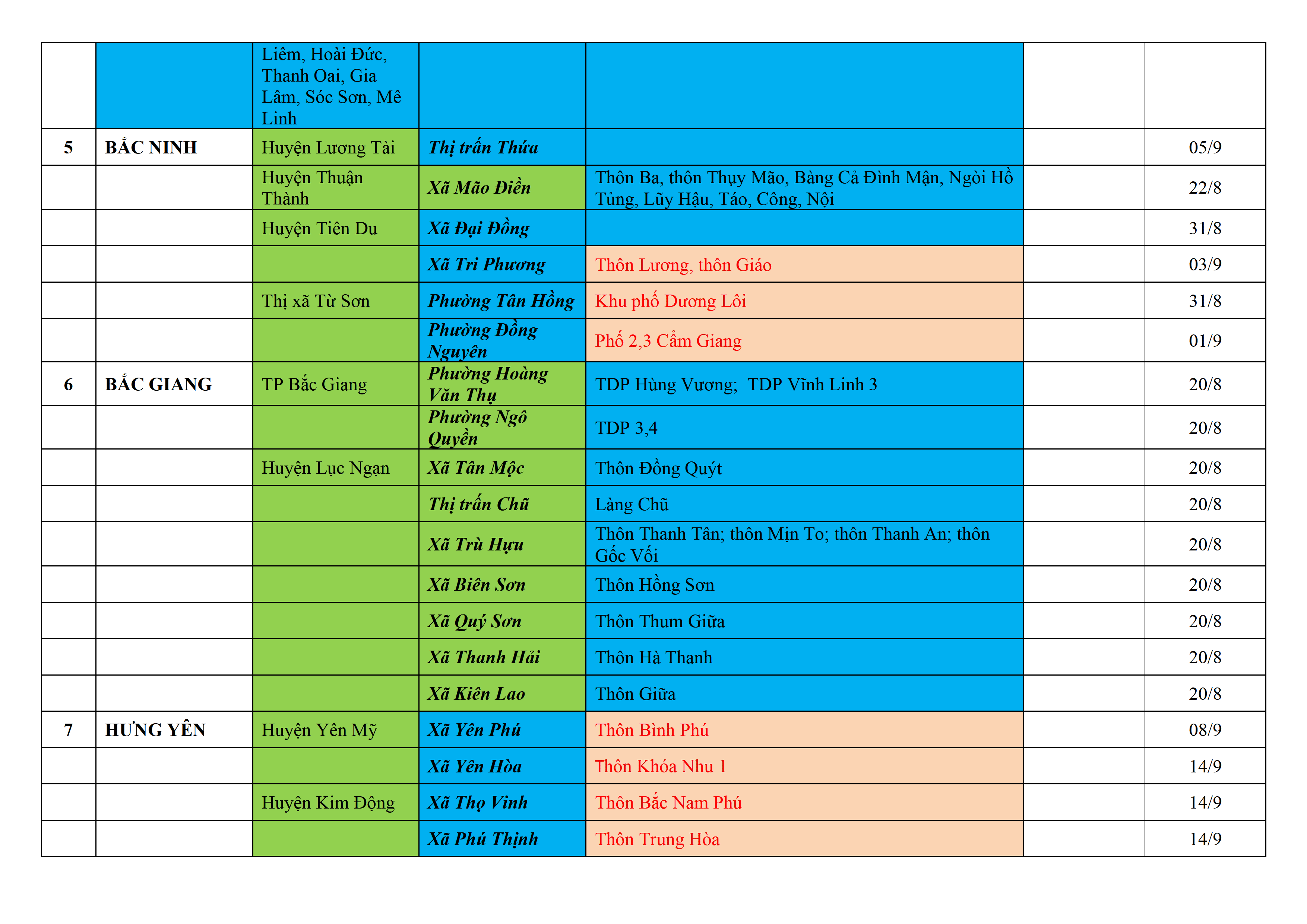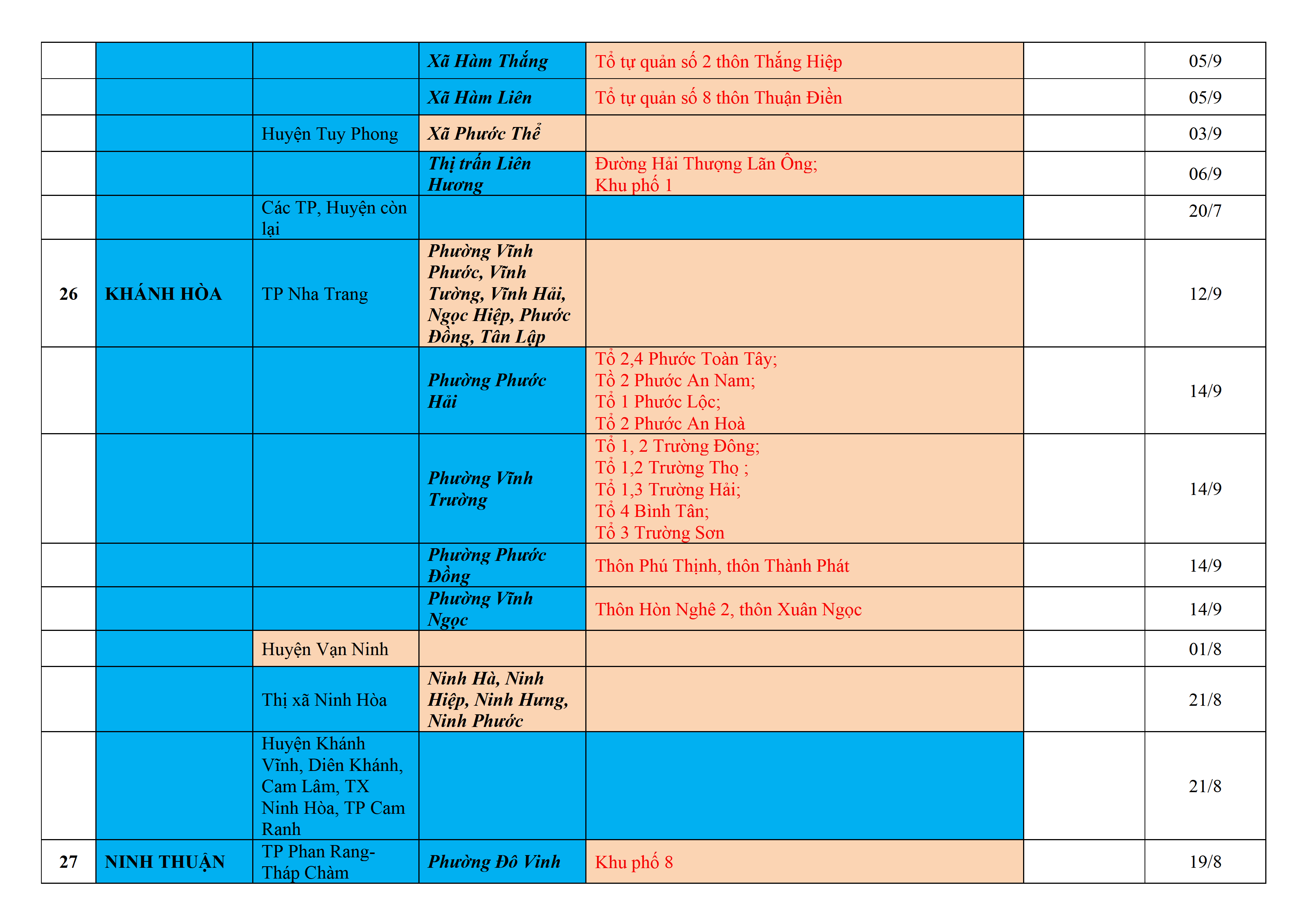 Màu nâu: TẠM DỪNG TIẾP NHẬN; Màu cam: CÁCH LY TẬP TRUNG 14 NGÀY; Màu xanh nước biển: CÁCH LY TẠI NHÀ 14 NGÀY; Màu xanh mạ: KHAI BÁO, GIÁM SÁT Y TẾ; Màu trắng: KHAI BÁO Y TẾ VÀ THỰC HIỆN 5K.