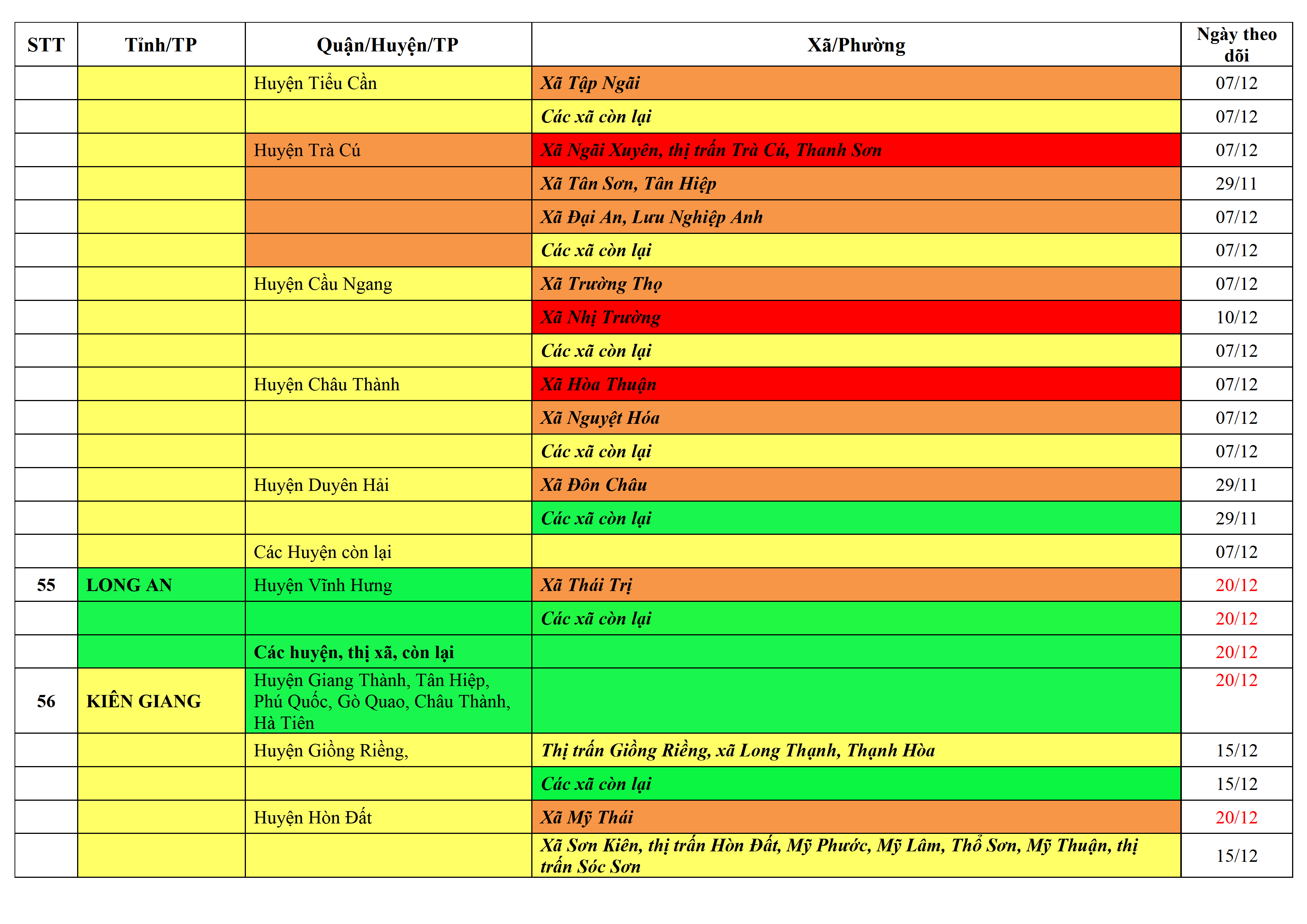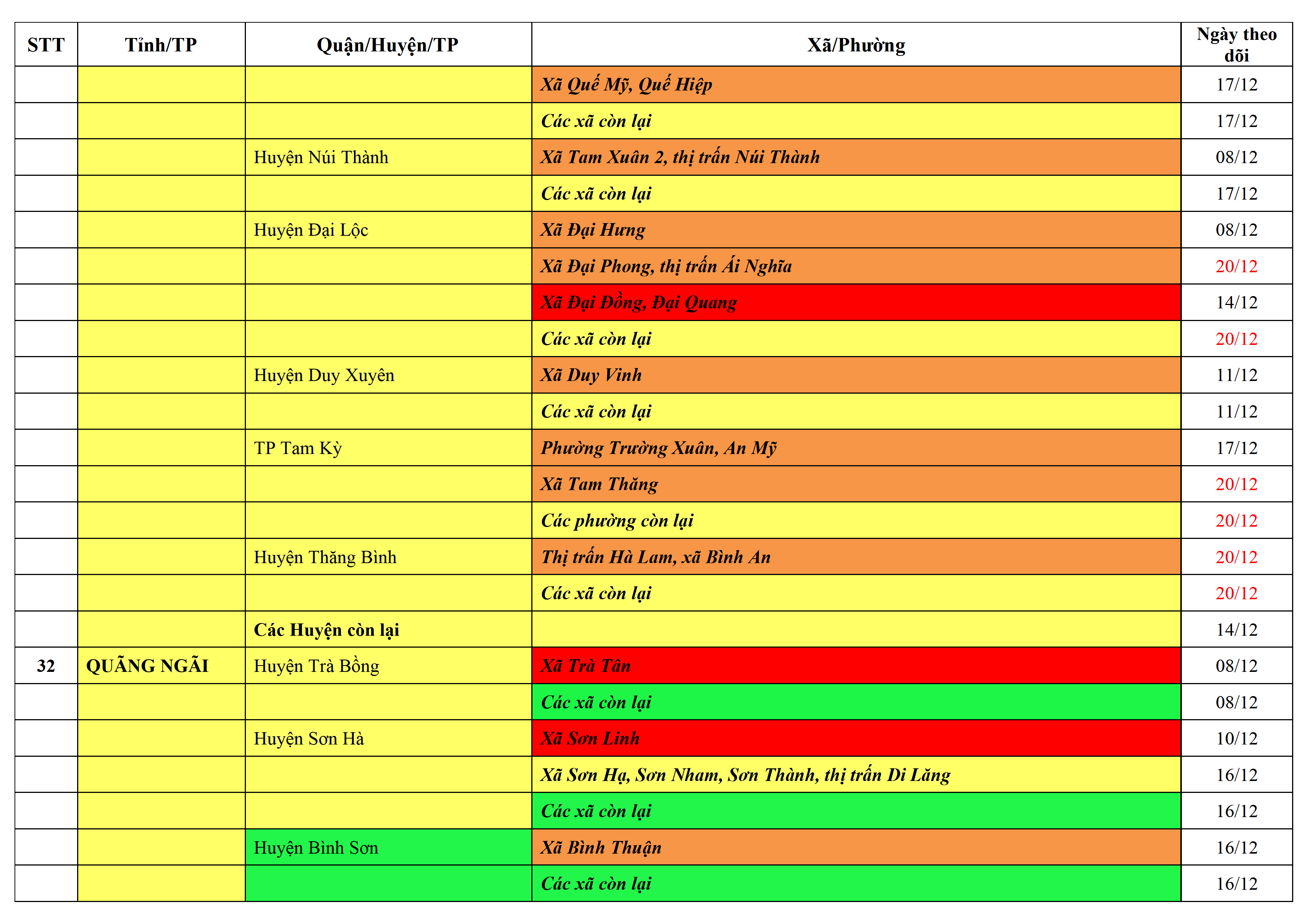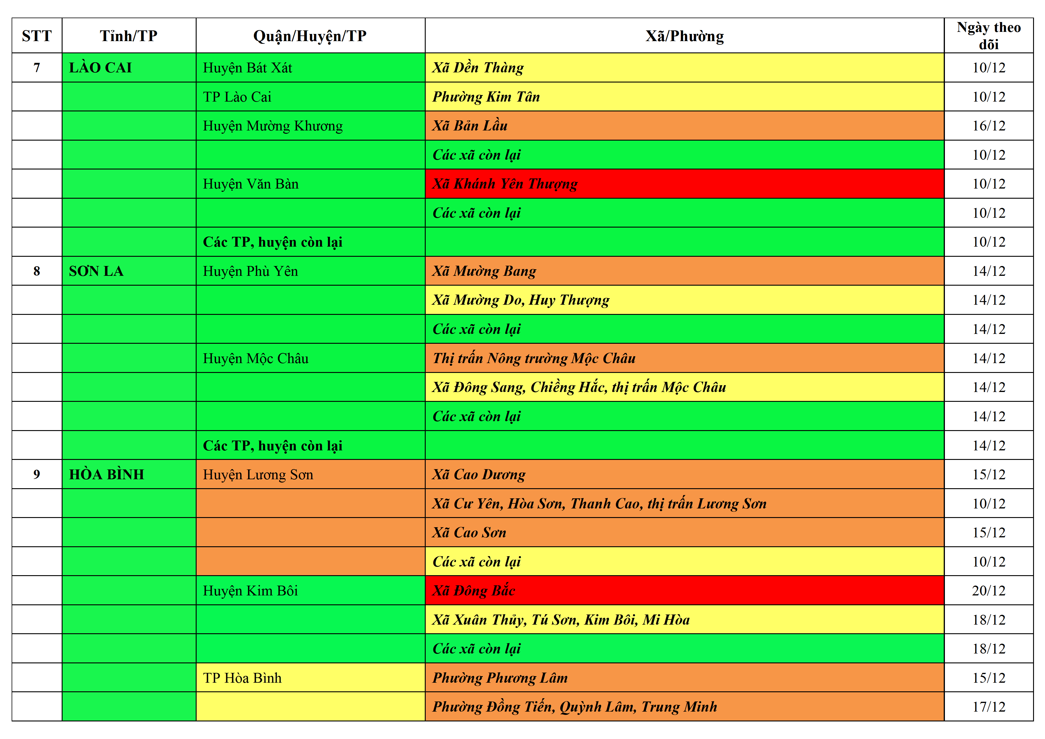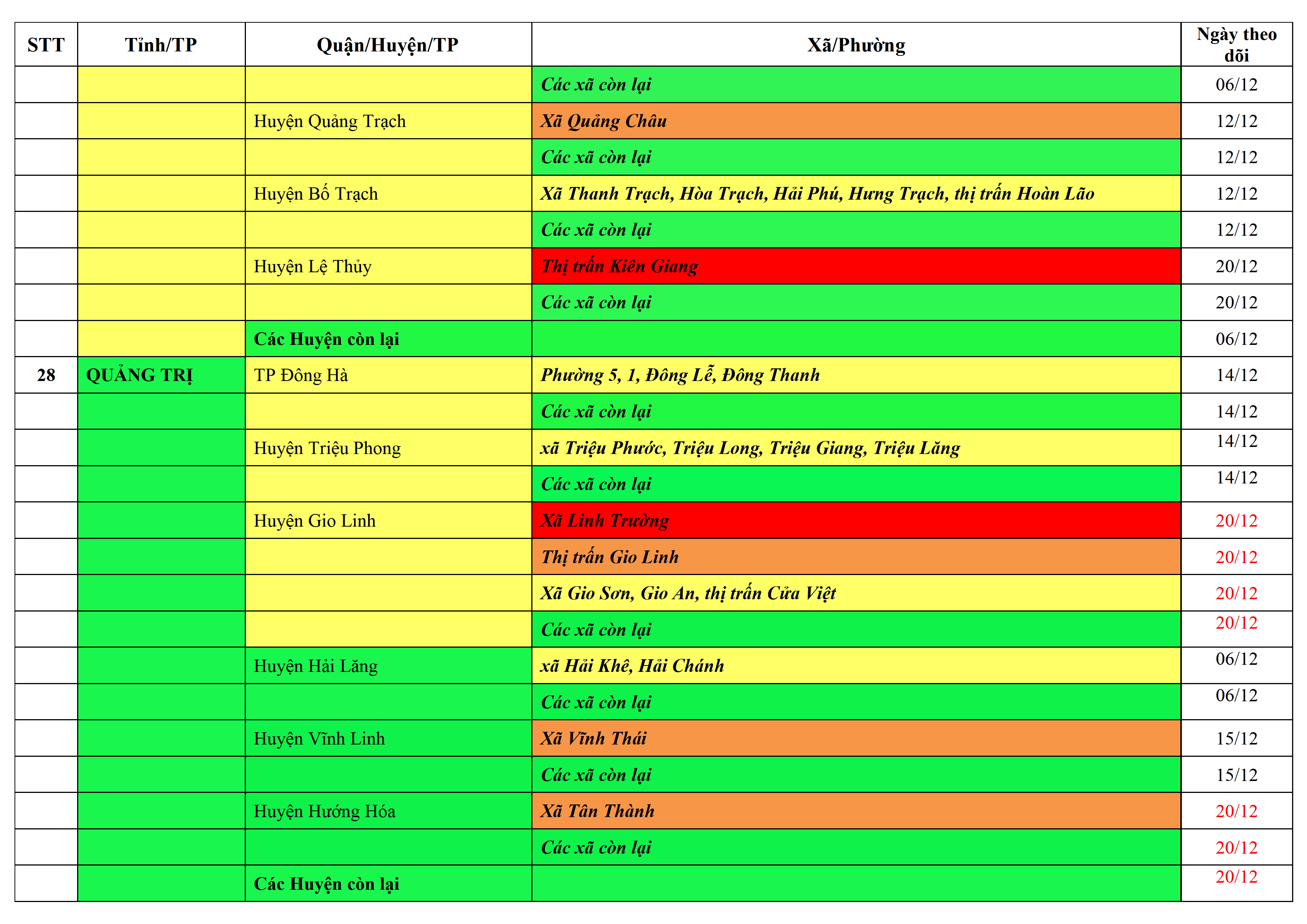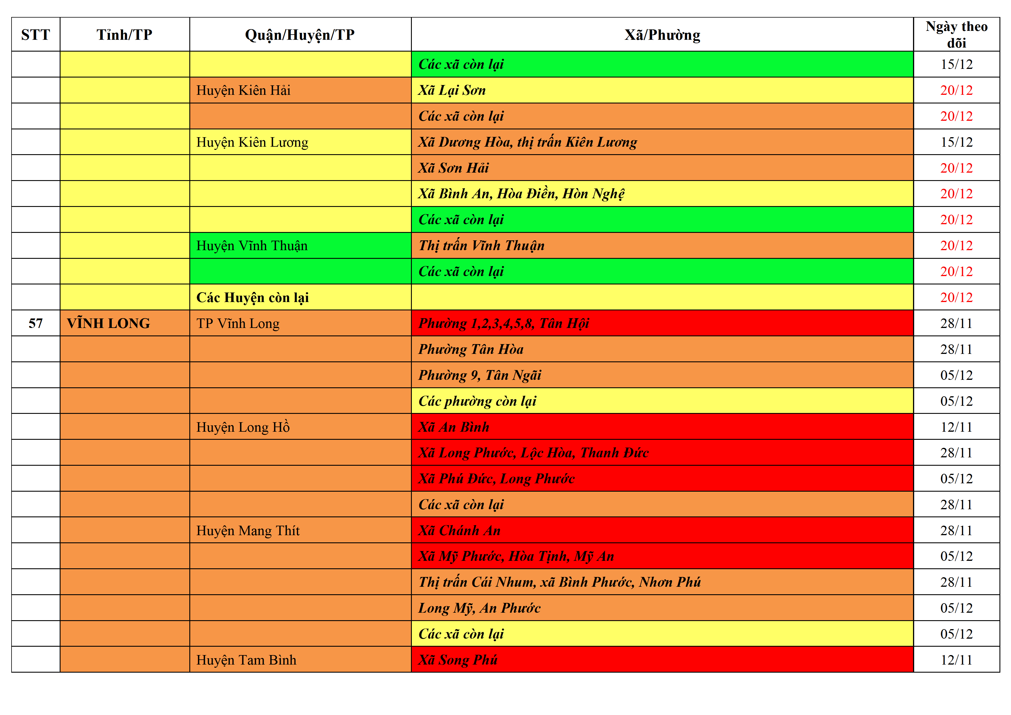 Lưu ý: Các tỉnh, thành phố không có tên trong bảng màu, đi lại bình thường, tuân thủ các biện pháp phòng chống dịch theo chỉ đạo của Bộ Y tế; khai báo y tế, thực hiện nghiêm 5K.