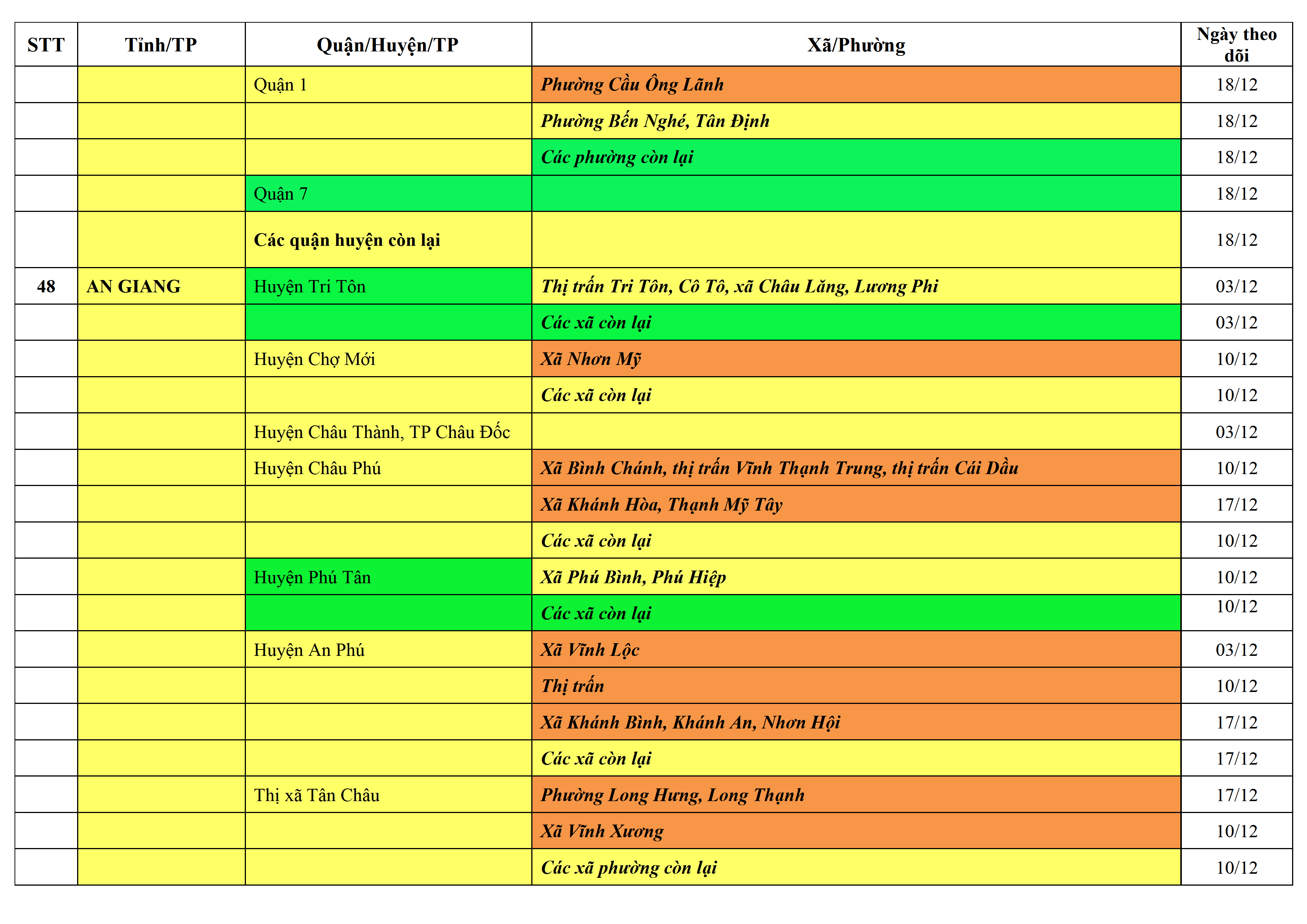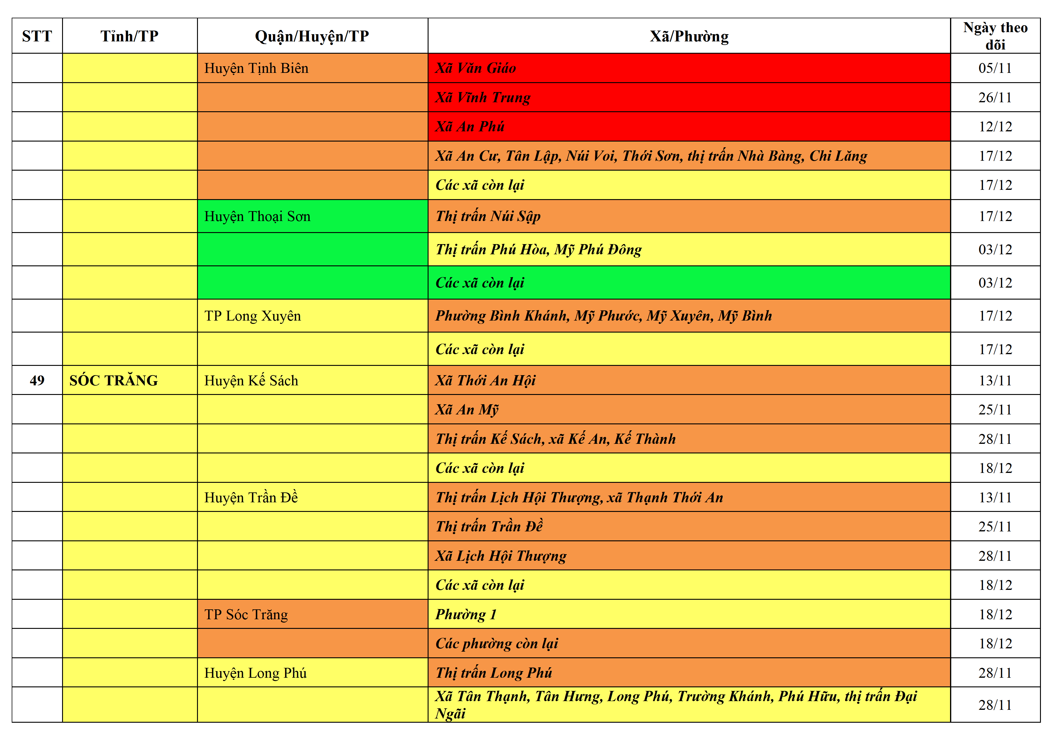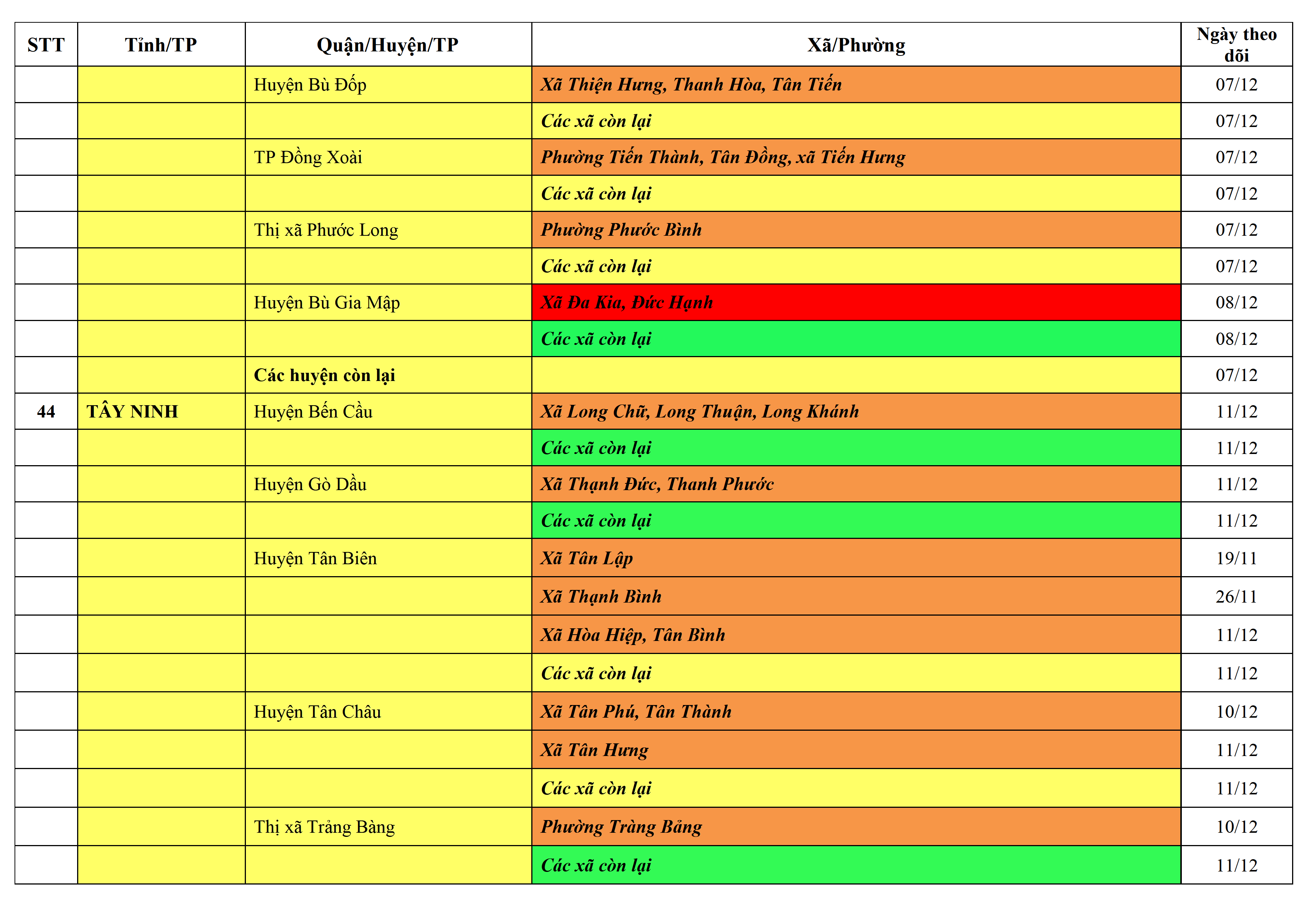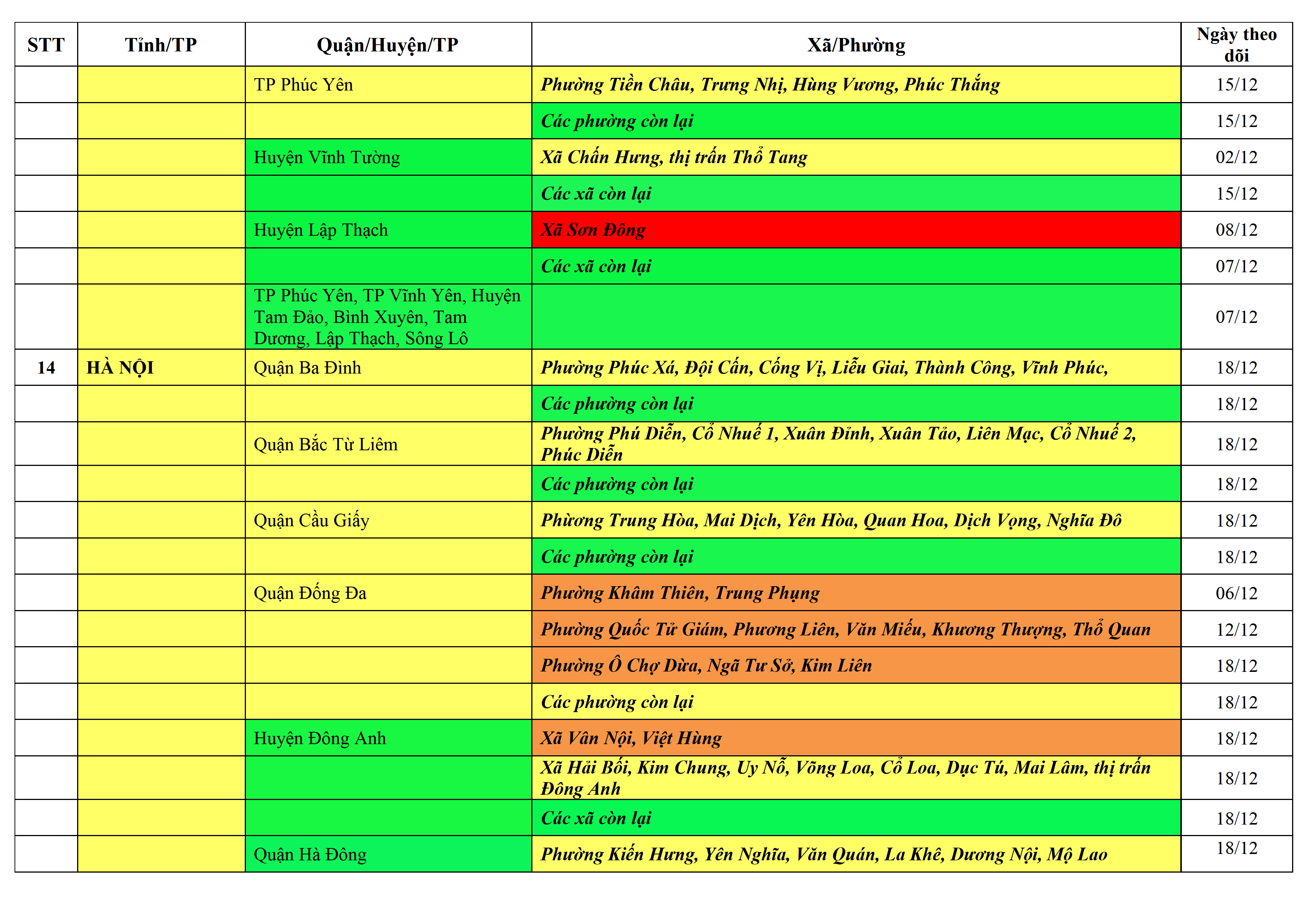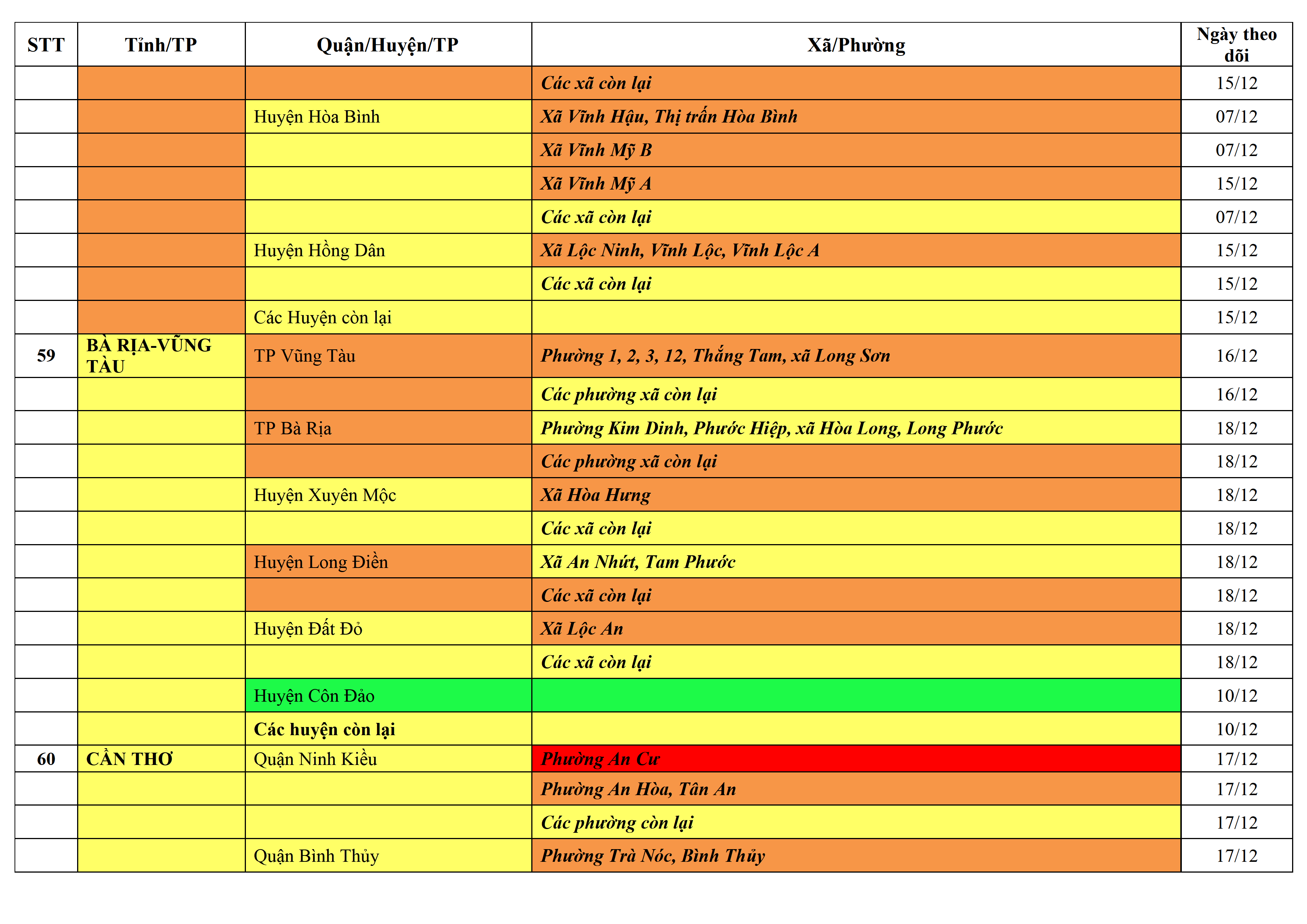 Lưu ý: Các tỉnh, thành phố không có tên trong bảng màu, đi lại bình thường, tuân thủ các biện pháp phòng chống dịch theo chỉ đạo của Bộ Y tế; khai báo y tế, thực hiện nghiêm 5K.