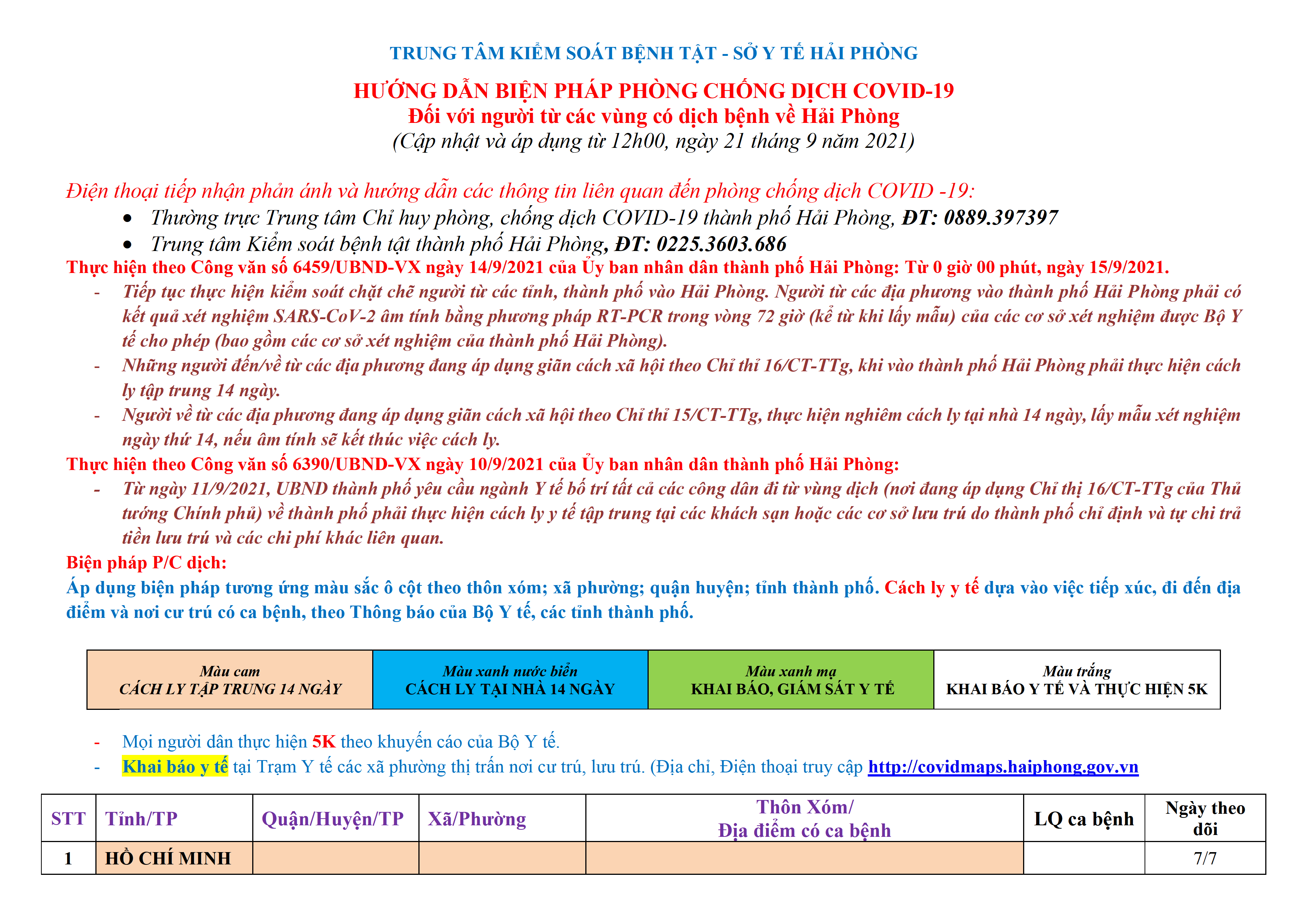 CDC Hải Phòng ban hành hướng dẫn tạm thời biện pháp phòng chống dịch COVID-19 đối với người từ các tỉnh, thành khác về thành phố như sau (thông tin cập nhật vào 12h00’ ngày 21/9/2021):