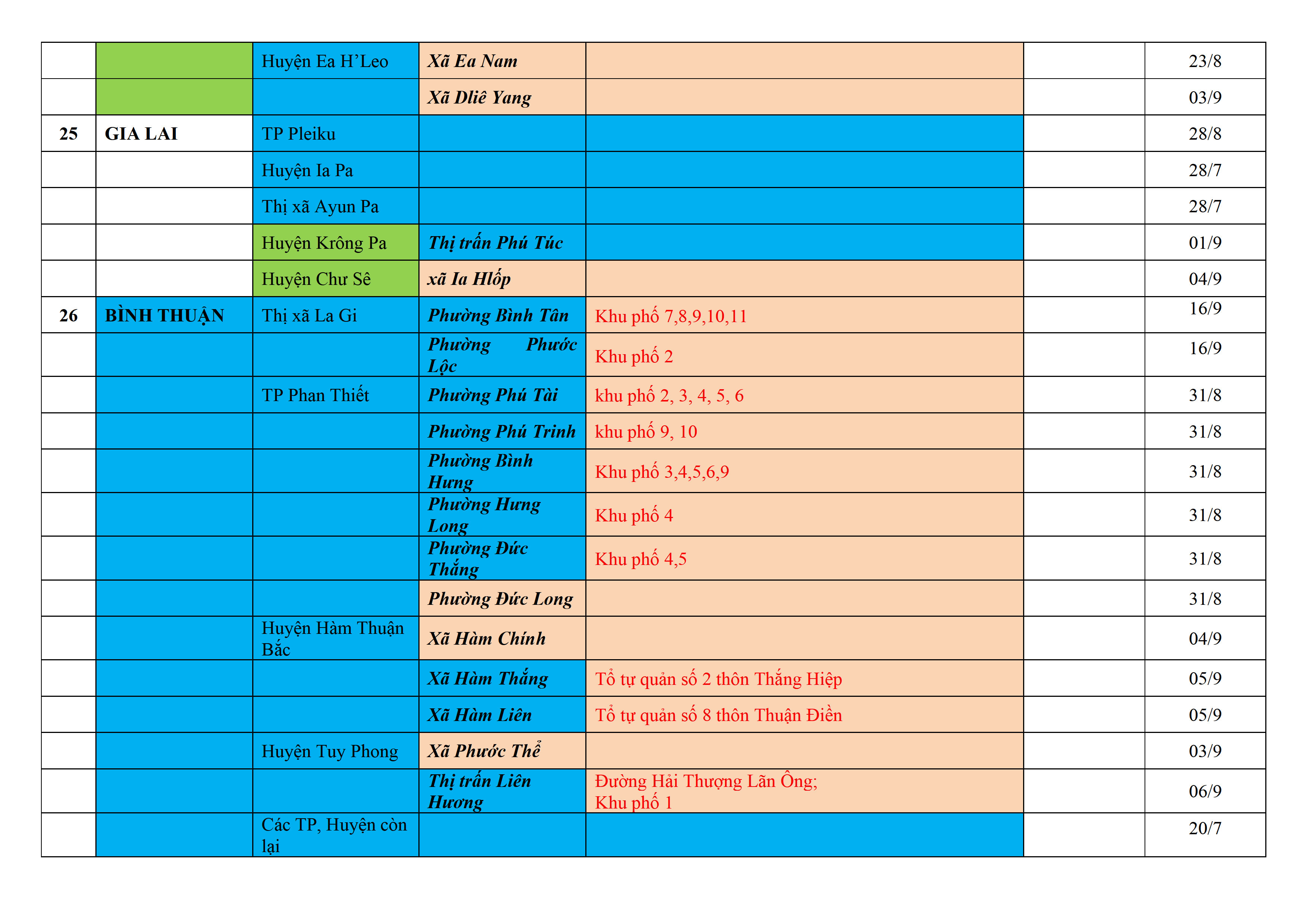 Màu nâu: TẠM DỪNG TIẾP NHẬN; Màu cam: CÁCH LY TẬP TRUNG 14 NGÀY; Màu xanh nước biển: CÁCH LY TẠI NHÀ 14 NGÀY; Màu xanh mạ: KHAI BÁO, GIÁM SÁT Y TẾ; Màu trắng: KHAI BÁO Y TẾ VÀ THỰC HIỆN 5K.