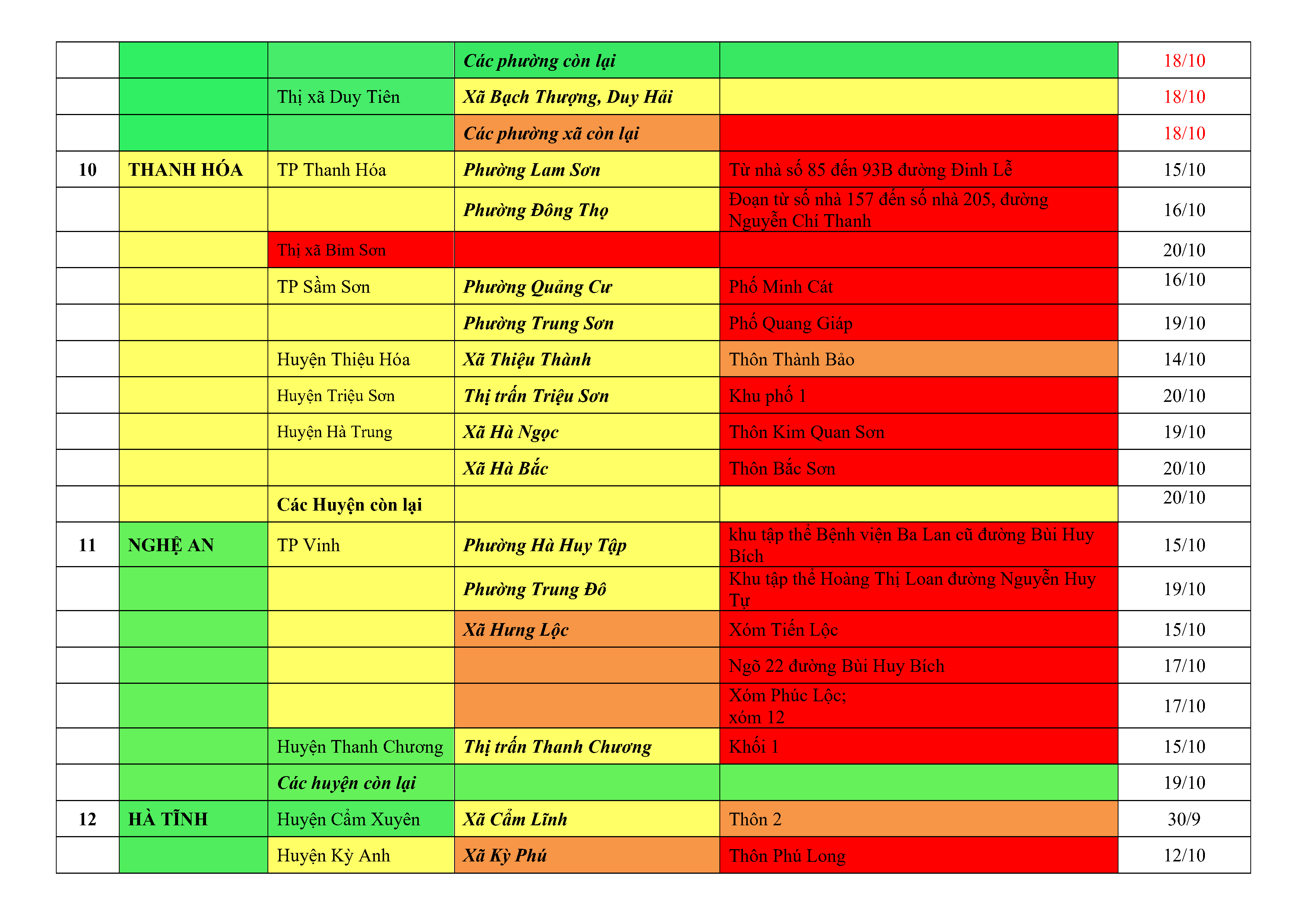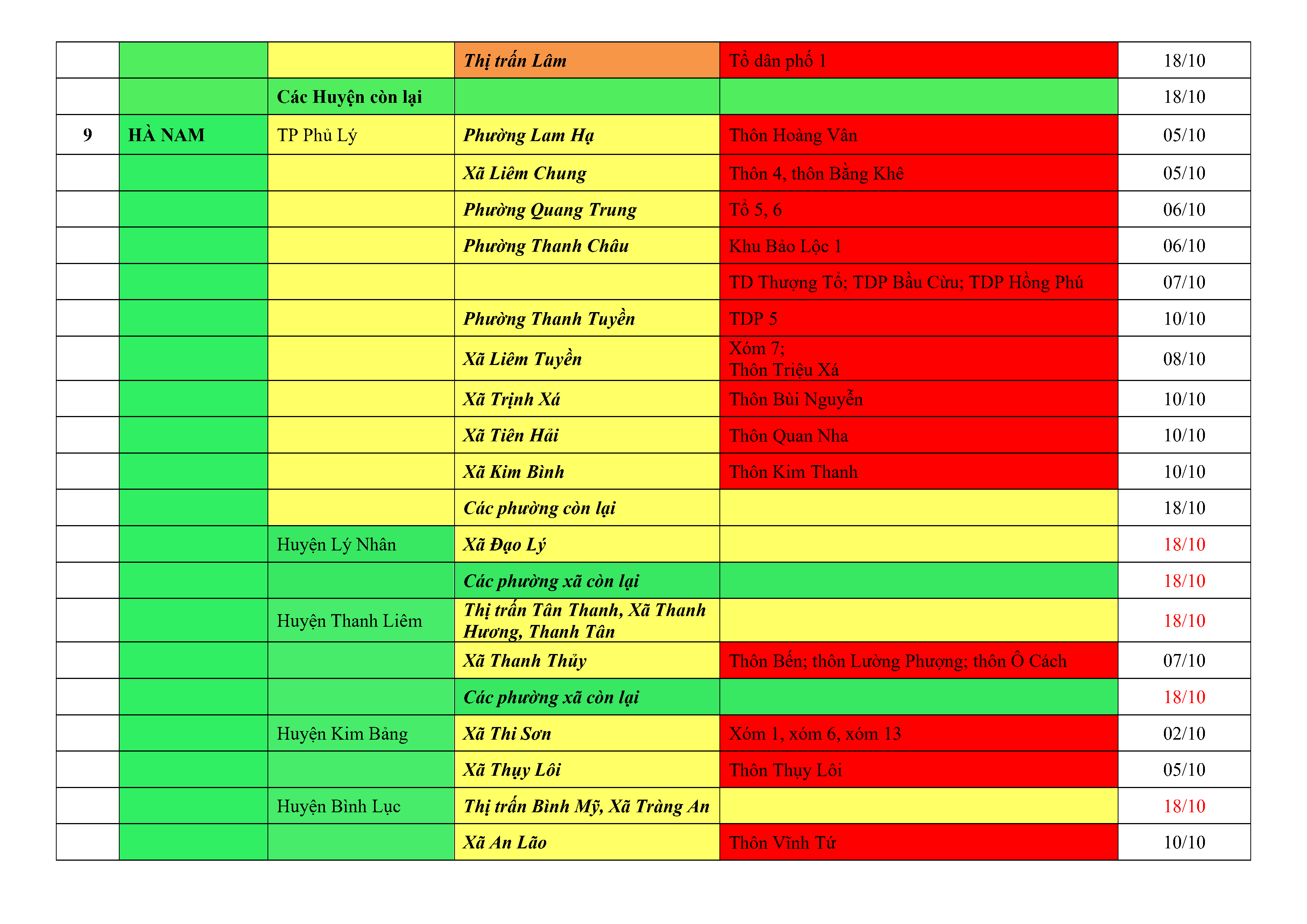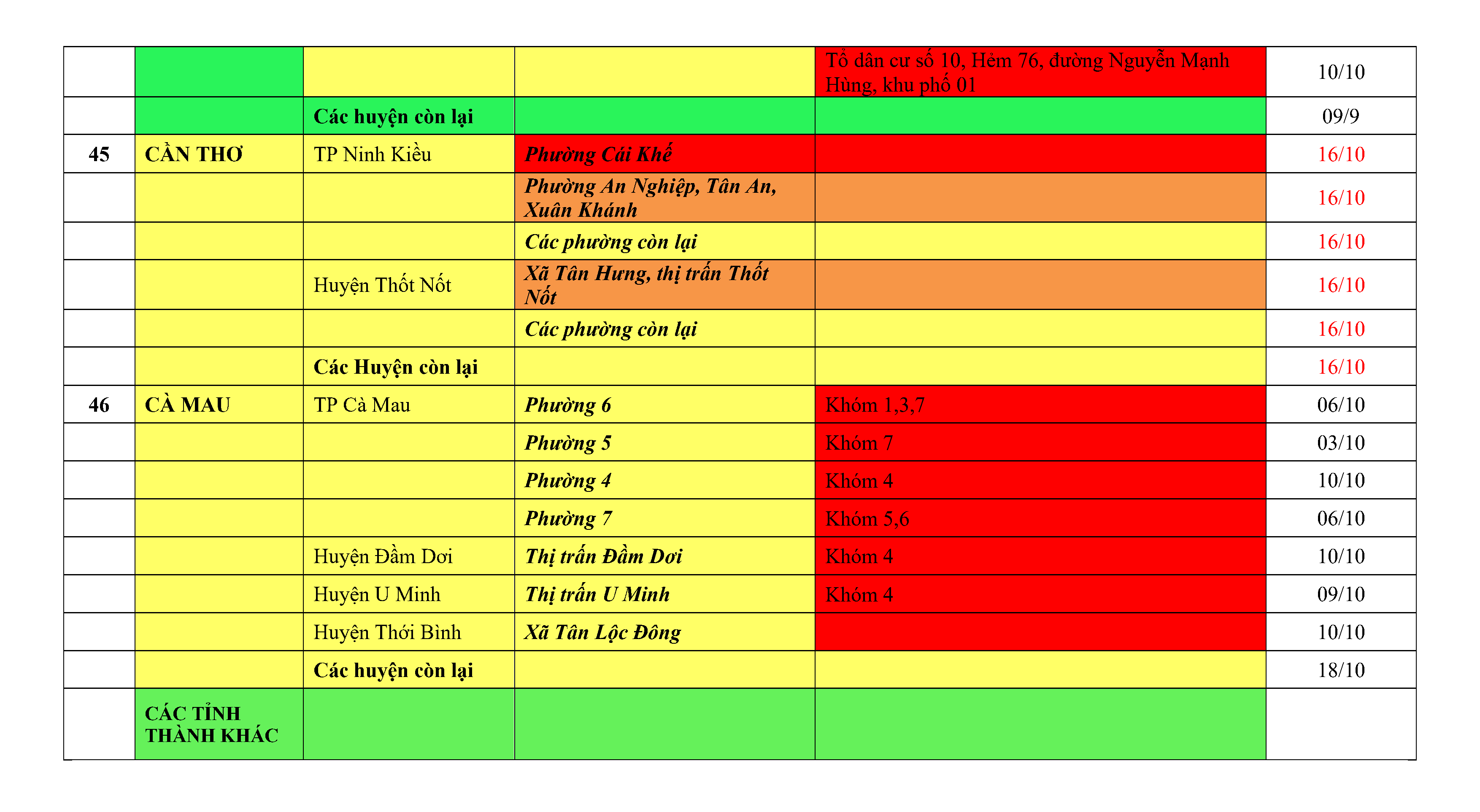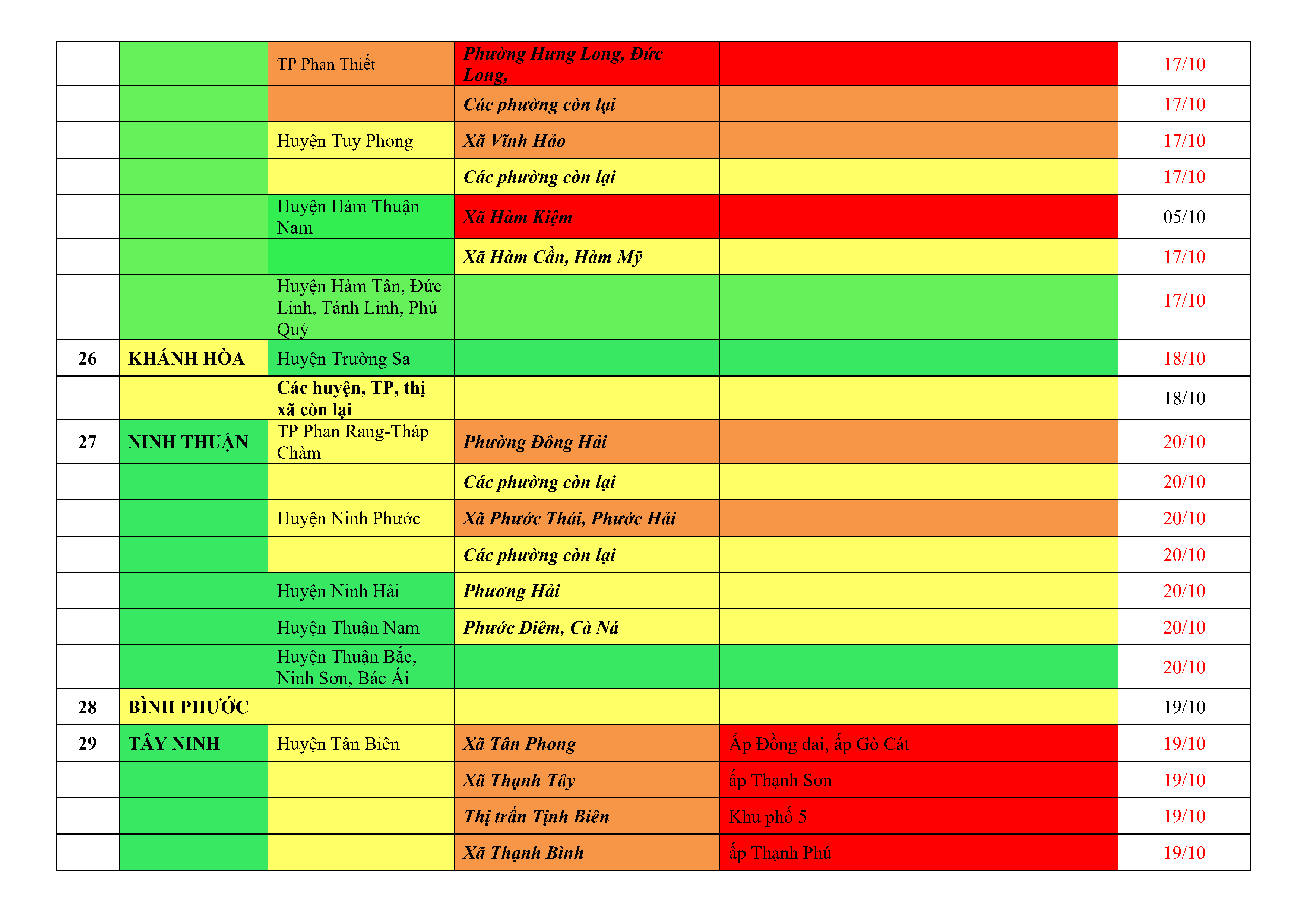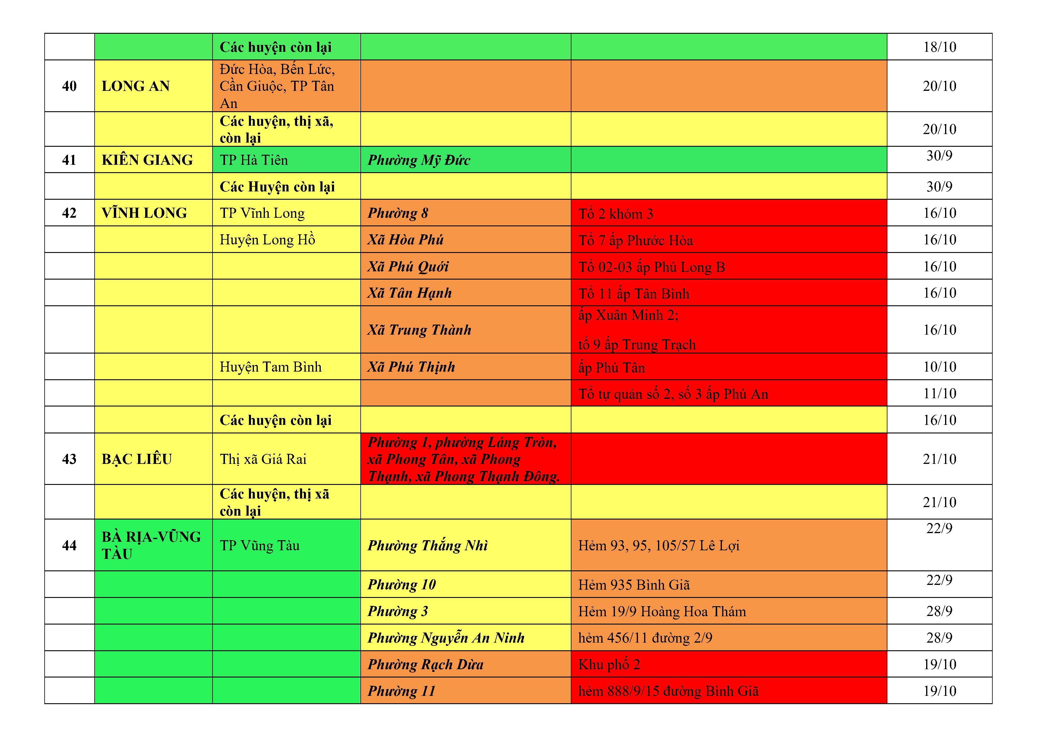 Lưu ý: Các tỉnh, thành phố không có tên trong bảng màu, đi lại bình thường, tuân thủ các biện pháp phòng chống dịch theo chỉ đạo của Bộ Y tế; khai bào y tế, thực hiện nghiêm 5K.