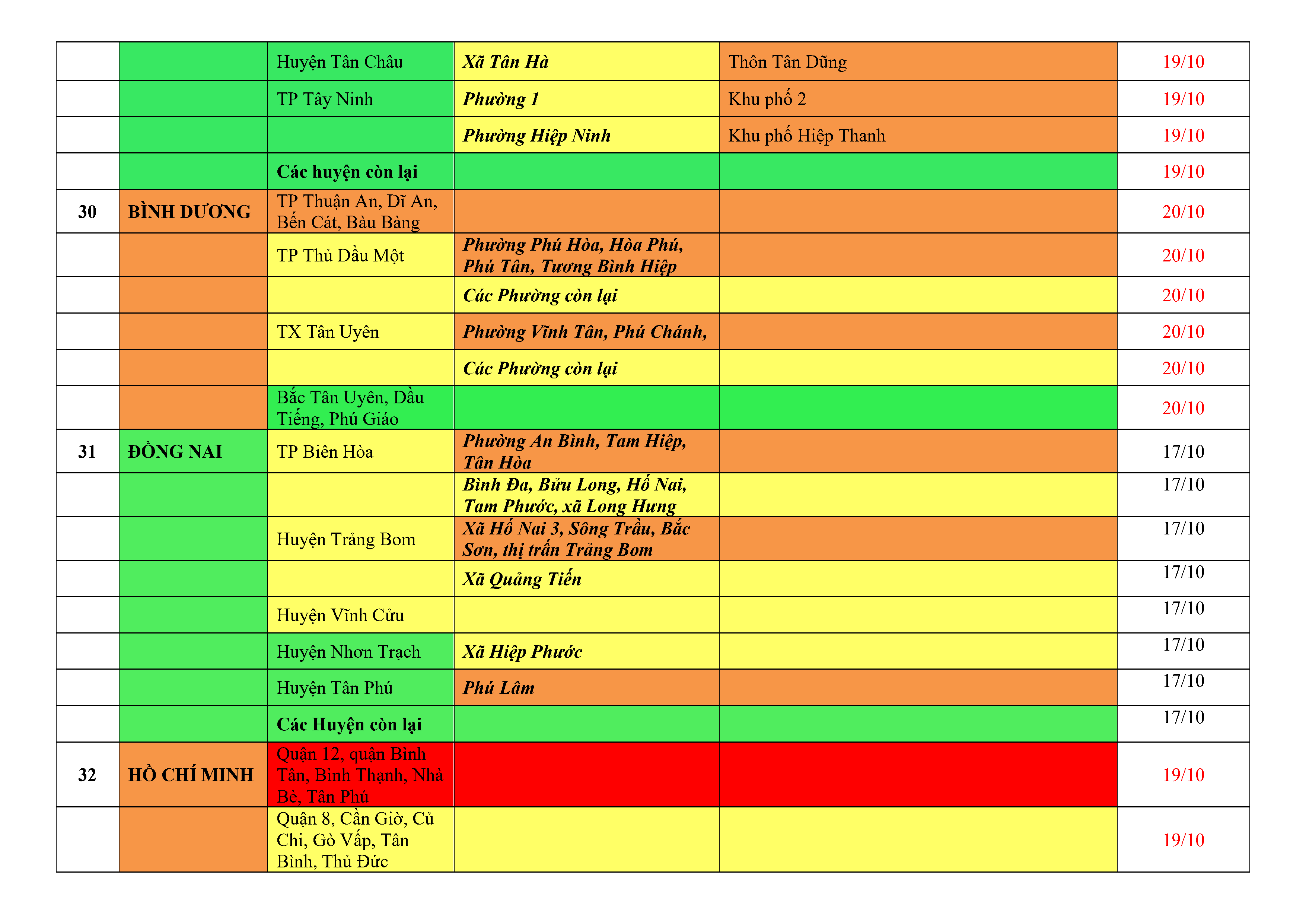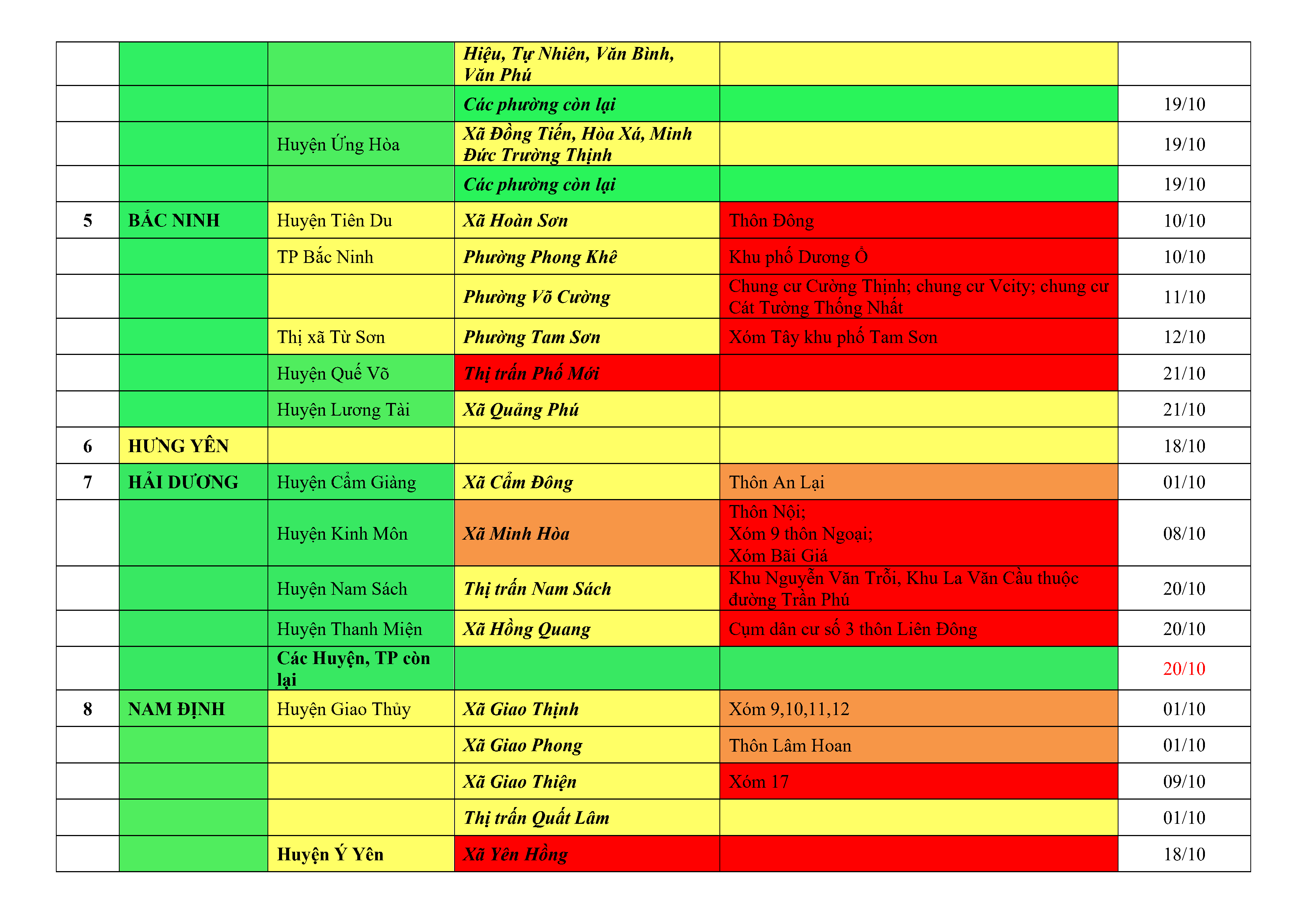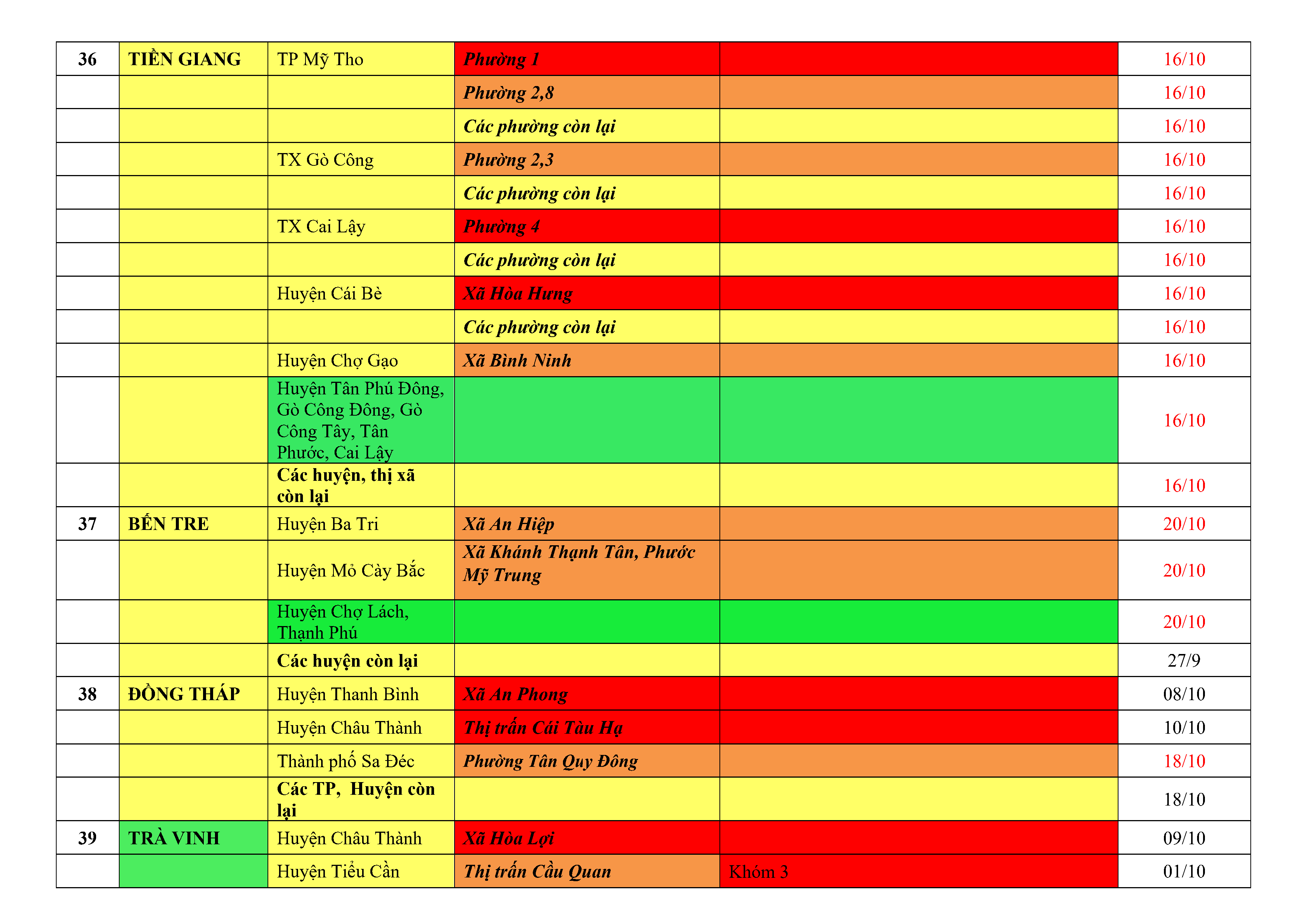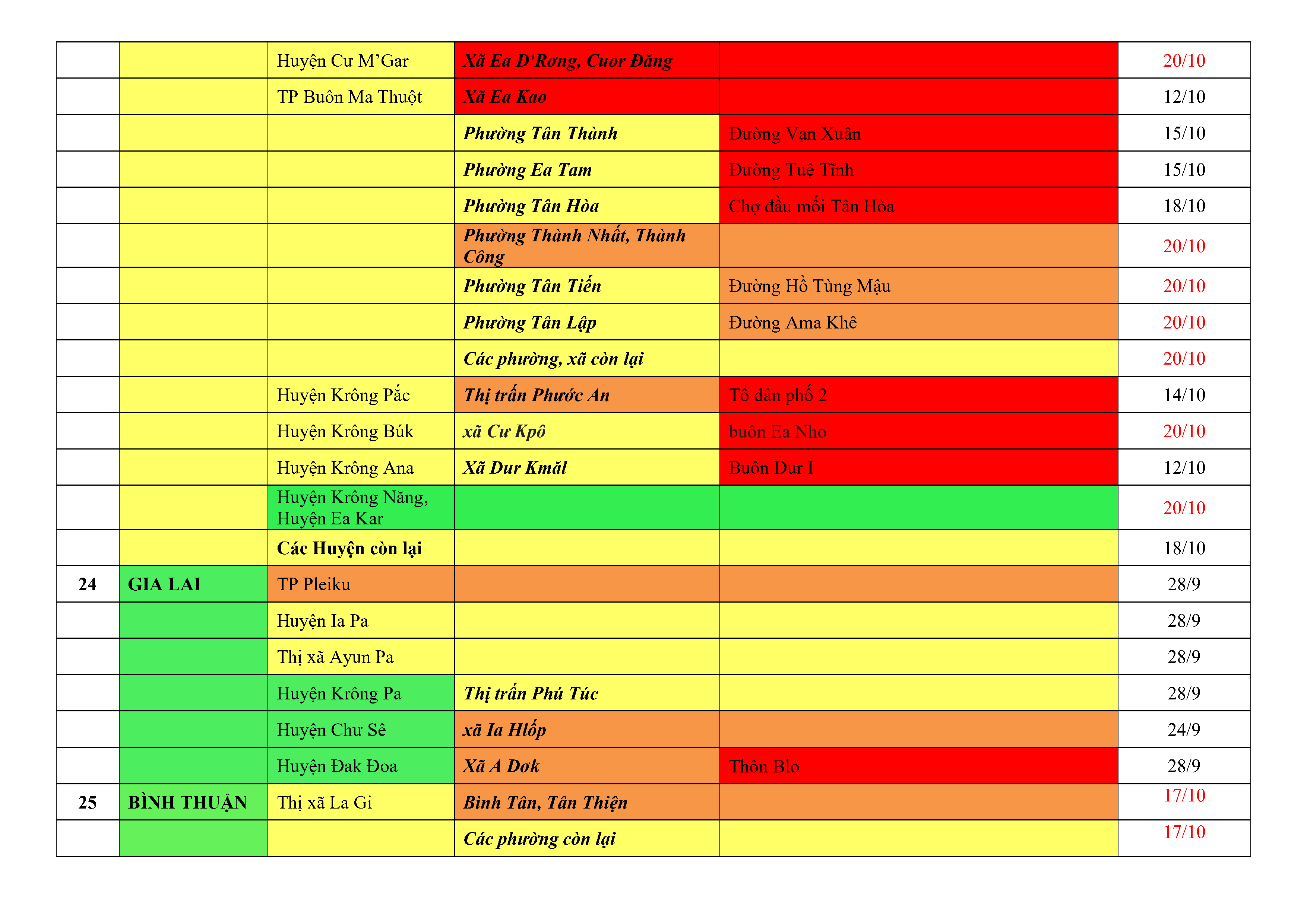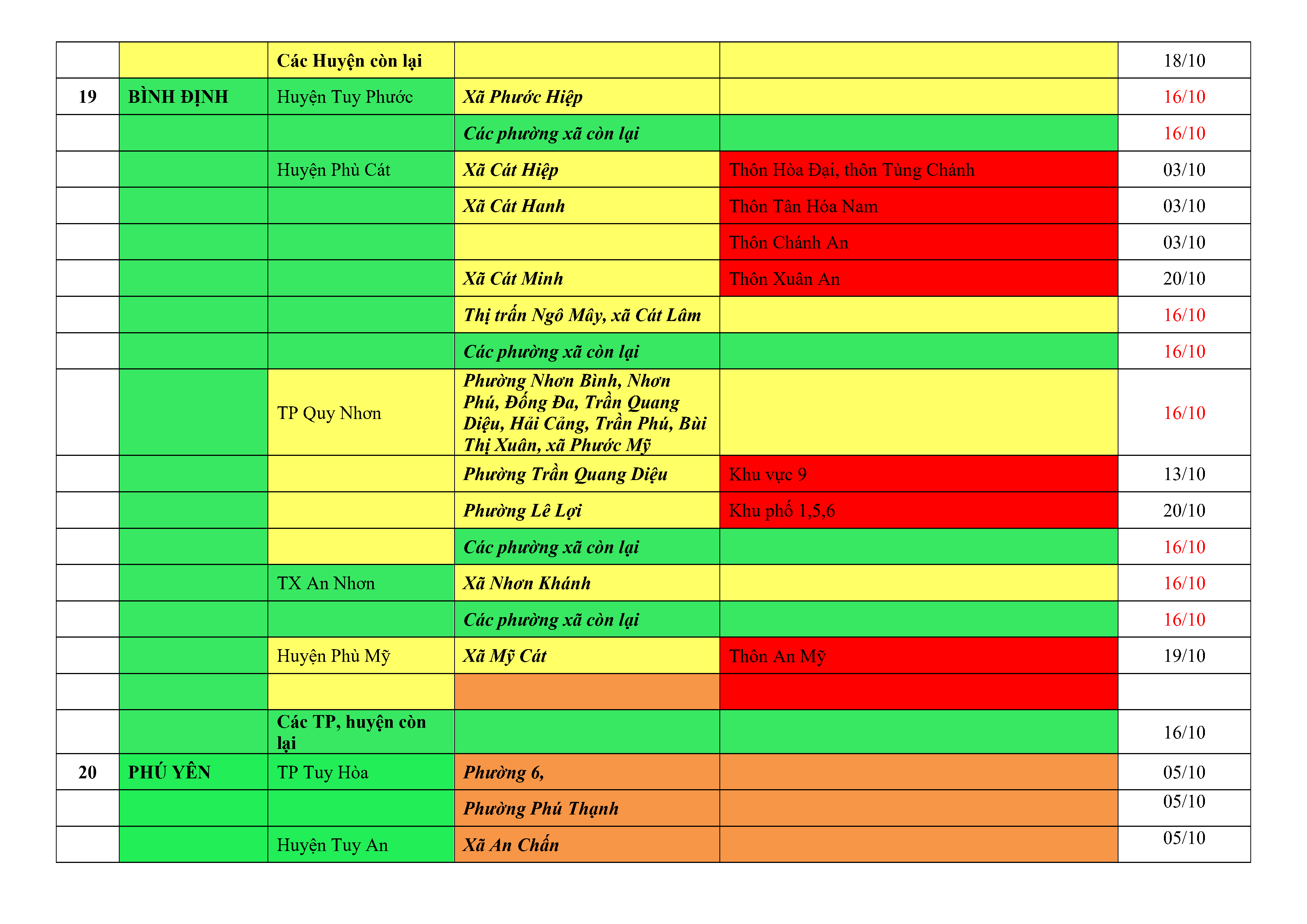Lưu ý: Các tỉnh, thành phố không có tên trong bảng màu, đi lại bình thường, tuân thủ các biện pháp phòng chống dịch theo chỉ đạo của Bộ Y tế; khai bào y tế, thực hiện nghiêm 5K.