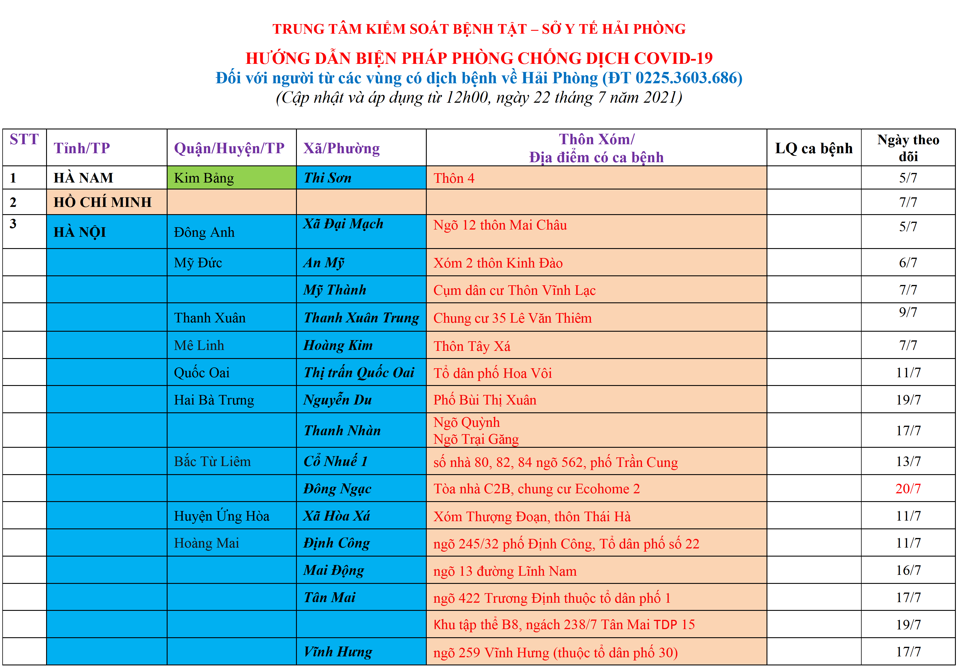. Áp dụng các biện pháp Cách ly y tế đối với những người đến và trở về Hải Phòng, từ các vùng có ca bệnh tại cộng đồng theo Bảng trên.