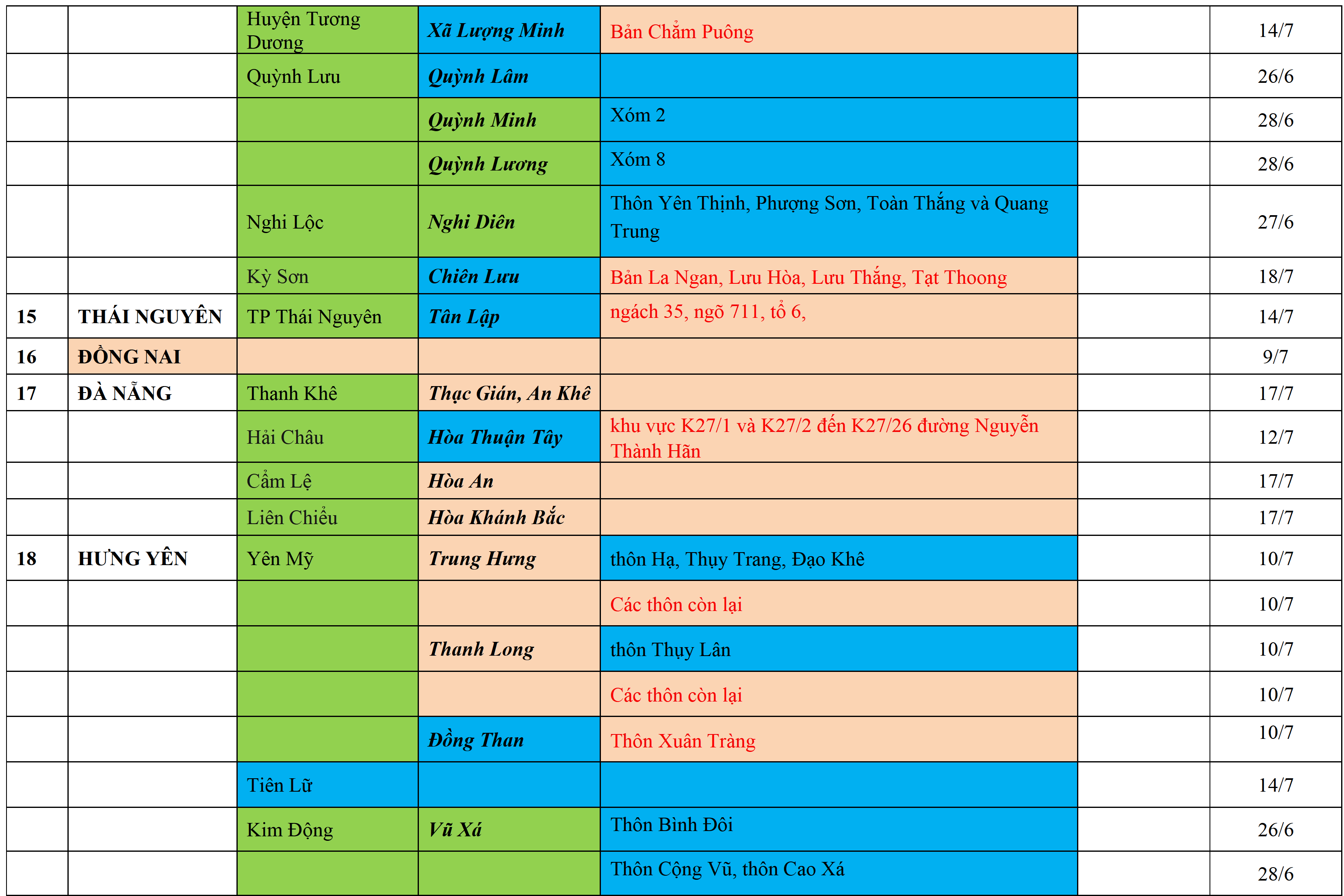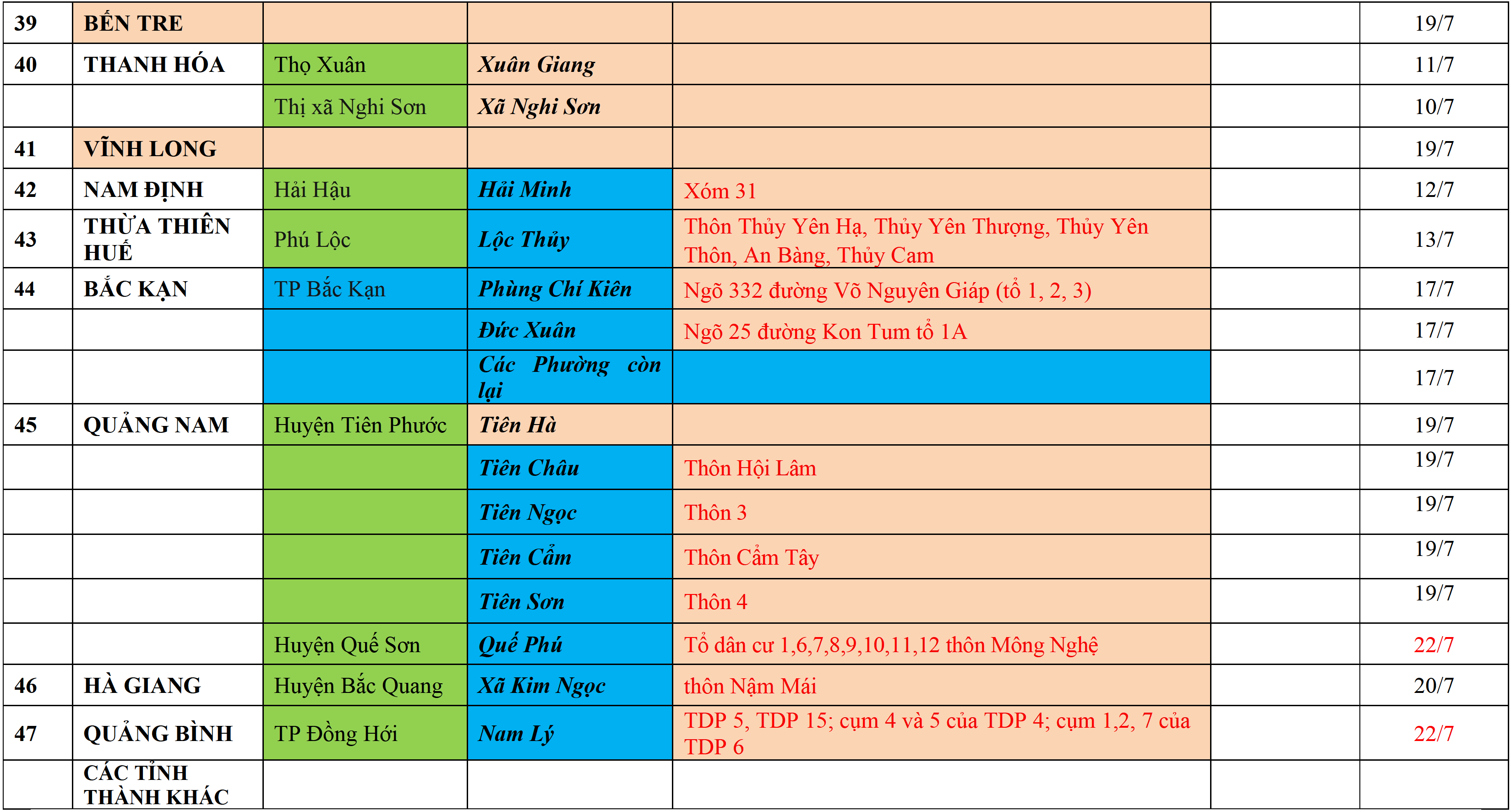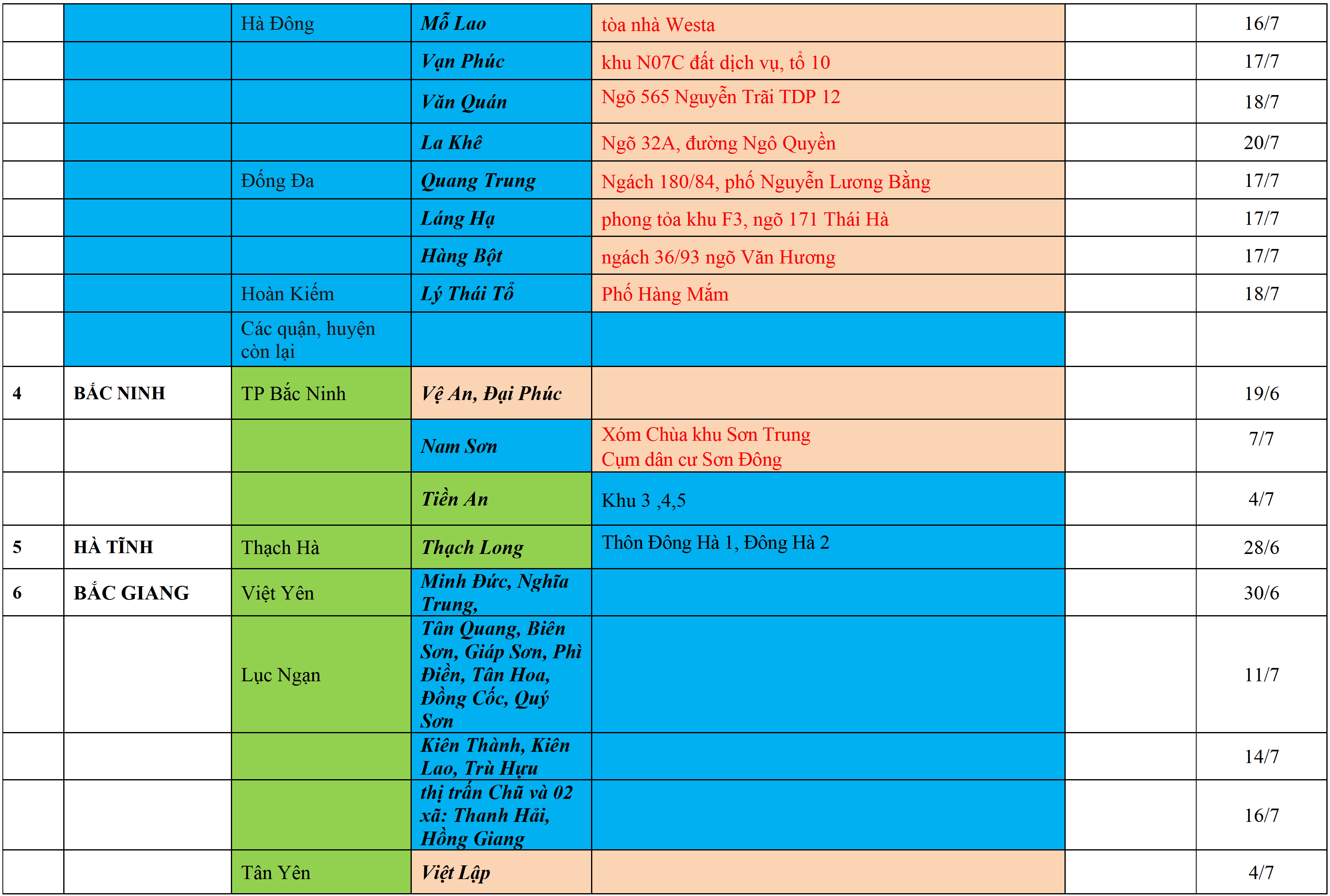 . Áp dụng biện pháp tương ứng màu sắc ô cột theo thôn xóm; xã phường; quận huyện; tỉnh thành phố. Cách ly y tế dựa vào việc tiếp xúc, đi đến địa điểm và nơi cư trú có ca bệnh, theo Thông báo của Bộ Y tế, các tỉnh thành phố.