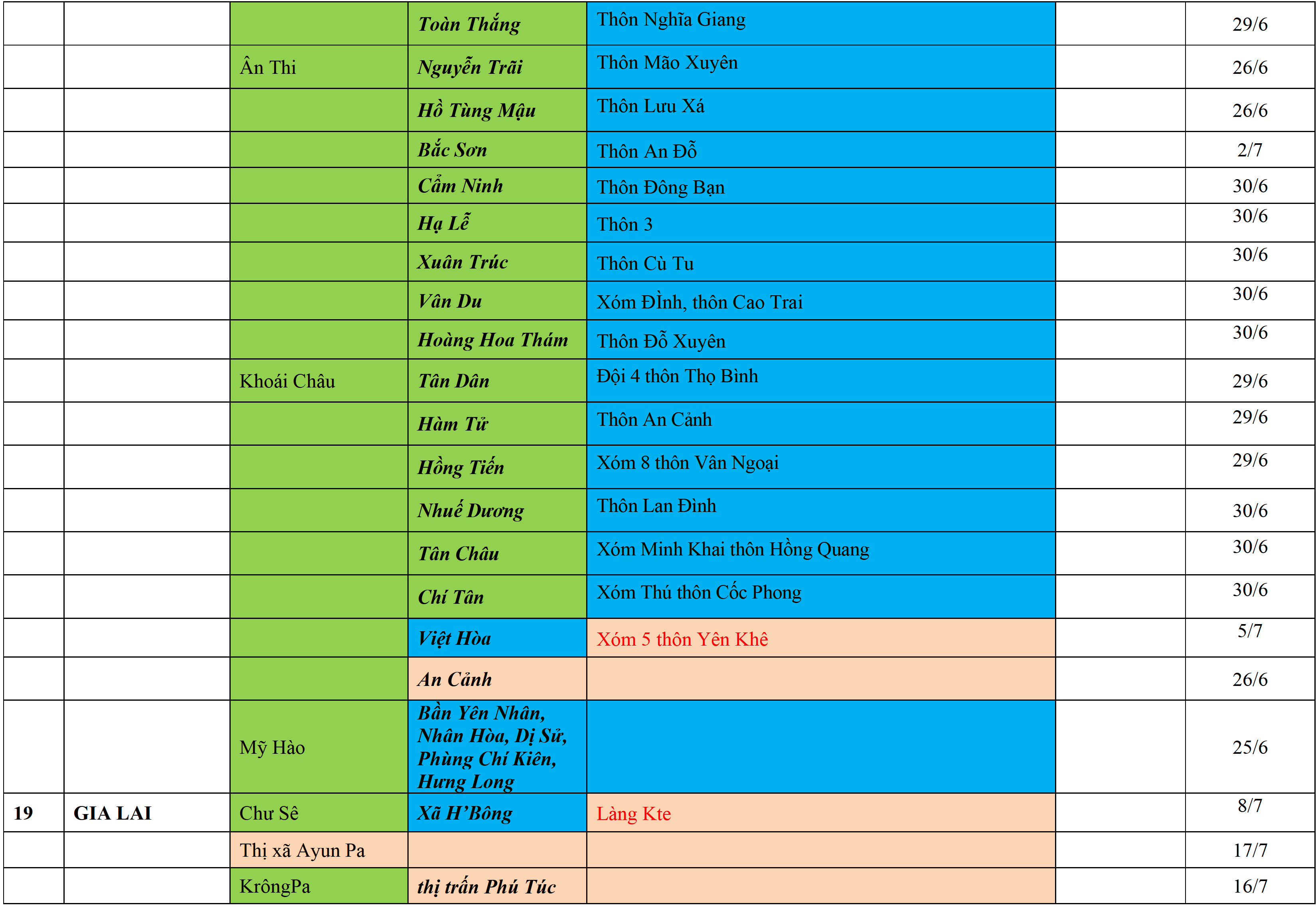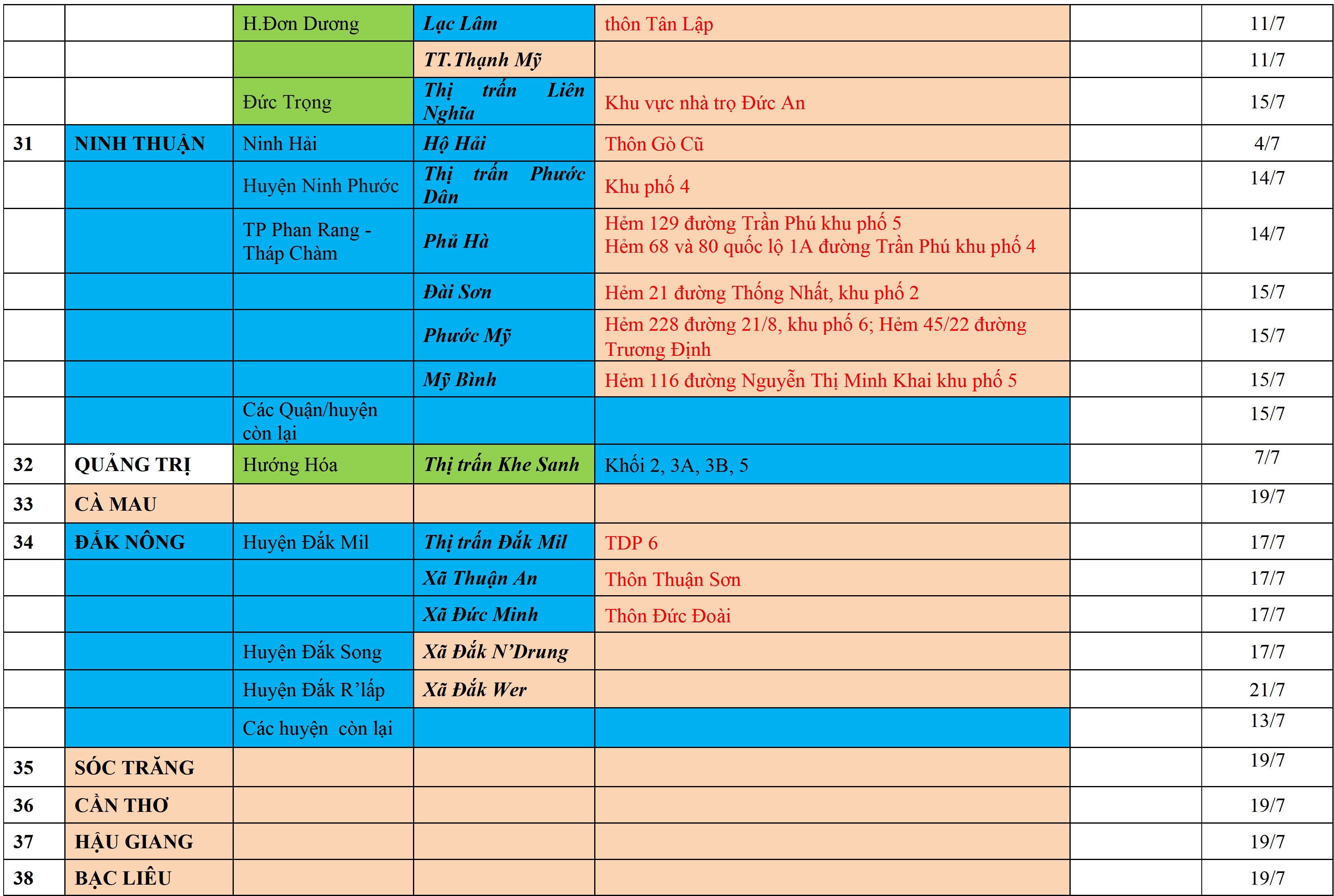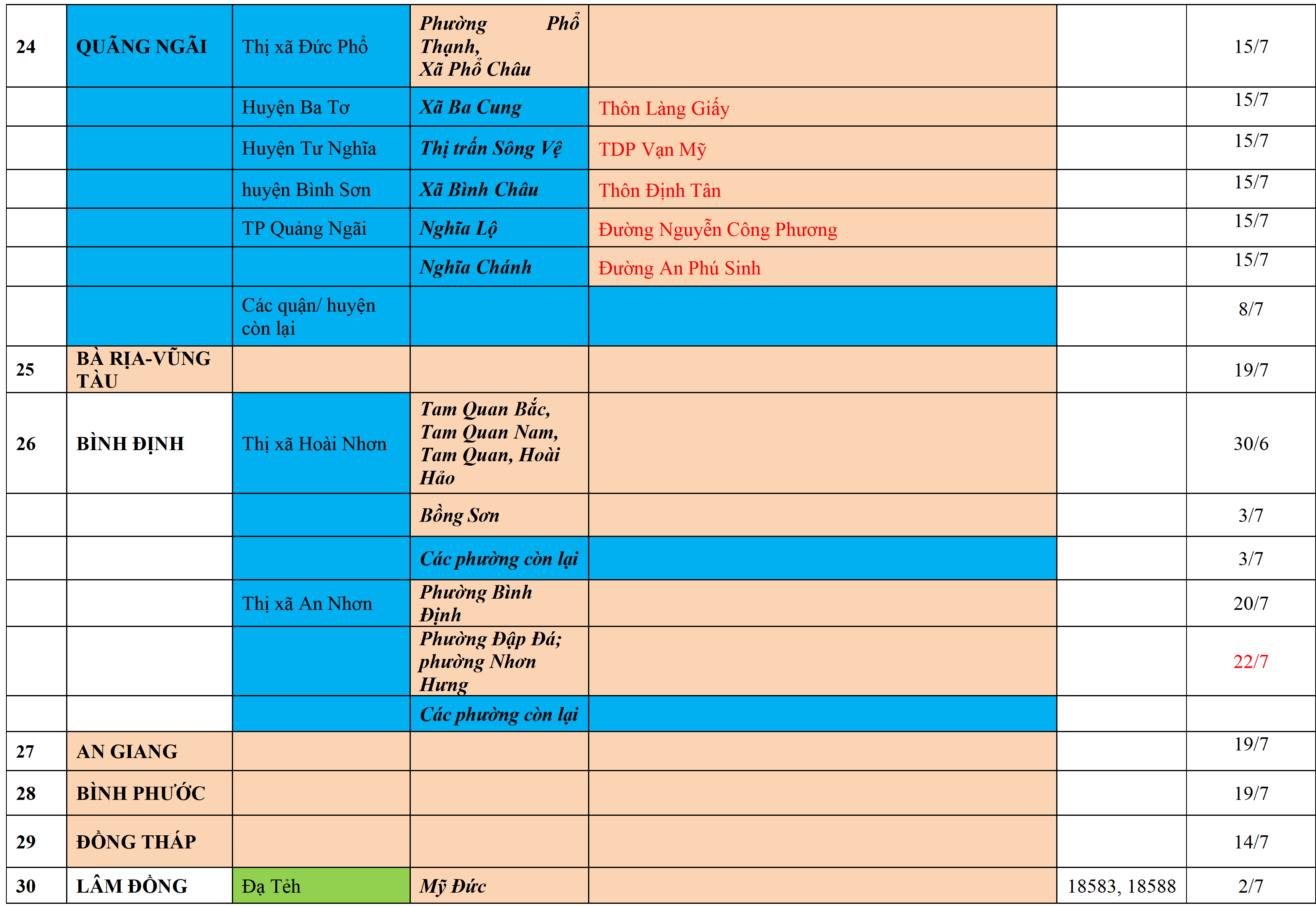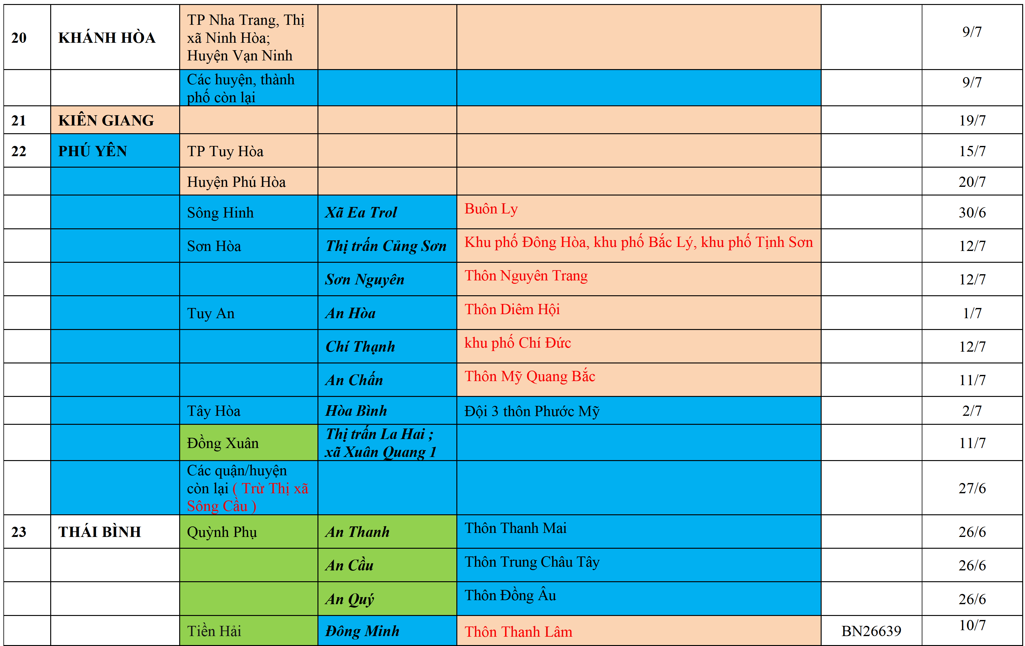 . Áp dụng biện pháp tương ứng màu sắc ô cột theo thôn xóm; xã phường; quận huyện; tỉnh thành phố. Cách ly y tế dựa vào việc tiếp xúc, đi đến địa điểm và nơi cư trú có ca bệnh, theo Thông báo của Bộ Y tế, các tỉnh thành phố.