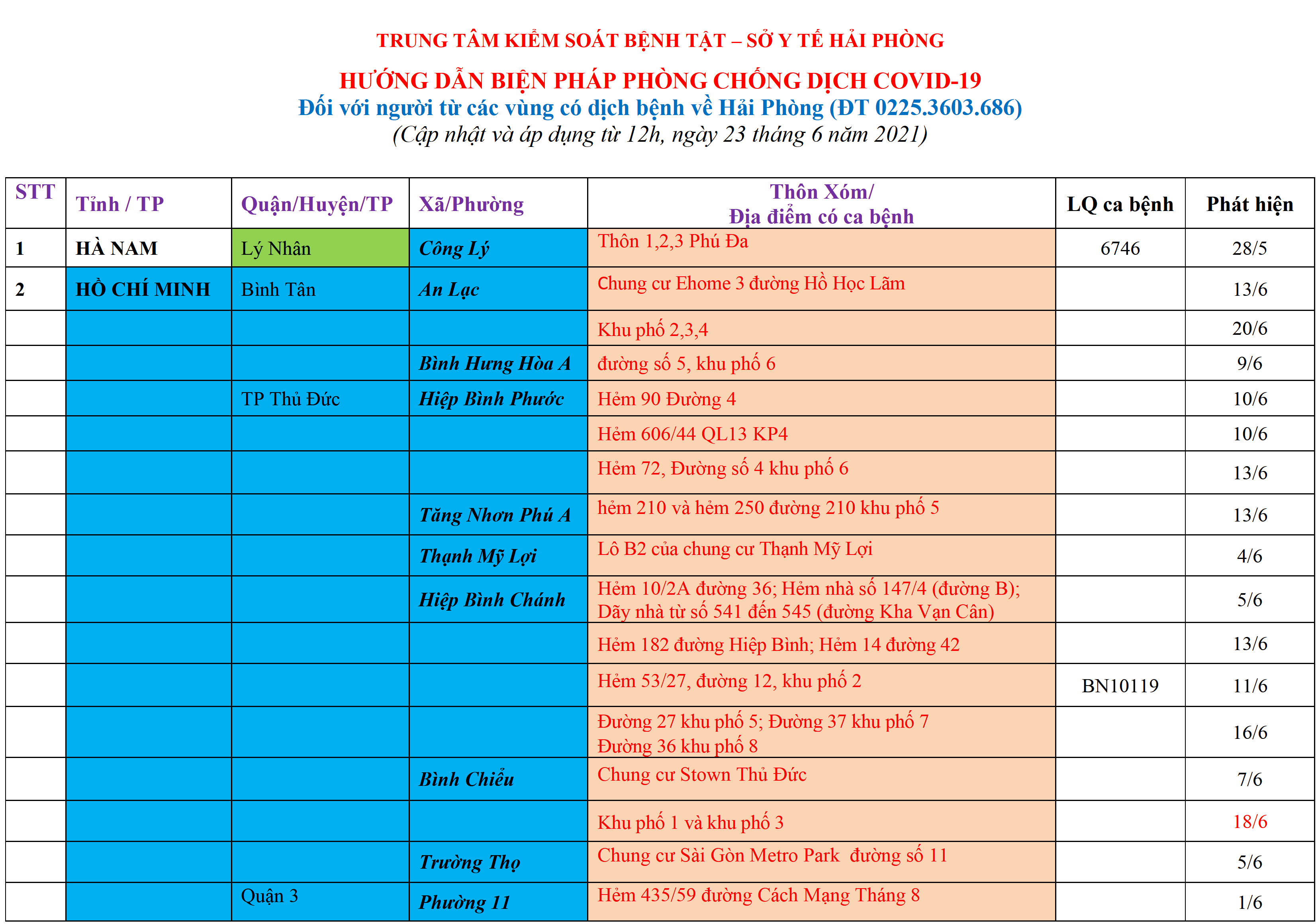Trung tâm kiểm soát bệnh tật Hải Phòng hướng dẫn tạm thời biện pháp phòng chống dịch COVID-19 đối với người từ các tỉnh, thành khác về thành phố như sau (thông tin cập nhật vào 12h00’ ngày 23/6/2021):