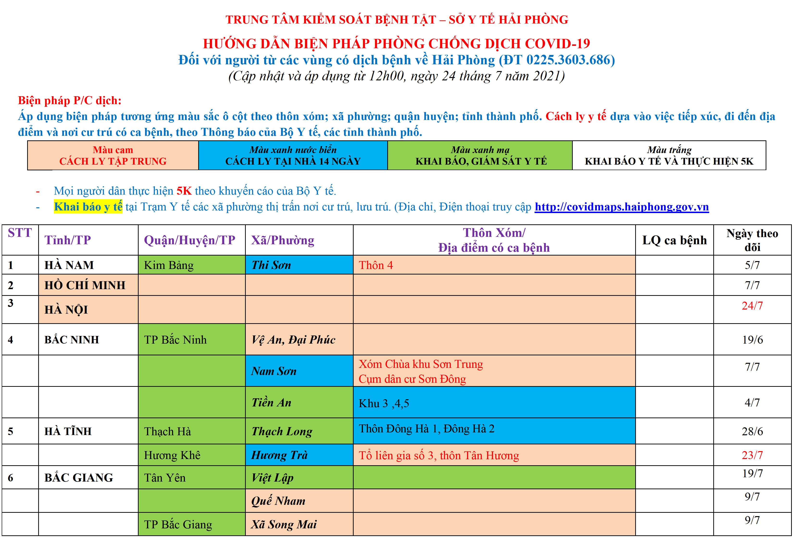 CDC Hải Phòng ban hành hướng dẫn tạm thời biện pháp phòng chống dịch COVID-19 đối với người từ các tỉnh, thành khác về thành phố như sau (thông tin cập nhật vào 12h00’ ngày 24/7/2021):
