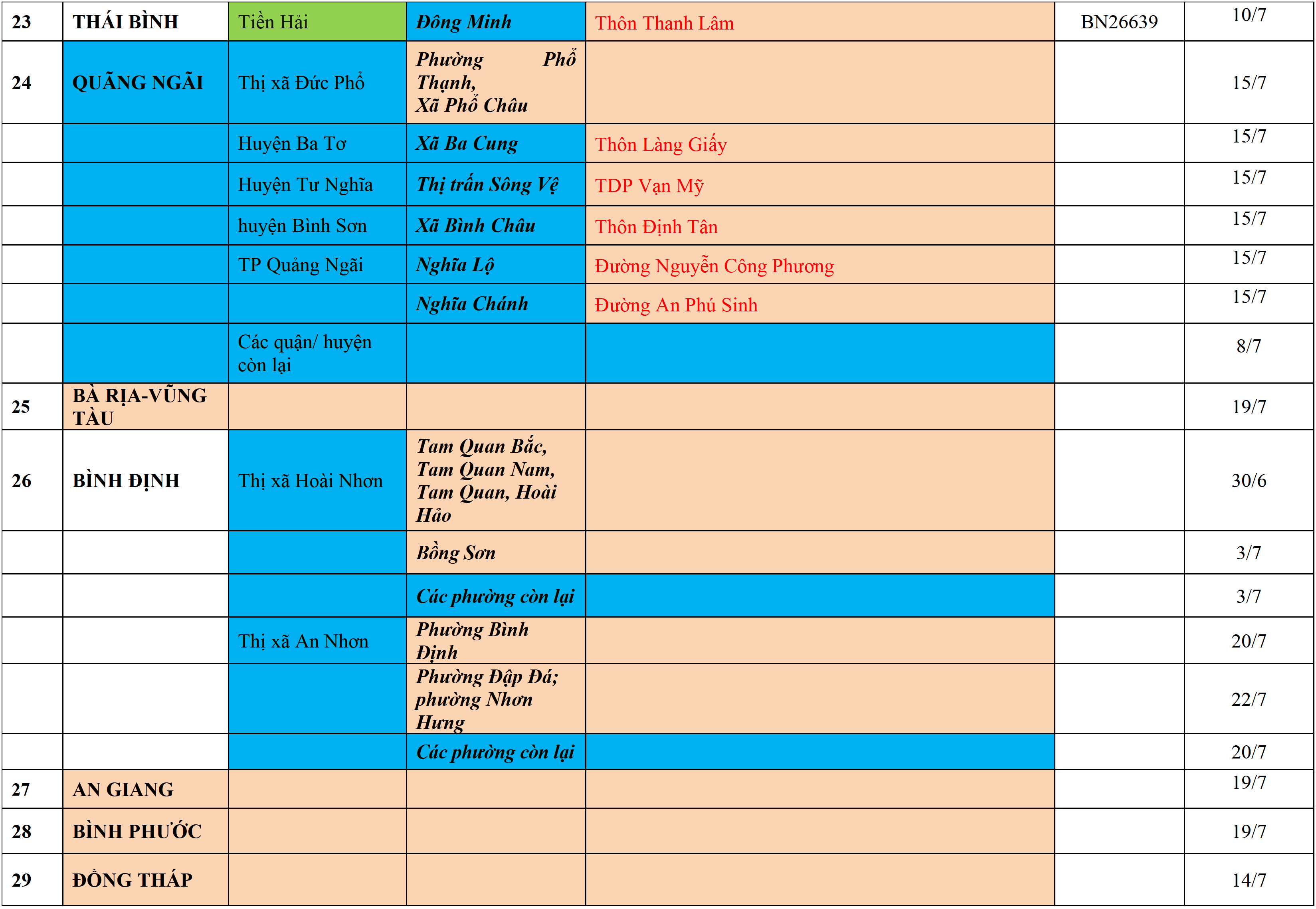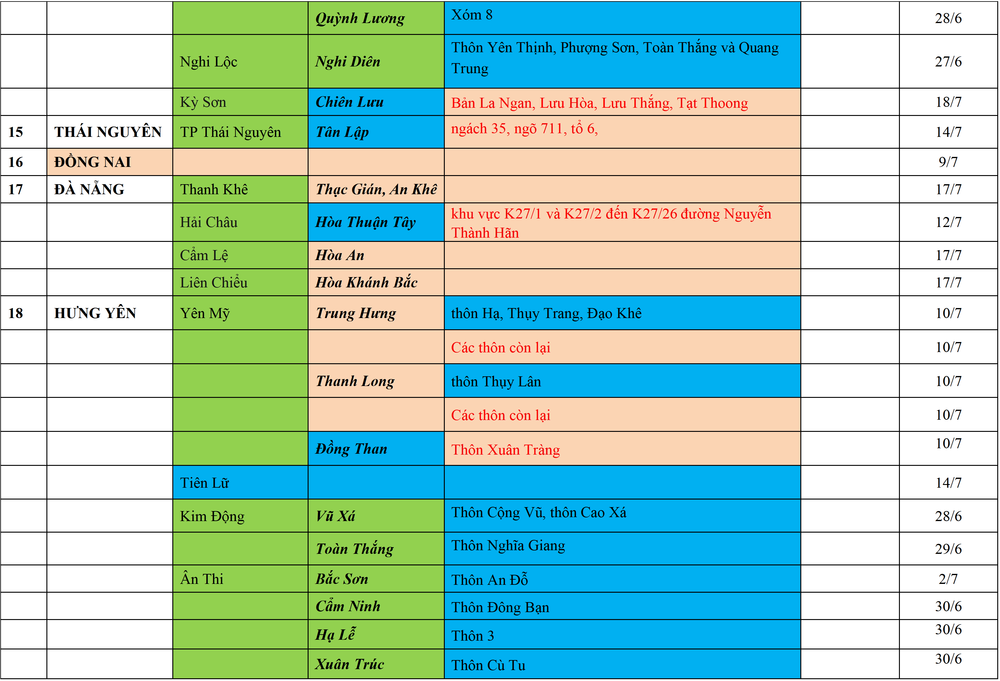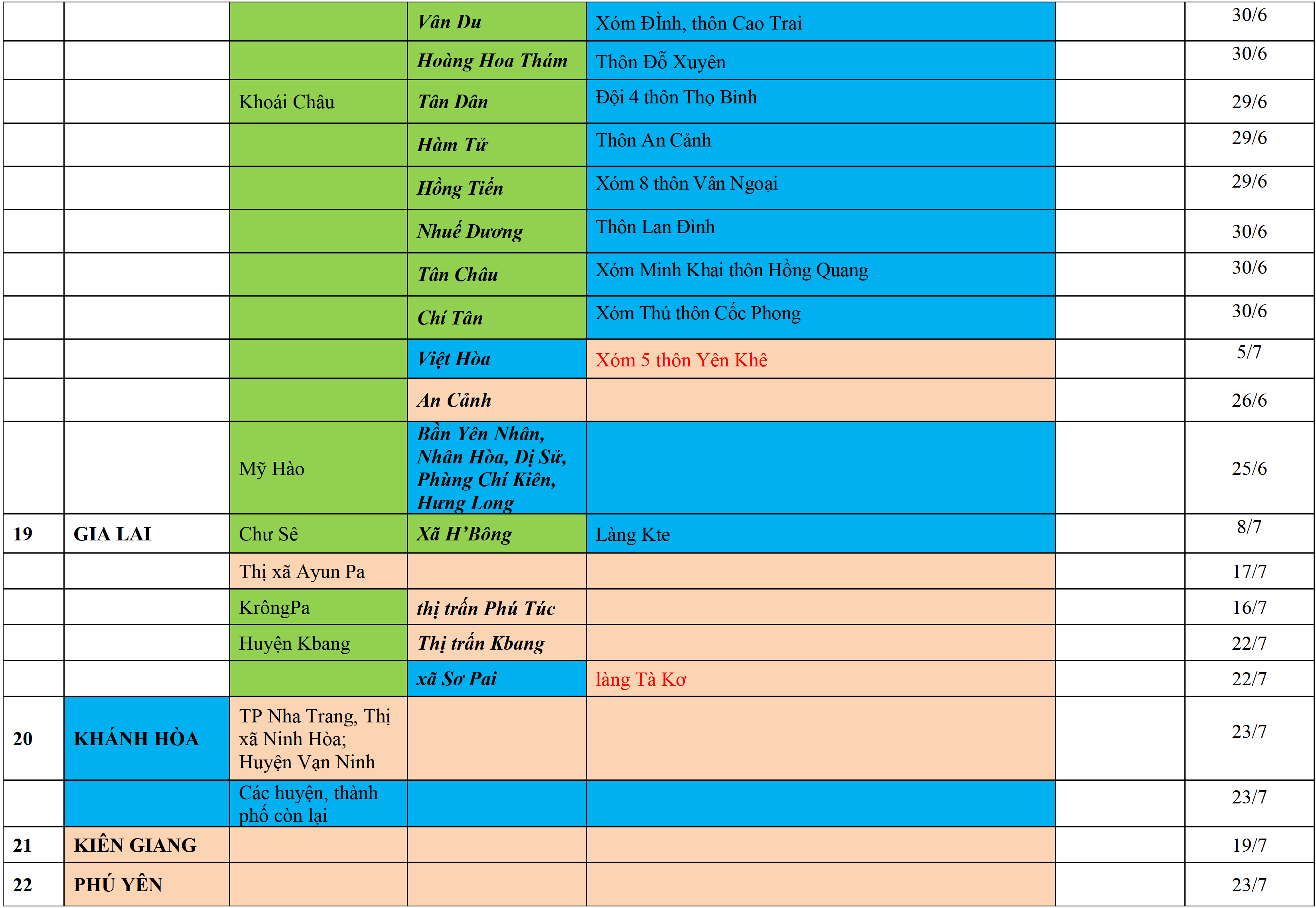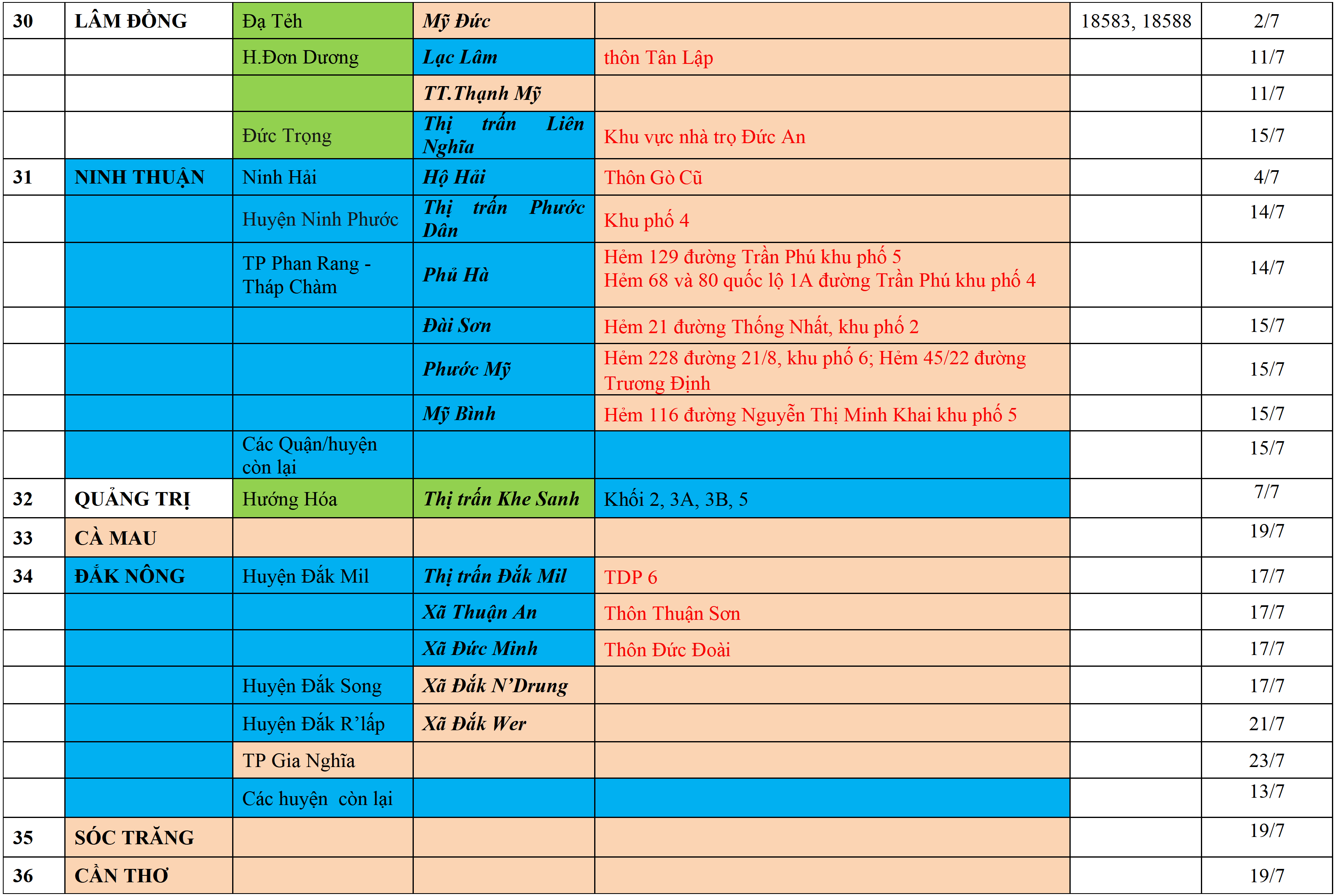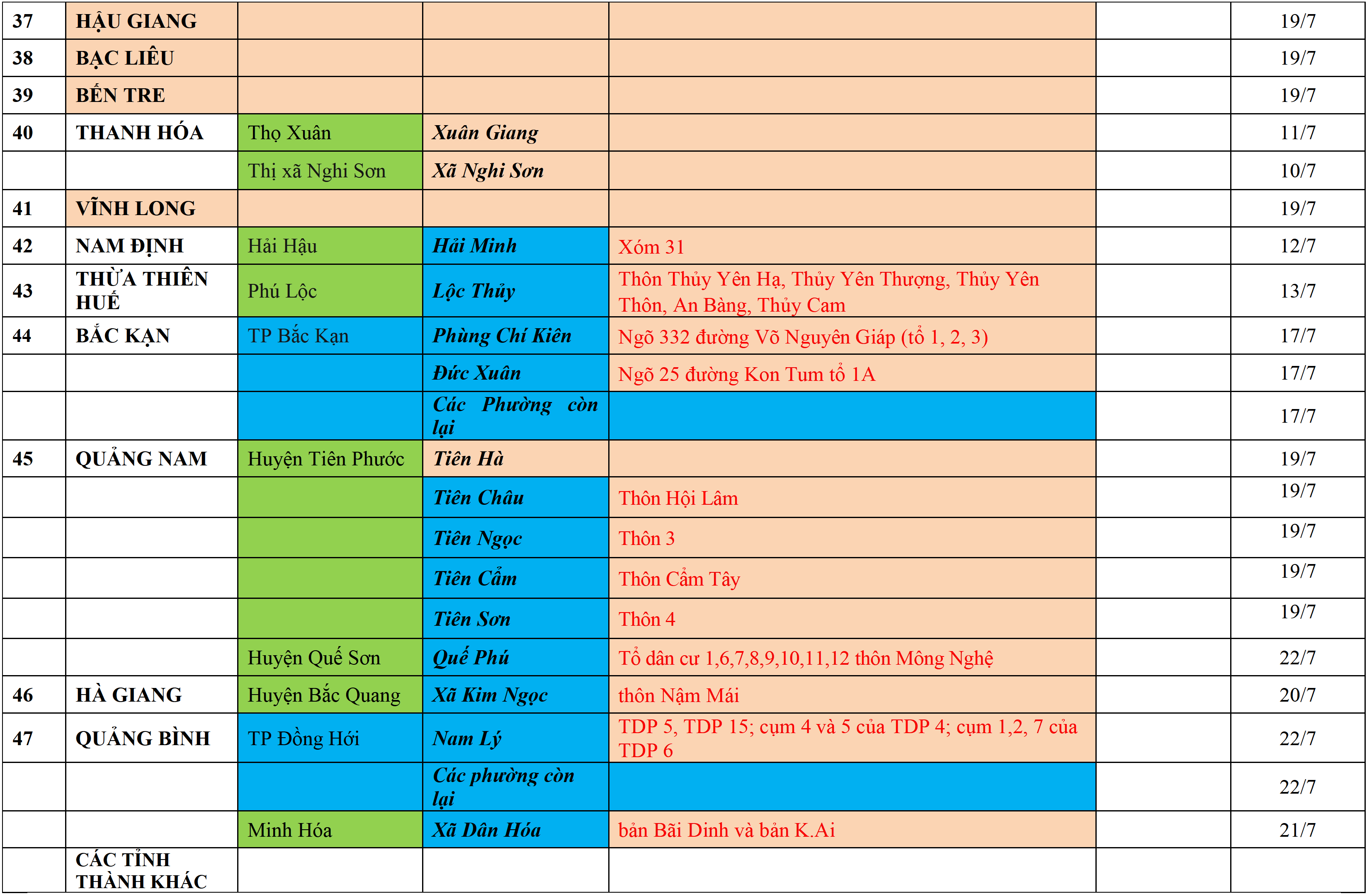 Màu cam: CÁCH LY TẬP TRUNG; Màu xanh nước biển: CÁCH LY TẠI NHÀ 14 NGÀY; Màu xanh mạ: KHAI BÁO, GIÁM SÁT Y TẾ; Màu trắng: KHAI BÁO Y TẾ VÀ THỰC HIỆN 5K.