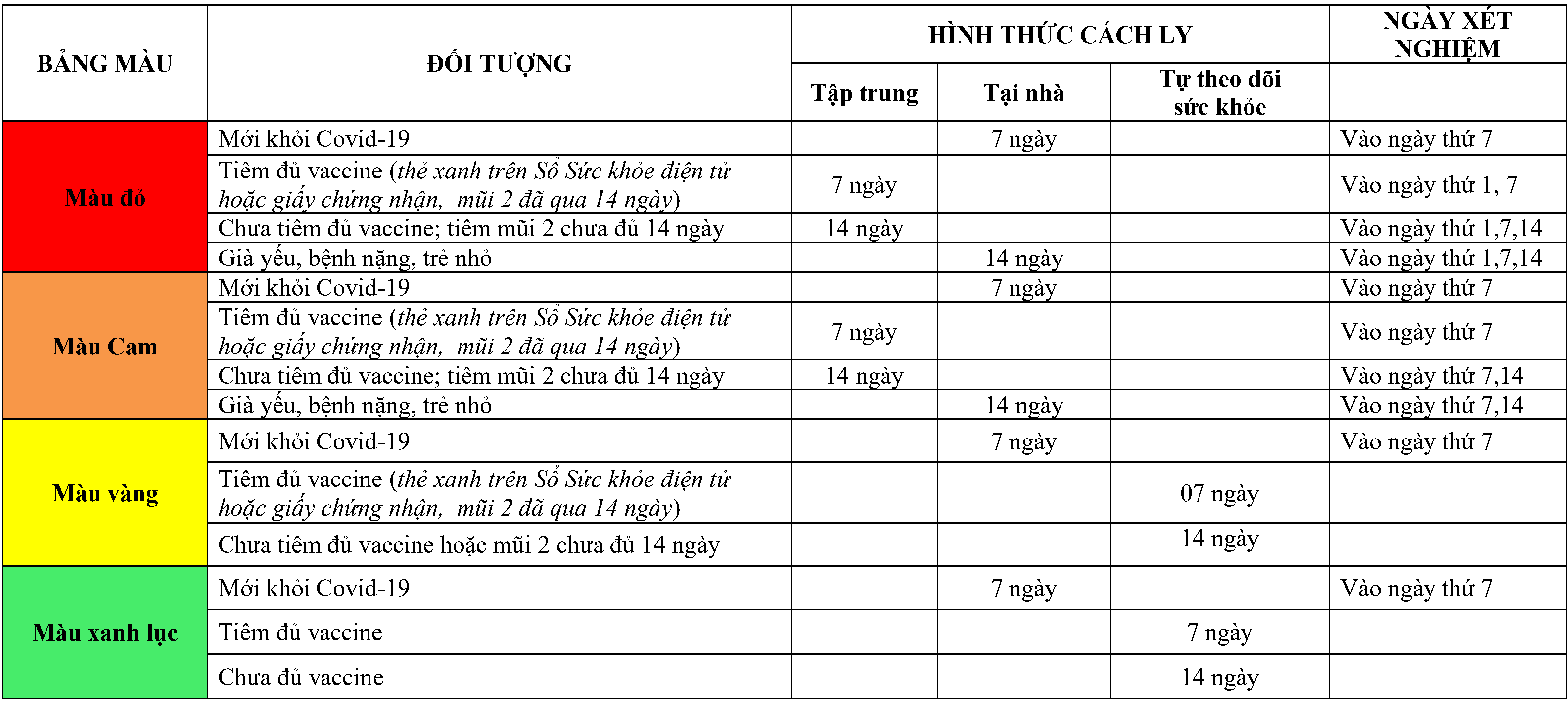 + Người đã tiêm đủ liều vắc xin phòng COVID-19 (thẻ xanh trên Sổ Sức khỏe điện tử/PC-COVID hoặc giấy chứng nhận tiêm đủ liều vắc xin của cơ quan có thẩm quyền cấp, liều cuối cùng đã được tiêm ít nhất 14 ngày): Thực hiện cách ly y tế tập trung 07 ngày kể từ ngày về/đến địa phương, lấy mẫu xét nghiệm 02 lần vào ngày thứ 1, thứ 7; tiếp tục tự theo dõi sức khỏe ngày tiếp theo.