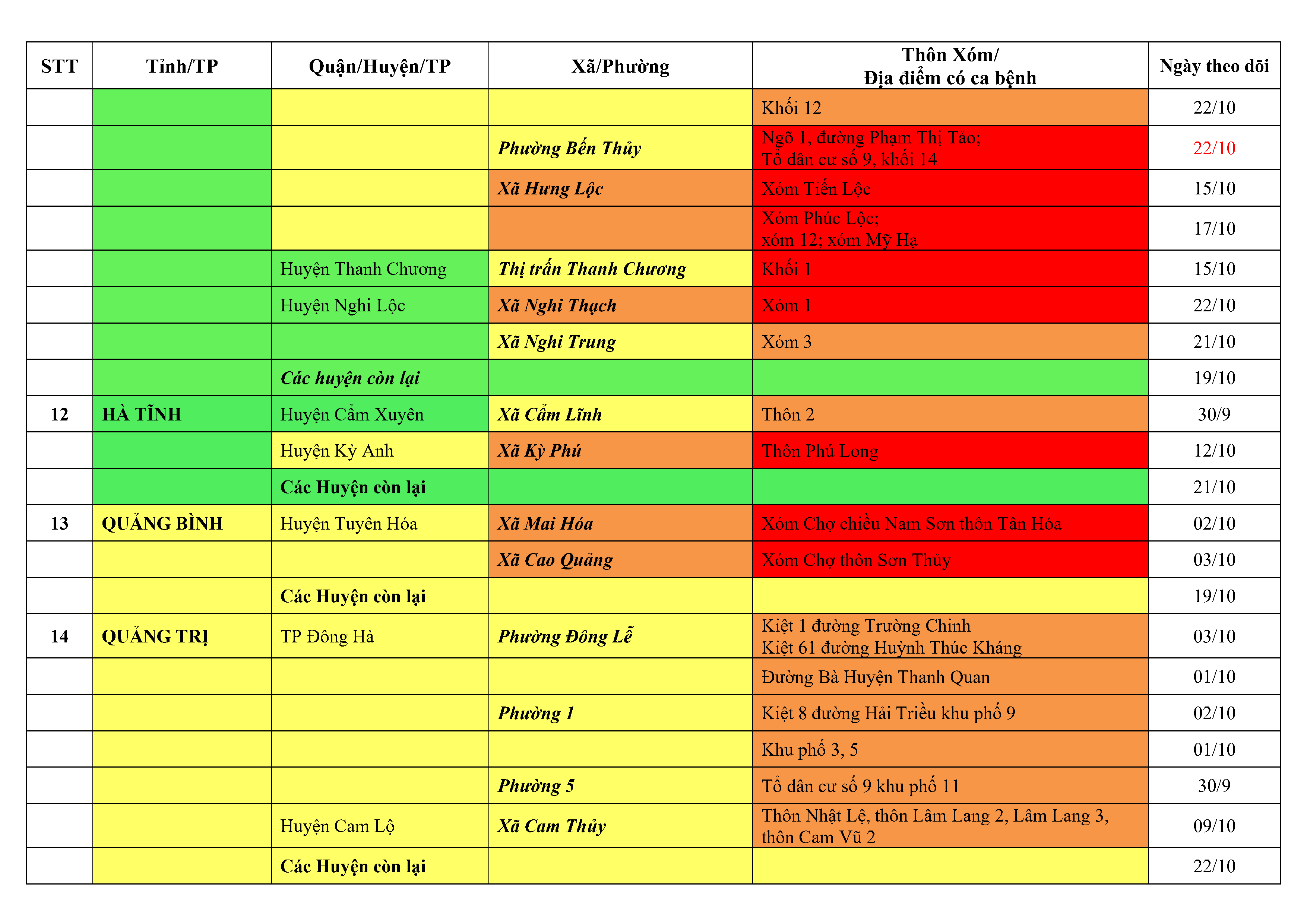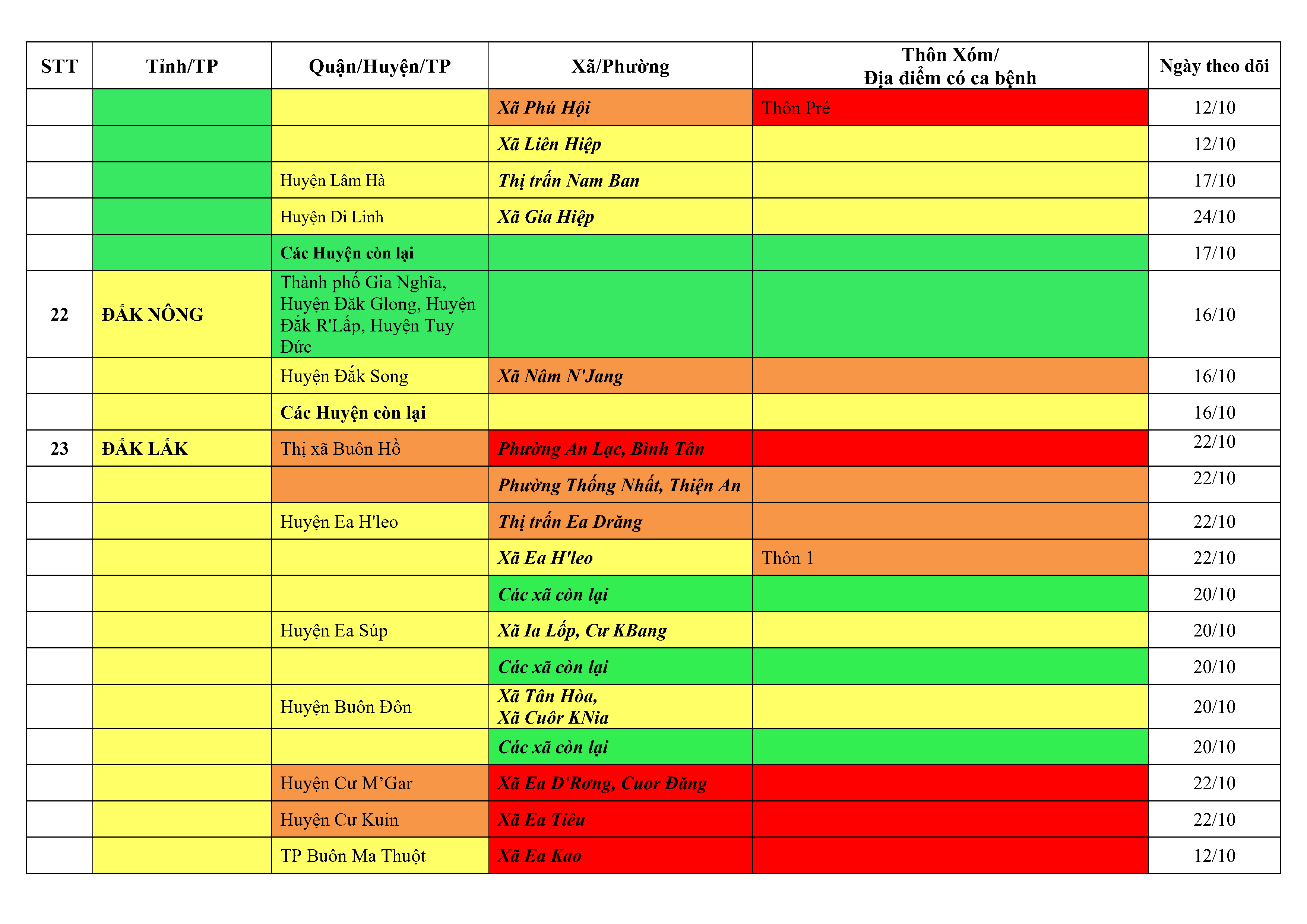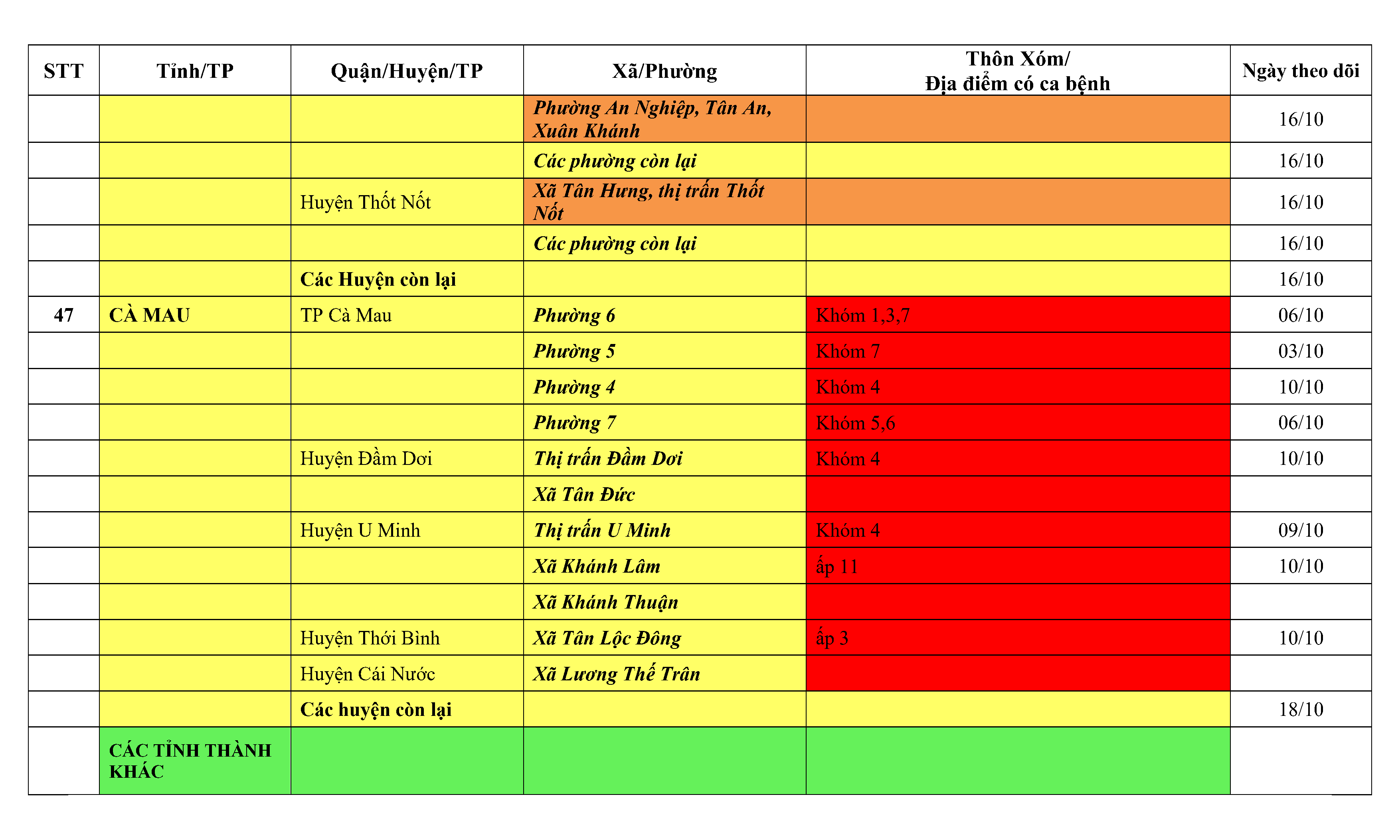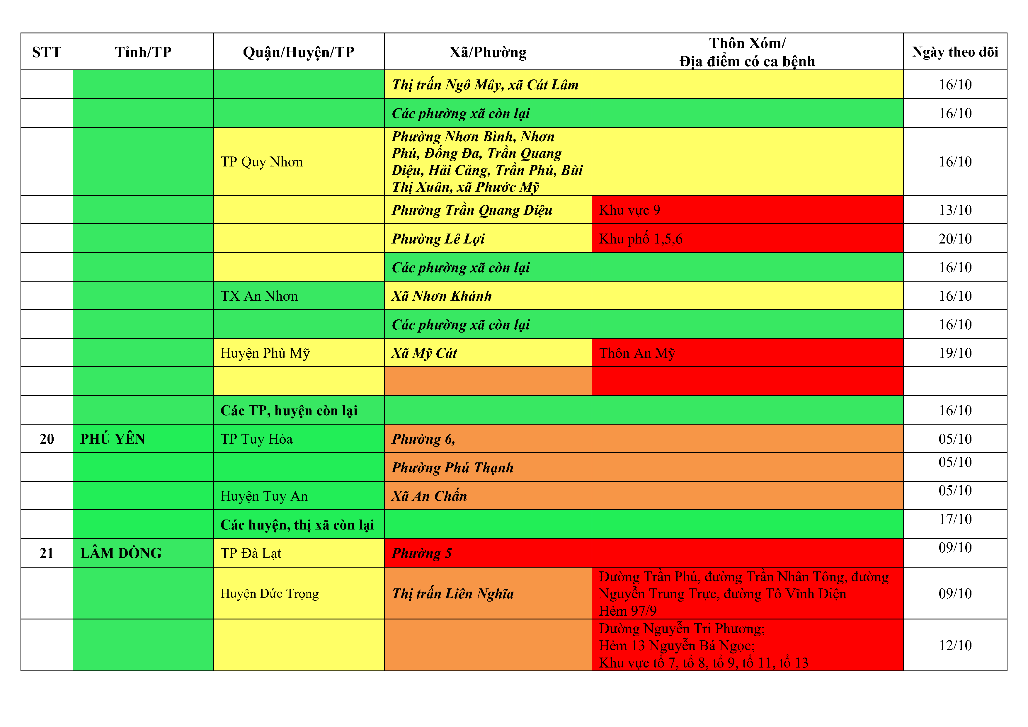 Lưu ý: Các tỉnh, thành phố không có tên trong bảng màu, đi lại bình thường, tuân thủ các biện pháp phòng chống dịch theo chỉ đạo của Bộ Y tế; khai báo y tế, thực hiện nghiêm 5K.