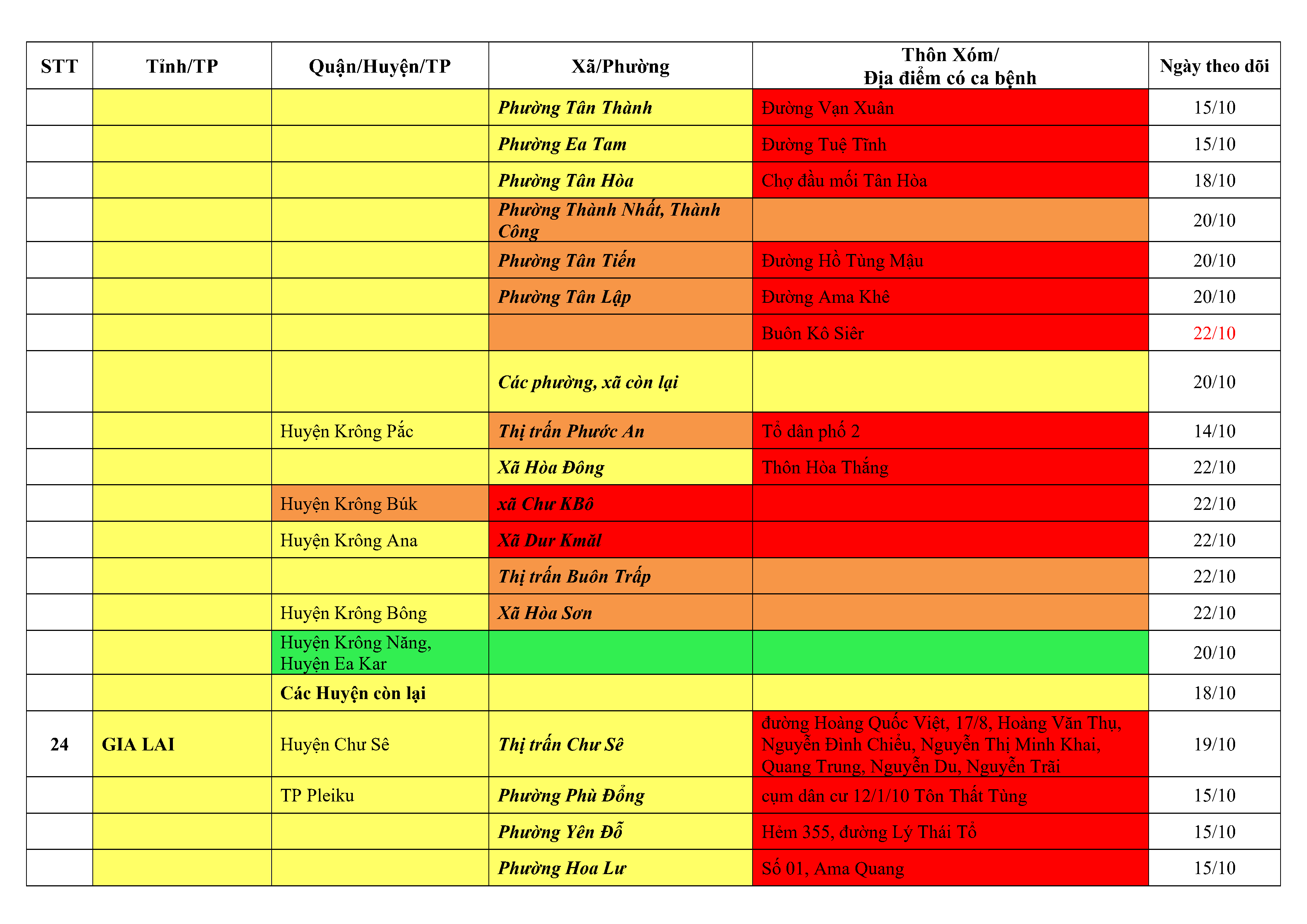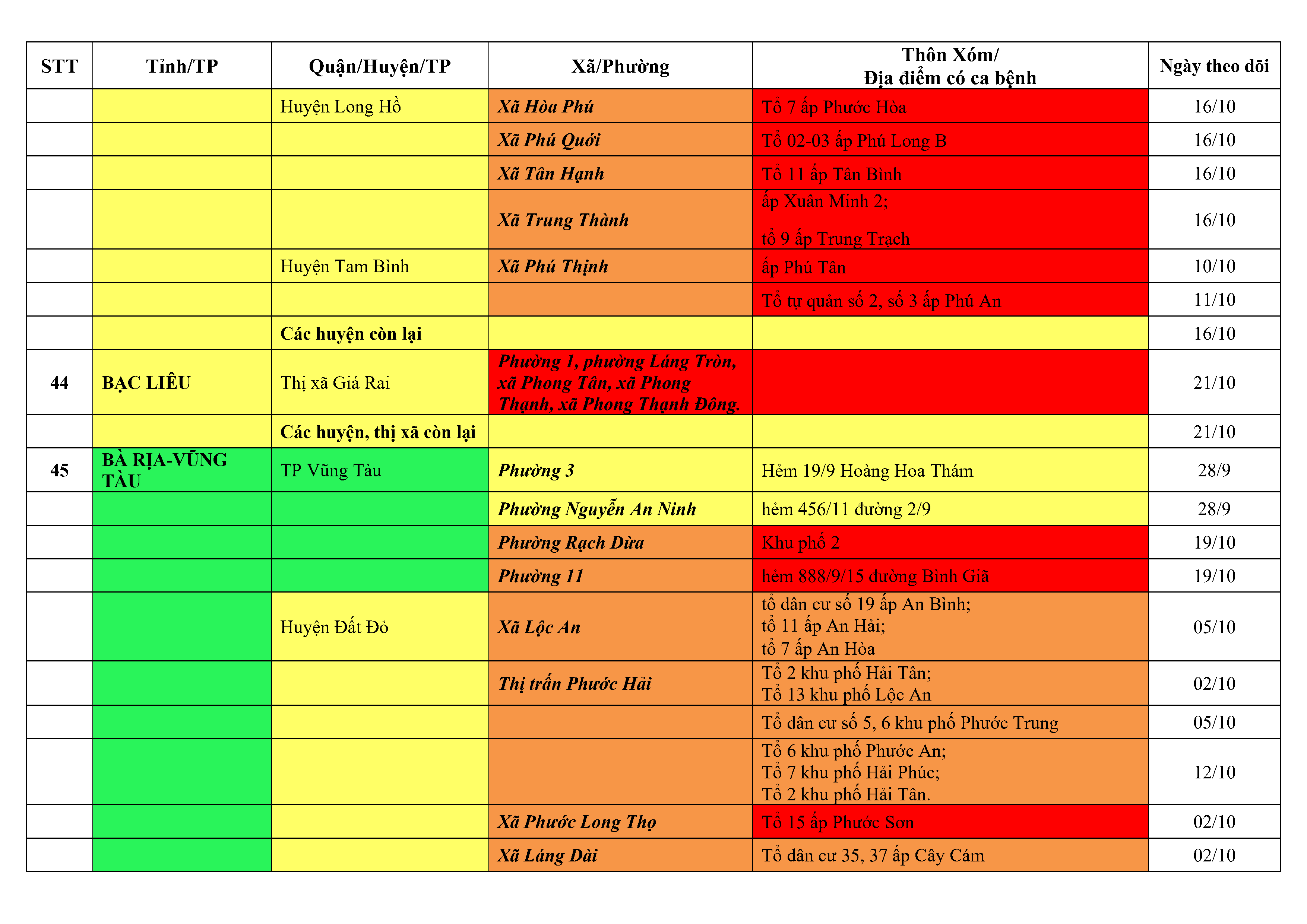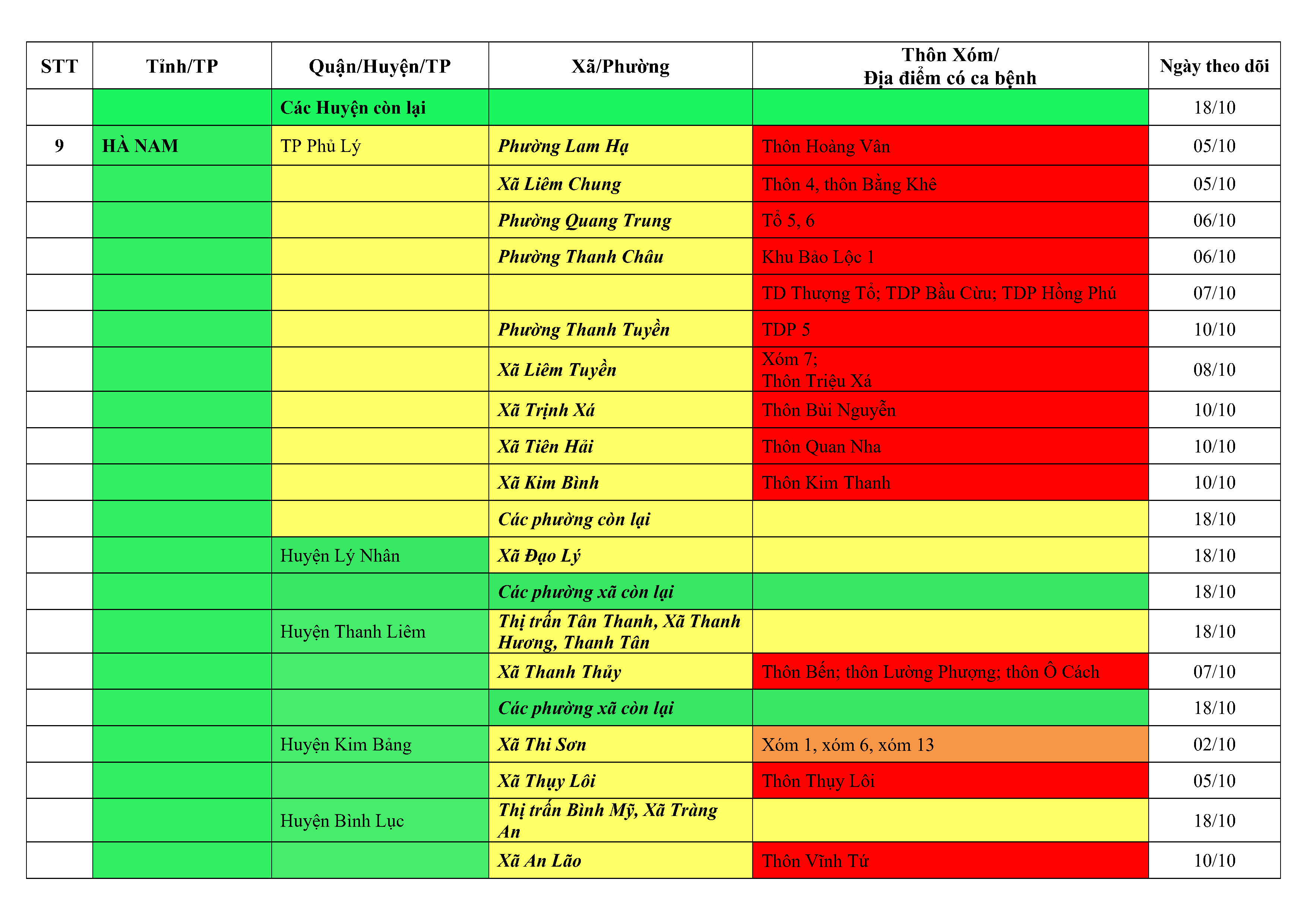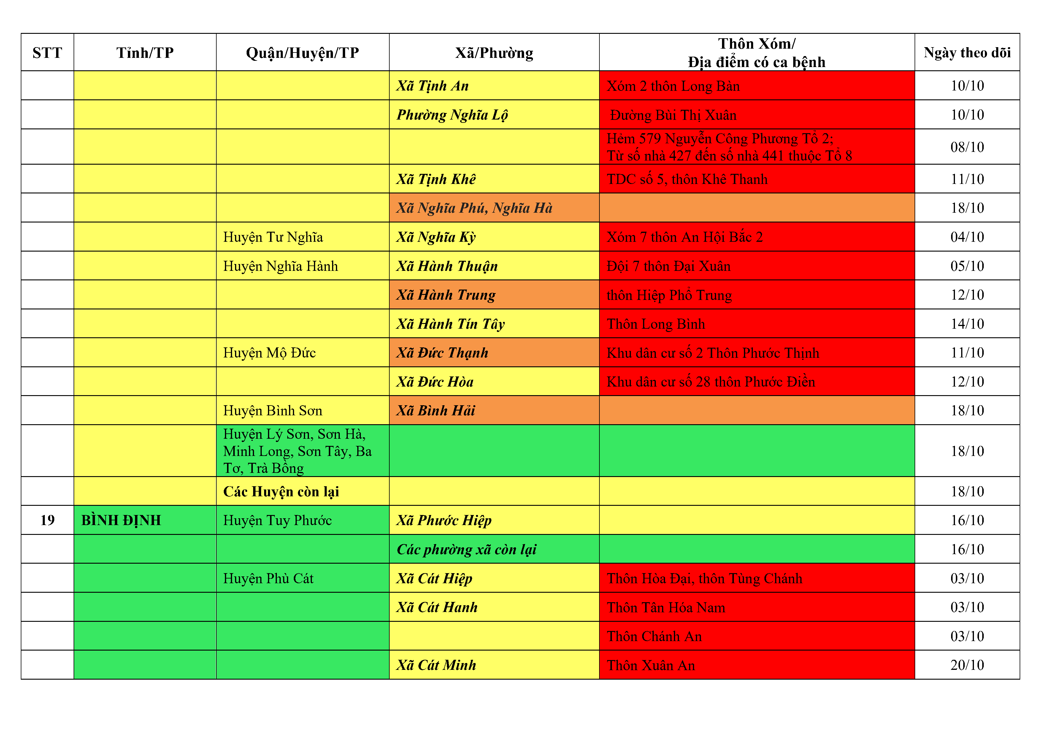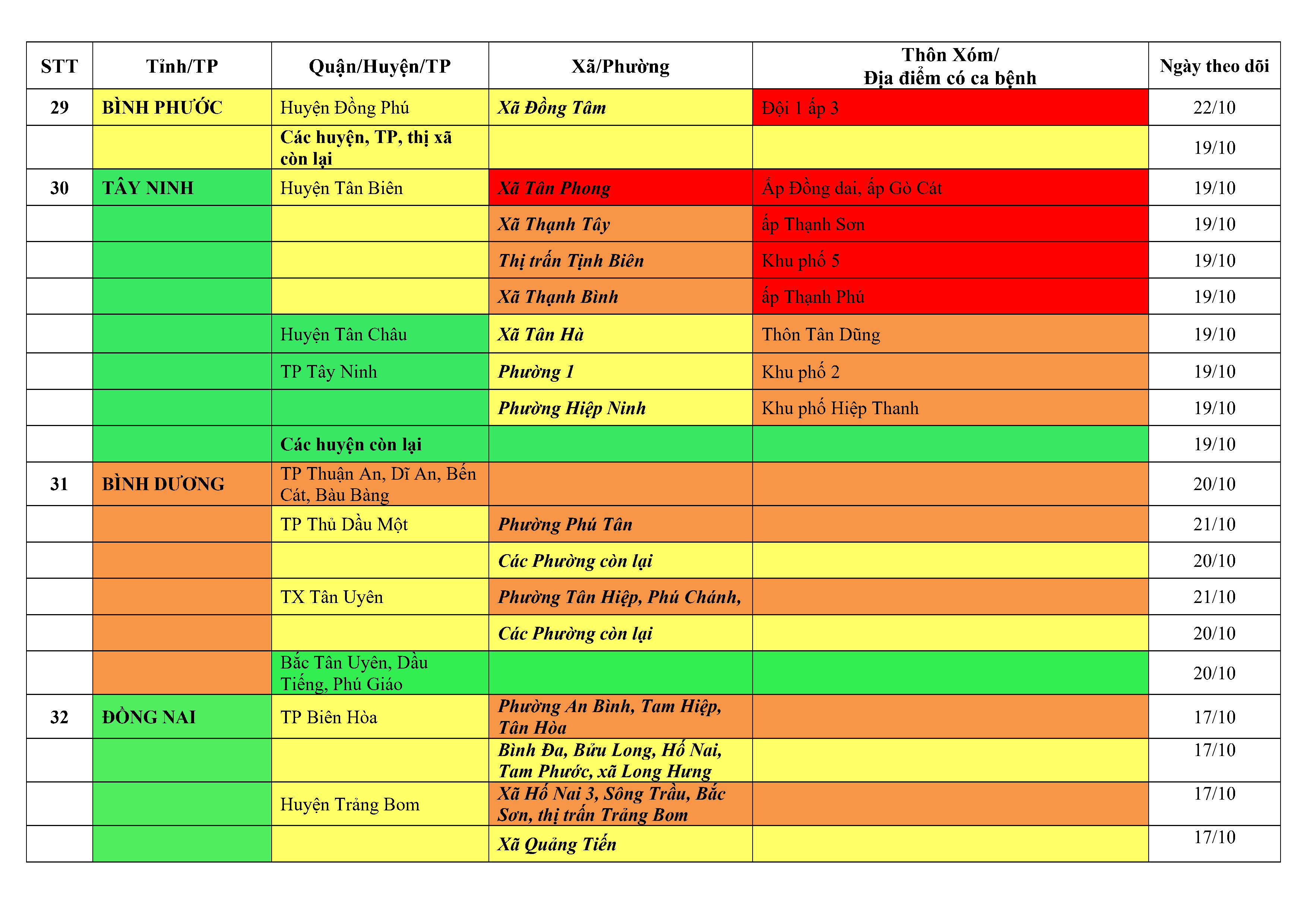Lưu ý: Các tỉnh, thành phố không có tên trong bảng màu, đi lại bình thường, tuân thủ các biện pháp phòng chống dịch theo chỉ đạo của Bộ Y tế; khai báo y tế, thực hiện nghiêm 5K.