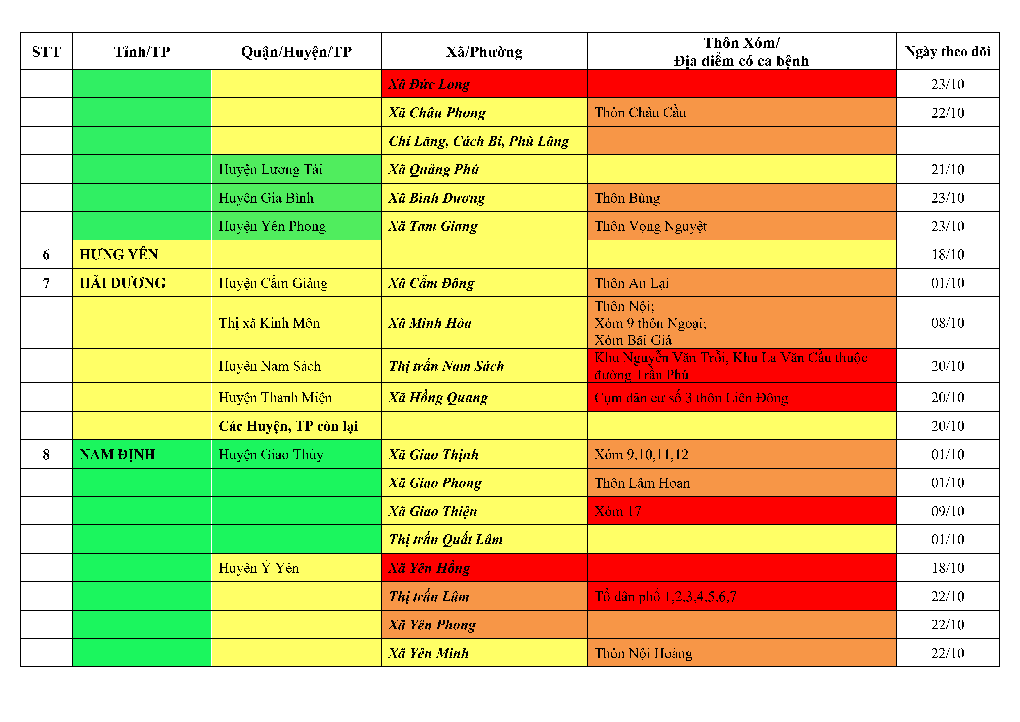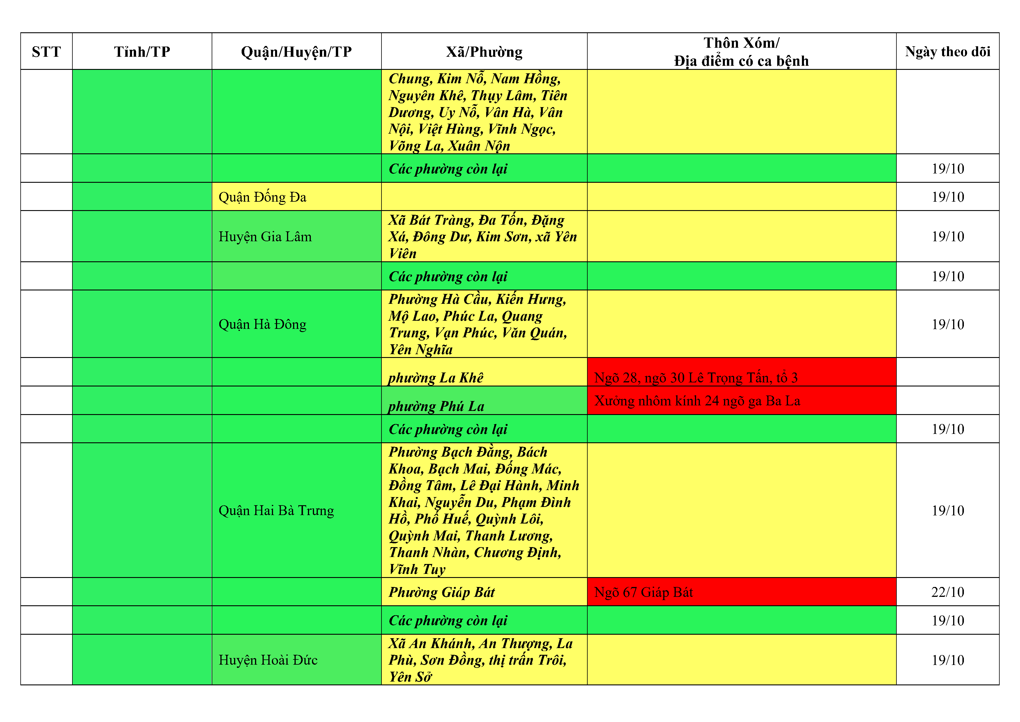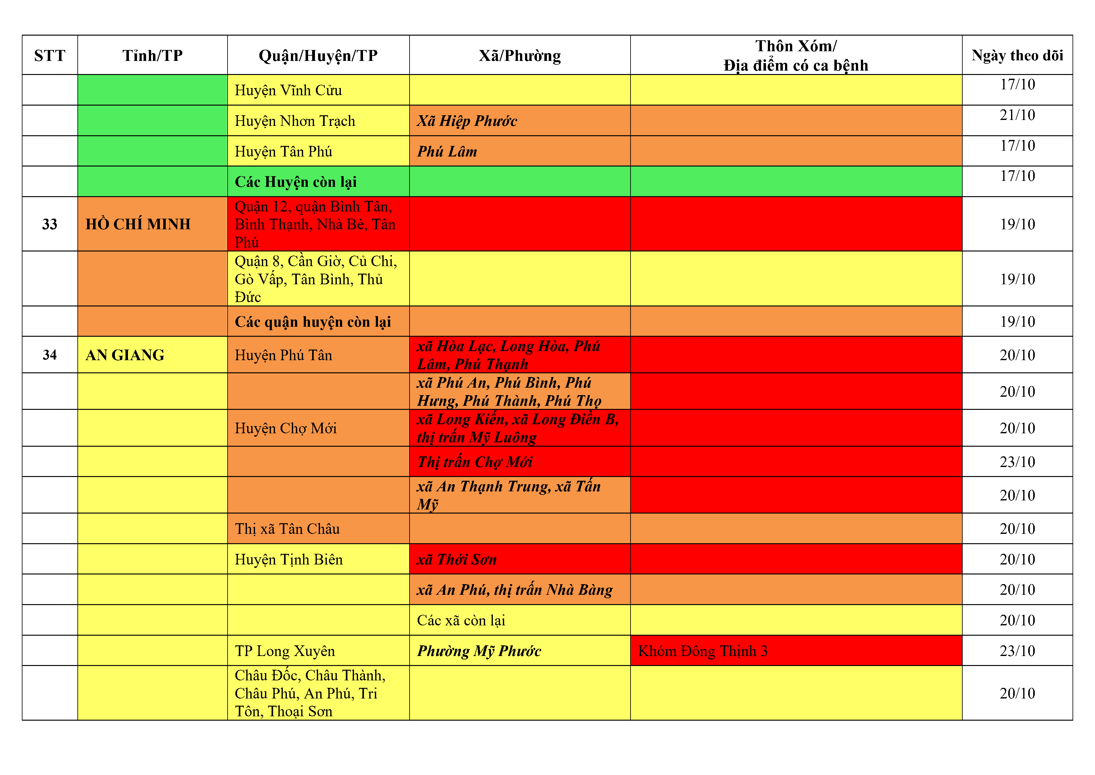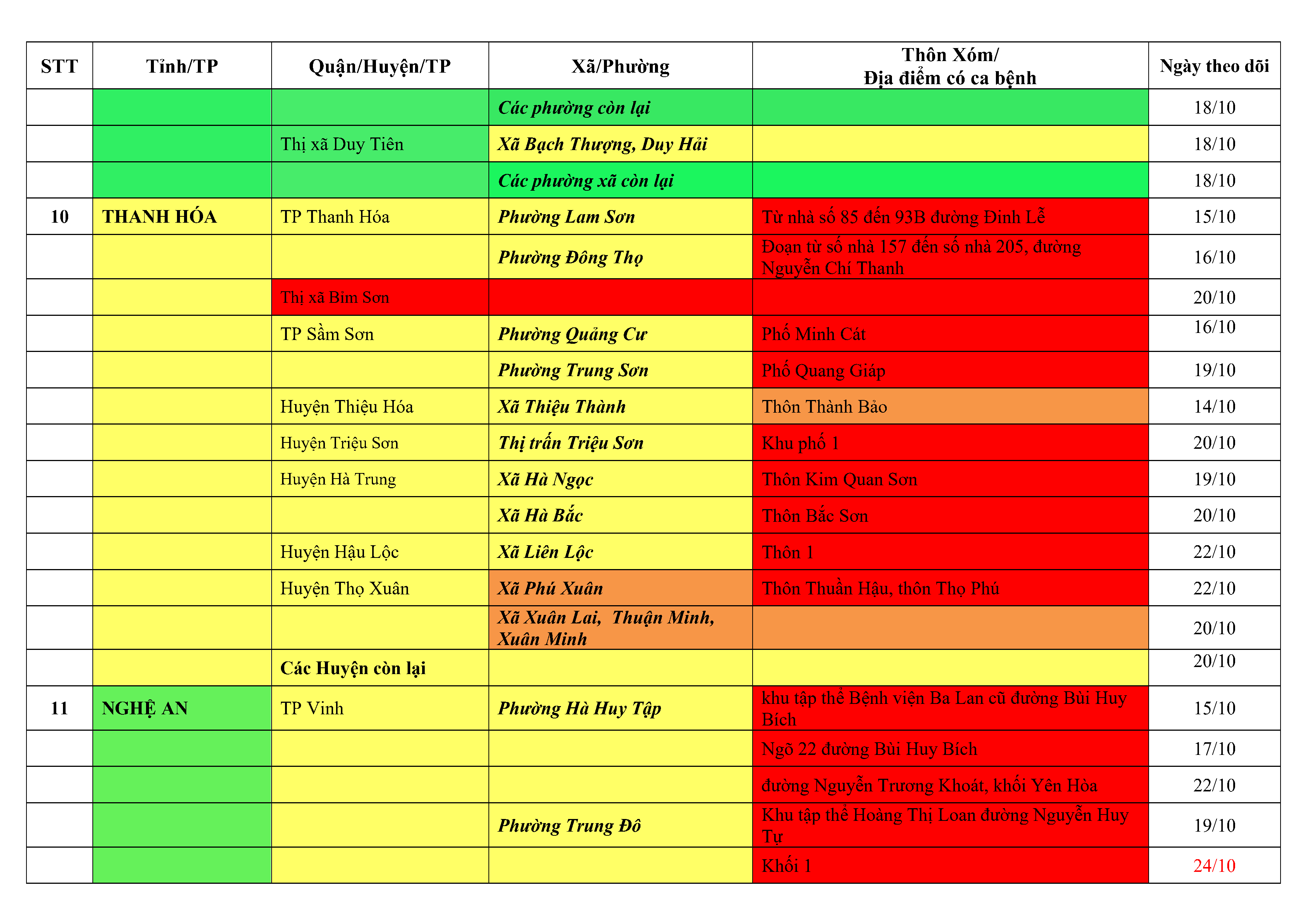 Lưu ý: Các tỉnh, thành phố không có tên trong bảng màu, đi lại bình thường, tuân thủ các biện pháp phòng chống dịch theo chỉ đạo của Bộ Y tế; khai báo y tế, thực hiện nghiêm 5K.