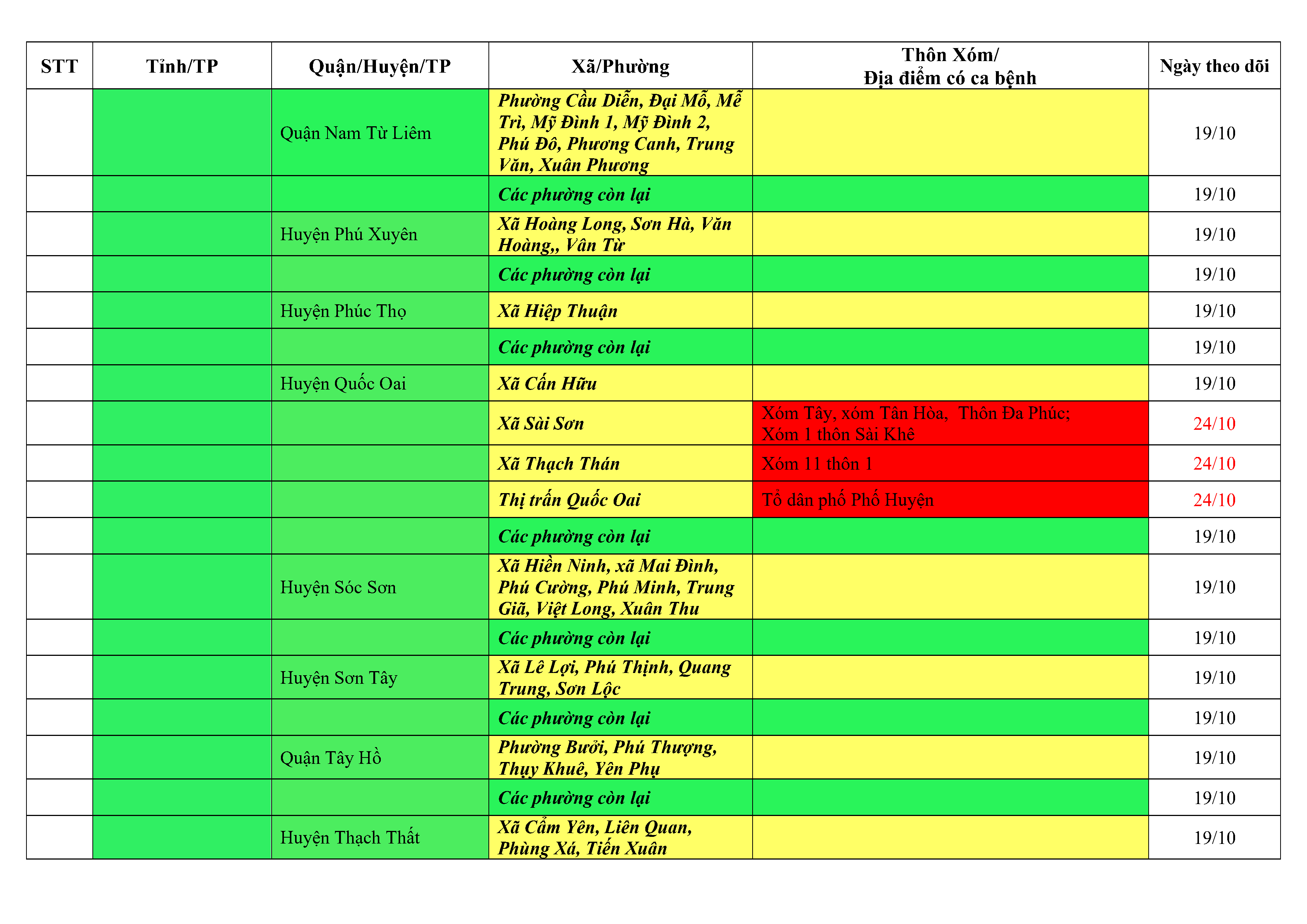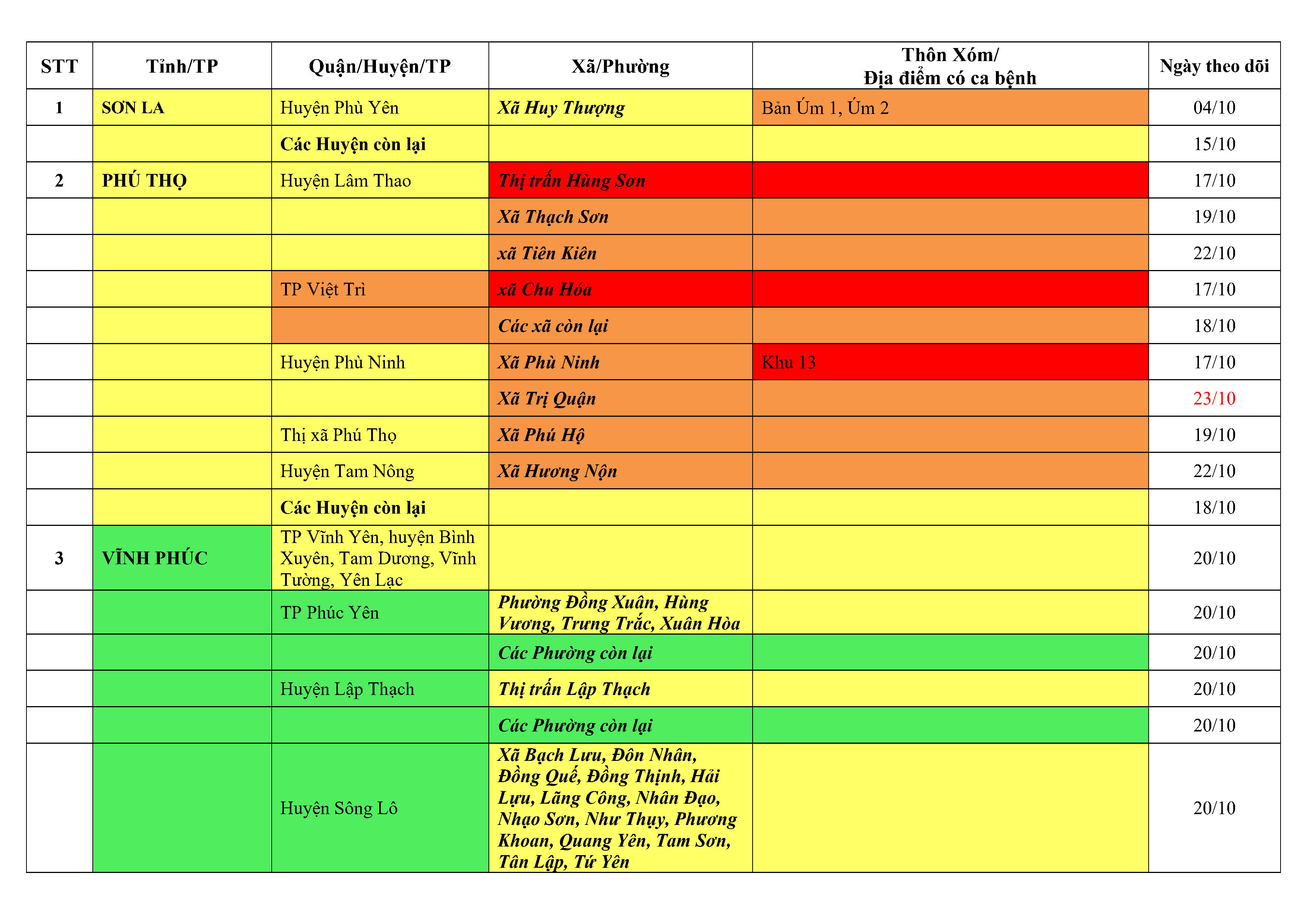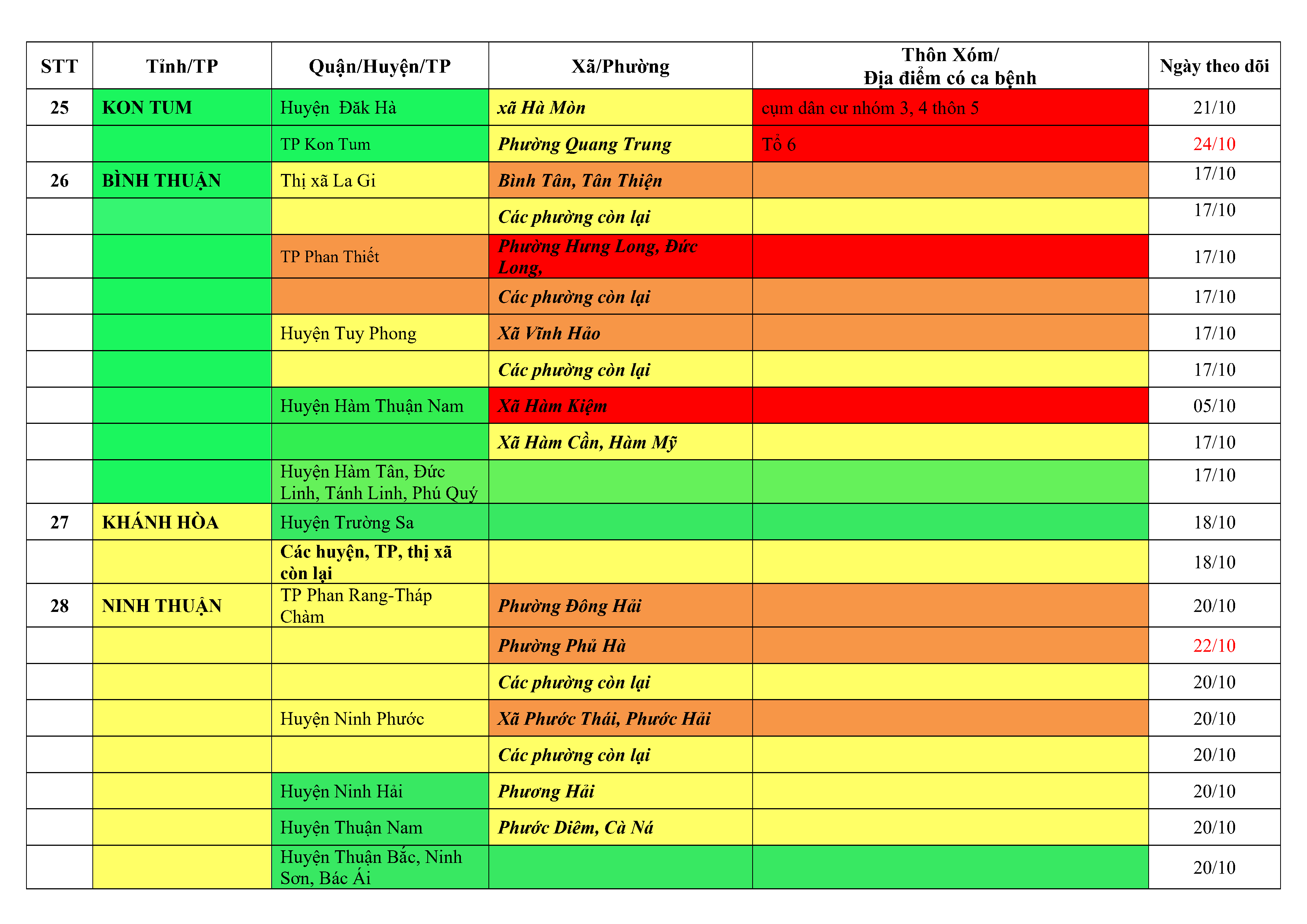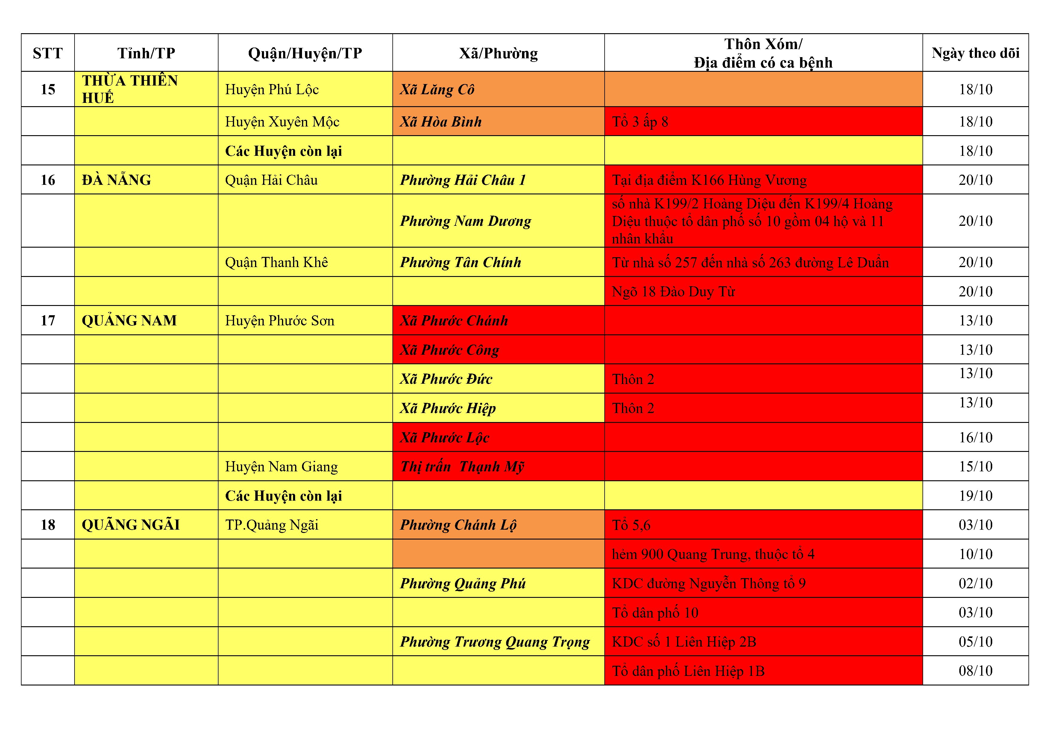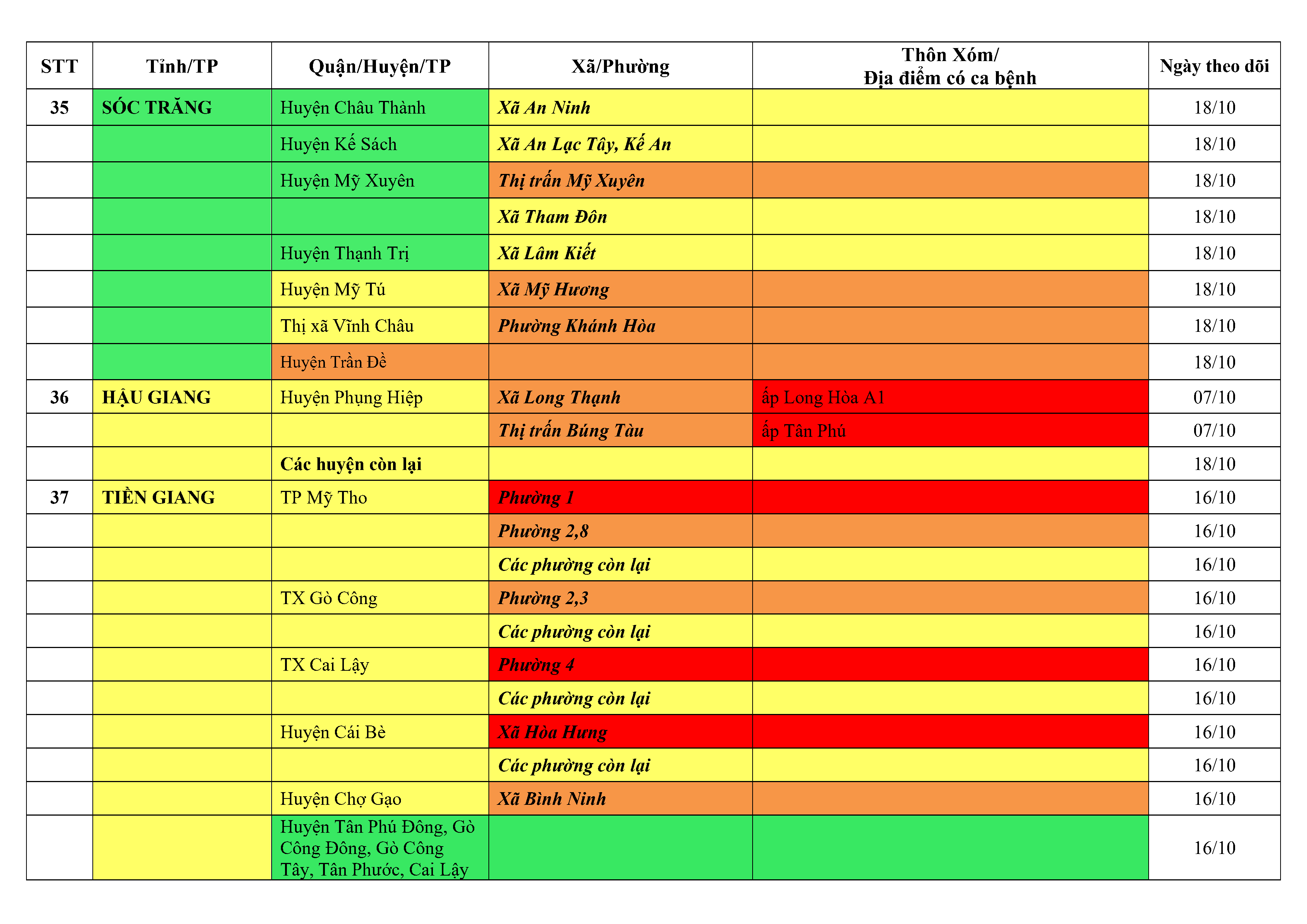 Lưu ý: Các tỉnh, thành phố không có tên trong bảng màu, đi lại bình thường, tuân thủ các biện pháp phòng chống dịch theo chỉ đạo của Bộ Y tế; khai báo y tế, thực hiện nghiêm 5K.
