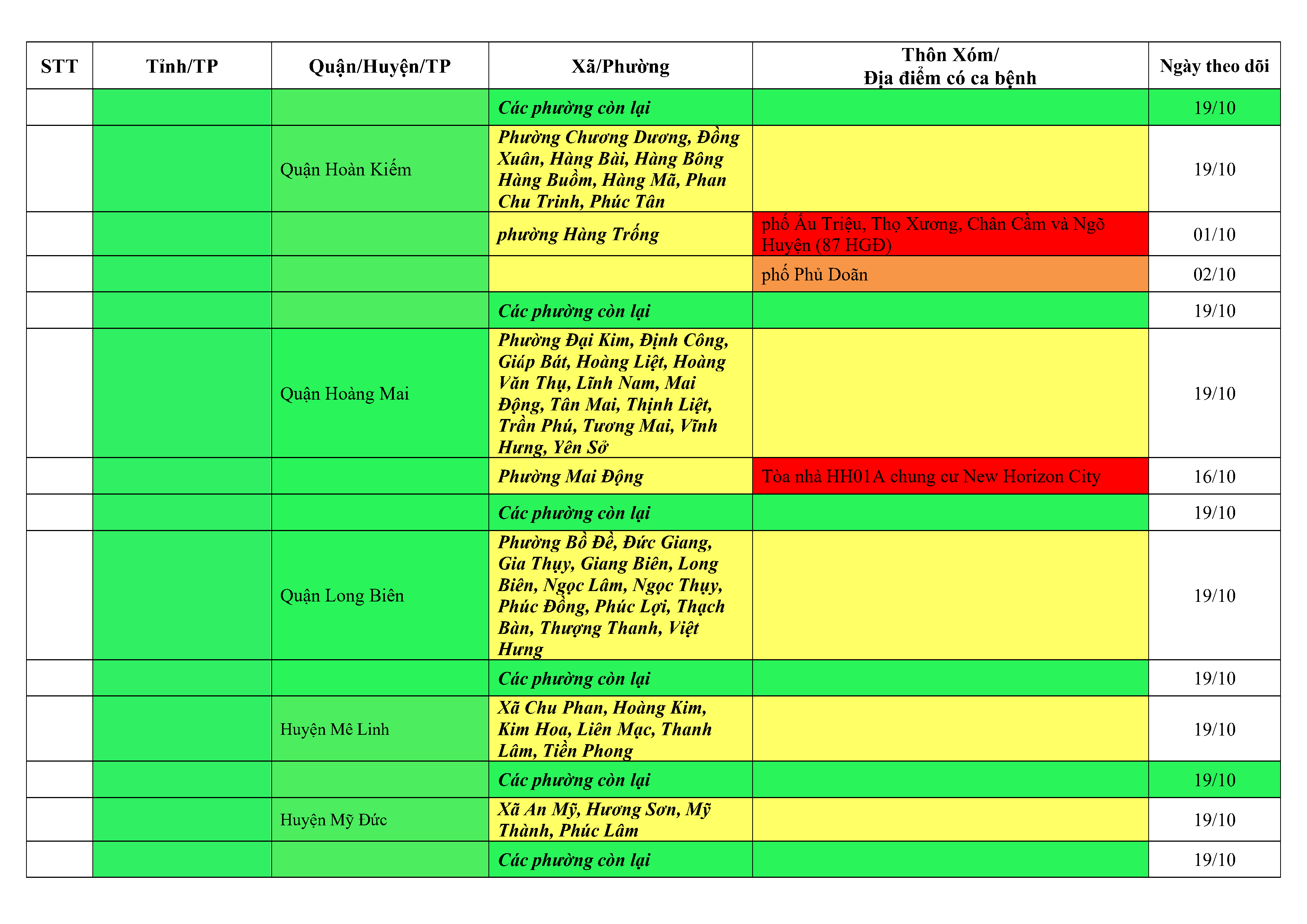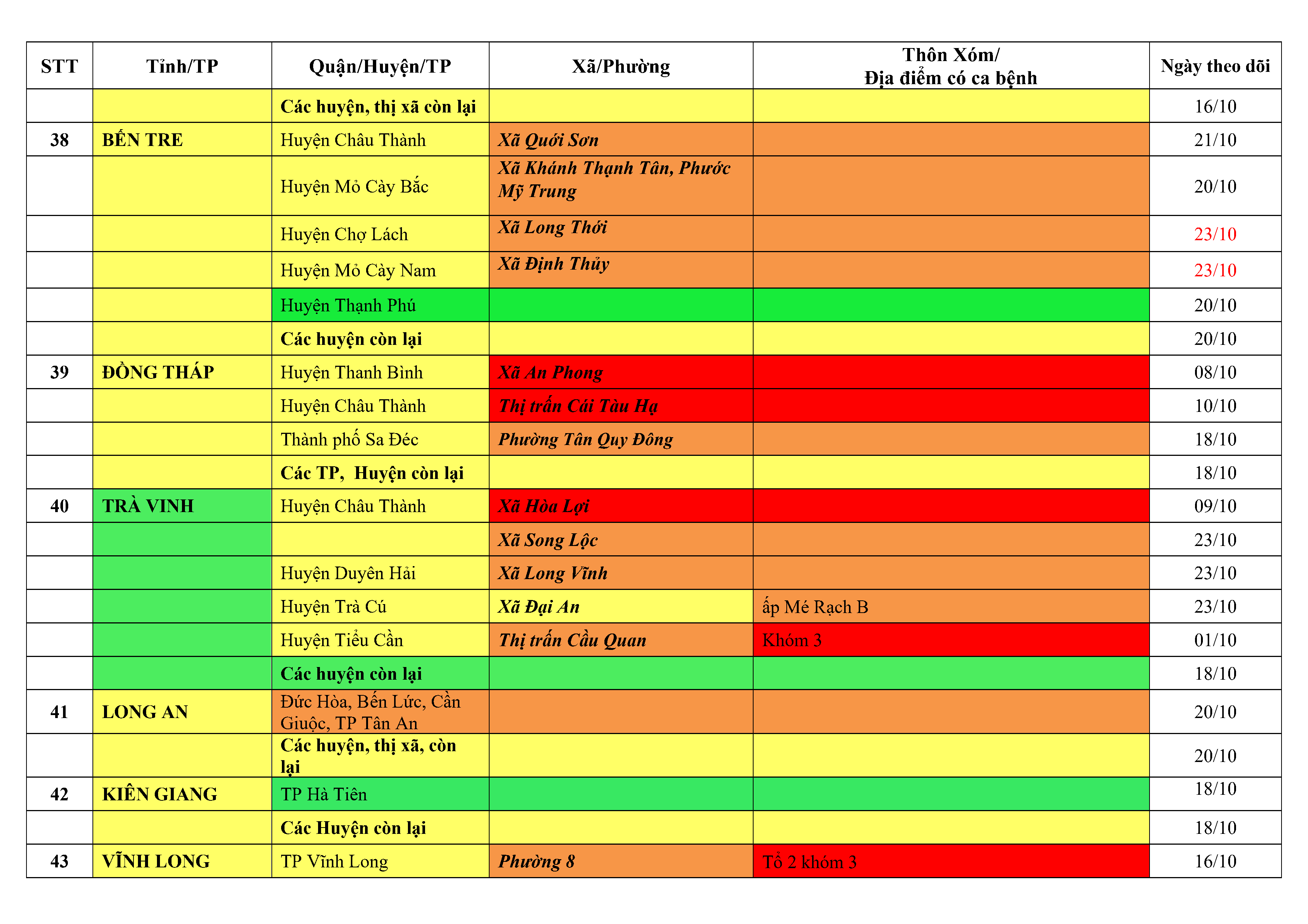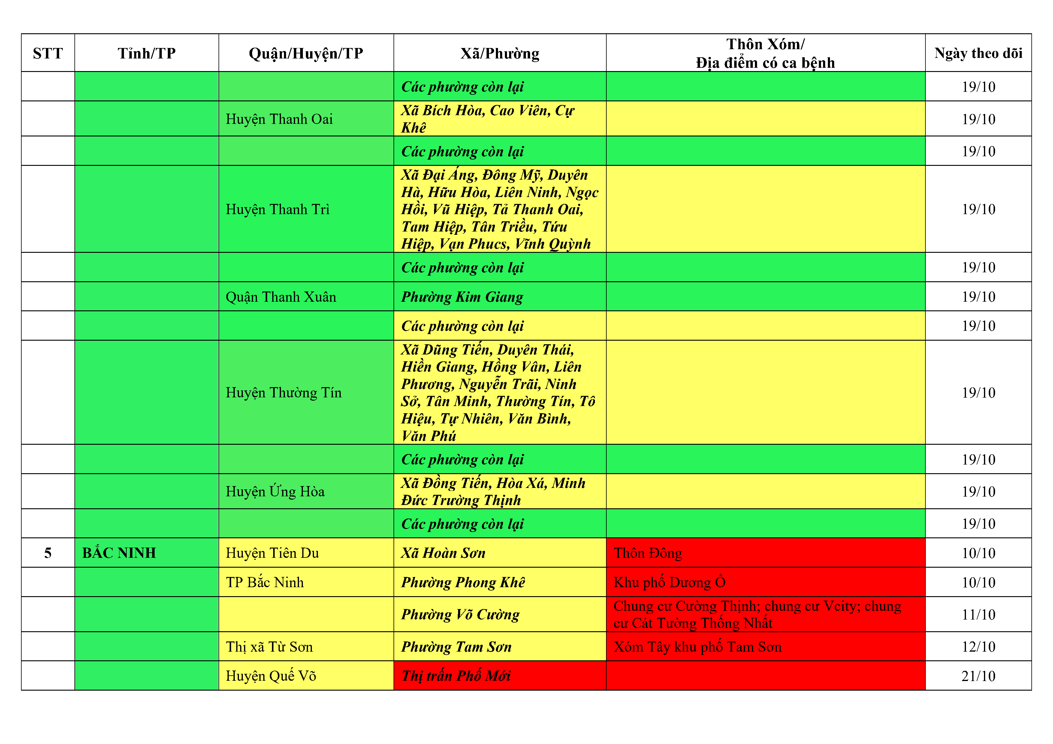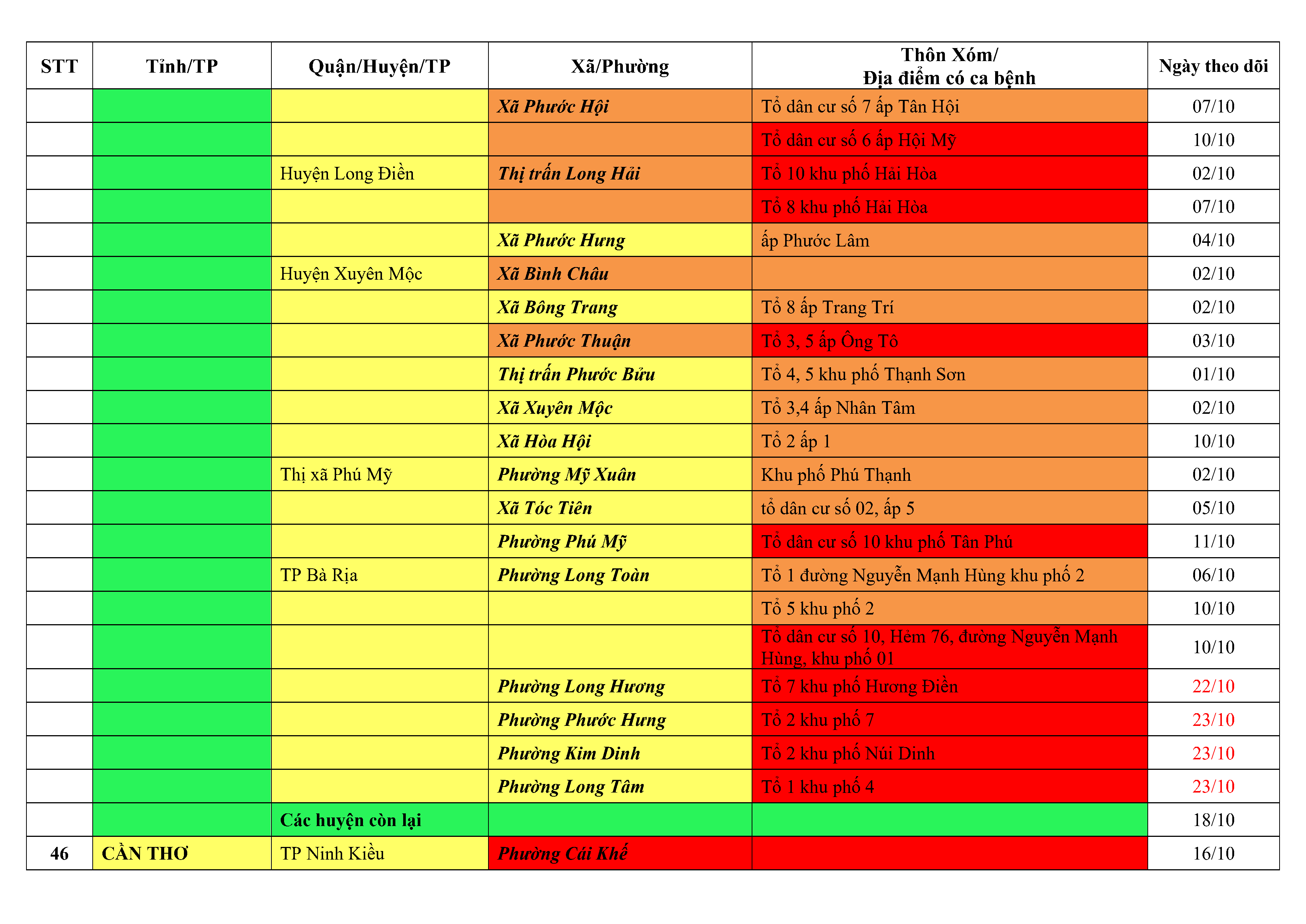 Lưu ý: Các tỉnh, thành phố không có tên trong bảng màu, đi lại bình thường, tuân thủ các biện pháp phòng chống dịch theo chỉ đạo của Bộ Y tế; khai báo y tế, thực hiện nghiêm 5K.