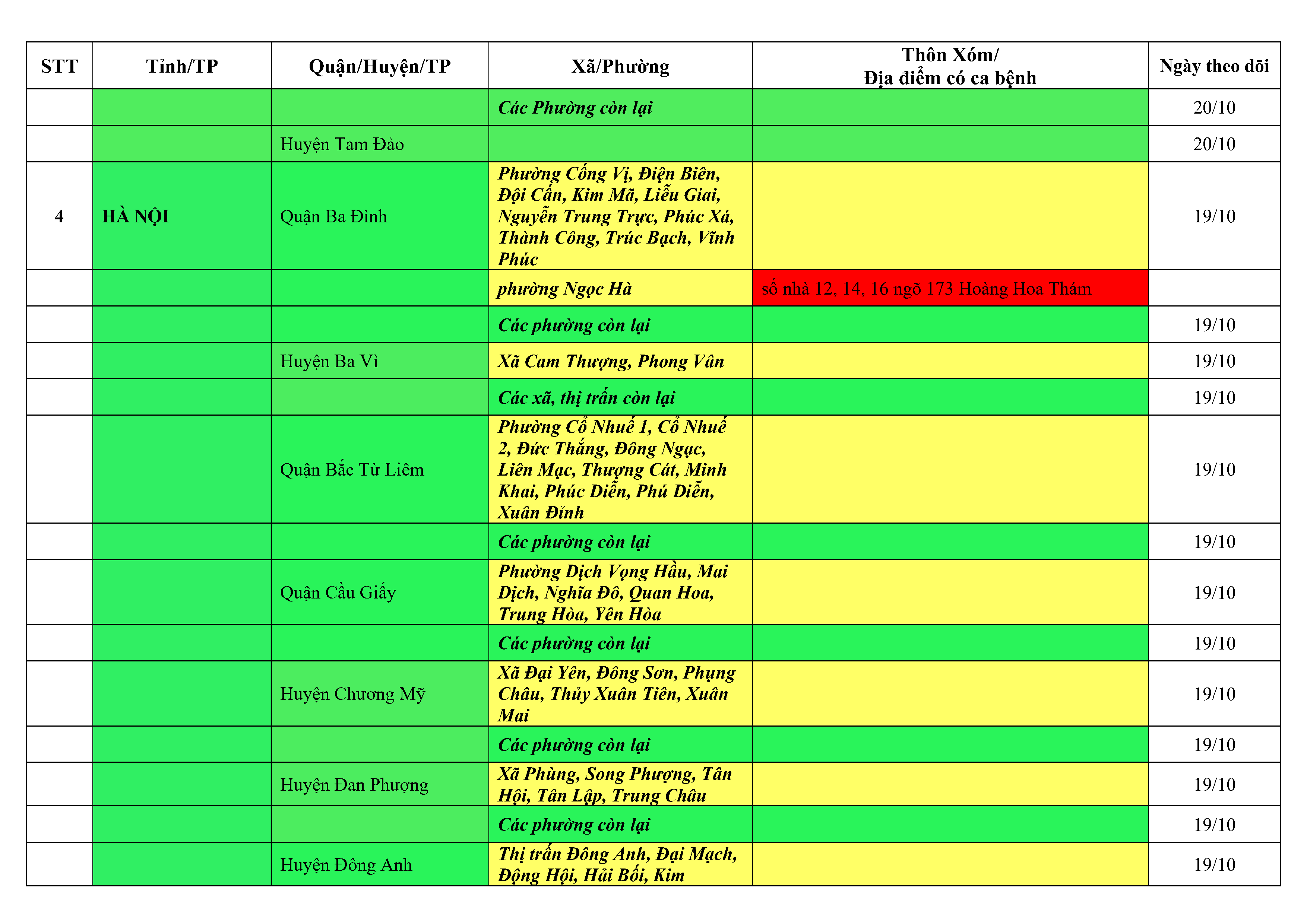 Áp dụng biện pháp tương ứng màu sắc ô cột theo thôn xóm; xã phường; quận huyện; tỉnh thành phố. Cách ly y tế dựa vào việc tiếp xúc, đi đến địa điểm và nơi cư trú có ca bệnh, theo Thông báo của Bộ Y tế, các tỉnh thành phố.
