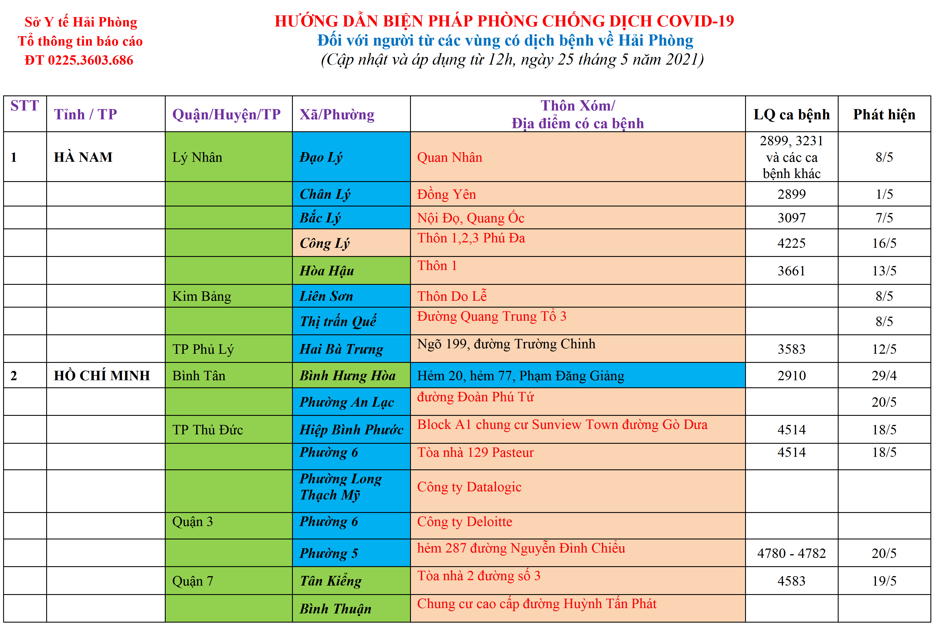Sở Y tế Hải Phòng ban hành hướng dẫn tạm thời biện pháp phòng chống dịch COVID-19 đối với người từ các tỉnh, thành khác về thành phố như sau (thông tin cập nhật vào 12h00’ ngày 25/5/2021):