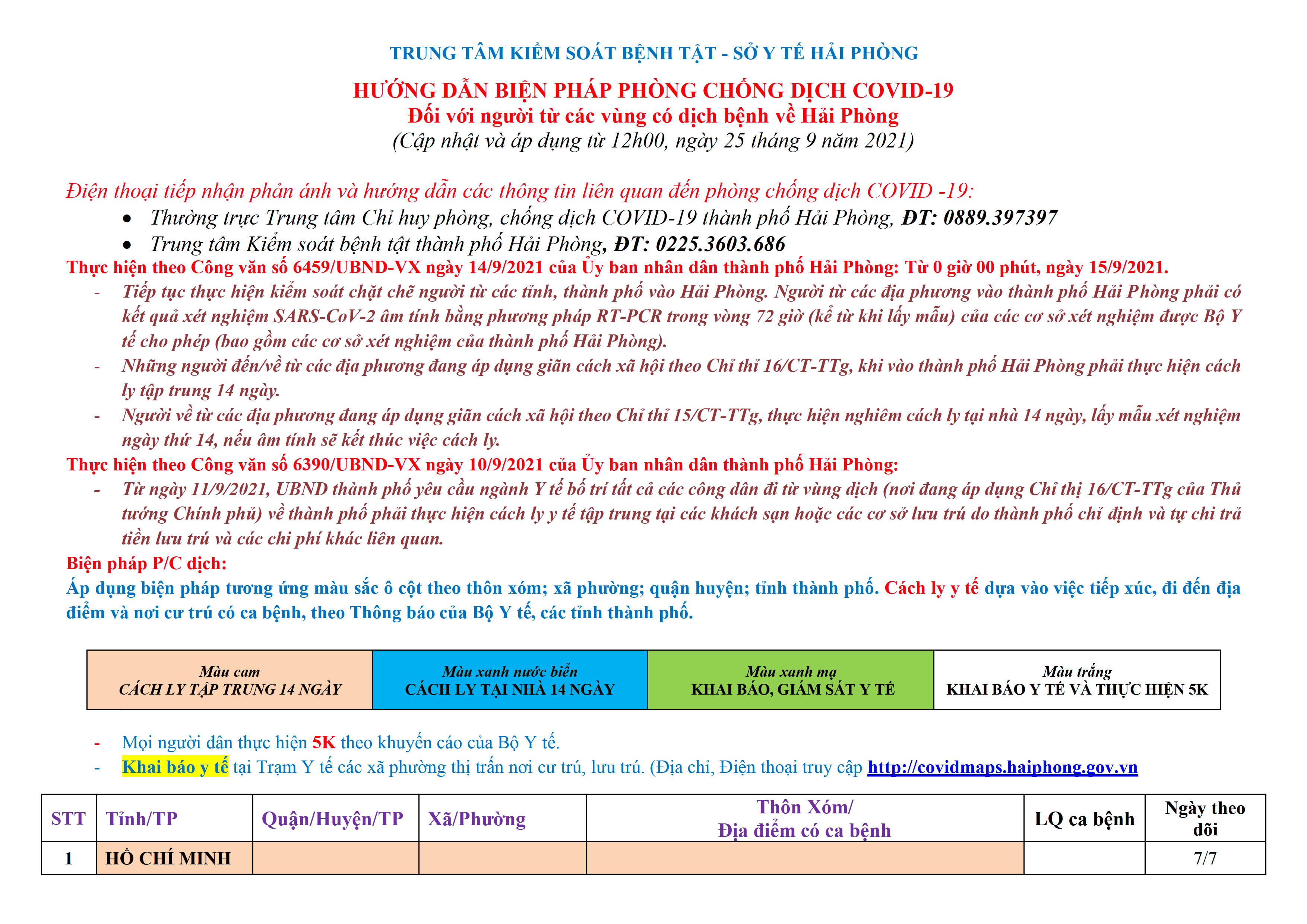 CDC Hải Phòng ban hành hướng dẫn tạm thời biện pháp phòng chống dịch COVID-19 đối với người từ các tỉnh, thành khác về thành phố như sau (thông tin cập nhật vào 12h00’ ngày 25/9/2021):