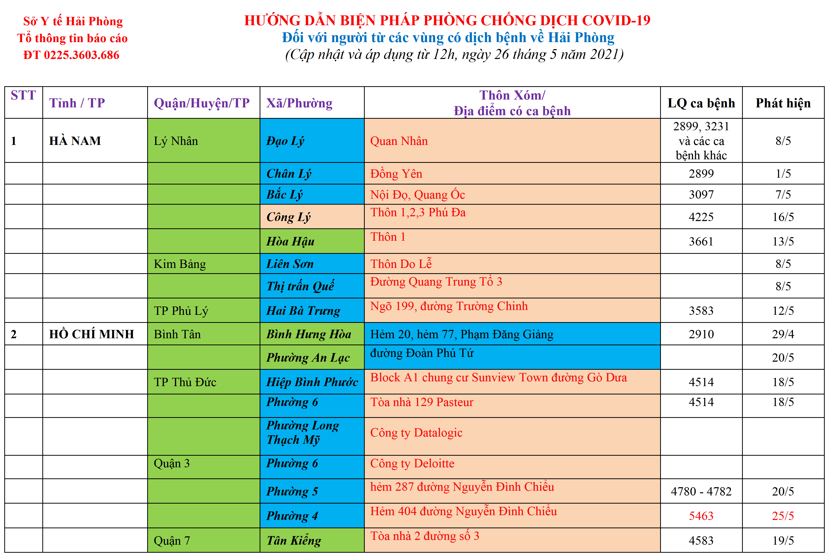 . Áp dụng các biện pháp Cách ly y tế đối với những người đến và trở về Hải Phòng, từ các vùng có ca bệnh tại cộng đồng theo Bảng trên.