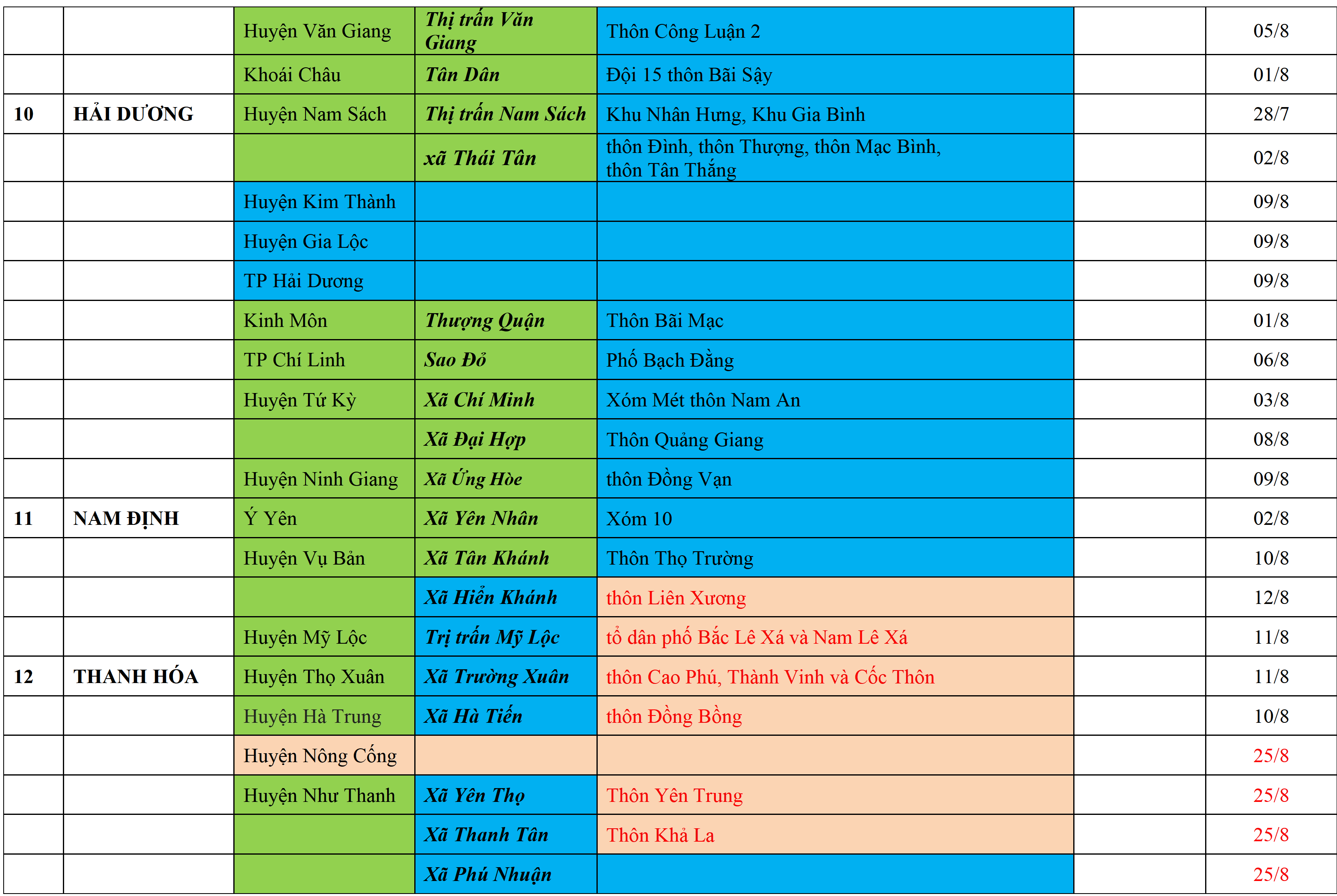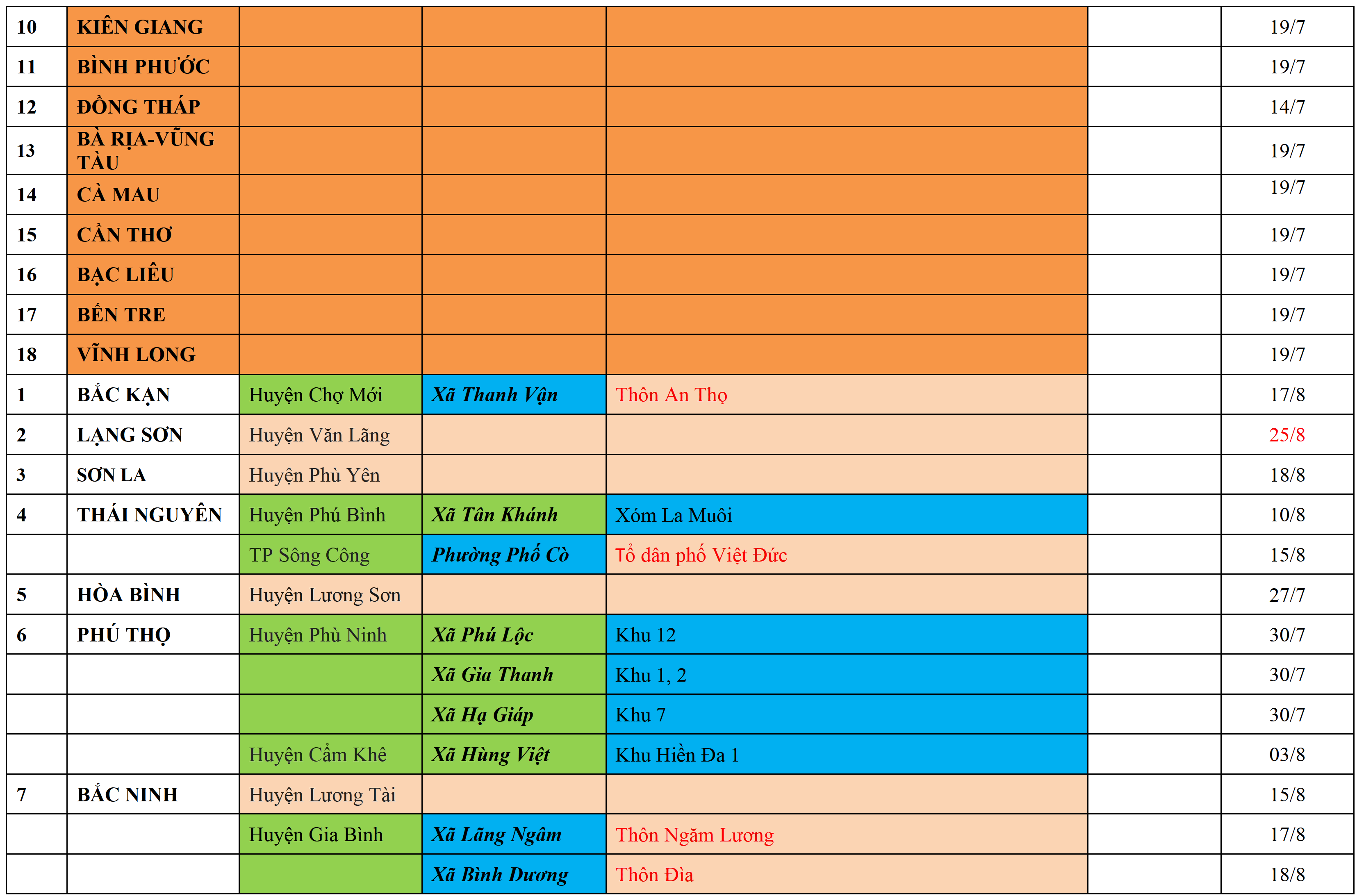 Biện pháp phòng chống dịch: Áp dụng biện pháp tương ứng màu sắc ô cột theo thôn xóm; xã phường; quận huyện; tỉnh thành phố. Cách ly y tế dựa vào việc tiếp xúc, đi đến địa điểm và nơi cư trú có ca bệnh, theo Thông báo của Bộ Y tế, các tỉnh thành phố.